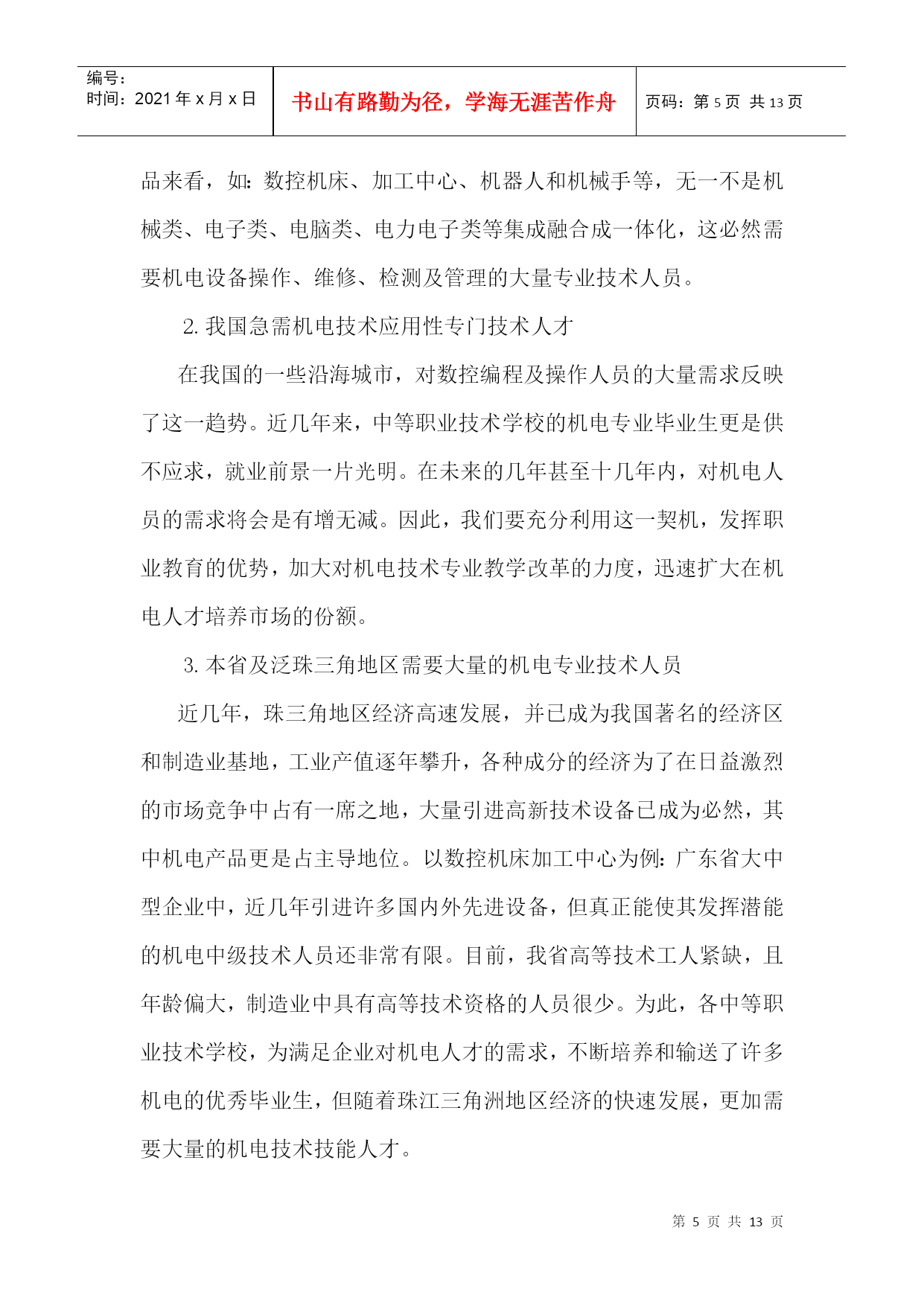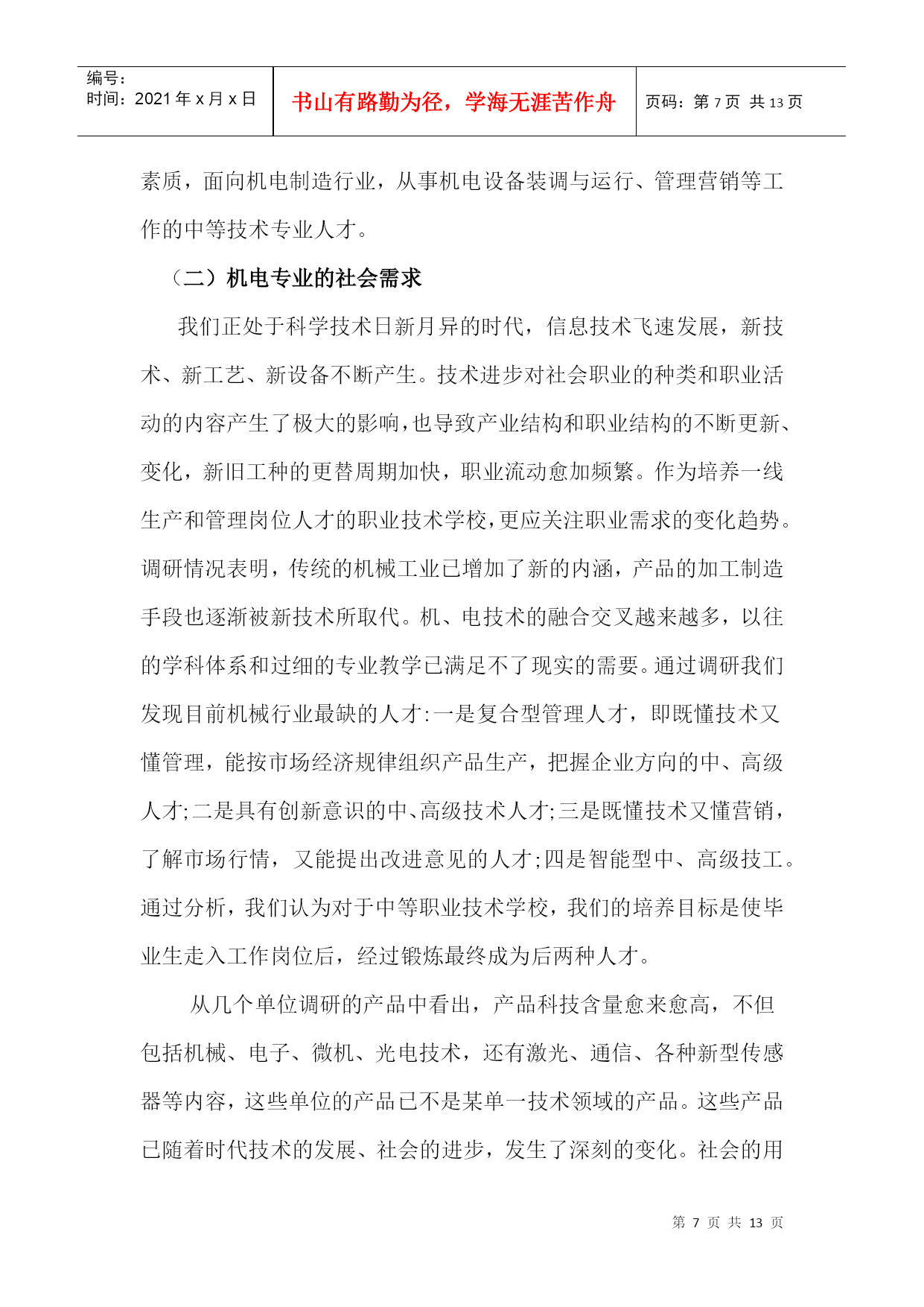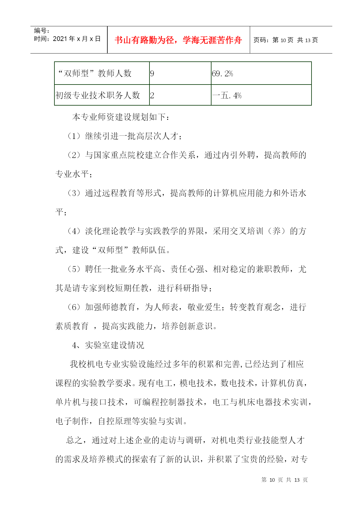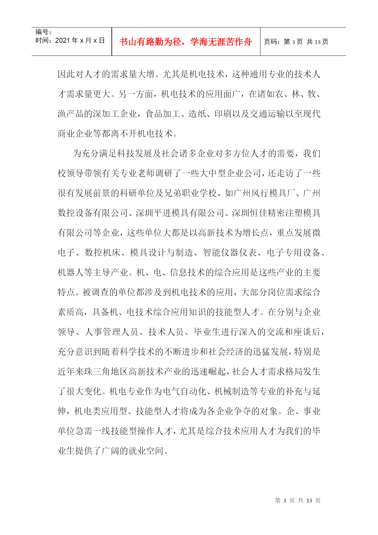 编号:时间:2021年x月x日书山有路勤为径,学海无涯苦作舟页码:第PAGE13页共NUMPAGES13页第PAGE\*MERGEFORMAT13页共NUMPAGES\*MERGEFORMAT13页HYPERLINK"xxxx/"附件6机电专业人才市场调研报告屈贵华为了满足社会对机电类中等职业技术人才的需求,加快了机电专业的建设步伐,并且对机电专业人才需求进行了广泛地社会调研。一、机电专业简介随着现代化工业生产的发展,自动化控制技术的集成应用正起着越来越重要的作用。由于气动技术、液压技术、传感器技术、PLC技术、网络及通讯技术等学科的强烈相互渗透而形成的机电技术,已成为当今工业科技的重要组成部分。机械技术可以承受较大载荷,但不易实现微小和复杂运动的控制,而电子技术则相反,不能承受较大载荷,却容易实现微小运动和复杂运动的控制。所以,传统意义上的机电,主要指机械与电工电子及电气控制这两方面的一体化,并且明显偏重于机械方面。当前,科技发展的态势特别注重学科间的交叉、融合以及电子计算机的应用。机电技术的内涵也发生了变化,它是利用电子技术、信息技术(主要包括传感器技术、控制技术、计算机技术等)使机械实现柔性化和智能化的技术。其本质是将电子技术引入机械控制中,也就是利用传感器检测机械运动,将检测信息输入计算机,计算得到能够实现预期运动的控制信号,由此来控制执行装置。机电技术将机械技术与电子技术实现完美结合,充分发挥各自长处,实现互补。所以说,一件真正意义上的机电产品,应具备两个明显特征:一是产品中要有运动机械;二是采用了电子技术,使运动机械实现柔性化和智能化。因而,机电技术是自动化技术与机械设备紧密结合的产物,也是机械设备向自动化方向发展的必然趋势。它的应用范围涉及了工业、农业、交通、能源、国防等众多领域,具有广阔的发展前景。二、机电技术专业人才的社会需求分析当今,世界高科技竞争和突破正在创造着新的生产方式和经济秩序,高新技术渗透到传统产业,引起传统产业的深刻变革。机电技术正是这场新技术革命中产生的新兴领域,机电产品的功能,除了精度、动力、快速性外,更需要自动化、柔性化、信息化、智能化,逐步实现自适应、自控制、自组织、自管理,向智能化过渡。从典型的机电产品来看,如:数控机床、加工中心、机器人和机械手等,无一不是机械类、电子类、电脑类、电力电子类等技术集成融合成一体化,这必然需要机电设备操作、维修、检测及管理的大量专业技术人员。广州地处珠江三角洲中心地区,优越的地理优势和自然资源为经济的发展提供了得天独厚的条件,珠江三角洲地区经济的快速发展,给我们中职学校机电类专业的建设与发展提出了新的课题。同时,随着行业结构的调整和优化组合,各行业的发展进入了一个新的快速发展阶段,因此对人才的需求量大增。尤其是机电技术,这种通用专业的技术人才需求量更大。另一方面,机电技术的应用面广,在诸如农、林、牧、渔产品的深加工企业,食品加工、造纸、印刷以及交通运输以至现代商业企业等都离不开机电技术。为充分满足科技发展及社会诸多企业对多方位人才的需要,我们校领导带领有关专业老师调研了一些大中型企业公司,还走访了一些很有发展前景的科研单位及兄弟职业学校,如广州风行模具厂、广州数控设备有限公司、深圳平进模具有限公司、深圳恒佳精密注塑模具有限公司等企业,这些单位大都是以高新技术为增长点,重点发展微电子、数控机床、模具设计与制造、智能仪器仪表、电子专用设备、机器人等主导产业。机、电、信息技术的综合应用是这些产业的主要特点。被调查的单位都涉及到机电技术的应用,大部分岗位需求综合素质高,具备机、电技术综合应用知识的技能型人才。在分别与企业领导、人事管理人员、技术人员、毕业生进行深入的交流和座谈后,充分意识到随着科学技术的不断进步和社会经济的迅猛发展,特别是近年来珠三角地区高新技术产业的迅速崛起,社会人才需求格局发生了很大变化。机电专业作为电气自动化、机械制造等专业的补充与延伸,机电类应用型、技能型人才将成为各企业争夺的对象。企、事业单位急需一线技能型操作人才,尤其是综合技术应用人才为我们的毕业生提供了广阔的就业空间。调研表明,经济发达地区对机电专业的中职毕业生需求是巨大的,前提是毕业生具备实际工作能力。因此,为了适应区域经济和高新技术产业发展的需要,满足社会急需,我校对机电技术专业进行了改革调整,该专业以社会发展对机电专业中职人才需求为着眼点,建立一个科学、完善、具有中职教育特色的教学体系。突出应用性、整合性、实践性、先进性、综合性的原则,使毕业生既能掌握机电设备的使用、制造、维修、检测、管理等专业理论知识,又能熟练进行机电产品的维修及数控机床的操作、编程及维护等实际技术。它是我校对社会需求做出的快速反应,与