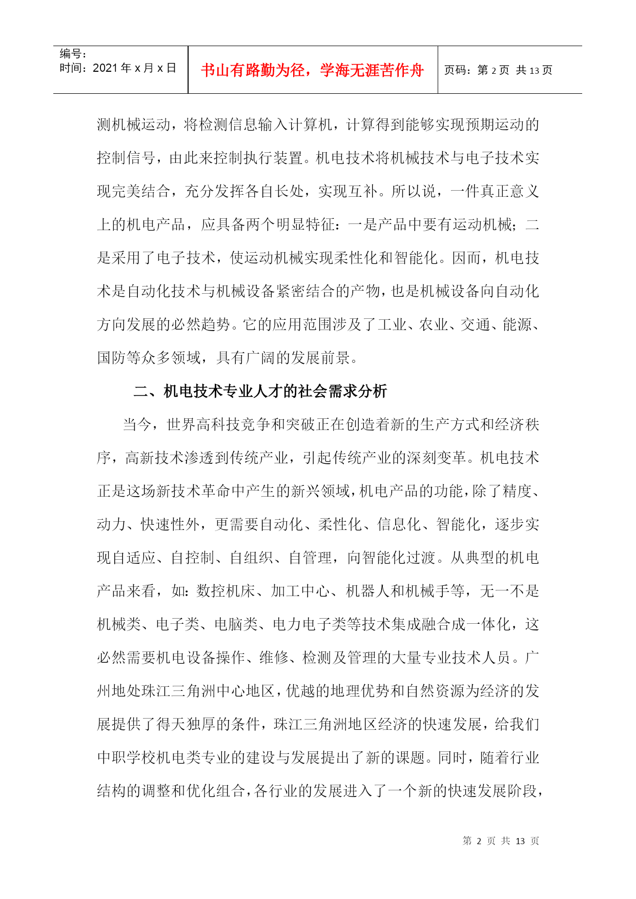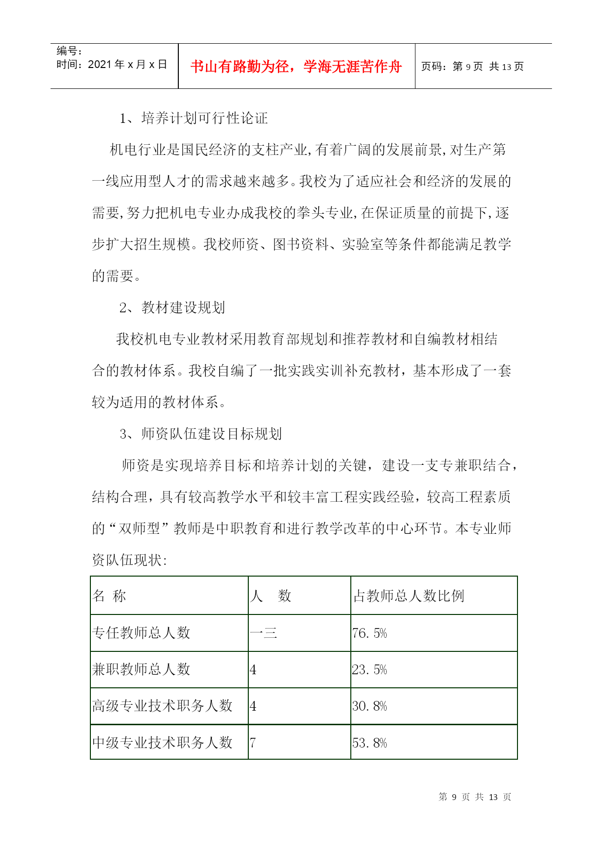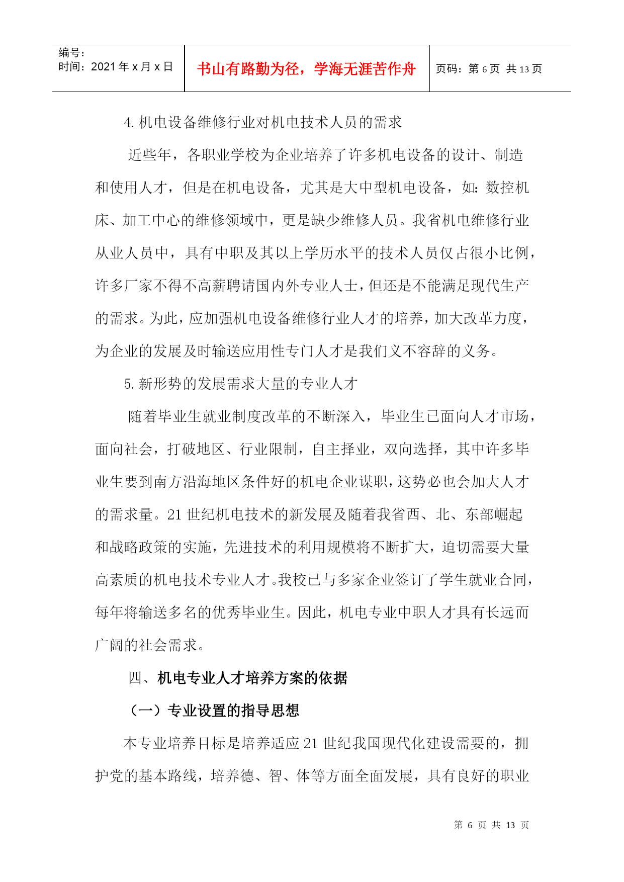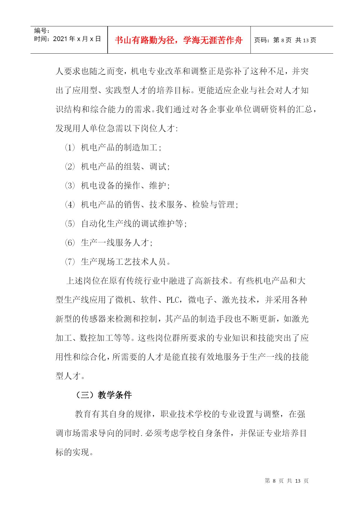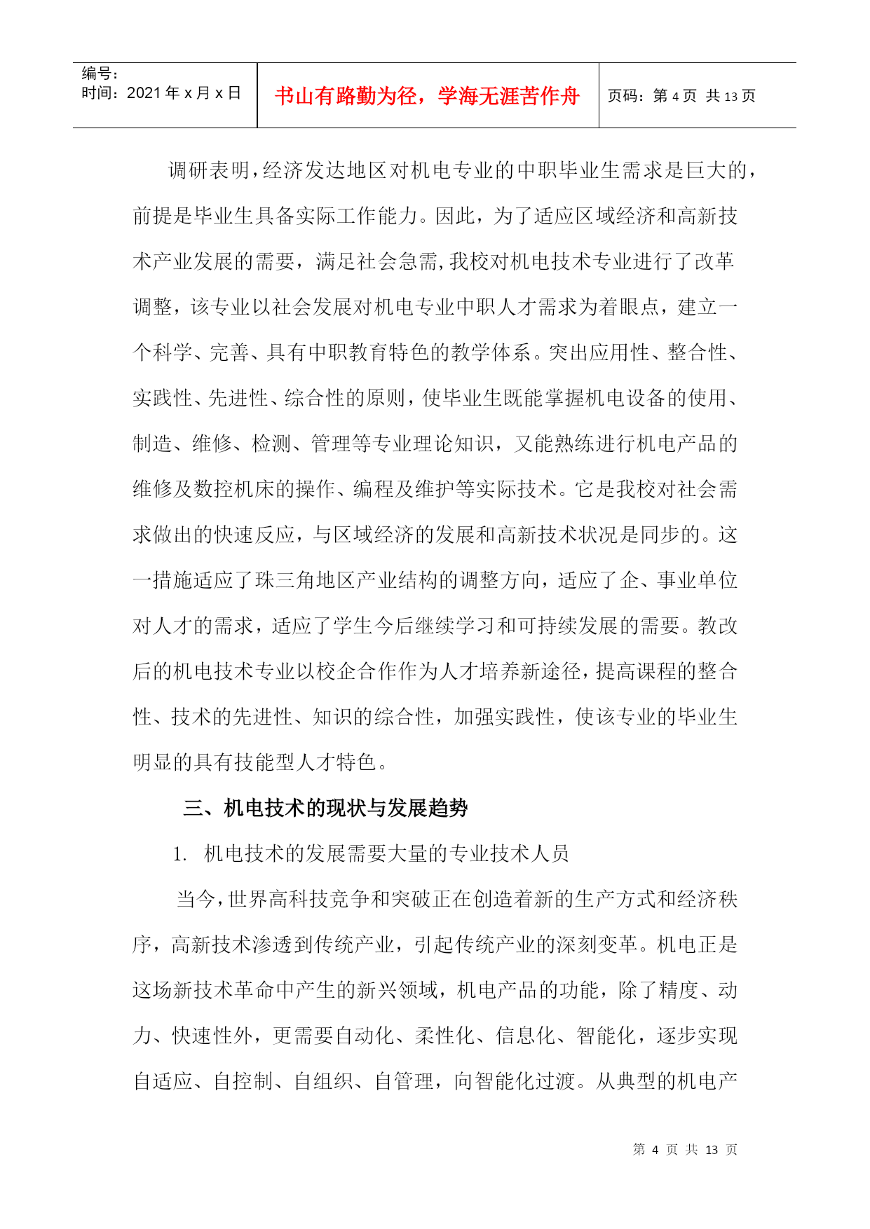 编号:时间:2021年x月x日书山有路勤为径,学海无涯苦作舟页码:第PAGE13页共NUMPAGES13页第PAGE\*MERGEFORMAT13页共NUMPAGES\*MERGEFORMAT13页HYPERLINK"xxxx/"附件6机电专业人才市场调研报告屈贵华为了满足社会对机电类中等职业技术人才的需求,加快了机电专业的建设步伐,并且对机电专业人才需求进行了广泛地社会调研。一、机电专业简介随着现代化工业生产的发展,自动化控制技术的集成应用正起着越来越重要的作用。由于气动技术、液压技术、传感器技术、PLC技术、网络及通讯技术等学科的强烈相互渗透而形成的机电技术,已成为当今工业科技的重要组成部分。机械技术可以承受较大载荷,但不易实现微小和复杂运动的控制,而电子技术则相反,不能承受较大载荷,却容易实现微小运动和复杂运动的控制。所以,传统意义上的机电,主要指机械与电工电子及电气控制这两方面的一体化,并且明显偏重于机械方面。当前,科技发展的态势特别注重学科间的交叉、融合以及电子计算机的应用。机电技术的内涵也发生了变化,它是利用电子技术、信息技术(主要包括传感器技术、控制技术、计算机技术等)使机械实现柔性化和智能化的技术。其本质是将电子技术引入机械控制中,也就是利用传感器检测机械运动,将检测信息输入计算机,计算得到能够实现预期运动的控制信号,由此来控制执行装置。机电技术将机械技术与电子技术实现完美结合,充分发挥各自长处,实现互补。所以说,一件真正意义上的机电产品,应具备两个明显特征:一是产品中要有运动机械;二是采用了电子技术,使运动机械实现柔性化和智能化。因而,机电技术是自动化技术与机械设备紧密结合的产物,也是机械设备向自动化方向发展的必然趋势。它的应用范围涉及了工业、农业、交通、能源、国防等众多领域,具有广阔的发展前景。二、机电技术专业人才的社会需求分析当今,世界高科技竞争和突破正在创造着新的生产方式和经济秩序,高新技术渗透到传统产业,引起传统产业的深刻变革。机电技术正是这场新技术革命中产生的新兴领域,机电产品的功能,除了精度、动力、快速性外,更需要自动化、柔性化、信息化、智能化,逐步实现自适应、自控制、自组织、自管理,向智能化过渡。从典型的机电产品来看,如:数控机床、加工中心、机器人和机械手等,无一不是机械类、电子类、电脑类、电力电子类等技术集成融合成一体化,这必然需要机电设备操作、维修、检测及管理的大量专业技术人员。广州地处珠江三角洲中心地区,优越的地理优势和自然资源为经济的发展提供了得天独厚的条件,珠江三角洲地区经济的快速发展,给我们中职学校机电类专业的建设与发展提出了新的课题。同时,随着行业结构的调整和优化组合,各行业的发展进入了一个新的快速发展阶段,因此对人才的需求量大增。尤其是机电技术,这种通用专业的技术人才需求量更大。另一方面,机电技术的应用面广,在诸如农、林、牧、渔产品的深加工企业,食品加工、造纸、印刷以及交通运输以至现代商业企业等都离不开机电技术。为充分满足科技发展及社会诸多企业对多方位人才的需要,我们校领导带领有关专业老师调研了一些大中型企业公司,还走访了一些很有发展前景的科研单位及兄弟职业学校,如广州风行模具厂、广州数控设备有限公司、深圳平进模具有限公司、深圳恒佳精密注塑模具有限公司等企业,这些单位大都是以高新技术为增长点,重点发展微电子、数控机床、模具设计与制造、智能仪器仪表、电子专用设备、机器人等主导产业。机、电、信息技术的综合应用是这些产业的主要特点。被调查的单位都涉及到机电技术的应用,大部分岗位需求综合素质高,具备机、电技术综合应用知识的技能型人才。在分别与企业领导、人事管理人员、技术人员、毕业生进行深入的交流和座谈后,充分意识到随着科学技术的不断进步和社会经济的迅猛发展,特别是近年来珠三角地区高新技术产业的迅速崛起,社会人才需求格局发生了很大变化。机电专业作为电气自动化、机械制造等专业的补充与延伸,机电类应用型、技能型人才将成为各企业争夺的对象。企、事业单位急需一线技能型操作人才,尤其是综合技术应用人才为我们的毕业生提供了广阔的就业空间。调研表明,经济发达地区对机电专业的中职毕业生需求是巨大的,前提是毕业生具备实际工作能力。因此,为了适应区域经济和高新技术产业发展的需要,满足社会急需,我校对机电技术专业进行了改革调整,该专业以社会发展对机电专业中职人才需求为着眼点,建立一个科学、完善、具有中职教育特色的教学体系。突出应用性、整合性、实践性、先进性、综合性的原则,使毕业生既能掌握机电设备的使用、制造、维修、检测、管理等专业理论知识,又能熟练进行机电产品的维修及数控机床的操作、编程及维护等实际技术。它是我校对社会需求做出的快速反应,与