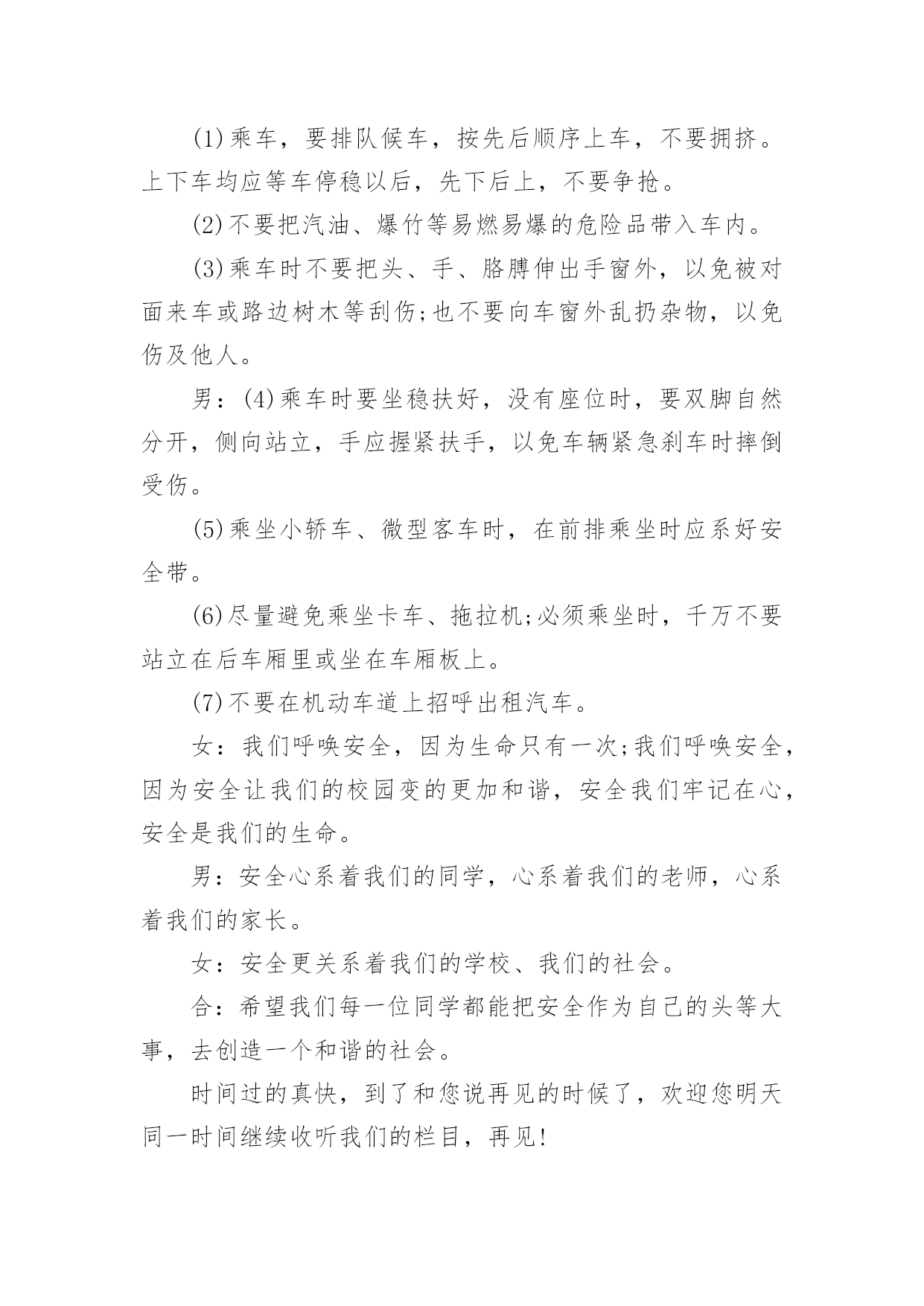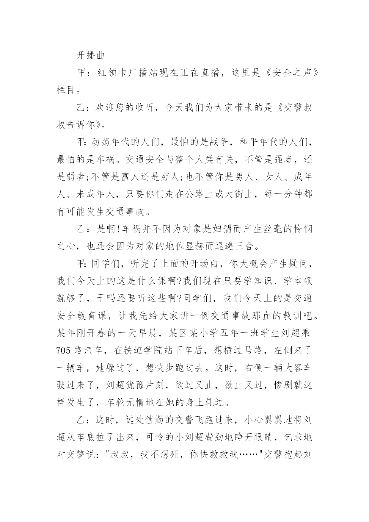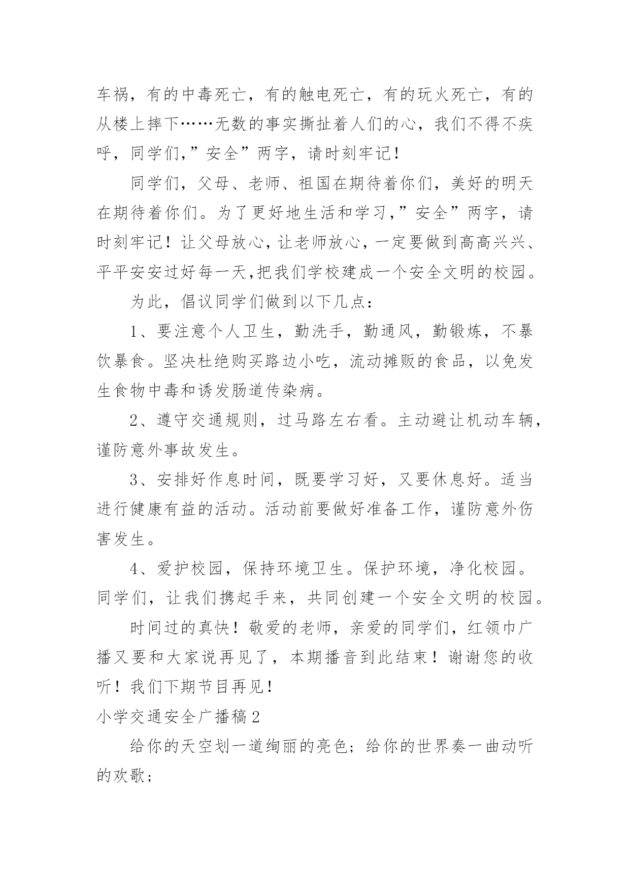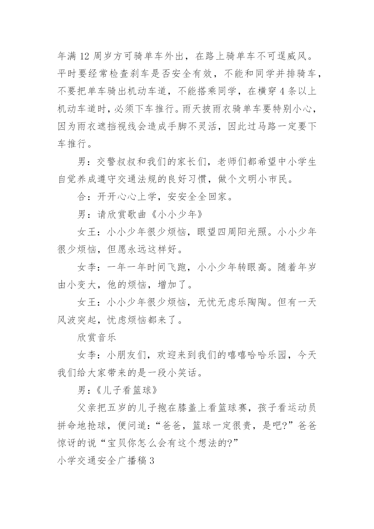 小学交通安全广播稿小学交通安全广播稿15篇在学校广播站锻炼的同学们,广播前一般都会提前做好广播稿,好的广播稿会带来更好的节目效果,那么问题来了,广播稿应该怎么写?下面是小编帮大家整理的小学交通安全广播稿,欢迎阅读,希望大家能够喜欢。小学交通安全广播稿1各位老师、各位同学:大家下午好!和煦的春风吹拂着我们的面庞,春光明媚的四月让人精神舒畅,而一个安全文明的校园更会让我们舒心。在此我们同学必须明白:你们在父母的眼里,是含苞欲放的花蕾;在老师的眼里,是早晨八点钟的太阳。这就是你们身上寄托着父母、老师、祖国的希望,心中涌动着绽放、高飞、长大的渴望。这就是你们家里父母瞩目的焦点,学校老师关注的中心。现在,正是你们学习知识、增长才干的开端。父母和老师竭尽全力为你们创造优越的生活和学习条件,希望你们茁壮成长,成为栋梁之材。然而,在紧张的学习之后,在快乐玩耍的时刻,在归心似箭的回家途中,有些同学忘了”安全”两字,忽视了安全问题,让关心你们的.老师、家长时时担心着,时时牵挂着。我们经常在报刊上,电视里看到,有的同学在游泳时出事故,有的在公路上出了车祸,有的中毒死亡,有的触电死亡,有的玩火死亡,有的从楼上摔下……无数的事实撕扯着人们的心,我们不得不疾呼,同学们,”安全”两字,请时刻牢记!同学们,父母、老师、祖国在期待着你们,美好的明天在期待着你们。为了更好地生活和学习,”安全”两字,请时刻牢记!让父母放心,让老师放心,一定要做到高高兴兴、平平安安过好每一天,把我们学校建成一个安全文明的校园。为此,倡议同学们做到以下几点:1、要注意个人卫生,勤洗手,勤通风,勤锻炼,不暴饮暴食。坚决杜绝购买路边小吃,流动摊贩的食品,以免发生食物中毒和诱发肠道传染病。2、遵守交通规则,过马路左右看。主动避让机动车辆,谨防意外事故发生。3、安排好作息时间,既要学习好,又要休息好。适当进行健康有益的活动。活动前要做好准备工作,谨防意外伤害发生。4、爱护校园,保持环境卫生。保护环境,净化校园。同学们,让我们携起手来,共同创建一个安全文明的校园。时间过的真快!敬爱的老师,亲爱的同学们,红领巾广播又要和大家说再见了,本期播音到此结束!谢谢您的收听!我们下期节目再见!小学交通安全广播稿2给你的天空划一道绚丽的亮色;给你的世界奏一曲动听的欢歌;同学们,老师们,大家早上好,小营小学校园广播又开播了,我是今天的主持人***,今天,我们为您准备的栏目是《安全之声》。安全相信是每一个人在做事前考虑的第一要点,因为只有安全了,才能使宝贵的生命不受到伤害,使生活充满欢乐、更加美好。现在,小学生们的安全教育更应值得重视。在我们学校,越是高年级的人越是不注意安全。尽管学校每学期都对大家进行了“安全教育”,可有些同学一句也听不进,干了许多危险的事。上学违反交通规则,走路开小差;在学校爬单杠、肋木,摔跤,楼梯上打闹,还有的同学在冰雪天气滑冰,打雪仗。我亲眼见了一位同学在滑冰时摔了出去。大家想想,我们是否应该重视安全教育呢?我觉得青少年应该时刻注意安全,爱惜财产,珍惜生命,不做危险的事情,别人不注意安全要提醒;多学习安全知识,提高自己的安全意识,选择适当的环境,了解一些生活常识,如防火、防水、防盗、防电、防毒;做事先考虑后果,这样才能使我们的生活更美好!我们一定要记住:每个人心中第一的是安全,第二的是安全,第三还是安全。如果你想好好学习、生活,那你一定要记住平安是生命中的100%。女:安全是一个古老的话题,为了安全人类进行过艰苦拼搏。男:安全是一门奇妙的科学,为了安全,人类经受过长期探索。女:安全关系生,关系死,关系生活,为了安全人类战胜了无数灾祸。男:安全关系你,关系我,关系祖国,为了安全,人类经历了多少战火。女:安全,一个永恒的话题,在科技发展的今天,是安全扞卫着我们的生命;是安全在维护我们生存的利益;是安全在为我们注入无限的力量。交通安全更是与我们密切相关。男:人人都必须遵守交通规则,那么在上下学的路上我们应该遵守哪些规则呢?女:同学们我们上下学的时候必须遵守下列规定:(1)必须靠边行走;走路时不许打闹,听音乐。(2)放学时低年级学生必须等自己的家长带领,不能自己走。(3)如要横过车行道,必须等到没有车时。(4)不准在道上扒车、追车、强行拦车或抛物击车。(5)列队通过道路时,每横列不准超过2人。儿童的队列,须有大人带领。男:当我们横穿马路时必须谨记:(1)穿越马路时,要走直线,不可迂回穿行;(2)不要突然横穿马路,特别是马路对面有熟人、朋友呼唤,或者自己要乘坐的汽车时,千万不能贸然行事,以免发生意外。女:乘车同学必须遵守下列规定:(1)乘车,要排队候车,按先后顺序上车,不要拥挤。上下车均应等车停稳以后,先下后上,不要争抢。(2)不要把汽油、爆竹等易燃易爆的危险品带入车内。(3)乘车时不要把头、