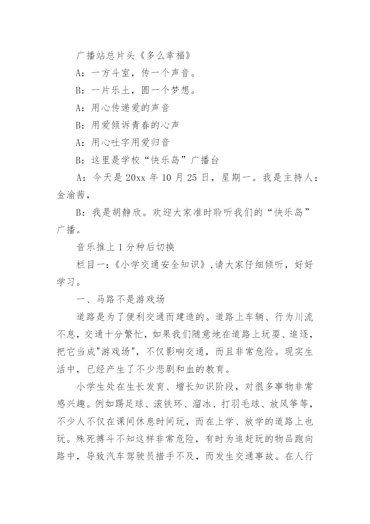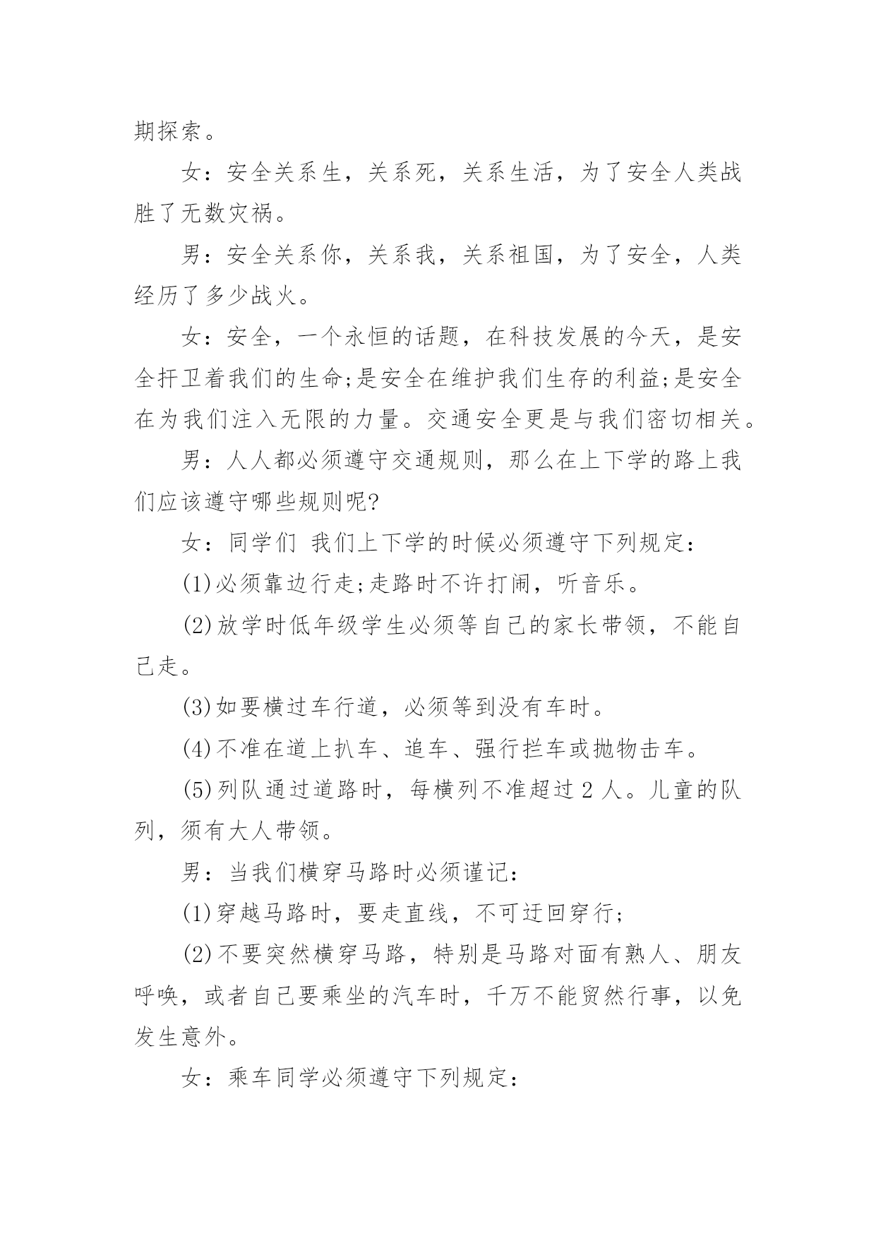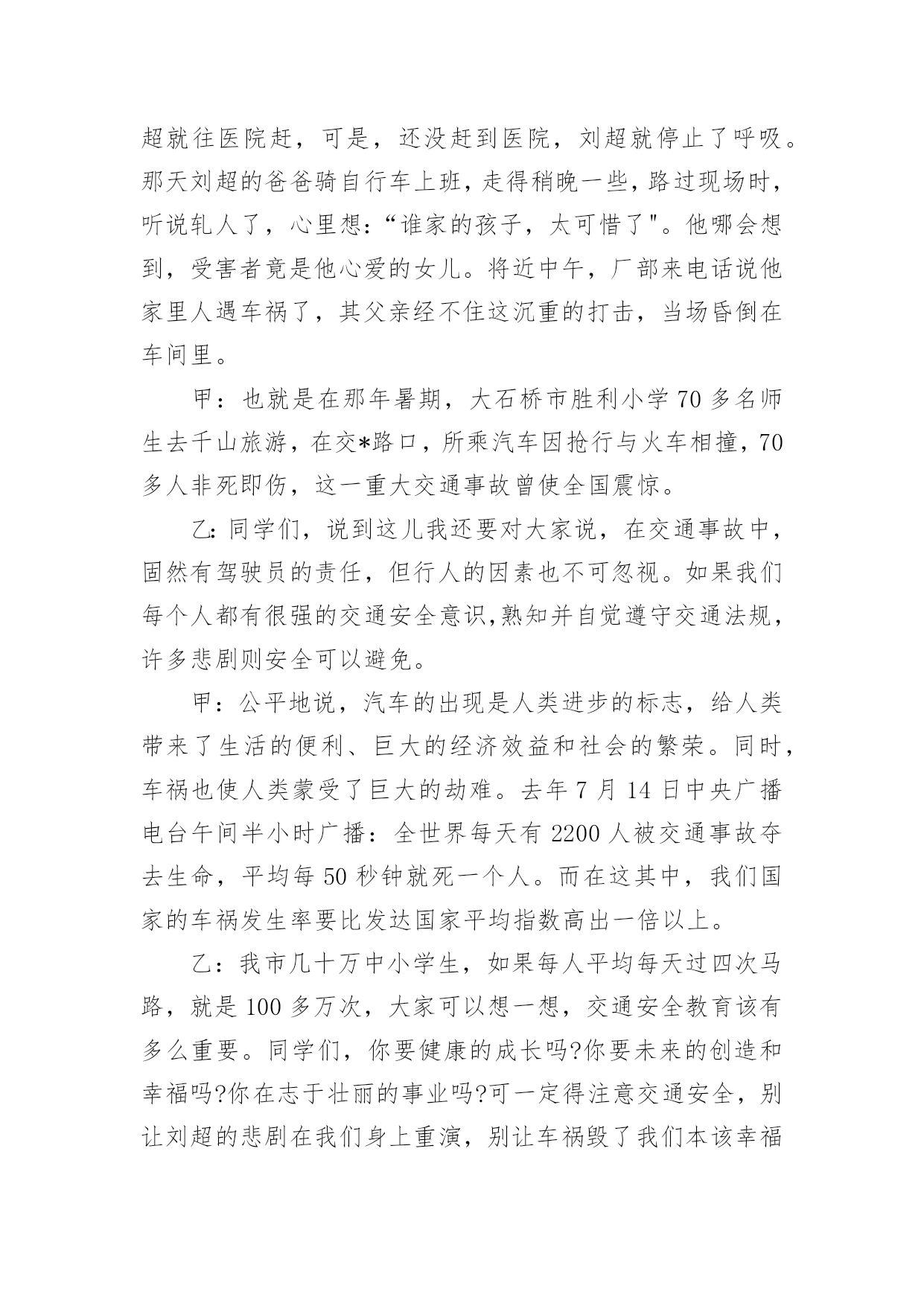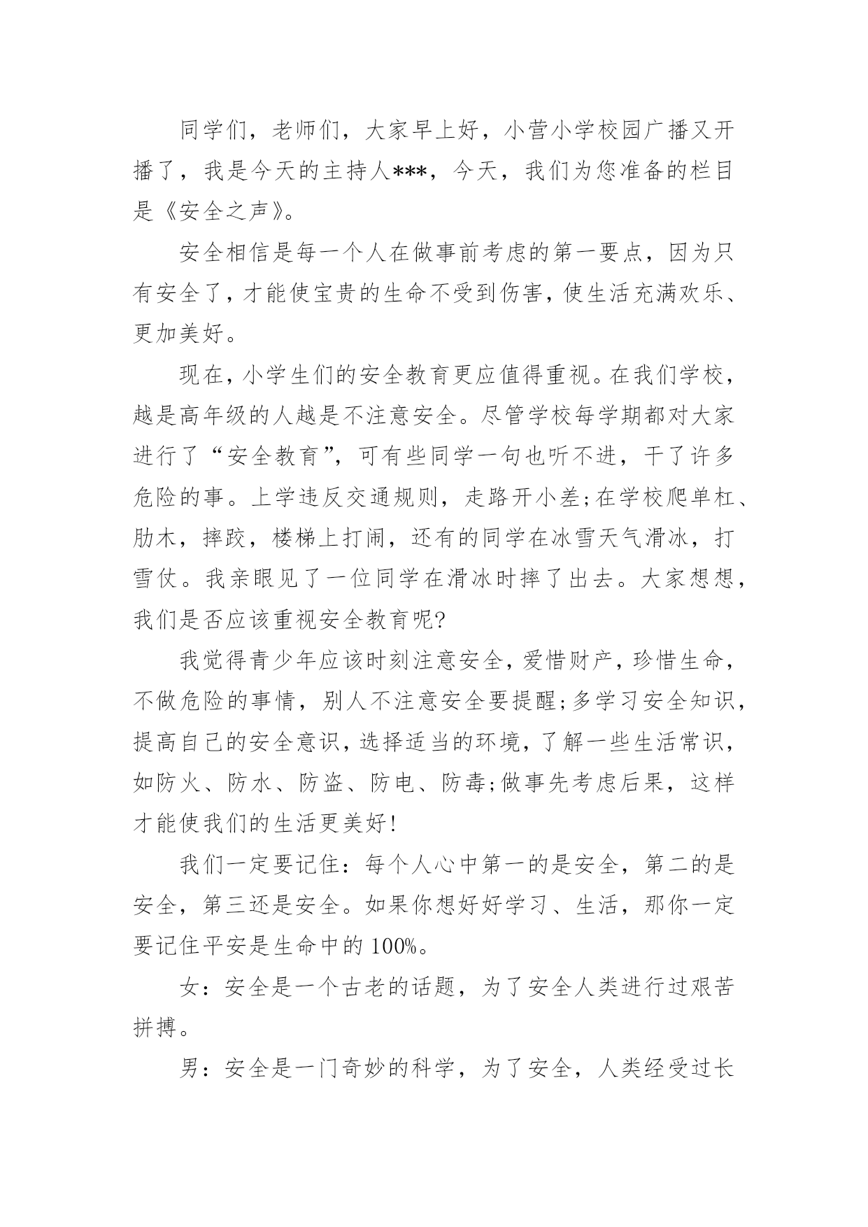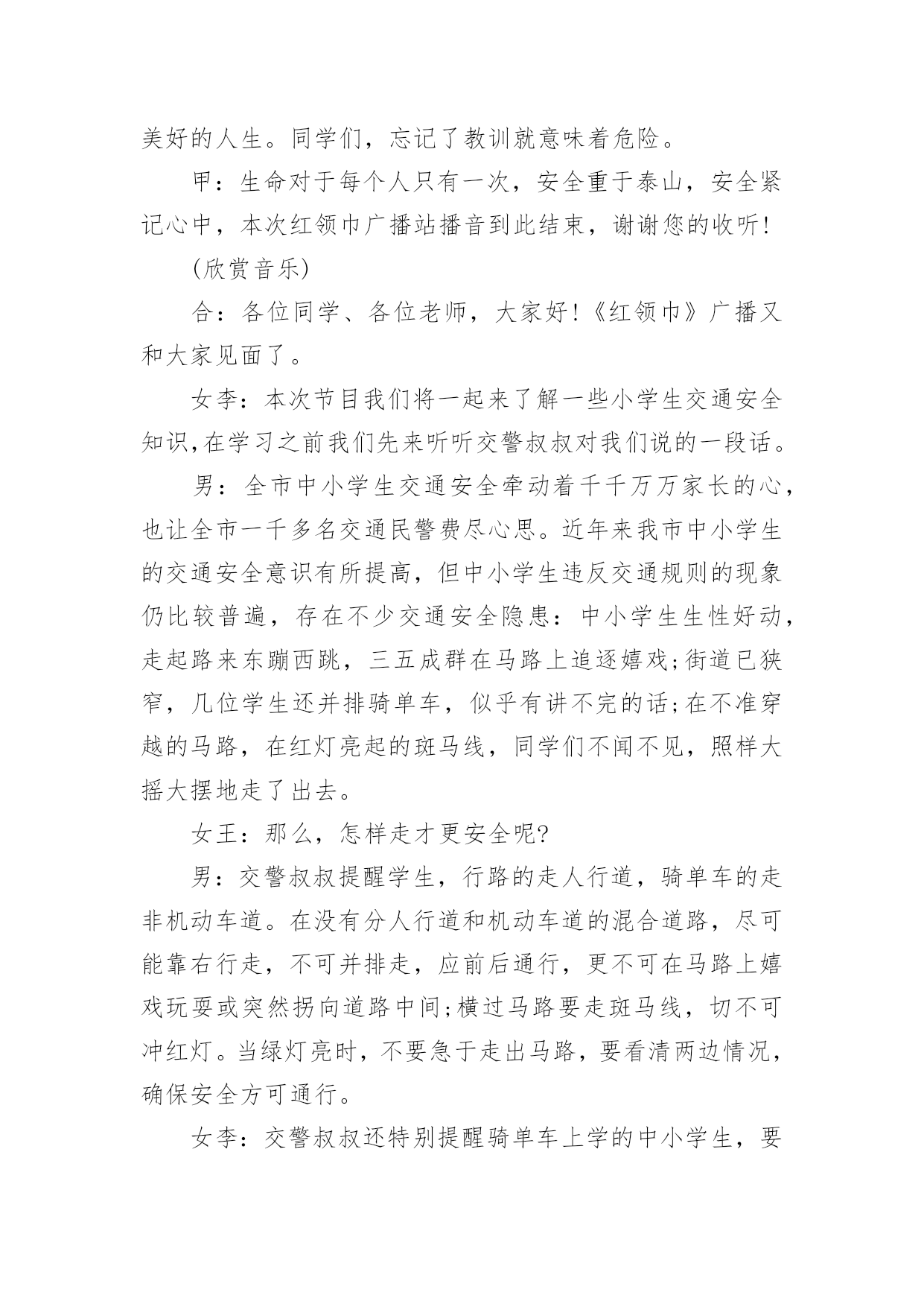 小学交通安全广播稿小学交通安全广播稿15篇在学校广播站锻炼的同学们,广播前一般都会提前做好广播稿,好的广播稿会带来更好的节目效果,那么问题来了,广播稿应该怎么写?下面是小编帮大家整理的小学交通安全广播稿,欢迎阅读,希望大家能够喜欢。小学交通安全广播稿1各位老师、各位同学:大家下午好!和煦的春风吹拂着我们的面庞,春光明媚的四月让人精神舒畅,而一个安全文明的校园更会让我们舒心。在此我们同学必须明白:你们在父母的眼里,是含苞欲放的花蕾;在老师的眼里,是早晨八点钟的太阳。这就是你们身上寄托着父母、老师、祖国的希望,心中涌动着绽放、高飞、长大的渴望。这就是你们家里父母瞩目的焦点,学校老师关注的中心。现在,正是你们学习知识、增长才干的开端。父母和老师竭尽全力为你们创造优越的生活和学习条件,希望你们茁壮成长,成为栋梁之材。然而,在紧张的学习之后,在快乐玩耍的时刻,在归心似箭的回家途中,有些同学忘了”安全”两字,忽视了安全问题,让关心你们的.老师、家长时时担心着,时时牵挂着。我们经常在报刊上,电视里看到,有的同学在游泳时出事故,有的在公路上出了车祸,有的中毒死亡,有的触电死亡,有的玩火死亡,有的从楼上摔下……无数的事实撕扯着人们的心,我们不得不疾呼,同学们,”安全”两字,请时刻牢记!同学们,父母、老师、祖国在期待着你们,美好的明天在期待着你们。为了更好地生活和学习,”安全”两字,请时刻牢记!让父母放心,让老师放心,一定要做到高高兴兴、平平安安过好每一天,把我们学校建成一个安全文明的校园。为此,倡议同学们做到以下几点:1、要注意个人卫生,勤洗手,勤通风,勤锻炼,不暴饮暴食。坚决杜绝购买路边小吃,流动摊贩的食品,以免发生食物中毒和诱发肠道传染病。2、遵守交通规则,过马路左右看。主动避让机动车辆,谨防意外事故发生。3、安排好作息时间,既要学习好,又要休息好。适当进行健康有益的活动。活动前要做好准备工作,谨防意外伤害发生。4、爱护校园,保持环境卫生。保护环境,净化校园。同学们,让我们携起手来,共同创建一个安全文明的校园。时间过的真快!敬爱的老师,亲爱的同学们,红领巾广播又要和大家说再见了,本期播音到此结束!谢谢您的收听!我们下期节目再见!小学交通安全广播稿2给你的天空划一道绚丽的亮色;给你的世界奏一曲动听的欢歌;同学们,老师们,大家早上好,小营小学校园广播又开播了,我是今天的主持人***,今天,我们为您准备的栏目是《安全之声》。安全相信是每一个人在做事前考虑的第一要点,因为只有安全了,才能使宝贵的生命不受到伤害,使生活充满欢乐、更加美好。现在,小学生们的安全教育更应值得重视。在我们学校,越是高年级的人越是不注意安全。尽管学校每学期都对大家进行了“安全教育”,可有些同学一句也听不进,干了许多危险的事。上学违反交通规则,走路开小差;在学校爬单杠、肋木,摔跤,楼梯上打闹,还有的同学在冰雪天气滑冰,打雪仗。我亲眼见了一位同学在滑冰时摔了出去。大家想想,我们是否应该重视安全教育呢?我觉得青少年应该时刻注意安全,爱惜财产,珍惜生命,不做危险的事情,别人不注意安全要提醒;多学习安全知识,提高自己的安全意识,选择适当的环境,了解一些生活常识,如防火、防水、防盗、防电、防毒;做事先考虑后果,这样才能使我们的生活更美好!我们一定要记住:每个人心中第一的是安全,第二的是安全,第三还是安全。如果你想好好学习、生活,那你一定要记住平安是生命中的100%。女:安全是一个古老的话题,为了安全人类进行过艰苦拼搏。男:安全是一门奇妙的科学,为了安全,人类经受过长期探索。女:安全关系生,关系死,关系生活,为了安全人类战胜了无数灾祸。男:安全关系你,关系我,关系祖国,为了安全,人类经历了多少战火。女:安全,一个永恒的话题,在科技发展的今天,是安全扞卫着我们的生命;是安全在维护我们生存的利益;是安全在为我们注入无限的力量。交通安全更是与我们密切相关。男:人人都必须遵守交通规则,那么在上下学的路上我们应该遵守哪些规则呢?女:同学们我们上下学的时候必须遵守下列规定:(1)必须靠边行走;走路时不许打闹,听音乐。(2)放学时低年级学生必须等自己的家长带领,不能自己走。(3)如要横过车行道,必须等到没有车时。(4)不准在道上扒车、追车、强行拦车或抛物击车。(5)列队通过道路时,每横列不准超过2人。儿童的队列,须有大人带领。男:当我们横穿马路时必须谨记:(1)穿越马路时,要走直线,不可迂回穿行;(2)不要突然横穿马路,特别是马路对面有熟人、朋友呼唤,或者自己要乘坐的汽车时,千万不能贸然行事,以免发生意外。女:乘车同学必须遵守下列规定:(1)乘车,要排队候车,按先后顺序上车,不要拥挤。上下车均应等车停稳以后,先下后上,不要争抢。(2)不要把汽油、爆竹等易燃易爆的危险品带入车内。(3)乘车时不要把头、