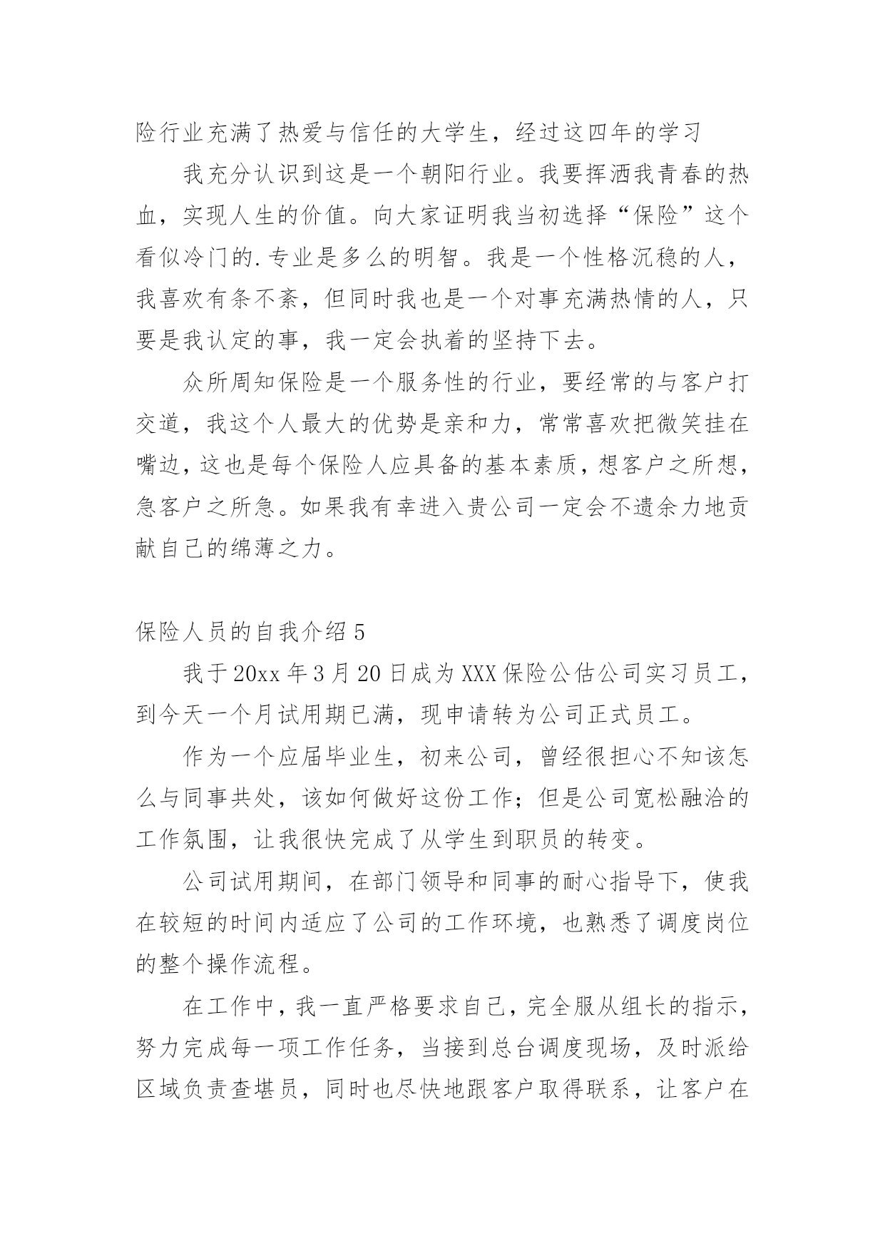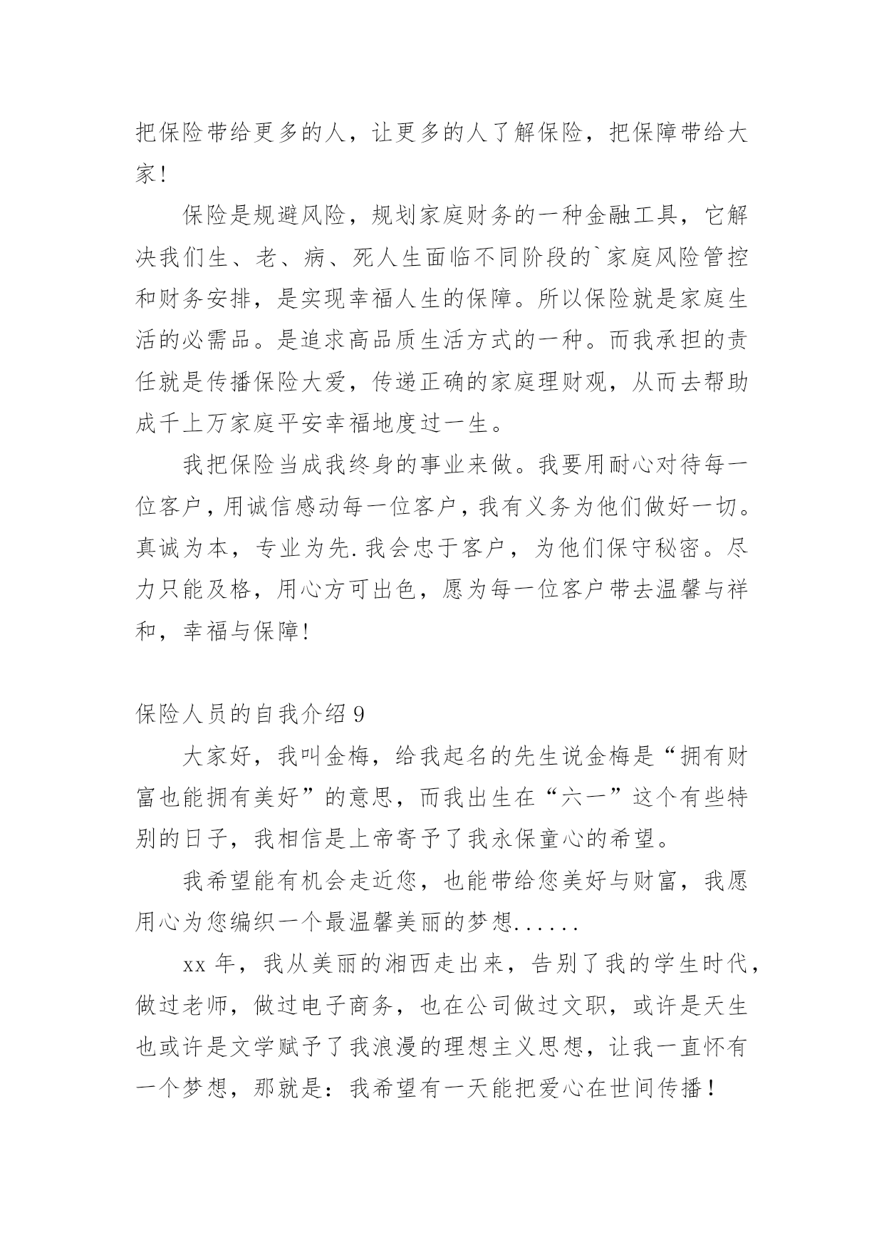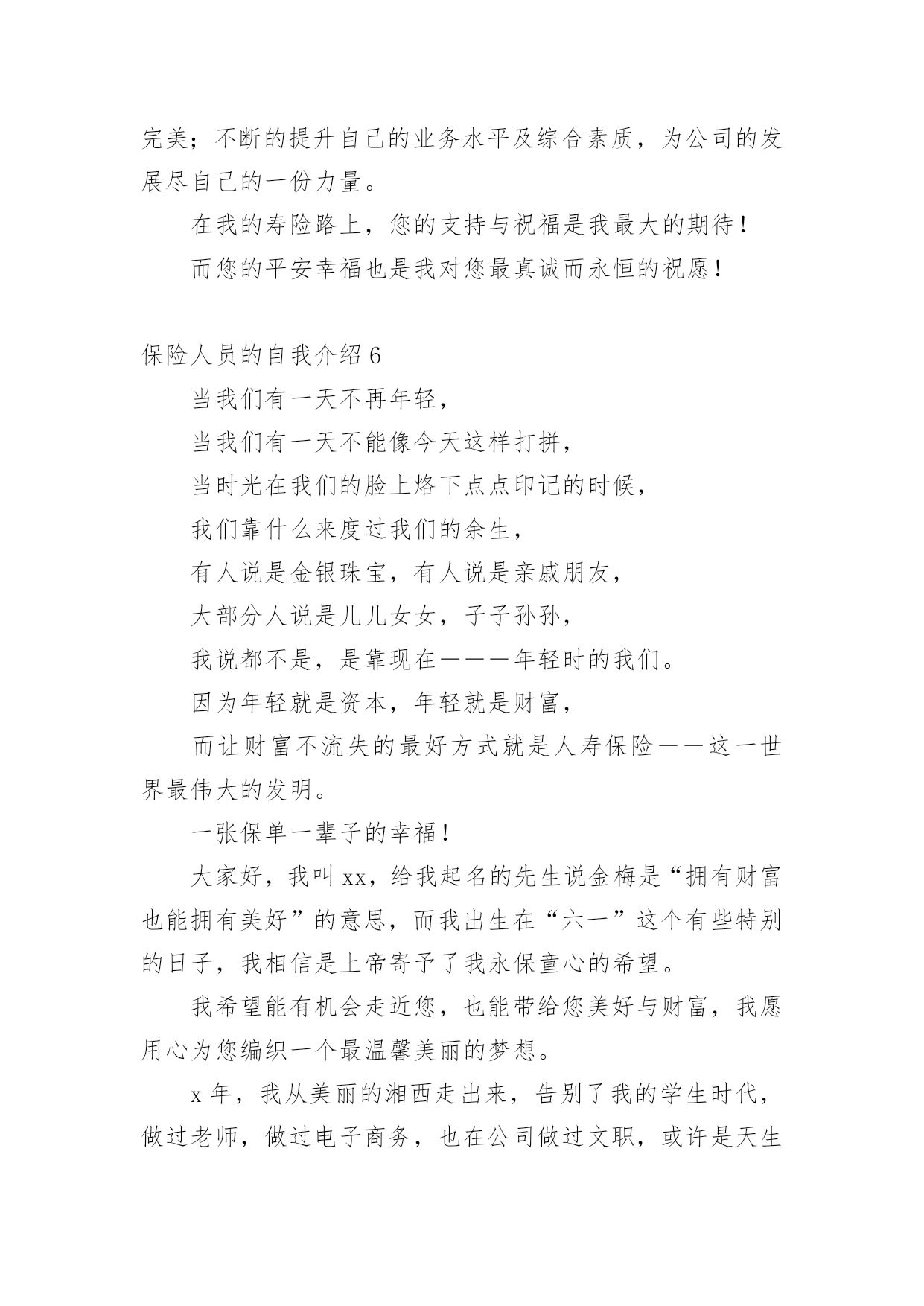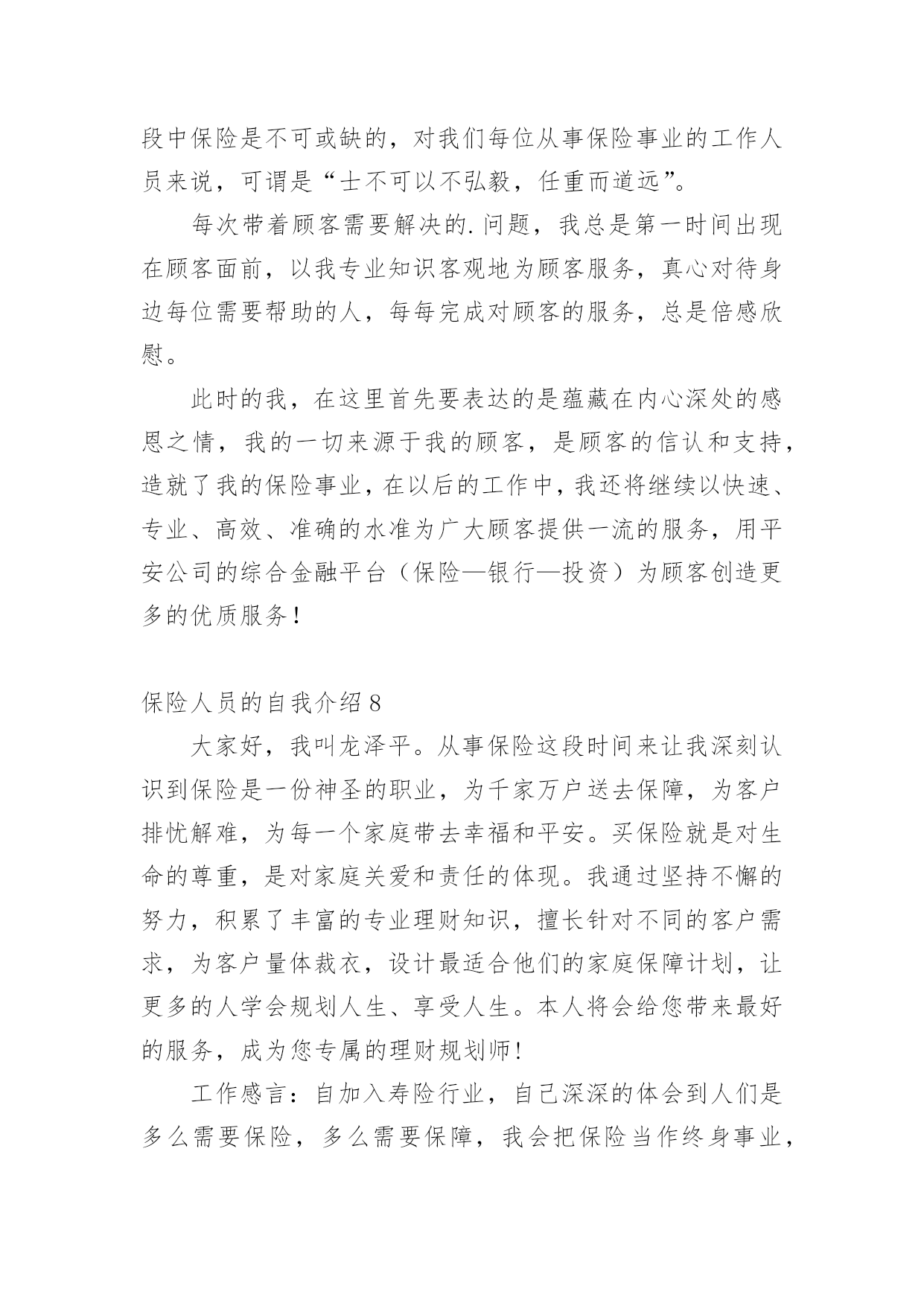 保险人员的自我介绍来到一个完全陌生的环境,我们有必要进行适当的自我介绍,用自我介绍往往可以让他人有一定的了解。你所见过的自我介绍是什么样的呢?下面是小编为大家收集的保险人员的自我介绍,仅供参考,大家一起来看看吧。保险人员的自我介绍120xx年7月毕业于河北科技大学,获得学士学位,数学与应用数学专业,但我本人对经济学一直十分感兴趣,除了拜读西方的经济学著作外,从事经济金融工作一直是我的梦想。20xx年7月19号非常有幸加入河北首家外资寿险公司中英人寿,成为公司第一批储备经理,经历了全方位的培训,成为公司最专业的理财顾问,是公司重点培养对象之一。加盟中英人寿是我第一次从事寿险行业,从入职至今,所服务的客户基本上为中高阶层的.白领及成功人士,且专业度较高,不断取得客户的信任和转介绍。我的从业格言是:以客户需求为导向,站在客户的角度,帮助客户实现财物的安全与自由。保险人员的自我介绍2各位领导各位评委你们好!我叫xx今年40岁。我出生在一个偏僻的小山村里。记得小的时候这个山村没有电。也没有像样的路。人们过着日出而做日落而息的生活。经济和信息都是那样的落后!那时我就发誓等我长大了一定要走出去走出一条辉煌的人生之路当我为自己的理想勾画蓝图的时侯母亲因病医治无效离开了仅仅14岁的我!当美好的希望在我的脑海里即将画上句号的时候。我的老师鼓励我说;“孩子你已经长大了你是个男子汉我相信你一定能实现自己的梦想;”是老师鼓励了我!就这样抱着我的理想和希望大学毕业了。因为多种原因我下海经商开了一家餐厅。也经过了6次的层级考试我拥有了国家特一级厨师的证书!XX年4月一个偶然的机会我做了一名兼职寿险营销员。在此我参加了多次的学习对保险有了新的.认识。虽然寿险营销在大陆才十几年的历程。但我知道一定是最有发展。是长久不衰朝阳的行业。一年以后我放下了所有的行业全心全意的做了一名专职保险营销员现在已经是第6年在这6年里经历过无数次打击和挫折。。。但是我都坚持了下来因为我知道风雨过后才会见彩虹......今天能有这次培训的机会给了我更大的信心因为掌握的知识越多就越能与客户找到知己般共鸣的话题。知识不是力量使用知识才是力量!如今的我历经生活的经验。在年龄上我以不再有优势但是我更多了一份耐心。责任心。多了一份成熟和自信我十分注重自身的发展广泛地培养自己口才和技能如果我通过了面试成为众多学员中的一员我将会加倍的努力学习努力工作为我们的公司打造一支高活动率。高产能的精品团队为家乡父老乡亲保驾护航。希望各位领导各位评委!给我这次学习的机会因为我爱寿险事业在这里能展现我人生价值实现我的梦想我要用我所学为我们公司做出最大贡献我会用实际行动来回报公司回报老师以及社会对我的栽培。保险人员的自我介绍3本人叫XXX,来自XXX,年龄XX岁。于今年6月份毕业于桂林电子科技大学新闻出版学院,专业为市场营销,本人以前做过保险销售和销销售,所以对销售有一定的经验。此外,本人在新华书店门市工作过,对服务好顾客有一定的心得。本人的英语基础良好,已获得了大学英语四级证书,也在外贸公司实习过。本人奉行态度决定一切的原则,本人相信只要踏踏实实的做好每一个细节,服务好客户,通过自己的不懈努力,一定会在拥有出色的工作业绩。请考官考虑给本人提供一个试岗的机会,本人有信心做好该岗位工作,愿服从贵公司的.安排,随时可以就任岗位,并在贵公司做长期发展的准备,因为是贵公司给了本人这样一个机会。保险人员的自我介绍4尊敬的领导您好:很荣幸贵公司给我一个介绍自己的机会。我是一个对保险行业充满了热爱与信任的大学生,经过这四年的学习我充分认识到这是一个朝阳行业。我要挥洒我青春的热血,实现人生的价值。向大家证明我当初选择“保险”这个看似冷门的.专业是多么的明智。我是一个性格沉稳的人,我喜欢有条不紊,但同时我也是一个对事充满热情的人,只要是我认定的事,我一定会执着的坚持下去。众所周知保险是一个服务性的行业,要经常的与客户打交道,我这个人最大的优势是亲和力,常常喜欢把微笑挂在嘴边,这也是每个保险人应具备的基本素质,想客户之所想,急客户之所急。如果我有幸进入贵公司一定会不遗余力地贡献自己的绵薄之力。保险人员的自我介绍5我于20xx年3月20日成为XXX保险公估公司实习员工,到今天一个月试用期已满,现申请转为公司正式员工。作为一个应届毕业生,初来公司,曾经很担心不知该怎么与同事共处,该如何做好这份工作;但是公司宽松融洽的工作氛围,让我很快完成了从学生到职员的转变。公司试用期间,在部门领导和同事的耐心指导下,使我在较短的时间内适应了公司的工作环境,也熟悉了调度岗位的整个操作流程。在工作中,我一直严格要求自己,完全服从组长的指示,努力完成每一项工作任务,当接到总台调度现场,及时派给区域负责查堪员,同时也尽快地跟客户取得联系,让客户在现场不要