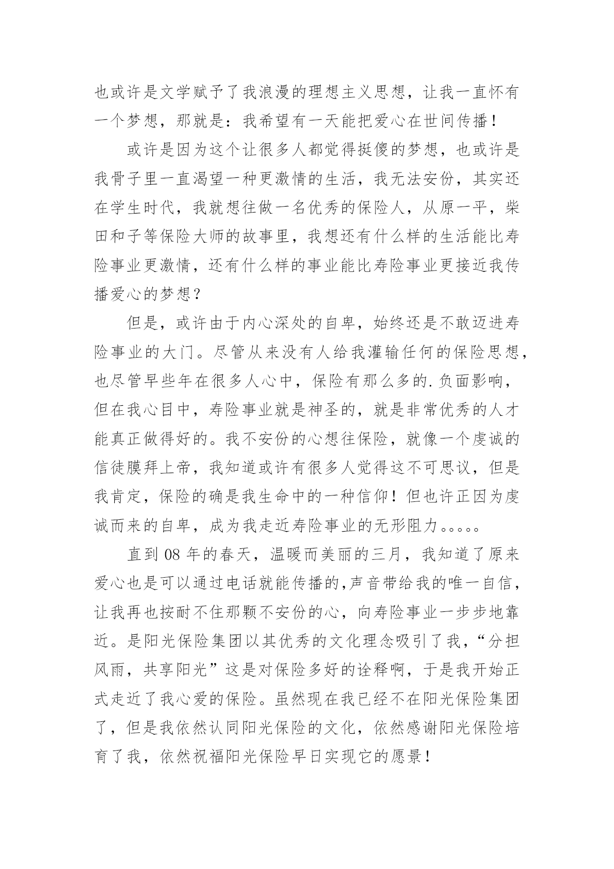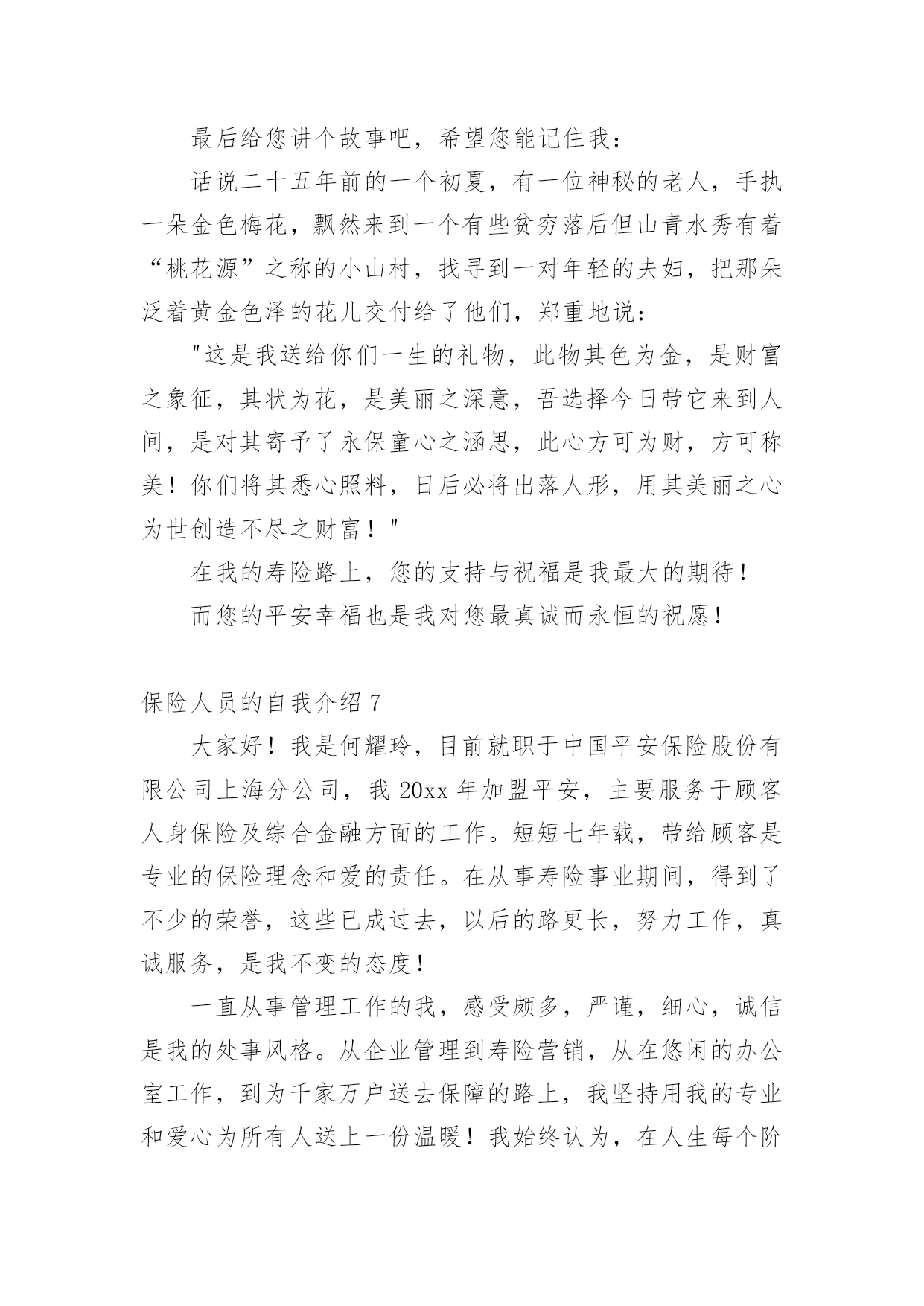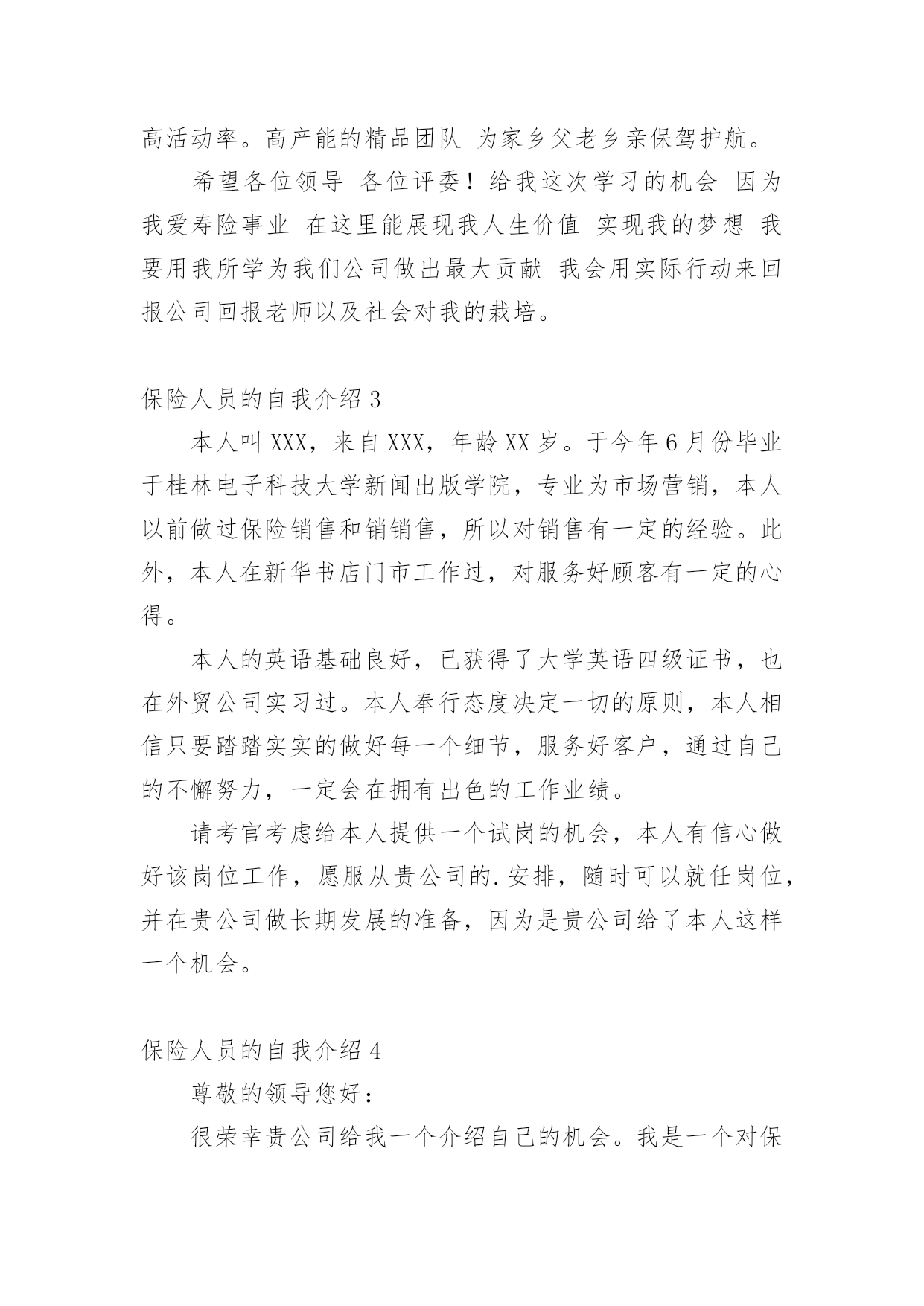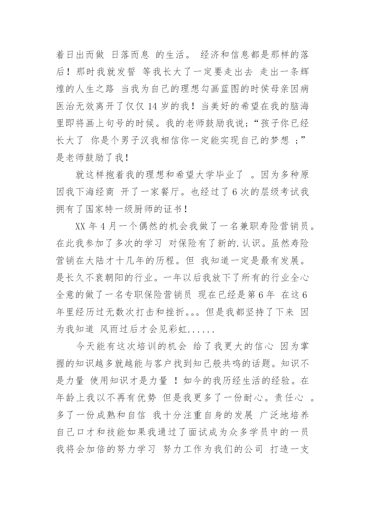 保险人员的自我介绍来到一个完全陌生的环境,我们有必要进行适当的自我介绍,用自我介绍往往可以让他人有一定的了解。你所见过的自我介绍是什么样的呢?下面是小编为大家收集的保险人员的自我介绍,仅供参考,大家一起来看看吧。保险人员的自我介绍120xx年7月毕业于河北科技大学,获得学士学位,数学与应用数学专业,但我本人对经济学一直十分感兴趣,除了拜读西方的经济学著作外,从事经济金融工作一直是我的梦想。20xx年7月19号非常有幸加入河北首家外资寿险公司中英人寿,成为公司第一批储备经理,经历了全方位的培训,成为公司最专业的理财顾问,是公司重点培养对象之一。加盟中英人寿是我第一次从事寿险行业,从入职至今,所服务的客户基本上为中高阶层的.白领及成功人士,且专业度较高,不断取得客户的信任和转介绍。我的从业格言是:以客户需求为导向,站在客户的角度,帮助客户实现财物的安全与自由。保险人员的自我介绍2各位领导各位评委你们好!我叫xx今年40岁。我出生在一个偏僻的小山村里。记得小的时候这个山村没有电。也没有像样的路。人们过着日出而做日落而息的生活。经济和信息都是那样的落后!那时我就发誓等我长大了一定要走出去走出一条辉煌的人生之路当我为自己的理想勾画蓝图的时侯母亲因病医治无效离开了仅仅14岁的我!当美好的希望在我的脑海里即将画上句号的时候。我的老师鼓励我说;“孩子你已经长大了你是个男子汉我相信你一定能实现自己的梦想;”是老师鼓励了我!就这样抱着我的理想和希望大学毕业了。因为多种原因我下海经商开了一家餐厅。也经过了6次的层级考试我拥有了国家特一级厨师的证书!XX年4月一个偶然的机会我做了一名兼职寿险营销员。在此我参加了多次的学习对保险有了新的.认识。虽然寿险营销在大陆才十几年的历程。但我知道一定是最有发展。是长久不衰朝阳的行业。一年以后我放下了所有的行业全心全意的做了一名专职保险营销员现在已经是第6年在这6年里经历过无数次打击和挫折。。。但是我都坚持了下来因为我知道风雨过后才会见彩虹......今天能有这次培训的机会给了我更大的信心因为掌握的知识越多就越能与客户找到知己般共鸣的话题。知识不是力量使用知识才是力量!如今的我历经生活的经验。在年龄上我以不再有优势但是我更多了一份耐心。责任心。多了一份成熟和自信我十分注重自身的发展广泛地培养自己口才和技能如果我通过了面试成为众多学员中的一员我将会加倍的努力学习努力工作为我们的公司打造一支高活动率。高产能的精品团队为家乡父老乡亲保驾护航。希望各位领导各位评委!给我这次学习的机会因为我爱寿险事业在这里能展现我人生价值实现我的梦想我要用我所学为我们公司做出最大贡献我会用实际行动来回报公司回报老师以及社会对我的栽培。保险人员的自我介绍3本人叫XXX,来自XXX,年龄XX岁。于今年6月份毕业于桂林电子科技大学新闻出版学院,专业为市场营销,本人以前做过保险销售和销销售,所以对销售有一定的经验。此外,本人在新华书店门市工作过,对服务好顾客有一定的心得。本人的英语基础良好,已获得了大学英语四级证书,也在外贸公司实习过。本人奉行态度决定一切的原则,本人相信只要踏踏实实的做好每一个细节,服务好客户,通过自己的不懈努力,一定会在拥有出色的工作业绩。请考官考虑给本人提供一个试岗的机会,本人有信心做好该岗位工作,愿服从贵公司的.安排,随时可以就任岗位,并在贵公司做长期发展的准备,因为是贵公司给了本人这样一个机会。保险人员的自我介绍4尊敬的领导您好:很荣幸贵公司给我一个介绍自己的机会。我是一个对保险行业充满了热爱与信任的大学生,经过这四年的学习我充分认识到这是一个朝阳行业。我要挥洒我青春的热血,实现人生的价值。向大家证明我当初选择“保险”这个看似冷门的.专业是多么的明智。我是一个性格沉稳的人,我喜欢有条不紊,但同时我也是一个对事充满热情的人,只要是我认定的事,我一定会执着的坚持下去。众所周知保险是一个服务性的行业,要经常的与客户打交道,我这个人最大的优势是亲和力,常常喜欢把微笑挂在嘴边,这也是每个保险人应具备的基本素质,想客户之所想,急客户之所急。如果我有幸进入贵公司一定会不遗余力地贡献自己的绵薄之力。保险人员的自我介绍5我于20xx年3月20日成为XXX保险公估公司实习员工,到今天一个月试用期已满,现申请转为公司正式员工。作为一个应届毕业生,初来公司,曾经很担心不知该怎么与同事共处,该如何做好这份工作;但是公司宽松融洽的工作氛围,让我很快完成了从学生到职员的转变。公司试用期间,在部门领导和同事的耐心指导下,使我在较短的时间内适应了公司的工作环境,也熟悉了调度岗位的整个操作流程。在工作中,我一直严格要求自己,完全服从组长的指示,努力完成每一项工作任务,当接到总台调度现场,及时派给区域负责查堪员,同时也尽快地跟客户取得联系,让客户在现场不要