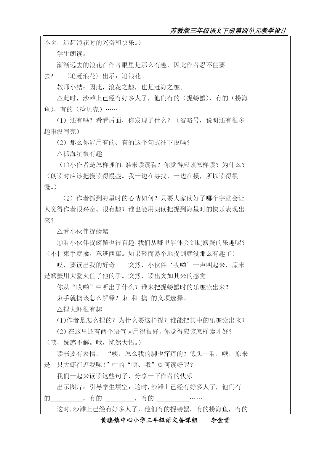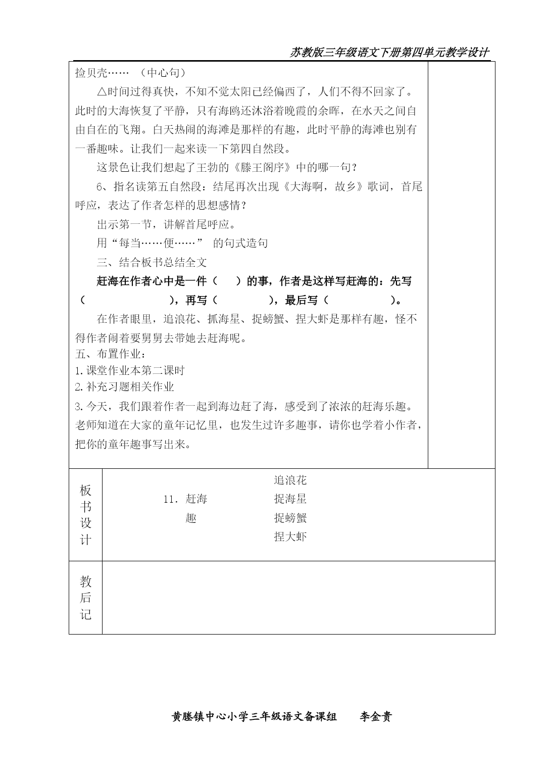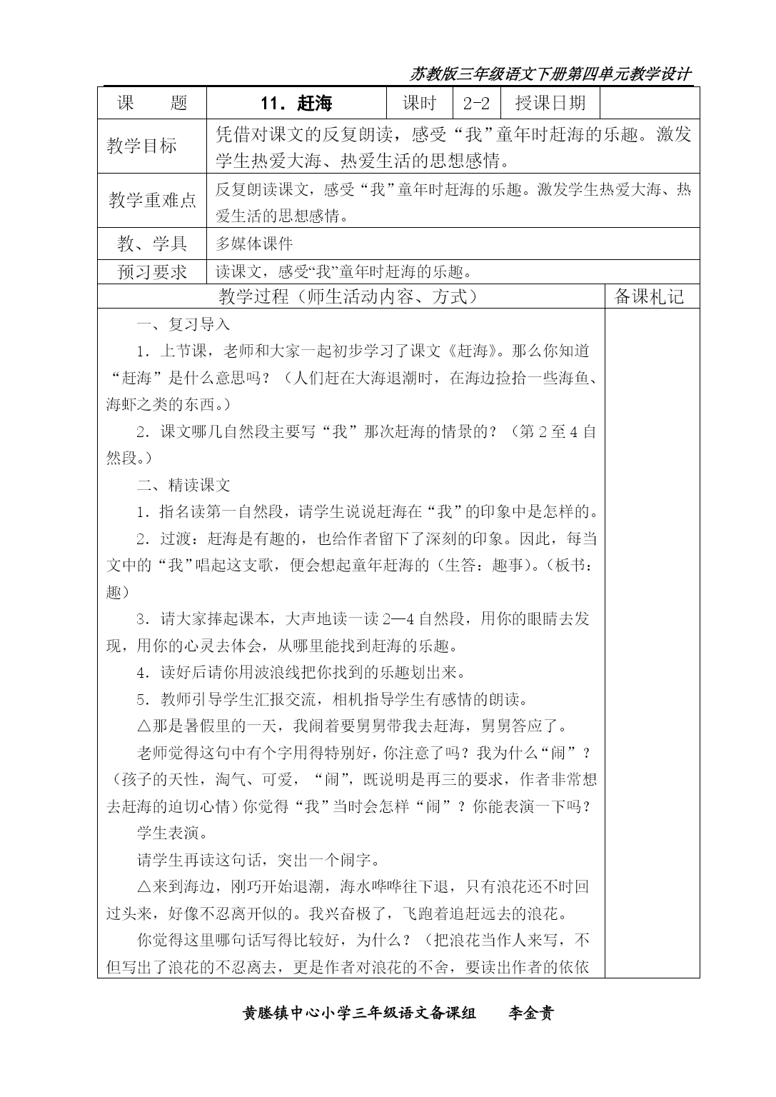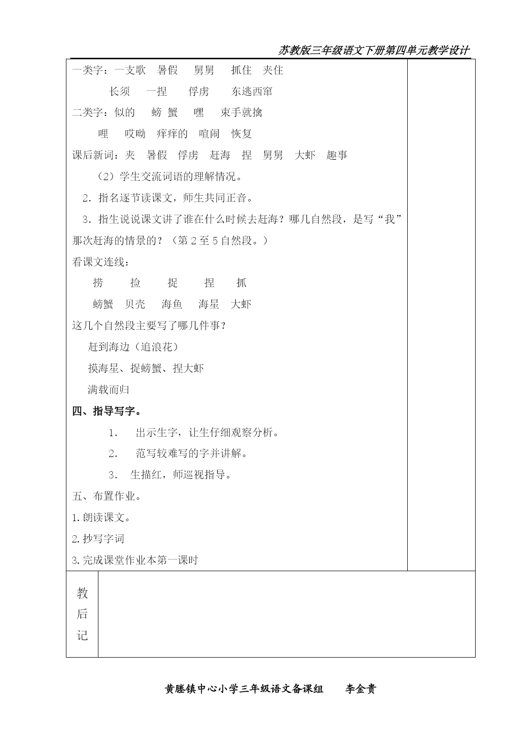 苏教版三年级语文下册第四单元教学设计黄塍镇中心小学三年级语文备课组李金贵课题11.赶海课时2-1授课日期教学目标1.正确、流利、有感情地朗读课文,初步了解大意。2.学会10个生字,两条绿线内的个字只识不写。理解由生字组成的词语。教学内容初读课文,学习生字词、了解课文大意。教学重难点学习生字词、了解课文大意。教、学具多媒体课件预习要求自读课文,掌握生字新词,读正确、读通课文,掌握课文大意。教学过程(师生活动内容、方式)备课札记一、激趣导入。1.同学们,你们见过大海吗?能说说你对大海的印象吗?指名说。2.谈话:大海是很美丽的。住在海边的人,不仅能欣赏到大海的美,还常常去赶海。(出示图片)你们知道“赶海”是什么意思吗?(学生发言)(居住在海边的人们,根据潮涨潮落的规律,赶在潮落的时机,到海岸的滩涂和礁石上打捞或采集海产品,称为赶海。)3.(教师边出示赶海的图片,边叙述):同学们,赶海可有趣啦!你瞧,开始退潮了。海水哗哗往下退,金色的沙滩上留下了无数海洋里的宝贝。有海星啦,海蟹啦,海虾啦┄┄还等什么,就让我们迎着腥咸的海风,一起去赶海,好吗?二、初读课文,了解自然段大意。1.出示自学要求(1)自由轻声读课文、画出不认识、不理解的字词。查字典或联系上下文理解。(2)读通课文,做到读正确、读流利。2.学生自读,师巡视指导。三、检查自读情况。1.出示词语。(1)指生读词语,师生共同正音。一类字:一支歌暑假舅舅抓住夹住长须一捏俘虏东逃西窜二类字:似的螃蟹嘿束手就擒哩哎呦痒痒的喧闹恢复课后新词:夹暑假俘虏赶海捏舅舅大虾趣事(2)学生交流词语的理解情况。2.指名逐节读课文,师生共同正音。3.指生说说课文讲了谁在什么时候去赶海?哪几自然段,是写“我”那次赶海的情景的?(第2至5自然段。)看课文连线:捞捡捉捏抓螃蟹贝壳海鱼海星大虾这几个自然段主要写了哪几件事?赶到海边(追浪花)摸海星、捉螃蟹、捏大虾满载而归四、指导写字。1.出示生字,让生仔细观察分析。2.范写较难写的字并讲解。3.生描红,师巡视指导。五、布置作业。1.朗读课文。2.抄写字词3.完成课堂作业本第一课时教后记课题11.赶海课时2-2授课日期教学目标凭借对课文的反复朗读,感受“我”童年时赶海的乐趣。激发学生热爱大海、热爱生活的思想感情。教学重难点反复朗读课文,感受“我”童年时赶海的乐趣。激发学生热爱大海、热爱生活的思想感情。教、学具多媒体课件预习要求读课文,感受“我”童年时赶海的乐趣。教学过程(师生活动内容、方式)备课札记一、复习导入1.上节课,老师和大家一起初步学习了课文《赶海》。那么你知道“赶海”是什么意思吗?(人们赶在大海退潮时,在海边捡拾一些海鱼、海虾之类的东西。)2.课文哪几自然段主要写“我”那次赶海的情景的?(第2至4自然段。)二、精读课文1.指名读第一自然段,请学生说说赶海在“我”的印象中是怎样的。2.过渡:赶海是有趣的,也给作者留下了深刻的印象。因此,每当文中的“我”唱起这支歌,便会想起童年赶海的(生答:趣事)。(板书:趣)3.请大家捧起课本,大声地读一读2—4自然段,用你的眼睛去发现,用你的心灵去体会,从哪里能找到赶海的乐趣。4.读好后请你用波浪线把你找到的乐趣划出来。5.教师引导学生汇报交流,相机指导学生有感情的朗读。△那是暑假里的一天,我闹着要舅舅带我去赶海,舅舅答应了。老师觉得这句中有个字用得特别好,你注意了吗?我为什么“闹”?(孩子的天性,淘气、可爱,“闹”,既说明是再三的要求,作者非常想去赶海的迫切心情)你觉得“我”当时会怎样“闹”?你能表演一下吗?学生表演。请学生再读这句话,突出一个闹字。△来到海边,刚巧开始退潮,海水哗哗往下退,只有浪花还不时回过头来,好像不忍离开似的。我兴奋极了,飞跑着追赶远去的浪花。你觉得这里哪句话写得比较好,为什么?(把浪花当作人来写,不但写出了浪花的不忍离去,更是作者对浪花的不舍,要读出作者的依依不舍,追赶浪花时的兴奋和快乐。)学生朗读。渐渐远去的浪花在作者眼里是那么有趣,因此作者忍不住要去?——(追赶浪花)出示:追浪花。教师小结:因此,浪花之趣,也是赶海之趣。△此时,沙滩上已经有好多人了,他们有的(捉螃蟹),有的(捞海鱼),有的(捡贝壳)……(1)还有吗?看看后面,你发现了什么?(省略号,说明还有很多趣事没写完)(2)那么你能用有的、有的这个句式往下说吗?△抓海星很有趣(1)小作者是怎样抓的,谁来读读看?你觉得应该怎样读?为什么?(朗读时应该把摸读得慢些。我一边在寻找,一边在摸,所以读得很慢。)(2)作者抓到海星时的心情如何?只要大家读好了哪个字就会让人觉得作者很兴奋、很有趣?谁也能用朗读把捉到海星时
