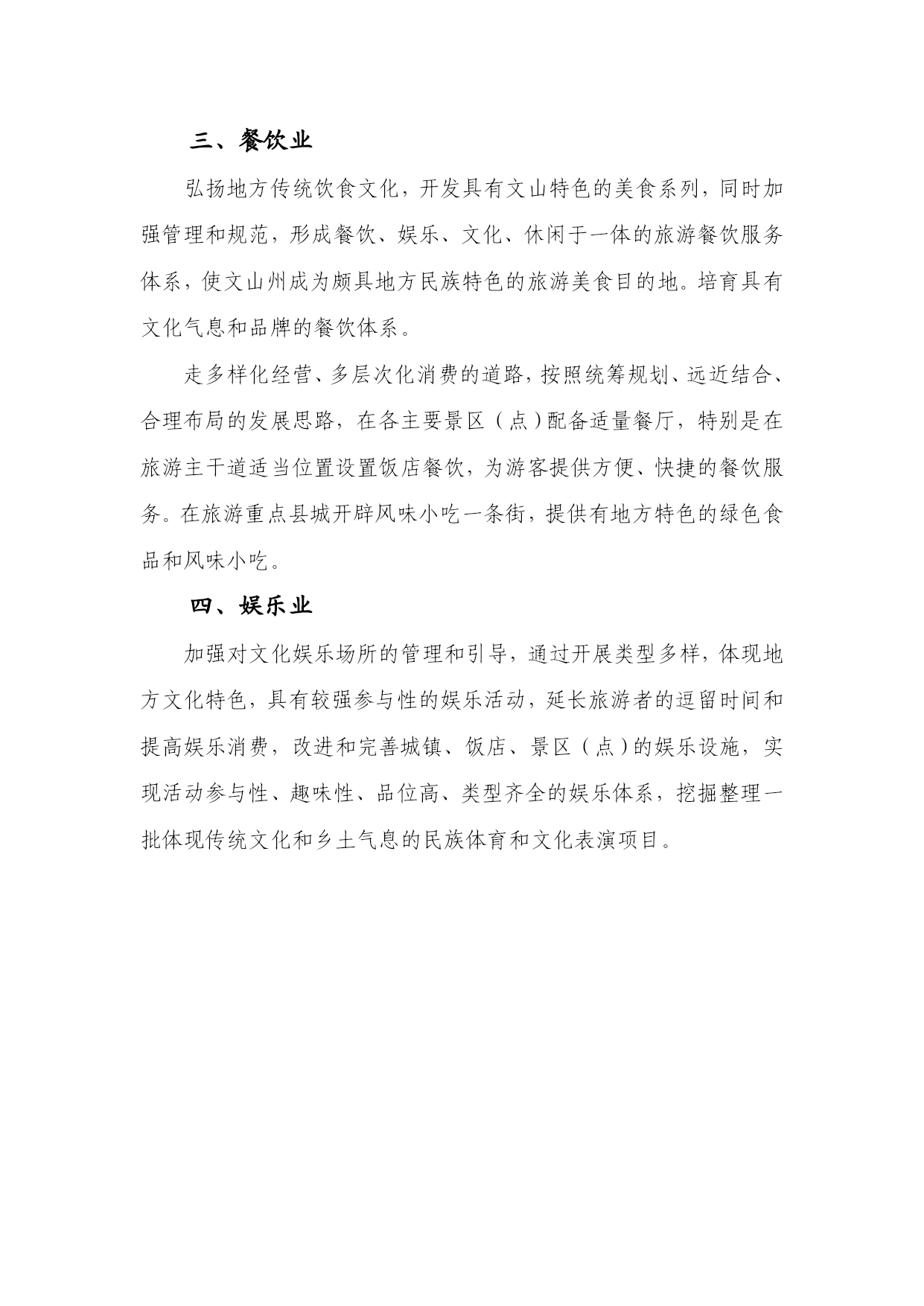 第六章旅游接待设施与服务一、旅行社“十一五”期间,扶持2家以上、年接待量和年组团量均达到1万人次以上的旅行社,争取转类升级为国际旅行社,或引入外地有一定实力的国际旅行社在文山设立分社,以接待海外(特别是东南亚地区)游客;支持和鼓励省内外知名旅行社和企业集团到我州设立旅行社或以独资、合资、参股、控股、收购、兼并等方式整合重组州内旅行社,提高营销和招徕能力;加速旅行社的改制转型,激活旅行社业的活力,优化旅行社结构和资本配置,采取兼并、联合等方式进一步扩大企业规模;末期推行旅行社集团经营和网络经营,培育旅行社企业集团,扶持成立旅行社联合营销协会,使旅行社形成团队实力。组建以国际旅行社为主体,融旅行社、饭店、旅游汽车、旅游商品经营甚至旅游景区于一体的旅游集团,拓宽海外客源招徕渠道,实现国际与国内、省外与省内协调发展,形成多元化的市场格局,提高旅行社的管理水平和竞争能力。二、饭店业在全州建1—2家高档次饭店,适量改造一批低档饭店和社会旅馆,以满足文山旅游业迅速发展的需求。近期把重点放在提高经营管理水平和服务质量上,以适应现代电子商务的信息化、智能化的发展需要。积极引进国际饭店联号或管理公司,拓宽全州饭店业的客源渠道,提高饭店的整体经营管理水平,在条件成熟时组建大型酒店集团或酒店管理公司,以增强全州旅游饭店的市场竞争力。三、餐饮业弘扬地方传统饮食文化,开发具有文山特色的美食系列,同时加强管理和规范,形成餐饮、娱乐、文化、休闲于一体的旅游餐饮服务体系,使文山州成为颇具地方民族特色的旅游美食目的地。培育具有文化气息和品牌的餐饮体系。走多样化经营、多层次化消费的道路,按照统筹规划、远近结合、合理布局的发展思路,在各主要景区(点)配备适量餐厅,特别是在旅游主干道适当位置设置饭店餐饮,为游客提供方便、快捷的餐饮服务。在旅游重点县城开辟风味小吃一条街,提供有地方特色的绿色食品和风味小吃。四、娱乐业加强对文化娱乐场所的管理和引导,通过开展类型多样,体现地方文化特色,具有较强参与性的娱乐活动,延长旅游者的逗留时间和提高娱乐消费,改进和完善城镇、饭店、景区(点)的娱乐设施,实现活动参与性、趣味性、品位高、类型齐全的娱乐体系,挖掘整理一批体现传统文化和乡土气息的民族体育和文化表演项目。