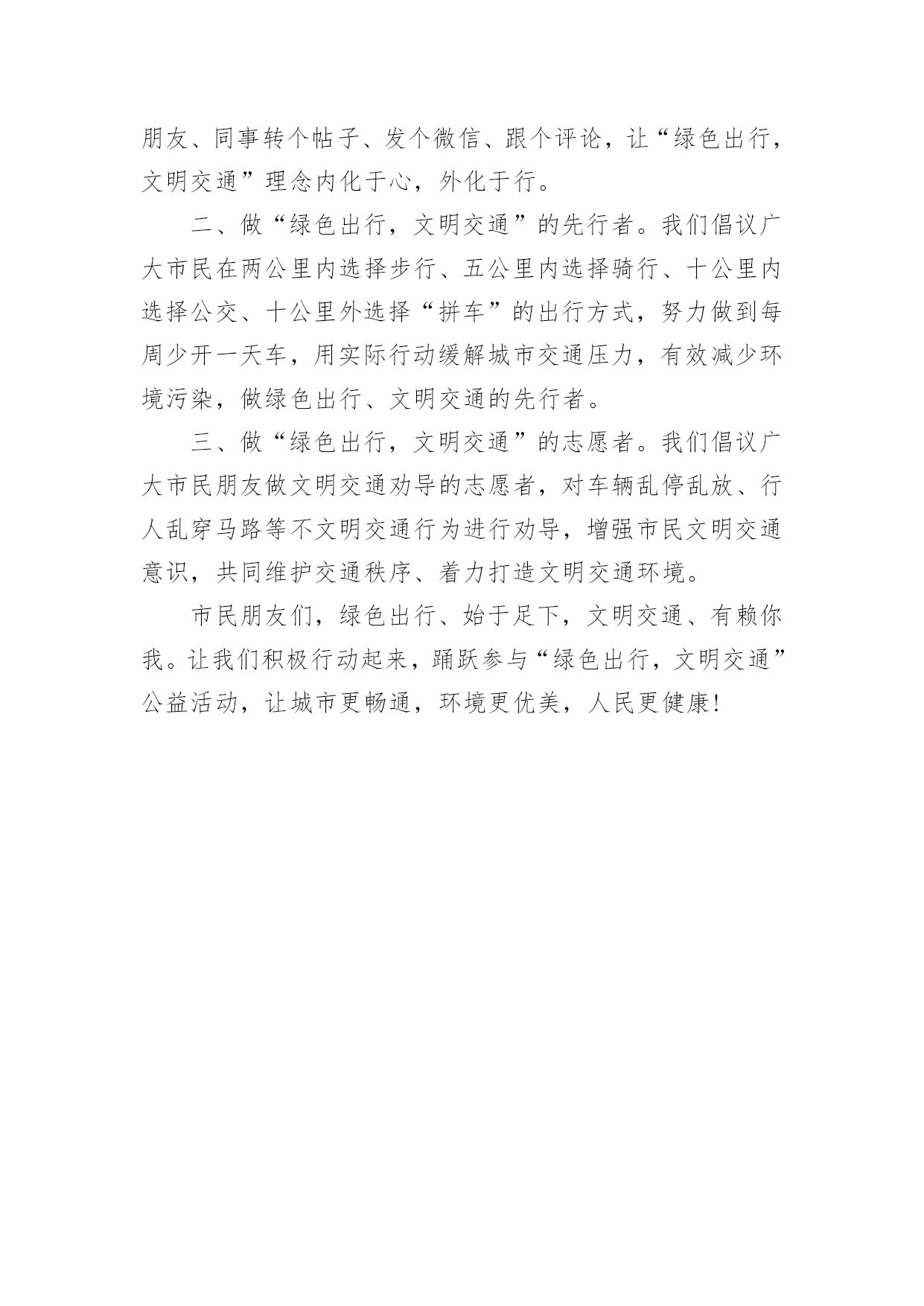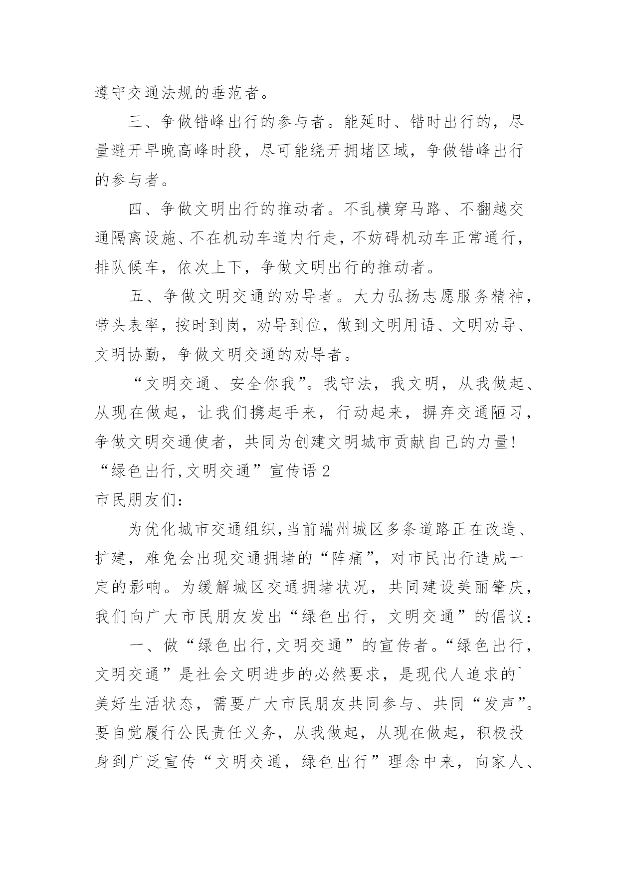 “绿色出行,文明交通”宣传语“绿色出行,文明交通”宣传语无论是在学校还是在社会中,大家都听说过或者使用过一些比较经典的宣传语吧,宣传语在一定程度上反映了社会经济制度的本质和社会的文明程度,它的意义十分重大。什么样的宣传语才经典呢?以下是小编为大家整理的“绿色出行,文明交通”宣传语,仅供参考,欢迎大家阅读。“绿色出行,文明交通”宣传语1广大市民朋友们:文明交通是践行创新、协调、绿色、开放、共享五大发展理念的题中之义,文明的交通环境是文明城市创建的重要内容。随着经济社会的快速发展和现代文明城市建设的不断加快,近期我市主城区道路建设如火如荼,新建了一条公交专线,布设了一批新型交通信号设备。为发挥青年先锋带头作用,帮助广大市民群众适应并掌握交通建设带来的.路况新变化,引导市民文明参与交通,确保群众安全出行,在此我们发出倡议:一、争做绿色出行的践行者。提倡健康步行和公共交通出行,做到能走不乘车、能乘车不开车,争做绿色出行的践行者。二、争做依规出行的垂范者。遵规守纪,按灯停走、按道行驶、按线通行、按位停放、按章驾乘,服从管理,争做遵守交通法规的垂范者。三、争做错峰出行的参与者。能延时、错时出行的,尽量避开早晚高峰时段,尽可能绕开拥堵区域,争做错峰出行的参与者。四、争做文明出行的推动者。不乱横穿马路、不翻越交通隔离设施、不在机动车道内行走,不妨碍机动车正常通行,排队候车,依次上下,争做文明出行的推动者。五、争做文明交通的劝导者。大力弘扬志愿服务精神,带头表率,按时到岗,劝导到位,做到文明用语、文明劝导、文明协勤,争做文明交通的劝导者。“文明交通、安全你我”。我守法,我文明,从我做起、从现在做起,让我们携起手来,行动起来,摒弃交通陋习,争做文明交通使者,共同为创建文明城市贡献自己的力量!“绿色出行,文明交通”宣传语2市民朋友们:为优化城市交通组织,当前端州城区多条道路正在改造、扩建,难免会出现交通拥堵的“阵痛”,对市民出行造成一定的影响。为缓解城区交通拥堵状况,共同建设美丽肇庆,我们向广大市民朋友发出“绿色出行,文明交通”的倡议:一、做“绿色出行,文明交通”的宣传者。“绿色出行,文明交通”是社会文明进步的必然要求,是现代人追求的`美好生活状态,需要广大市民朋友共同参与、共同“发声”。要自觉履行公民责任义务,从我做起,从现在做起,积极投身到广泛宣传“文明交通,绿色出行”理念中来,向家人、朋友、同事转个帖子、发个微信、跟个评论,让“绿色出行,文明交通”理念内化于心,外化于行。二、做“绿色出行,文明交通”的先行者。我们倡议广大市民在两公里内选择步行、五公里内选择骑行、十公里内选择公交、十公里外选择“拼车”的出行方式,努力做到每周少开一天车,用实际行动缓解城市交通压力,有效减少环境污染,做绿色出行、文明交通的先行者。三、做“绿色出行,文明交通”的志愿者。我们倡议广大市民朋友做文明交通劝导的志愿者,对车辆乱停乱放、行人乱穿马路等不文明交通行为进行劝导,增强市民文明交通意识,共同维护交通秩序、着力打造文明交通环境。市民朋友们,绿色出行、始于足下,文明交通、有赖你我。让我们积极行动起来,踊跃参与“绿色出行,文明交通”公益活动,让城市更畅通,环境更优美,人民更健康!