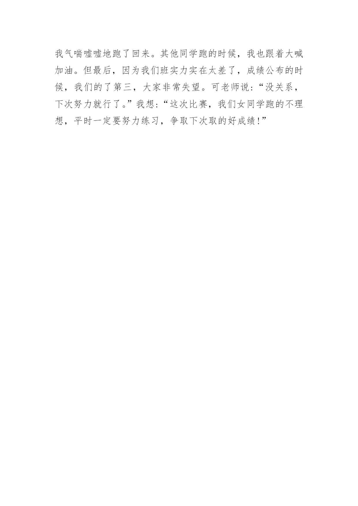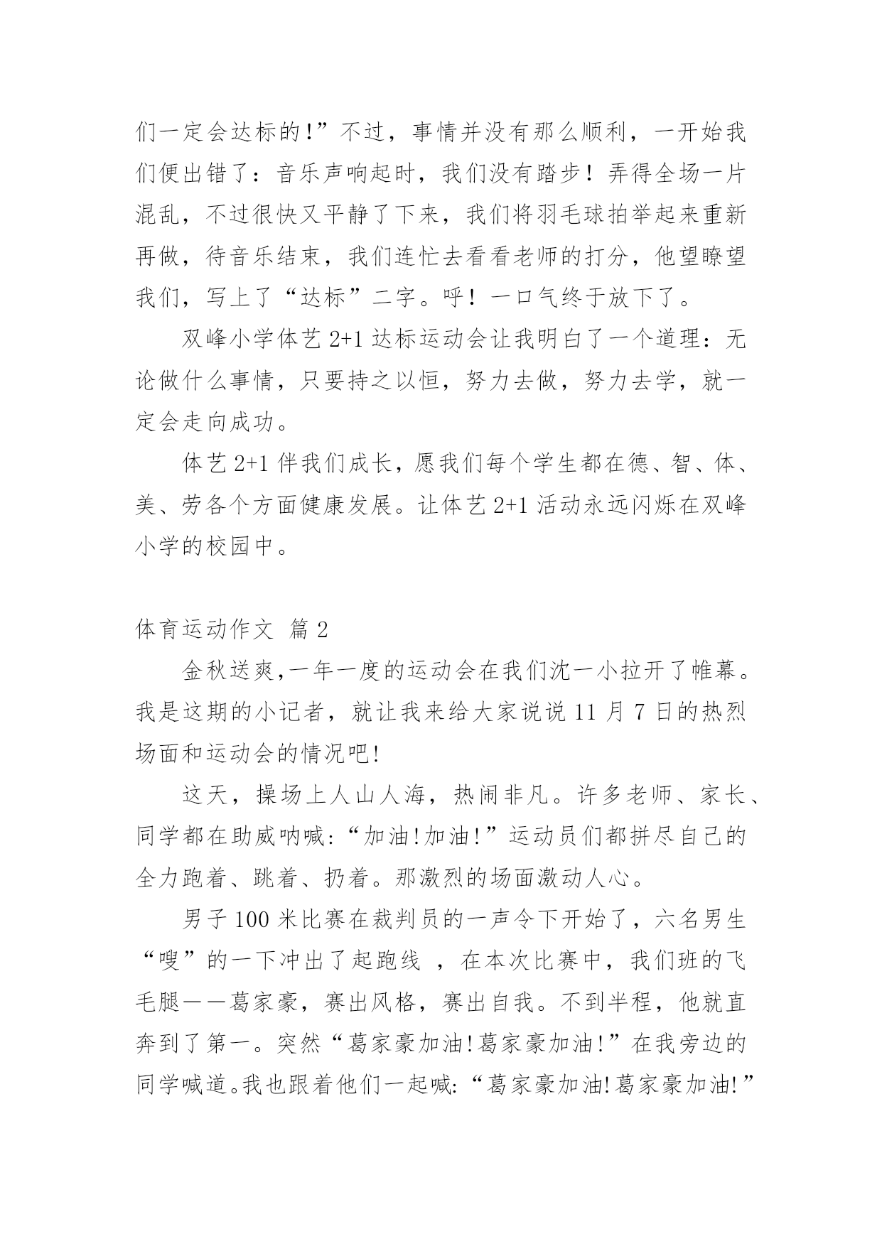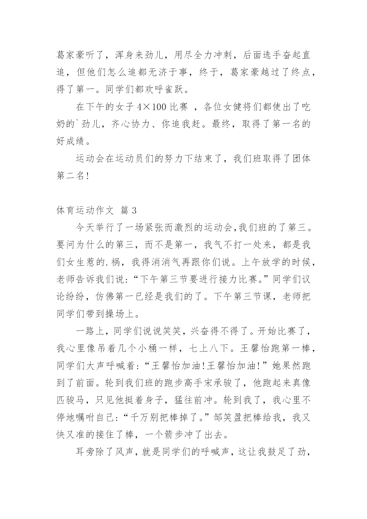 体育运动作文体育运动作文必备(3篇)在平日的学习、工作和生活里,大家都写过作文吧,写作文是培养人们的观察力、联想力、想象力、思考力和记忆力的重要手段。为了让您在写作文时更加简单方便,下面是小编整理的体育运动作文4篇,欢迎大家分享。体育运动作文篇1送走了习习的秋风,我们迎来了寒风呼啸的隆冬。但我校的体艺2+1活动,仍在热火朝天的开展。同学们的“体艺2+1”项目也迎来了达标的喜悦。伴随着悠扬的音乐,我们排着整齐的队伍,来到了操场上。同学们都按照指定位置去做好一切准备工作。双峰小学体艺2+1达标运动会,第一个项目是各班级的表演。一个一个年级的表演都各有特色、各有特长,让观看的同学们不断的发出热烈的掌声。三年级上场了,他们表演的是傣族的竹竿舞。一根根竹竿井然有序的排列在操场上,竹竿发出清脆的敲打声,将三年级同学的'古诗吟咏衬托得十分优雅。一双双小脚从竹竿中跳过,轻盈灵巧,绝不拖泥带水,干净利落,最后老师给同学们都满意的打上了“达标”二字。很快,就轮到我们六年级的羽毛球操了。我真害怕不能达标,会成了全校师生的笑柄,同学们安慰我:“别怕,我们一定会达标的!”不过,事情并没有那么顺利,一开始我们便出错了:音乐声响起时,我们没有踏步!弄得全场一片混乱,不过很快又平静了下来,我们将羽毛球拍举起来重新再做,待音乐结束,我们连忙去看看老师的打分,他望瞭望我们,写上了“达标”二字。呼!一口气终于放下了。双峰小学体艺2+1达标运动会让我明白了一个道理:无论做什么事情,只要持之以恒,努力去做,努力去学,就一定会走向成功。体艺2+1伴我们成长,愿我们每个学生都在德、智、体、美、劳各个方面健康发展。让体艺2+1活动永远闪烁在双峰小学的校园中。体育运动作文篇2金秋送爽,一年一度的运动会在我们沈一小拉开了帷幕。我是这期的小记者,就让我来给大家说说11月7日的热烈场面和运动会的情况吧!这天,操场上人山人海,热闹非凡。许多老师、家长、同学都在助威呐喊:“加油!加油!”运动员们都拼尽自己的全力跑着、跳着、扔着。那激烈的场面激动人心。男子100米比赛在裁判员的一声令下开始了,六名男生“嗖”的一下冲出了起跑线,在本次比赛中,我们班的飞毛腿――葛家豪,赛出风格,赛出自我。不到半程,他就直奔到了第一。突然“葛家豪加油!葛家豪加油!”在我旁边的同学喊道。我也跟着他们一起喊:“葛家豪加油!葛家豪加油!”葛家豪听了,浑身来劲儿,用尽全力冲刺,后面选手奋起直追,但他们怎么追都无济于事,终于,葛家豪越过了终点,得了第一。同学们都欢呼雀跃。在下午的女子4×100比赛,各位女健将们都使出了吃奶的`劲儿,齐心协力、你追我赶。最终,取得了第一名的好成绩。运动会在运动员们的努力下结束了,我们班取得了团体第二名!体育运动作文篇3今天举行了一场紧张而激烈的运动会,我们班的了第三。要问为什么的第三,而不是第一,我气不打一处来,都是我们女生惹的.祸,我得消消气再跟你们说。上午放学的时候,老师告诉我们说:“下午第三节要进行接力比赛。”同学们议论纷纷,仿佛第一已经是我们的了。下午第三节课,老师把同学们带到操场上。一路上,同学们说说笑笑,兴奋得不得了。开始比赛了,我心里像吊着几个小桶一样,七上八下。王馨怡跑第一棒,同学们大声呼喊着:“王馨怡加油!王馨怡加油!”她果然跑到了前面。轮到我们班的跑步高手宋承骏了,他跑起来真像匹骏马,只见他挺着身子,猛往前冲。轮到我了,我心里不停地嘱咐自己:“千万别把棒掉了。”邹笑盈把棒给我,我又快又准的接住了棒,一个箭步冲了出去。耳旁除了风声,就是同学们的呼喊声,这让我鼓足了劲,我气喘嘘嘘地跑了回来。其他同学跑的时候,我也跟着大喊加油。但最后,因为我们班实力实在太差了,成绩公布的时候,我们的了第三,大家非常失望。可老师说:“没关系,下次努力就行了。”我想:“这次比赛,我们女同学跑的不理想,平时一定要努力练习,争取下次取的好成绩!”