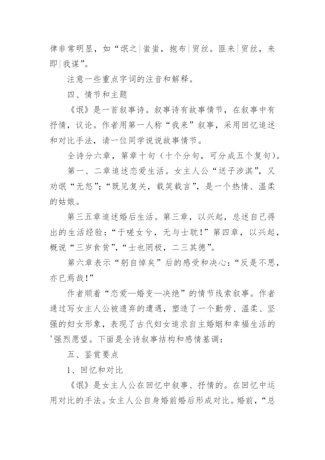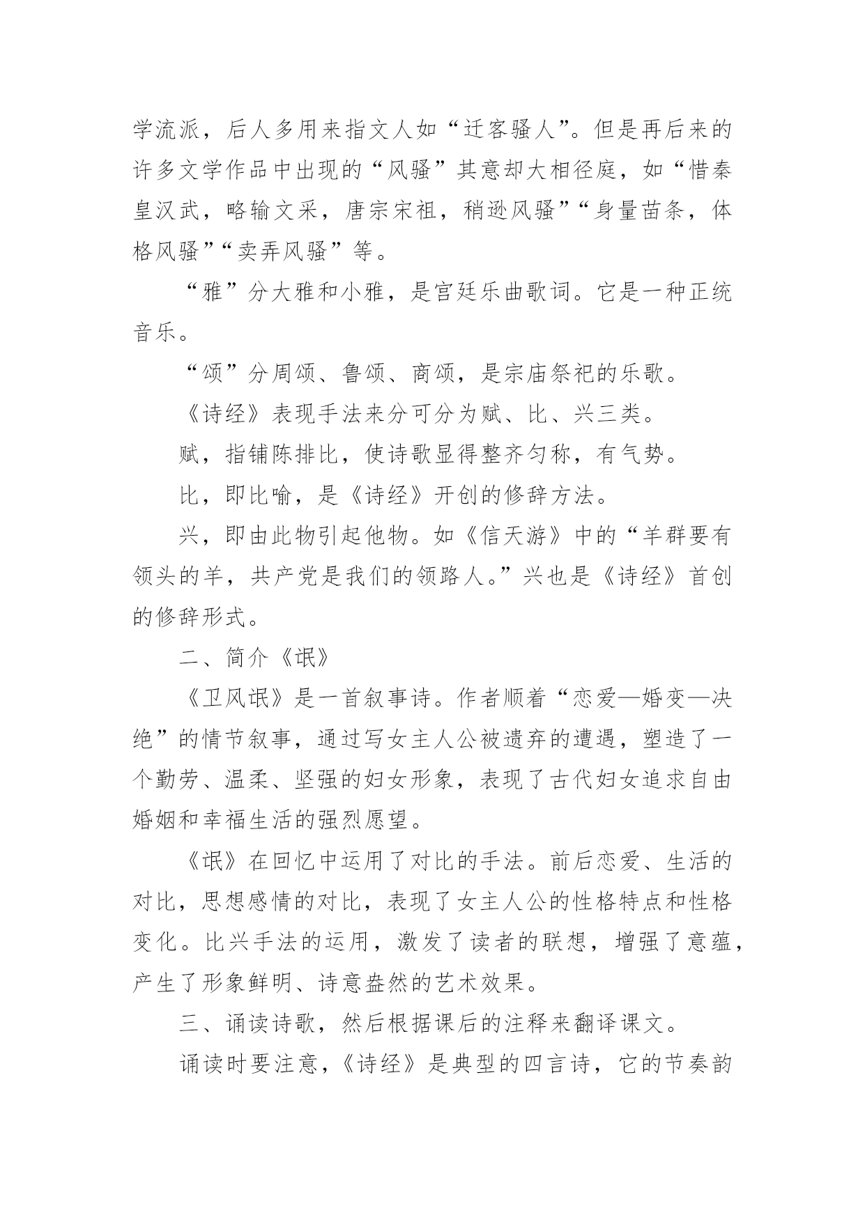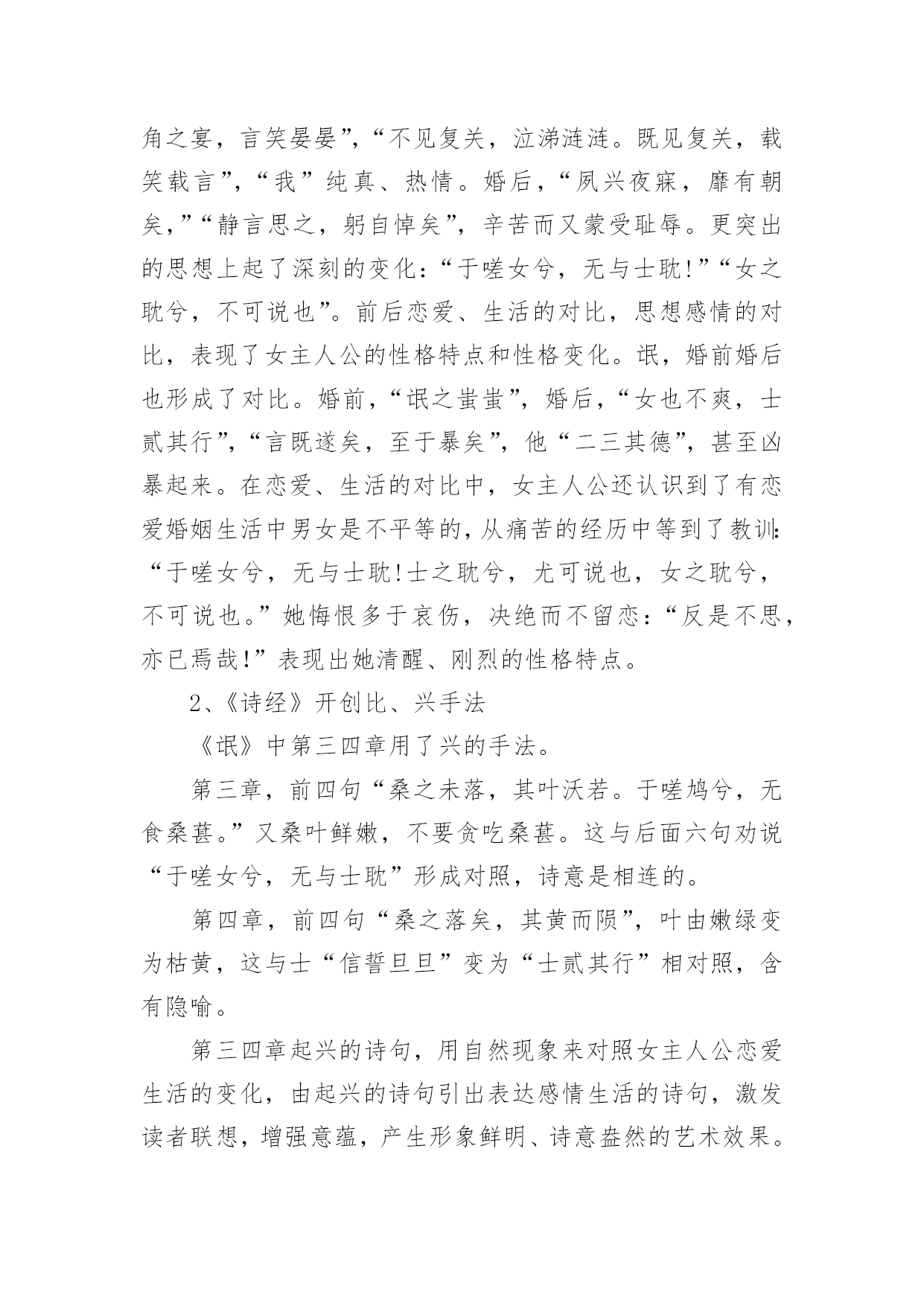 诗经教学诗经三首教学范本《氓》教学目标1、学习《诗经》的有关常识。2、了解《诗经》的现实主义创作传统。3、《氓》的情节和主题。重点难点1、能够准确地诵读本诗,并注意诗歌的节奏和韵律。2、通过阅读注释来自己翻译课文。3、《氓》是一首叙事诗,理清诗歌的叙事情节是个重点。教学过程一、简介《诗经》《诗经》是我国是最早的一部诗歌总集。反映了公元前11世纪西周初年至公元前6世纪春秋中期的500年间的古代社会生活。原本只称《诗》,是儒家的经典之一。(儒家奉有“四书”“五经”,“四书”指《大学》《中庸》《论语》《孟子》;“五经”指《诗》《书》《礼》《易》《乐》《春秋》)成书于公元前6世纪的春秋时期,共305篇,所以又称“诗三百”。《诗经》按其表现内容可分为“风”“雅”“颂”三部分。“风”又称15国风,大都是民间的歌谣,它和屈原的《离骚》后人经常把它们并称为“风骚”,本用来指两大文学流派,后人多用来指文人如“迁客骚人”。但是再后来的许多文学作品中出现的“风骚”其意却大相径庭,如“惜秦皇汉武,略输文采,唐宗宋祖,稍逊风骚”“身量苗条,体格风骚”“卖弄风骚”等。“雅”分大雅和小雅,是宫廷乐曲歌词。它是一种正统音乐。“颂”分周颂、鲁颂、商颂,是宗庙祭祀的乐歌。《诗经》表现手法来分可分为赋、比、兴三类。赋,指铺陈排比,使诗歌显得整齐匀称,有气势。比,即比喻,是《诗经》开创的修辞方法。兴,即由此物引起他物。如《信天游》中的“羊群要有领头的羊,共产党是我们的领路人。”兴也是《诗经》首创的修辞形式。二、简介《氓》《卫风氓》是一首叙事诗。作者顺着“恋爱—婚变—决绝”的情节叙事,通过写女主人公被遗弃的遭遇,塑造了一个勤劳、温柔、坚强的妇女形象,表现了古代妇女追求自由婚姻和幸福生活的强烈愿望。《氓》在回忆中运用了对比的手法。前后恋爱、生活的对比,思想感情的对比,表现了女主人公的性格特点和性格变化。比兴手法的运用,激发了读者的联想,增强了意蕴,产生了形象鲜明、诗意盎然的艺术效果。三、诵读诗歌,然后根据课后的注释来翻译课文。诵读时要注意,《诗经》是典型的四言诗,它的节奏韵律非常明显,如“氓之|蚩蚩,抱布|贸丝。匪来|贸丝,来即|我谋”。注意一些重点字词的注音和解释。四、情节和主题《氓》是一首叙事诗。叙事诗有故事情节,在叙事中有抒情,议论。作者用第一人称“我来”叙事,采用回忆追述和对比手法,请一位同学说说故事情节。全诗分六章,第章十句(十个分句,可分成五个复句)。第一、二章追述恋爱生活。女主人公“送子涉淇”,又劝氓“无怒”;“既见复关,载笑载言”,是一个热情、温柔的姑娘。第三五章追述婚后生活。第三章,以兴起,总述自己得出的生活经验:“于嗟女兮,无与士耽!”第四章,以兴起,概说“三岁食贫”,“士也罔极,二三其德”。第六章表示“躬自悼矣”后的感受和决心:“反是不思,亦已焉哉!”作者顺着“恋爱—婚变—决绝”的情节线索叙事。作者通过写女主人公被遗弃的遭遇,塑造了一个勤劳、温柔、坚强的妇女形象,表现了古代妇女追求自主婚姻和幸福生活的'强烈愿望。下面是全诗叙事结构和感情基调:五、鉴赏要点1、回忆和对比《氓》是女主人公在回忆中叙事、抒情的。在回忆中运用对比的手法。女主人公自身婚前婚后形成对比。婚前,“总角之宴,言笑晏晏”,“不见复关,泣涕涟涟。既见复关,载笑载言”,“我”纯真、热情。婚后,“夙兴夜寐,靡有朝矣,”“静言思之,躬自悼矣”,辛苦而又蒙受耻辱。更突出的思想上起了深刻的变化:“于嗟女兮,无与士耽!”“女之耽兮,不可说也”。前后恋爱、生活的对比,思想感情的对比,表现了女主人公的性格特点和性格变化。氓,婚前婚后也形成了对比。婚前,“氓之蚩蚩”,婚后,“女也不爽,士贰其行”,“言既遂矣,至于暴矣”,他“二三其德”,甚至凶暴起来。在恋爱、生活的对比中,女主人公还认识到了有恋爱婚姻生活中男女是不平等的,从痛苦的经历中等到了教训:“于嗟女兮,无与士耽!士之耽兮,尤可说也,女之耽兮,不可说也。”她悔恨多于哀伤,决绝而不留恋:“反是不思,亦已焉哉!”表现出她清醒、刚烈的性格特点。2、《诗经》开创比、兴手法《氓》中第三四章用了兴的手法。第三章,前四句“桑之未落,其叶沃若。于嗟鸠兮,无食桑葚。”又桑叶鲜嫩,不要贪吃桑葚。这与后面六句劝说“于嗟女兮,无与士耽”形成对照,诗意是相连的。第四章,前四句“桑之落矣,其黄而陨”,叶由嫩绿变为枯黄,这与士“信誓旦旦”变为“士贰其行”相对照,含有隐喻。第三四章起兴的诗句,用自然现象来对照女主人公恋爱生活的变化,由起兴的诗句引出表达感情生活的诗句,激发读者联想,增强意蕴,产生形象鲜明、诗意盎然的艺术效果。有人认为,用桑叶嫩绿而枯黄来比喻恋爱生活由幸福而至痛苦,这种兴兼有比的特点,更富有艺术魅力。六、背诵本诗七、课后思考请把本文和读本上的两首诗作简要的比较。《