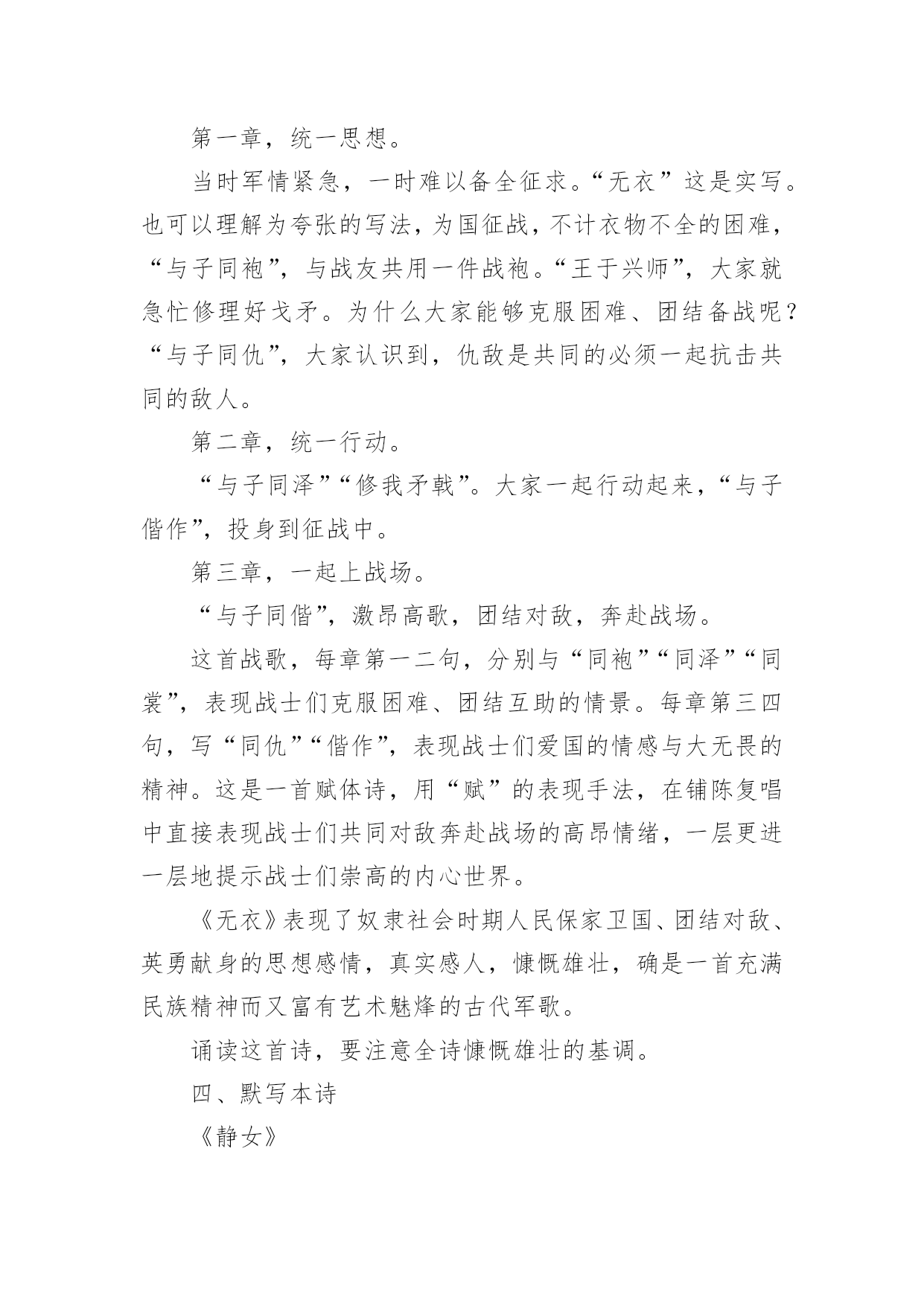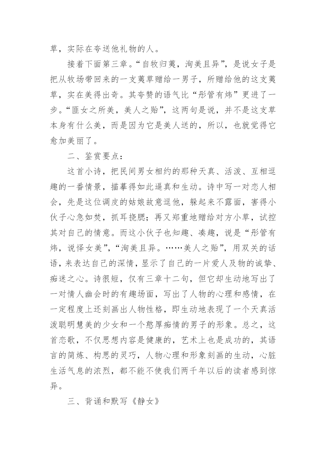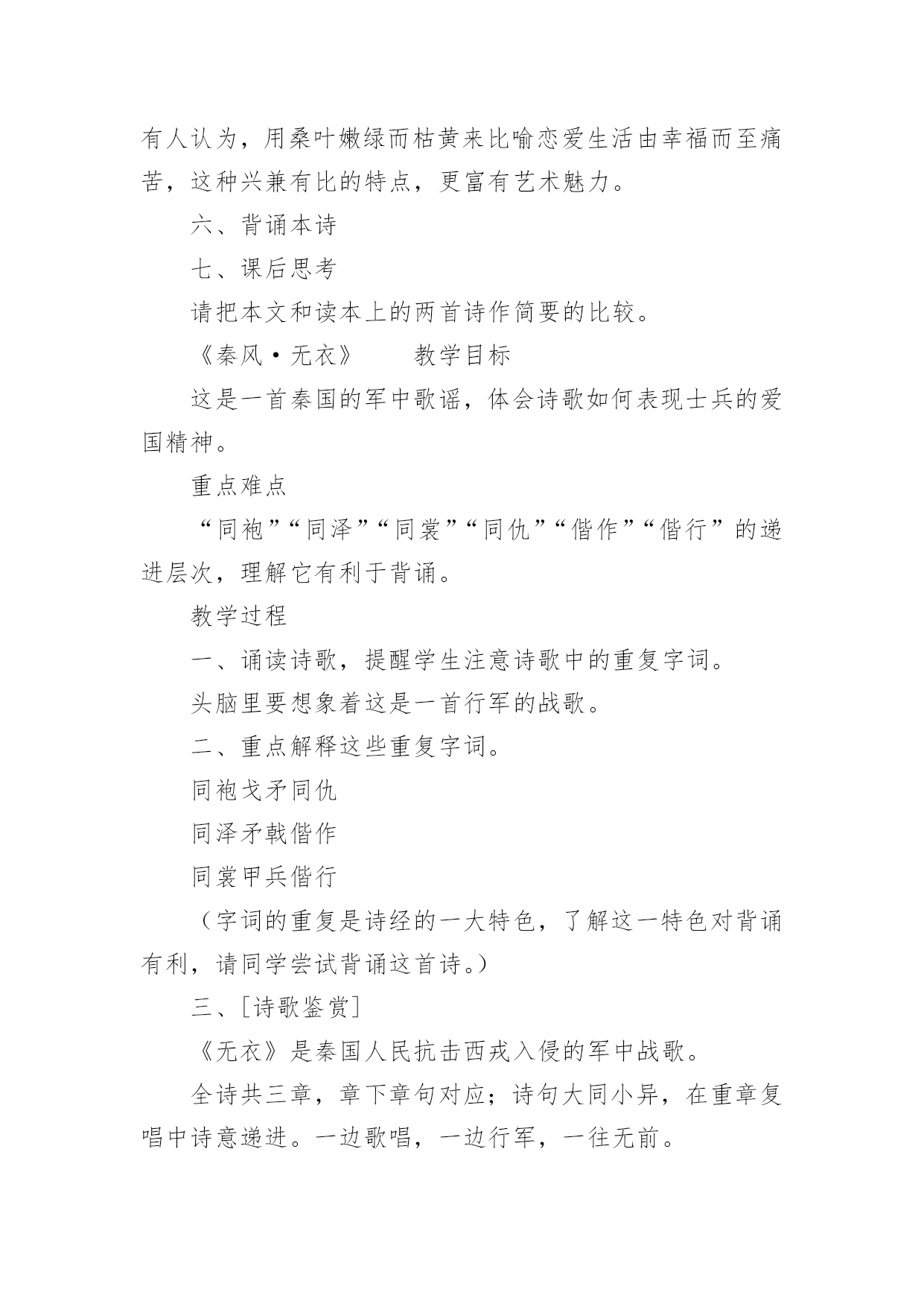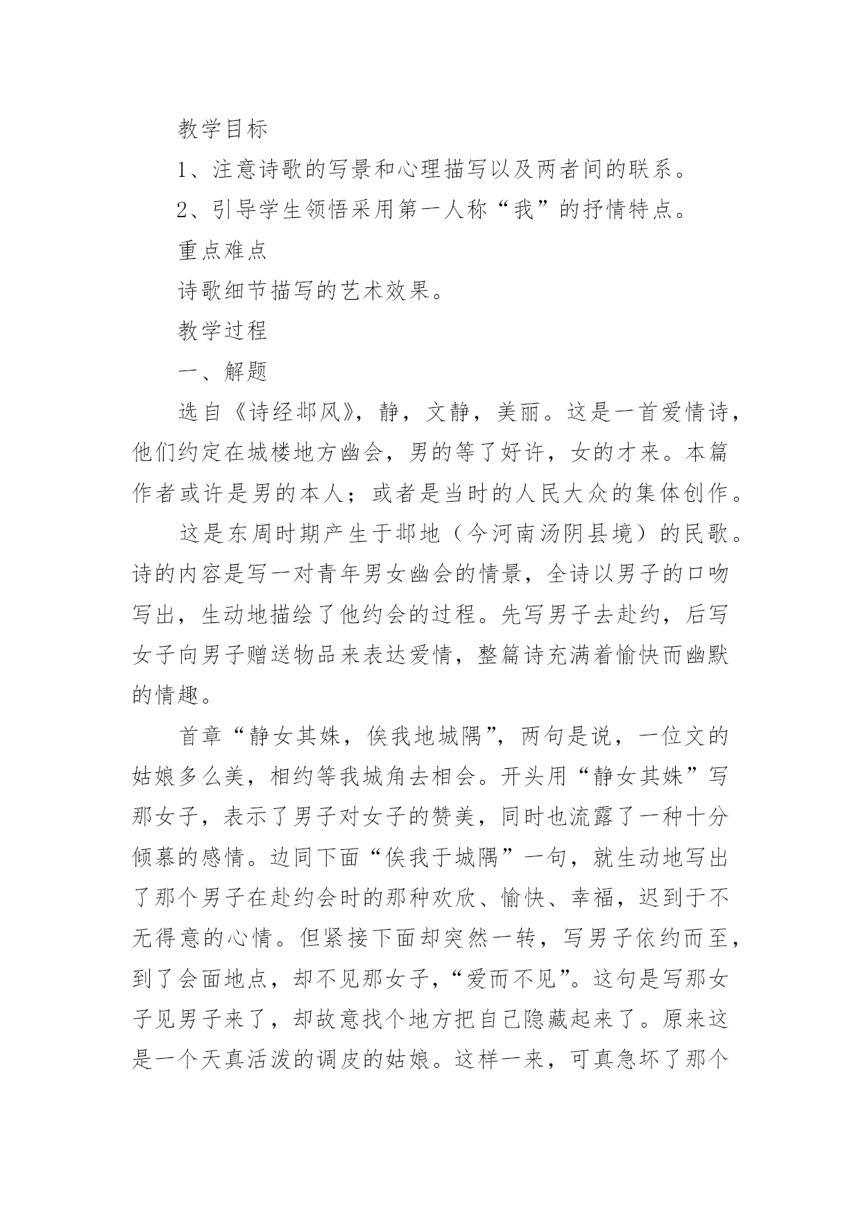 诗经教学诗经三首教学范本《氓》教学目标1、学习《诗经》的有关常识。2、了解《诗经》的现实主义创作传统。3、《氓》的情节和主题。重点难点1、能够准确地诵读本诗,并注意诗歌的节奏和韵律。2、通过阅读注释来自己翻译课文。3、《氓》是一首叙事诗,理清诗歌的叙事情节是个重点。教学过程一、简介《诗经》《诗经》是我国是最早的一部诗歌总集。反映了公元前11世纪西周初年至公元前6世纪春秋中期的500年间的古代社会生活。原本只称《诗》,是儒家的经典之一。(儒家奉有“四书”“五经”,“四书”指《大学》《中庸》《论语》《孟子》;“五经”指《诗》《书》《礼》《易》《乐》《春秋》)成书于公元前6世纪的春秋时期,共305篇,所以又称“诗三百”。《诗经》按其表现内容可分为“风”“雅”“颂”三部分。“风”又称15国风,大都是民间的歌谣,它和屈原的《离骚》后人经常把它们并称为“风骚”,本用来指两大文学流派,后人多用来指文人如“迁客骚人”。但是再后来的许多文学作品中出现的“风骚”其意却大相径庭,如“惜秦皇汉武,略输文采,唐宗宋祖,稍逊风骚”“身量苗条,体格风骚”“卖弄风骚”等。“雅”分大雅和小雅,是宫廷乐曲歌词。它是一种正统音乐。“颂”分周颂、鲁颂、商颂,是宗庙祭祀的乐歌。《诗经》表现手法来分可分为赋、比、兴三类。赋,指铺陈排比,使诗歌显得整齐匀称,有气势。比,即比喻,是《诗经》开创的修辞方法。兴,即由此物引起他物。如《信天游》中的“羊群要有领头的羊,共产党是我们的领路人。”兴也是《诗经》首创的修辞形式。二、简介《氓》《卫风氓》是一首叙事诗。作者顺着“恋爱—婚变—决绝”的情节叙事,通过写女主人公被遗弃的遭遇,塑造了一个勤劳、温柔、坚强的妇女形象,表现了古代妇女追求自由婚姻和幸福生活的强烈愿望。《氓》在回忆中运用了对比的手法。前后恋爱、生活的对比,思想感情的对比,表现了女主人公的性格特点和性格变化。比兴手法的运用,激发了读者的联想,增强了意蕴,产生了形象鲜明、诗意盎然的艺术效果。三、诵读诗歌,然后根据课后的注释来翻译课文。诵读时要注意,《诗经》是典型的四言诗,它的节奏韵律非常明显,如“氓之|蚩蚩,抱布|贸丝。匪来|贸丝,来即|我谋”。注意一些重点字词的注音和解释。四、情节和主题《氓》是一首叙事诗。叙事诗有故事情节,在叙事中有抒情,议论。作者用第一人称“我来”叙事,采用回忆追述和对比手法,请一位同学说说故事情节。全诗分六章,第章十句(十个分句,可分成五个复句)。第一、二章追述恋爱生活。女主人公“送子涉淇”,又劝氓“无怒”;“既见复关,载笑载言”,是一个热情、温柔的姑娘。第三五章追述婚后生活。第三章,以兴起,总述自己得出的生活经验:“于嗟女兮,无与士耽!”第四章,以兴起,概说“三岁食贫”,“士也罔极,二三其德”。第六章表示“躬自悼矣”后的感受和决心:“反是不思,亦已焉哉!”作者顺着“恋爱—婚变—决绝”的情节线索叙事。作者通过写女主人公被遗弃的遭遇,塑造了一个勤劳、温柔、坚强的妇女形象,表现了古代妇女追求自主婚姻和幸福生活的'强烈愿望。下面是全诗叙事结构和感情基调:五、鉴赏要点1、回忆和对比《氓》是女主人公在回忆中叙事、抒情的。在回忆中运用对比的手法。女主人公自身婚前婚后形成对比。婚前,“总角之宴,言笑晏晏”,“不见复关,泣涕涟涟。既见复关,载笑载言”,“我”纯真、热情。婚后,“夙兴夜寐,靡有朝矣,”“静言思之,躬自悼矣”,辛苦而又蒙受耻辱。更突出的思想上起了深刻的变化:“于嗟女兮,无与士耽!”“女之耽兮,不可说也”。前后恋爱、生活的对比,思想感情的对比,表现了女主人公的性格特点和性格变化。氓,婚前婚后也形成了对比。婚前,“氓之蚩蚩”,婚后,“女也不爽,士贰其行”,“言既遂矣,至于暴矣”,他“二三其德”,甚至凶暴起来。在恋爱、生活的对比中,女主人公还认识到了有恋爱婚姻生活中男女是不平等的,从痛苦的经历中等到了教训:“于嗟女兮,无与士耽!士之耽兮,尤可说也,女之耽兮,不可说也。”她悔恨多于哀伤,决绝而不留恋:“反是不思,亦已焉哉!”表现出她清醒、刚烈的性格特点。2、《诗经》开创比、兴手法《氓》中第三四章用了兴的手法。第三章,前四句“桑之未落,其叶沃若。于嗟鸠兮,无食桑葚。”又桑叶鲜嫩,不要贪吃桑葚。这与后面六句劝说“于嗟女兮,无与士耽”形成对照,诗意是相连的。第四章,前四句“桑之落矣,其黄而陨”,叶由嫩绿变为枯黄,这与士“信誓旦旦”变为“士贰其行”相对照,含有隐喻。第三四章起兴的诗句,用自然现象来对照女主人公恋爱生活的变化,由起兴的诗句引出表达感情生活的诗句,激发读者联想,增强意蕴,产生形象鲜明、诗意盎然的艺术效果。有人认为,用桑叶嫩绿而枯黄来比喻恋爱生活由幸福而至痛苦,这种兴兼有比的特点,更富有艺术魅力。六、背诵本诗七、课后思考请把本文和读本上的两首诗作简要的比较。《
