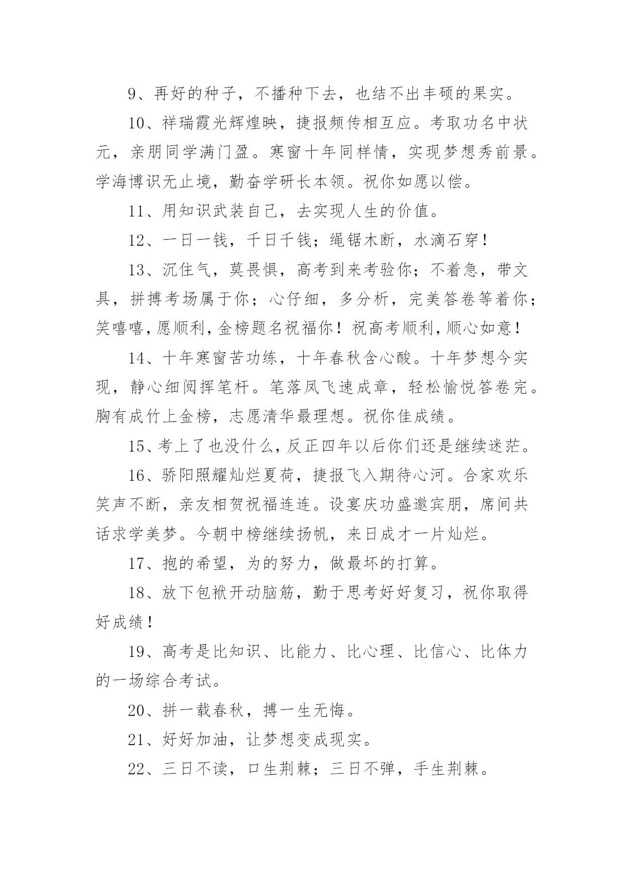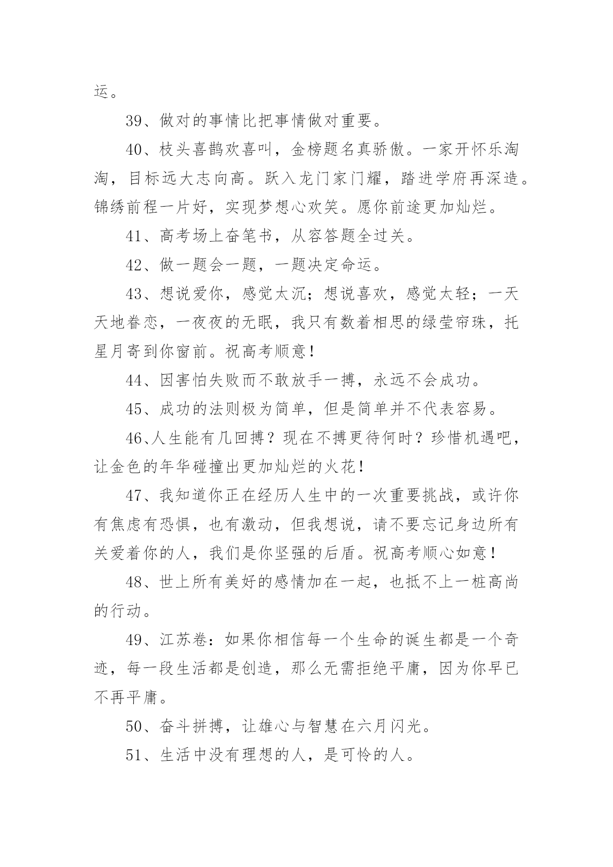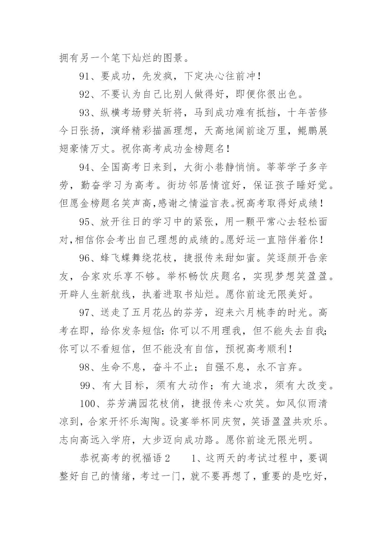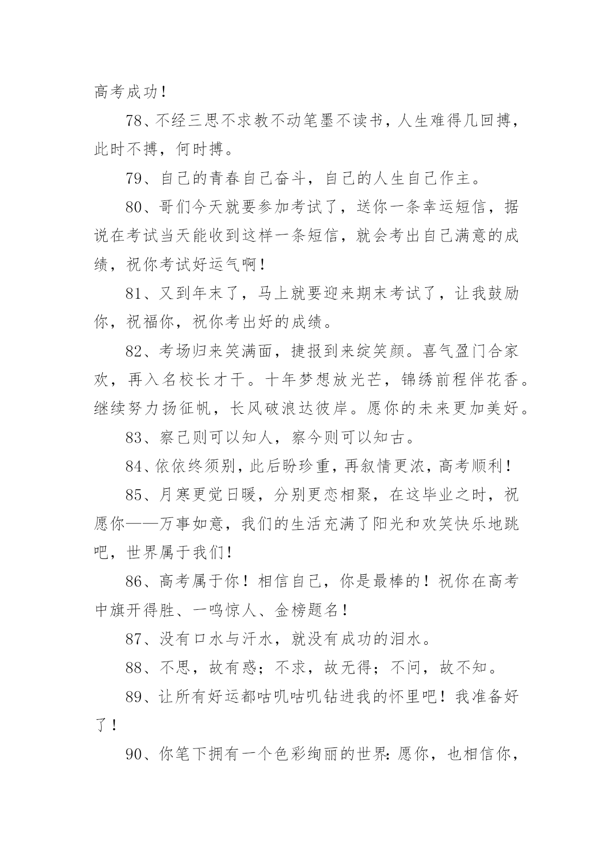 恭祝高考的祝福语恭祝高考的祝福语在生活、工作和学习中,大家或多或少都会用到过祝福语吧,祝福语能给亲朋好带去好运和欢乐。你知道祝福语怎样写才合适吗?下面是小编收集整理的恭祝高考的祝福语,供大家参考借鉴,希望可以帮助到有需要的朋友。恭祝高考的祝福语11、每天告诉自己一次:我真的很不错。2、总得分手,总得追求。来日方长,我们总有相逢的时候。高考顺利!3、高考加油!亲爱的朋友,平和一下自己的心态,控制自己的情绪,以平常心态应考,考完一门忘一门,让自己尽量放松,好好休息。希望你一举高中喔!4、用孜孜不倦去追求,拼搏的精神来钻研,让知识浇灌心田,用激情去迎接困难,用青春写意一片赞叹,祝愿大学生活充实饱满,学富五车,才高八斗,开创美丽的明天。5、天南海北,万木争春春在何处但将今夕放眼量。6、对于世界,我微不足道,但对于我自己,我就是全部。7、一举夺冠列前茅,金榜题名天下晓。8、年播洒汗水,即将迎来收获;十年辛勤耕耘,即将结出硕果;十年怀揣梦想,即将放飞希望;成功已在招手,只等最后拼搏。参加高考的朋友们加油,期待你们奏响凯歌!9、再好的种子,不播种下去,也结不出丰硕的果实。10、祥瑞霞光辉煌映,捷报频传相互应。考取功名中状元,亲朋同学满门盈。寒窗十年同样情,实现梦想秀前景。学海博识无止境,勤奋学研长本领。祝你如愿以偿。11、用知识武装自己,去实现人生的价值。12、一日一钱,千日千钱;绳锯木断,水滴石穿!13、沉住气,莫畏惧,高考到来考验你;不着急,带文具,拼搏考场属于你;心仔细,多分析,完美答卷等着你;笑嘻嘻,愿顺利,金榜题名祝福你!祝高考顺利,顺心如意!14、十年寒窗苦功练,十年春秋含心酸。十年梦想今实现,静心细阅挥笔杆。笔落凤飞速成章,轻松愉悦答卷完。胸有成竹上金榜,志愿清华最理想。祝你佳成绩。15、考上了也没什么,反正四年以后你们还是继续迷茫。16、骄阳照耀灿烂夏荷,捷报飞入期待心河。合家欢乐笑声不断,亲友相贺祝福连连。设宴庆功盛邀宾朋,席间共话求学美梦。今朝中榜继续扬帆,来日成才一片灿烂。17、抱的希望,为的努力,做最坏的打算。18、放下包袱开动脑筋,勤于思考好好复习,祝你取得好成绩!19、高考是比知识、比能力、比心理、比信心、比体力的一场综合考试。20、拼一载春秋,搏一生无悔。21、好好加油,让梦想变成现实。22、三日不读,口生荆棘;三日不弹,手生荆棘。23、六月喜鹊叫喳喳,捷报飞花到你家。翩翩身影入家门,合家听闻笑纷纷。亲友街坊同庆贺,笑语盈盈共欢乐。名校深造美梦圆,美好人生正嫣然。愿你的人生更加灿烂辉煌。24、五十天,一切足以改变。25、家中父母吃苦受累盼的是捷报频传,灯下学子呕心沥血想的是金榜题名。26、时间抓起来就是黄金,抓不起来就是流水。27、学习与坐禅相似,须有一颗恒心。28、痛苦的记忆是泪水洗不净的,只有汗水才能把它冲掉。29、不苦不累,高三无味;不拼不搏,高三白活。30、我们乐观自信,我们潜力无穷。31、扬帆起远航,不负青春梦。32、高考到,送你一颗幸运草,愿你高考无烦恼,送你一个好运包,愿你高考成绩高,送你一个走运袋,愿你成绩真不赖,送你一条短信息,愿你金榜题名,梦想成真。33、文明考试、公平竞争。34、付出汗水,收获成功。付出的所有代价,都是为了更好的明天。35、勤奋乐学,团结拼搏。36、我成功因为我努力,我努力因为我自信。37、注意保持身体健康,身体才是革命的本钱!38、没有一种不经过蔑视、忍耐和斗争就能够降服的命运。39、做对的事情比把事情做对重要。40、枝头喜鹊欢喜叫,金榜题名真骄傲。一家开怀乐淘淘,目标远大志向高。跃入龙门家门耀,踏进学府再深造。锦绣前程一片好,实现梦想心欢笑。愿你前途更加灿烂。41、高考场上奋笔书,从容答题全过关。42、做一题会一题,一题决定命运。43、想说爱你,感觉太沉;想说喜欢,感觉太轻;一天天地眷恋,一夜夜的无眠,我只有数着相思的绿莹帘珠,托星月寄到你窗前。祝高考顺意!44、因害怕失败而不敢放手一搏,永远不会成功。45、成功的法则极为简单,但是简单并不代表容易。46、人生能有几回搏?现在不搏更待何时?珍惜机遇吧,让金色的年华碰撞出更加灿烂的火花!47、我知道你正在经历人生中的一次重要挑战,或许你有焦虑有恐惧,也有激动,但我想说,请不要忘记身边所有关爱着你的人,我们是你坚强的后盾。祝高考顺心如意!48、世上所有美好的感情加在一起,也抵不上一桩高尚的行动。49、江苏卷:如果你相信每一个生命的诞生都是一个奇迹,每一段生活都是创造,那么无需拒绝平庸,因为你早已不再平庸。50、奋斗拼搏,让雄心与智慧在六月闪光。51、生活中没有理想的人,是可怜的人。52、你有你的赤橙黄绿,我有我的.青蓝靛紫,天空同属于我们,因为我们年轻。53、更快、更高、更强。就是金牌。54、第一行歪斜的脚印,已被岁月的