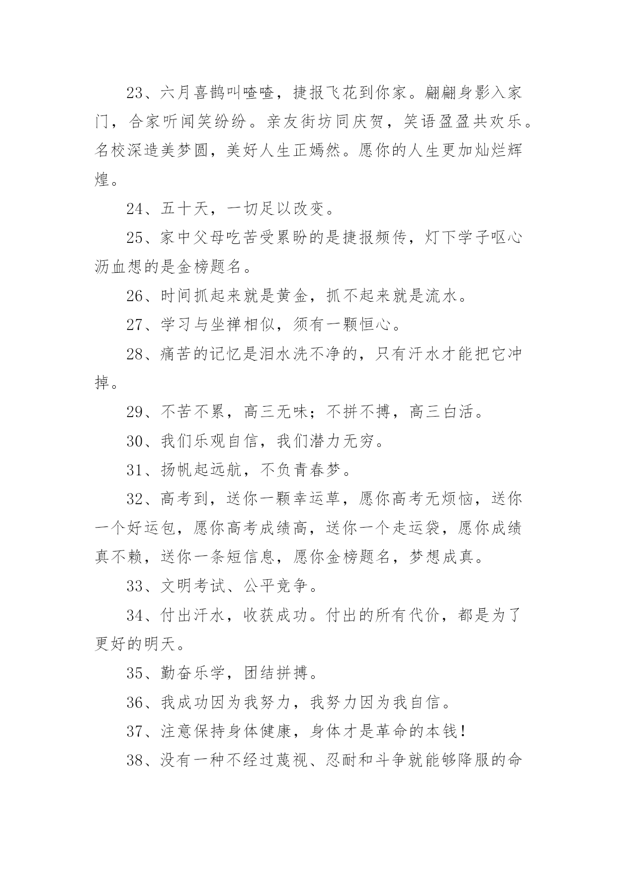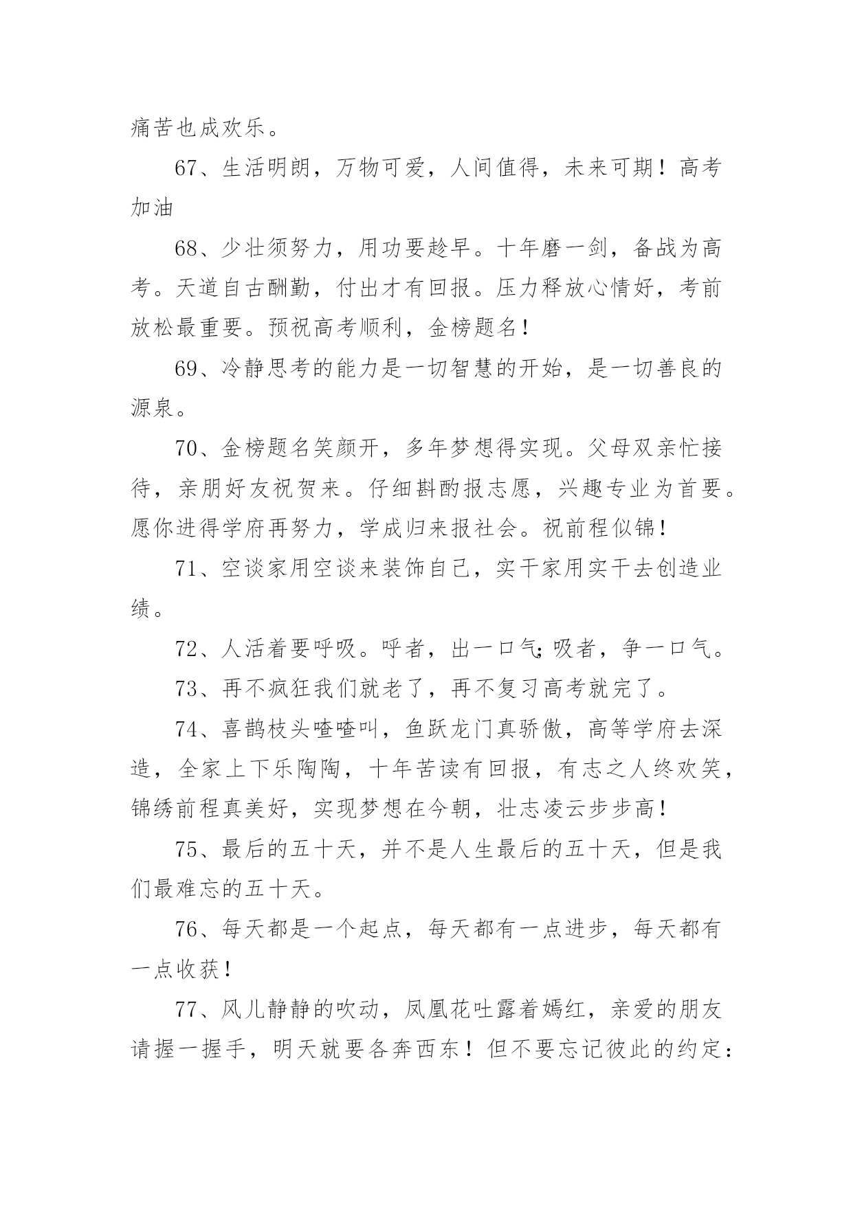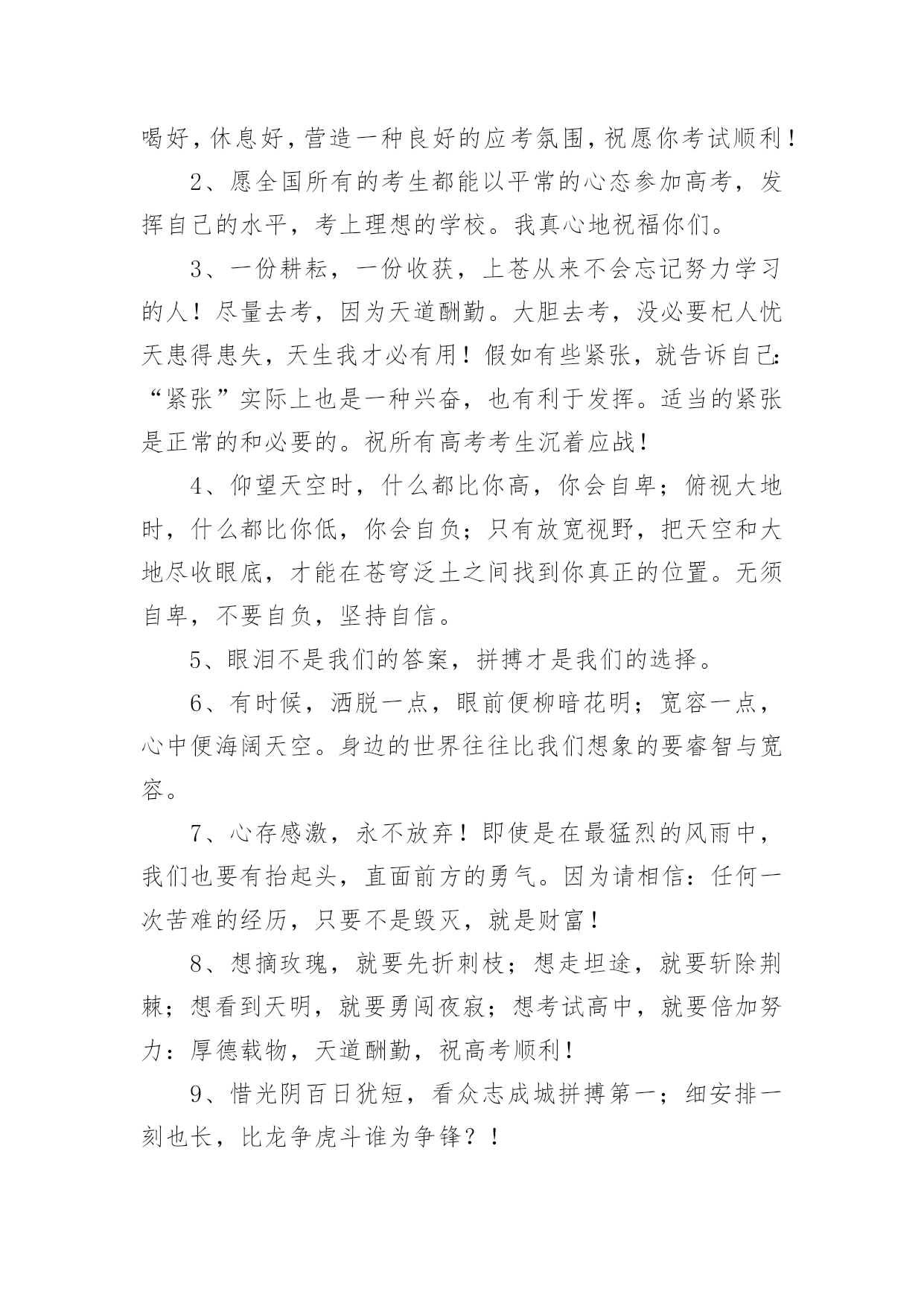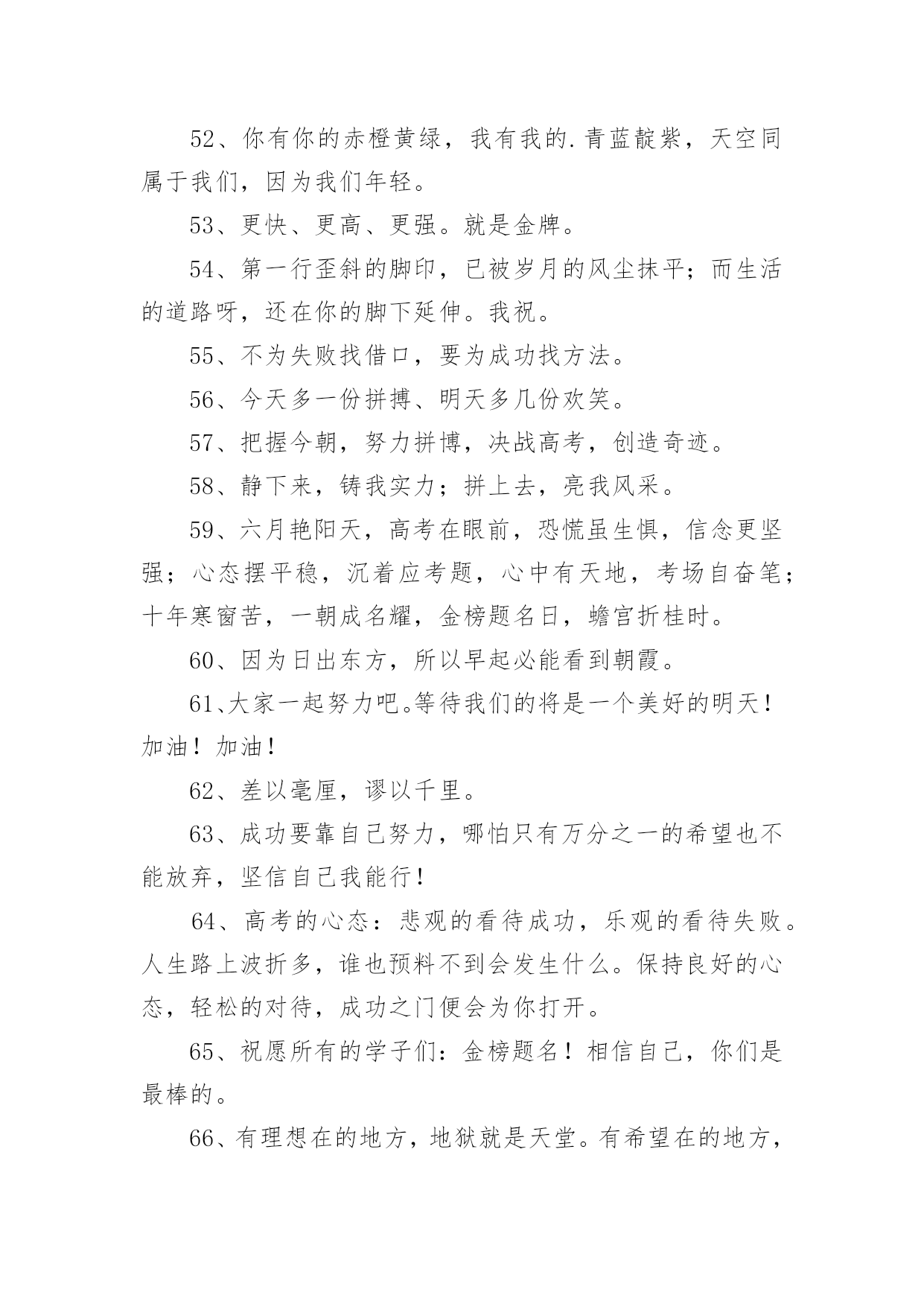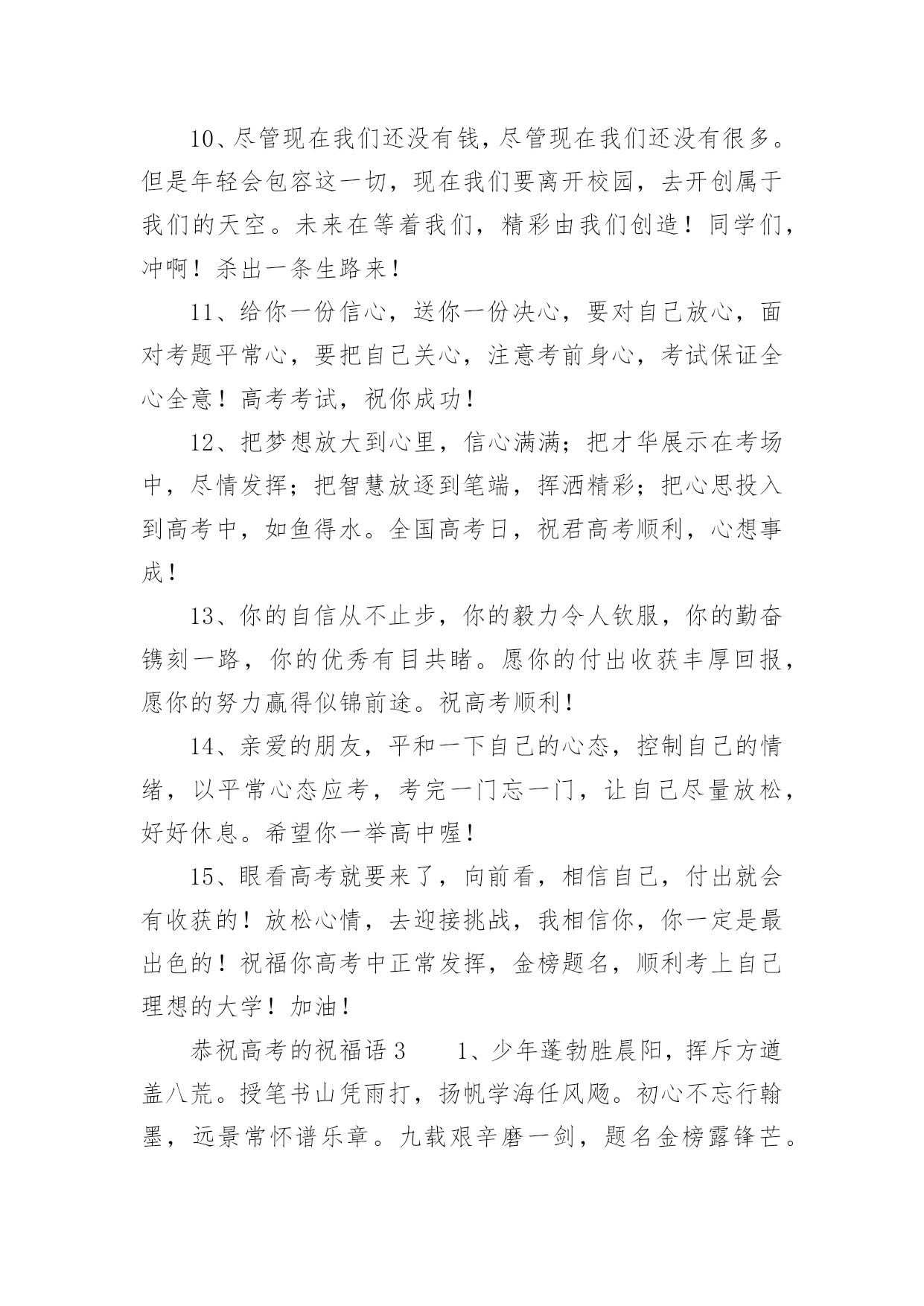 恭祝高考的祝福语恭祝高考的祝福语在生活、工作和学习中,大家或多或少都会用到过祝福语吧,祝福语能给亲朋好带去好运和欢乐。你知道祝福语怎样写才合适吗?下面是小编收集整理的恭祝高考的祝福语,供大家参考借鉴,希望可以帮助到有需要的朋友。恭祝高考的祝福语11、每天告诉自己一次:我真的很不错。2、总得分手,总得追求。来日方长,我们总有相逢的时候。高考顺利!3、高考加油!亲爱的朋友,平和一下自己的心态,控制自己的情绪,以平常心态应考,考完一门忘一门,让自己尽量放松,好好休息。希望你一举高中喔!4、用孜孜不倦去追求,拼搏的精神来钻研,让知识浇灌心田,用激情去迎接困难,用青春写意一片赞叹,祝愿大学生活充实饱满,学富五车,才高八斗,开创美丽的明天。5、天南海北,万木争春春在何处但将今夕放眼量。6、对于世界,我微不足道,但对于我自己,我就是全部。7、一举夺冠列前茅,金榜题名天下晓。8、年播洒汗水,即将迎来收获;十年辛勤耕耘,即将结出硕果;十年怀揣梦想,即将放飞希望;成功已在招手,只等最后拼搏。参加高考的朋友们加油,期待你们奏响凯歌!9、再好的种子,不播种下去,也结不出丰硕的果实。10、祥瑞霞光辉煌映,捷报频传相互应。考取功名中状元,亲朋同学满门盈。寒窗十年同样情,实现梦想秀前景。学海博识无止境,勤奋学研长本领。祝你如愿以偿。11、用知识武装自己,去实现人生的价值。12、一日一钱,千日千钱;绳锯木断,水滴石穿!13、沉住气,莫畏惧,高考到来考验你;不着急,带文具,拼搏考场属于你;心仔细,多分析,完美答卷等着你;笑嘻嘻,愿顺利,金榜题名祝福你!祝高考顺利,顺心如意!14、十年寒窗苦功练,十年春秋含心酸。十年梦想今实现,静心细阅挥笔杆。笔落凤飞速成章,轻松愉悦答卷完。胸有成竹上金榜,志愿清华最理想。祝你佳成绩。15、考上了也没什么,反正四年以后你们还是继续迷茫。16、骄阳照耀灿烂夏荷,捷报飞入期待心河。合家欢乐笑声不断,亲友相贺祝福连连。设宴庆功盛邀宾朋,席间共话求学美梦。今朝中榜继续扬帆,来日成才一片灿烂。17、抱的希望,为的努力,做最坏的打算。18、放下包袱开动脑筋,勤于思考好好复习,祝你取得好成绩!19、高考是比知识、比能力、比心理、比信心、比体力的一场综合考试。20、拼一载春秋,搏一生无悔。21、好好加油,让梦想变成现实。22、三日不读,口生荆棘;三日不弹,手生荆棘。23、六月喜鹊叫喳喳,捷报飞花到你家。翩翩身影入家门,合家听闻笑纷纷。亲友街坊同庆贺,笑语盈盈共欢乐。名校深造美梦圆,美好人生正嫣然。愿你的人生更加灿烂辉煌。24、五十天,一切足以改变。25、家中父母吃苦受累盼的是捷报频传,灯下学子呕心沥血想的是金榜题名。26、时间抓起来就是黄金,抓不起来就是流水。27、学习与坐禅相似,须有一颗恒心。28、痛苦的记忆是泪水洗不净的,只有汗水才能把它冲掉。29、不苦不累,高三无味;不拼不搏,高三白活。30、我们乐观自信,我们潜力无穷。31、扬帆起远航,不负青春梦。32、高考到,送你一颗幸运草,愿你高考无烦恼,送你一个好运包,愿你高考成绩高,送你一个走运袋,愿你成绩真不赖,送你一条短信息,愿你金榜题名,梦想成真。33、文明考试、公平竞争。34、付出汗水,收获成功。付出的所有代价,都是为了更好的明天。35、勤奋乐学,团结拼搏。36、我成功因为我努力,我努力因为我自信。37、注意保持身体健康,身体才是革命的本钱!38、没有一种不经过蔑视、忍耐和斗争就能够降服的命运。39、做对的事情比把事情做对重要。40、枝头喜鹊欢喜叫,金榜题名真骄傲。一家开怀乐淘淘,目标远大志向高。跃入龙门家门耀,踏进学府再深造。锦绣前程一片好,实现梦想心欢笑。愿你前途更加灿烂。41、高考场上奋笔书,从容答题全过关。42、做一题会一题,一题决定命运。43、想说爱你,感觉太沉;想说喜欢,感觉太轻;一天天地眷恋,一夜夜的无眠,我只有数着相思的绿莹帘珠,托星月寄到你窗前。祝高考顺意!44、因害怕失败而不敢放手一搏,永远不会成功。45、成功的法则极为简单,但是简单并不代表容易。46、人生能有几回搏?现在不搏更待何时?珍惜机遇吧,让金色的年华碰撞出更加灿烂的火花!47、我知道你正在经历人生中的一次重要挑战,或许你有焦虑有恐惧,也有激动,但我想说,请不要忘记身边所有关爱着你的人,我们是你坚强的后盾。祝高考顺心如意!48、世上所有美好的感情加在一起,也抵不上一桩高尚的行动。49、江苏卷:如果你相信每一个生命的诞生都是一个奇迹,每一段生活都是创造,那么无需拒绝平庸,因为你早已不再平庸。50、奋斗拼搏,让雄心与智慧在六月闪光。51、生活中没有理想的人,是可怜的人。52、你有你的赤橙黄绿,我有我的.青蓝靛紫,天空同属于我们,因为我们年轻。53、更快、更高、更强。就是金牌。54、第一行歪斜的脚印,已被岁月的