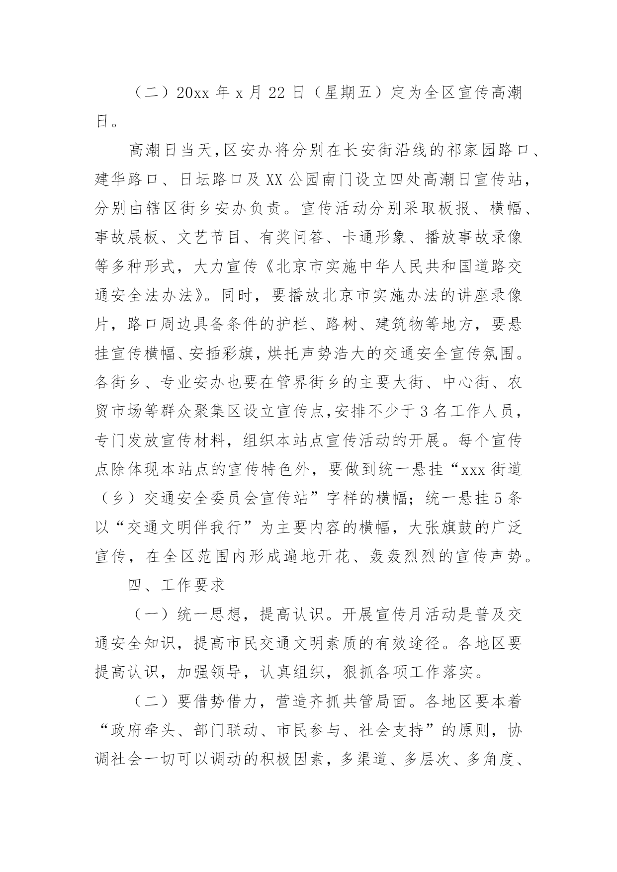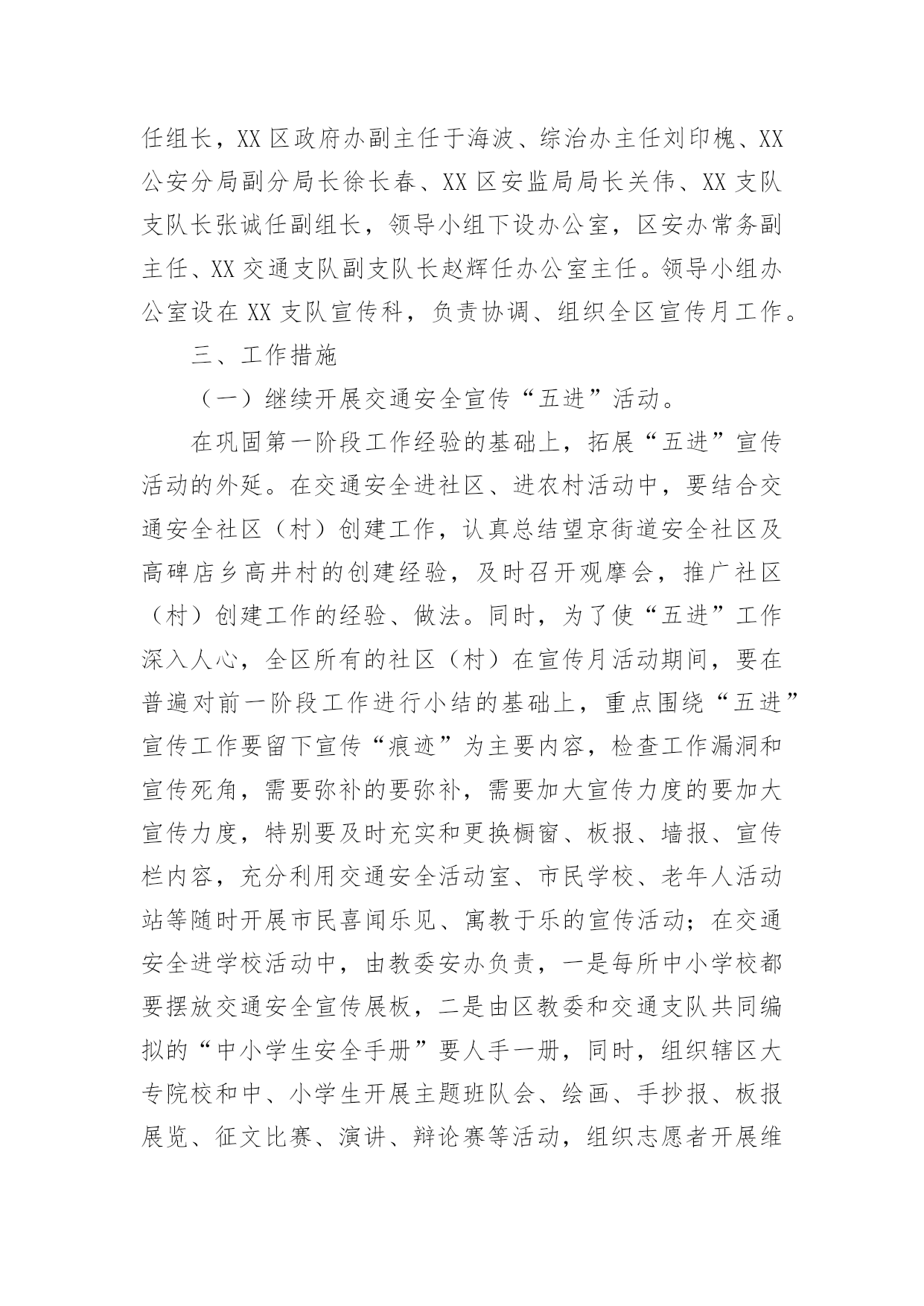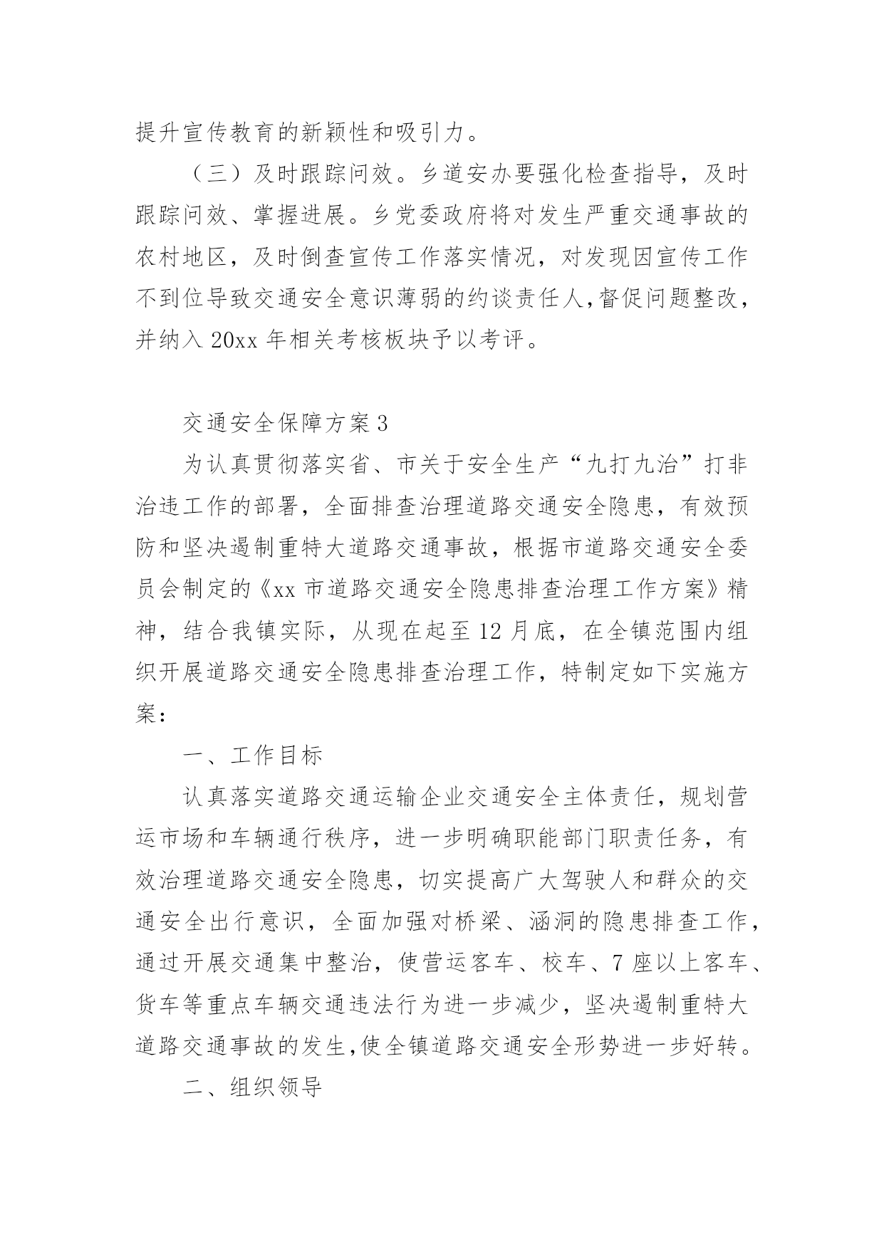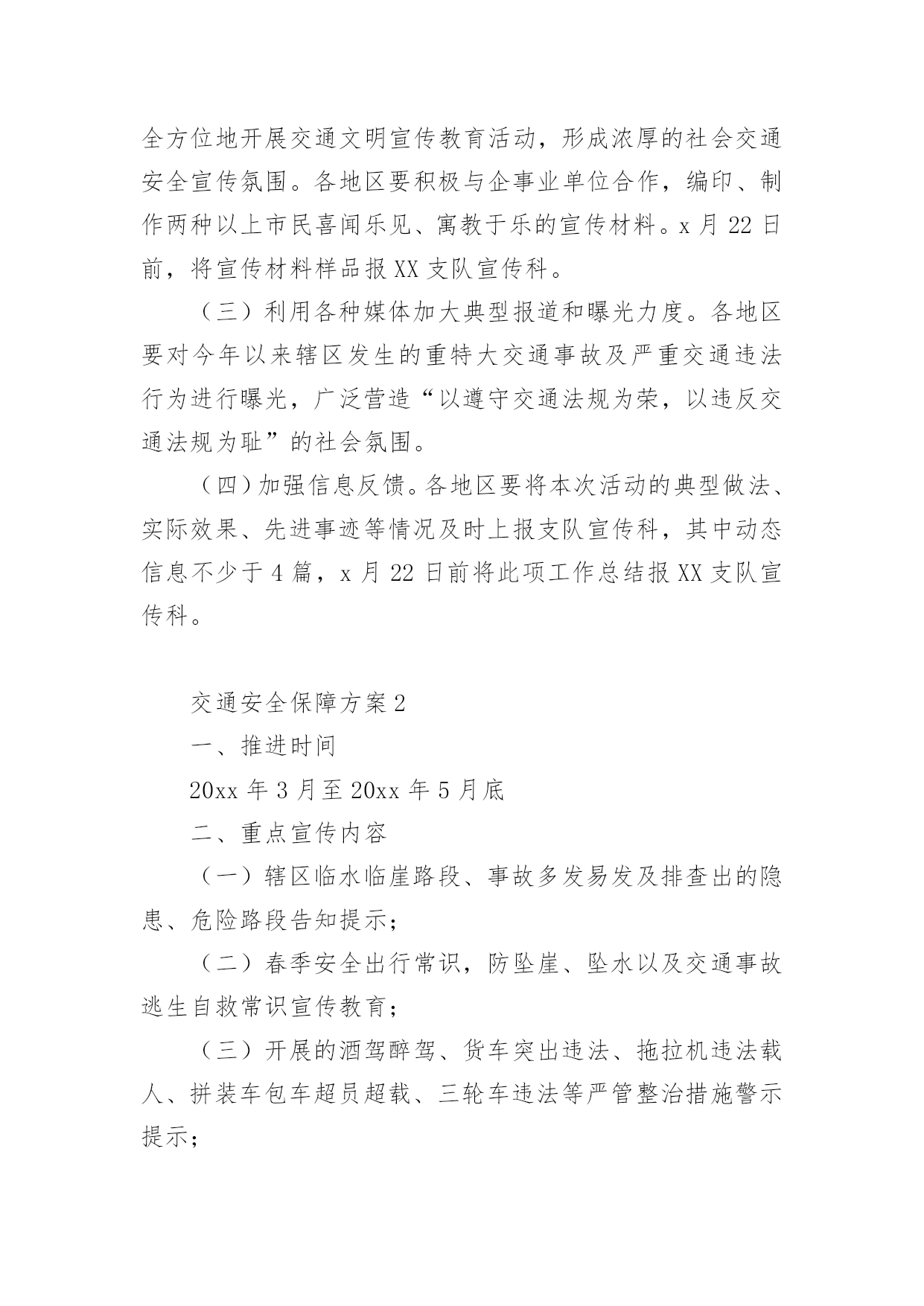交通安全保障方案交通安全保障方案(精选18篇)为了确保工作或事情能有条不紊地开展,通常需要预先制定一份完整的方案,方案是从目的、要求、方式、方法、进度等方面进行安排的书面计划。制定方案需要注意哪些问题呢?以下是小编帮大家整理的交通安全保障方案(精选18篇),欢迎阅读,希望大家能够喜欢。交通安全保障方案1为提高市民的交通安全意识和交通文明素质,根据《首都文明礼仪宣传教育实践活动工作方案》精神,我区将按照市交管局及市安办“x月份交通安全宣传月”的总体工作部署,在全区广泛开展以“交通文明伴我行”为主题的宣传教育活动。特制定工作方案如下:一、指导思想以“交通文明伴我行”为主题,以宣传道路交通安全法律、法规及安全常识为主要内容,充分依靠各街乡政府、各委办局及相关单位,调动社会各方面力量,采取各种宣传形式,大力营造宣传氛围,并进一步提高广大市民群众的交通安全意识和交通文明素质,为构建和谐稳定社会,贯彻落实“人文奥运”理念做出新的贡献。二、组织领导成立交通安全宣传月工作领导小组,XX区副区长佟克克任组长,XX区政府办副主任于海波、综治办主任刘印槐、XX公安分局副分局长徐长春、XX区安监局局长关伟、XX支队支队长张诚任副组长,领导小组下设办公室,区安办常务副主任、XX交通支队副支队长赵辉任办公室主任。领导小组办公室设在XX支队宣传科,负责协调、组织全区宣传月工作。三、工作措施(一)继续开展交通安全宣传“五进”活动。在巩固第一阶段工作经验的基础上,拓展“五进”宣传活动的外延。在交通安全进社区、进农村活动中,要结合交通安全社区(村)创建工作,认真总结望京街道安全社区及高碑店乡高井村的创建经验,及时召开观摩会,推广社区(村)创建工作的经验、做法。同时,为了使“五进”工作深入人心,全区所有的社区(村)在宣传月活动期间,要在普遍对前一阶段工作进行小结的基础上,重点围绕“五进”宣传工作要留下宣传“痕迹”为主要内容,检查工作漏洞和宣传死角,需要弥补的要弥补,需要加大宣传力度的要加大宣传力度,特别要及时充实和更换橱窗、板报、墙报、宣传栏内容,充分利用交通安全活动室、市民学校、老年人活动站等随时开展市民喜闻乐见、寓教于乐的宣传活动;在交通安全进学校活动中,由教委安办负责,一是每所中小学校都要摆放交通安全宣传展板,二是由区教委和交通支队共同编拟的“中小学生安全手册”要人手一册,同时,组织辖区大专院校和中、小学生开展主题班队会、绘画、手抄报、板报展览、征文比赛、演讲、辩论赛等活动,组织志愿者开展维护交通秩序、发放交通安全宣传品等公益活动;在交通安全进单位活动中,要结合本单位实际,结合私家车数量增加的特点,建立交通安全防范责任制,加强对所属机动车的使用、保养、维修制度进行一次检查,对单位专职机动车驾驶员的道路交通安全教育培训、考核制度进行一次检查,对制度不完善的,要责令限期改正。同时,针对近一个时期有相当部分驾驶员为躲避非现场处罚,故意遮挡、污损、不按规定悬挂机动车号牌等交通违法行为突出的实际情况,单位、社区都要对所属驾驶员及居民进行一次专项教育。可利用广播、有线电视、网络等媒体,宣传此类交通违法行为的危害及后果,确保交通安全宣传进入千家万户。各地区在开展宣传教育进社区、单位、学校、农村、家庭的基础上,要将宣传范围拓展到商场、影院、医院、晨练点等社会的每一个角落。在利用事故光盘、展板等重要“抓手”的基础上,要将宣传载体扩展到购物袋、公园门票、信封、文件夹、粘贴画等市民生活、工作的细节。进一步加强对驾驶本市营运机动车外埠驾驶员的宣传管理。在全区专业运输单位中,广泛开展一次针对外埠驾驶员的安全状况和驾驶资格的核查和交通法律、法规测试活动,凡未经核查随意雇佣驾驶员发生问题的用人单位,区安办、交通支队将按照有关规定追究单位领导责任,同时各单位对近年来发生同等责任以上交通事故、交通违法满12分或法规测试补考不及格的驾驶员要进行一次彻底清理,该解除劳务合同的一定要解除,该辞退的一定要辞退。(二)20xx年x月22日(星期五)定为全区宣传高潮日。高潮日当天,区安办将分别在长安街沿线的祁家园路口、建华路口、日坛路口及XX公园南门设立四处高潮日宣传站,分别由辖区街乡安办负责。宣传活动分别采取板报、横幅、事故展板、文艺节目、有奖问答、卡通形象、播放事故录像等多种形式,大力宣传《北京市实施中华人民共和国道路交通安全法办法》。同时,要播放北京市实施办法的讲座录像片,路口周边具备条件的护栏、路树、建筑物等地方,要悬挂宣传横幅、安插彩旗,烘托声势浩大的交通安全宣传氛围。各街乡、专业安办也要在管界街乡的主要大街、中心街、农贸市场等群众聚集区设立宣传点,安排不少于3名工作人员,专门发放宣传材料,组织本站点宣传活动的开展。每个宣传点除体现本站点的宣传特色外,要做到统一悬挂“xxx街道(乡)交通安
