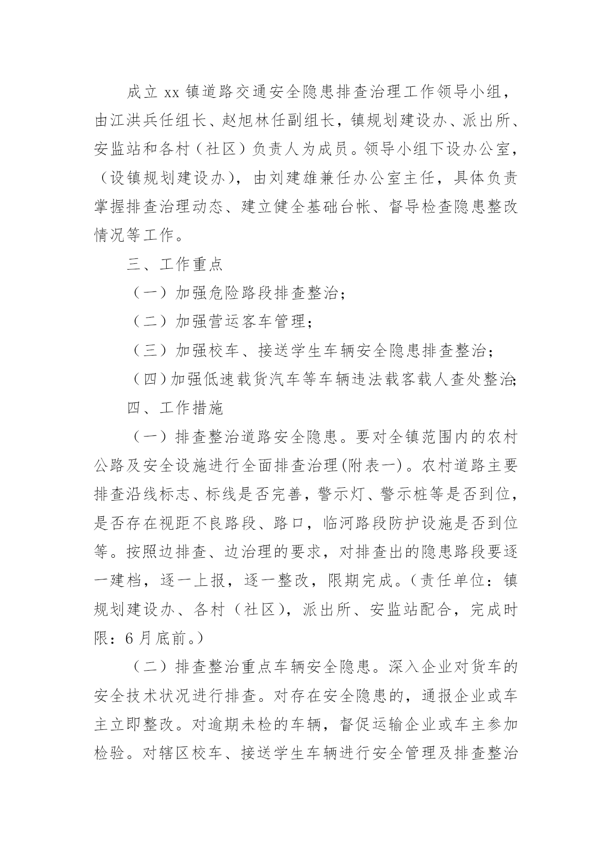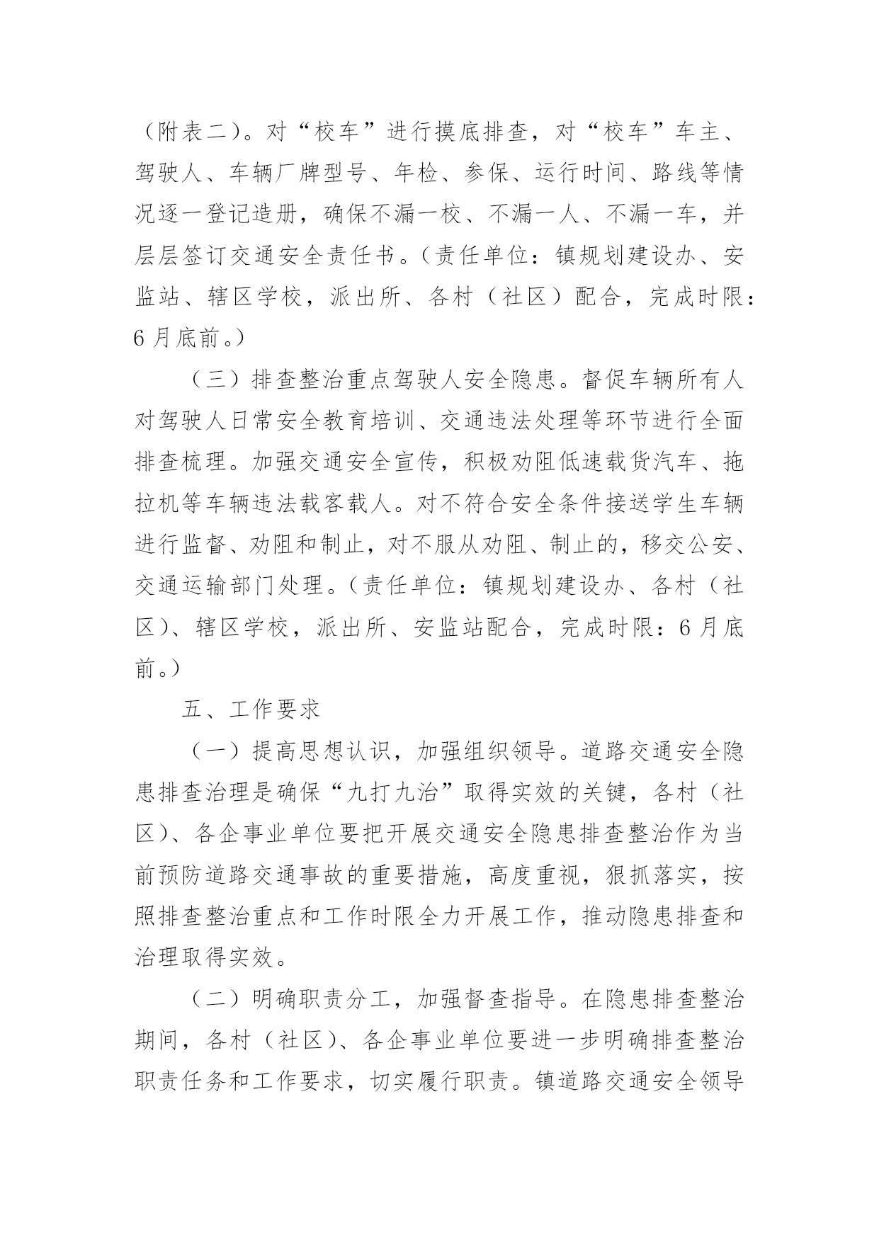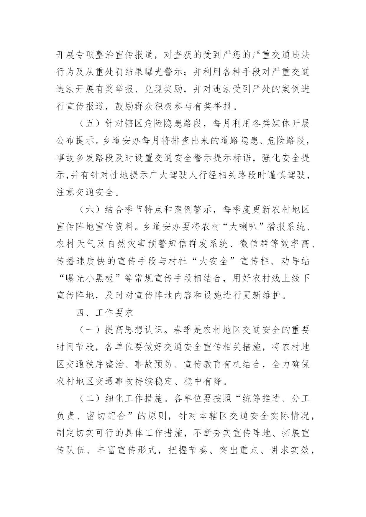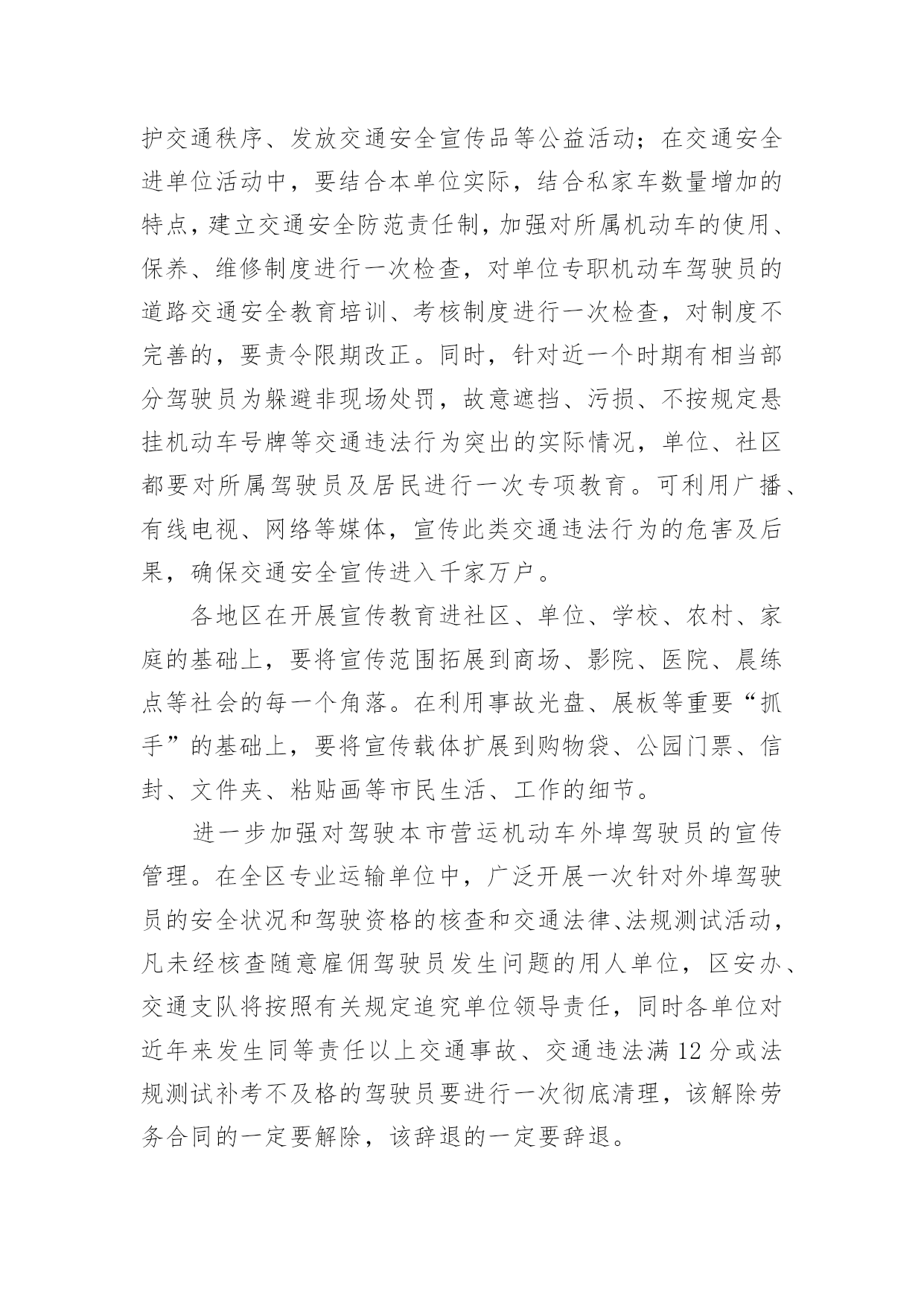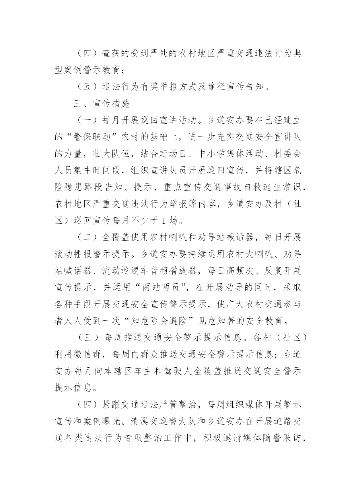 交通安全保障方案交通安全保障方案(精选18篇)为了确保工作或事情能有条不紊地开展,通常需要预先制定一份完整的方案,方案是从目的、要求、方式、方法、进度等方面进行安排的书面计划。制定方案需要注意哪些问题呢?以下是小编帮大家整理的交通安全保障方案(精选18篇),欢迎阅读,希望大家能够喜欢。交通安全保障方案1为提高市民的交通安全意识和交通文明素质,根据《首都文明礼仪宣传教育实践活动工作方案》精神,我区将按照市交管局及市安办“x月份交通安全宣传月”的总体工作部署,在全区广泛开展以“交通文明伴我行”为主题的宣传教育活动。特制定工作方案如下:一、指导思想以“交通文明伴我行”为主题,以宣传道路交通安全法律、法规及安全常识为主要内容,充分依靠各街乡政府、各委办局及相关单位,调动社会各方面力量,采取各种宣传形式,大力营造宣传氛围,并进一步提高广大市民群众的交通安全意识和交通文明素质,为构建和谐稳定社会,贯彻落实“人文奥运”理念做出新的贡献。二、组织领导成立交通安全宣传月工作领导小组,XX区副区长佟克克任组长,XX区政府办副主任于海波、综治办主任刘印槐、XX公安分局副分局长徐长春、XX区安监局局长关伟、XX支队支队长张诚任副组长,领导小组下设办公室,区安办常务副主任、XX交通支队副支队长赵辉任办公室主任。领导小组办公室设在XX支队宣传科,负责协调、组织全区宣传月工作。三、工作措施(一)继续开展交通安全宣传“五进”活动。在巩固第一阶段工作经验的基础上,拓展“五进”宣传活动的外延。在交通安全进社区、进农村活动中,要结合交通安全社区(村)创建工作,认真总结望京街道安全社区及高碑店乡高井村的创建经验,及时召开观摩会,推广社区(村)创建工作的经验、做法。同时,为了使“五进”工作深入人心,全区所有的社区(村)在宣传月活动期间,要在普遍对前一阶段工作进行小结的基础上,重点围绕“五进”宣传工作要留下宣传“痕迹”为主要内容,检查工作漏洞和宣传死角,需要弥补的要弥补,需要加大宣传力度的要加大宣传力度,特别要及时充实和更换橱窗、板报、墙报、宣传栏内容,充分利用交通安全活动室、市民学校、老年人活动站等随时开展市民喜闻乐见、寓教于乐的宣传活动;在交通安全进学校活动中,由教委安办负责,一是每所中小学校都要摆放交通安全宣传展板,二是由区教委和交通支队共同编拟的“中小学生安全手册”要人手一册,同时,组织辖区大专院校和中、小学生开展主题班队会、绘画、手抄报、板报展览、征文比赛、演讲、辩论赛等活动,组织志愿者开展维护交通秩序、发放交通安全宣传品等公益活动;在交通安全进单位活动中,要结合本单位实际,结合私家车数量增加的特点,建立交通安全防范责任制,加强对所属机动车的使用、保养、维修制度进行一次检查,对单位专职机动车驾驶员的道路交通安全教育培训、考核制度进行一次检查,对制度不完善的,要责令限期改正。同时,针对近一个时期有相当部分驾驶员为躲避非现场处罚,故意遮挡、污损、不按规定悬挂机动车号牌等交通违法行为突出的实际情况,单位、社区都要对所属驾驶员及居民进行一次专项教育。可利用广播、有线电视、网络等媒体,宣传此类交通违法行为的危害及后果,确保交通安全宣传进入千家万户。各地区在开展宣传教育进社区、单位、学校、农村、家庭的基础上,要将宣传范围拓展到商场、影院、医院、晨练点等社会的每一个角落。在利用事故光盘、展板等重要“抓手”的基础上,要将宣传载体扩展到购物袋、公园门票、信封、文件夹、粘贴画等市民生活、工作的细节。进一步加强对驾驶本市营运机动车外埠驾驶员的宣传管理。在全区专业运输单位中,广泛开展一次针对外埠驾驶员的安全状况和驾驶资格的核查和交通法律、法规测试活动,凡未经核查随意雇佣驾驶员发生问题的用人单位,区安办、交通支队将按照有关规定追究单位领导责任,同时各单位对近年来发生同等责任以上交通事故、交通违法满12分或法规测试补考不及格的驾驶员要进行一次彻底清理,该解除劳务合同的一定要解除,该辞退的一定要辞退。(二)20xx年x月22日(星期五)定为全区宣传高潮日。高潮日当天,区安办将分别在长安街沿线的祁家园路口、建华路口、日坛路口及XX公园南门设立四处高潮日宣传站,分别由辖区街乡安办负责。宣传活动分别采取板报、横幅、事故展板、文艺节目、有奖问答、卡通形象、播放事故录像等多种形式,大力宣传《北京市实施中华人民共和国道路交通安全法办法》。同时,要播放北京市实施办法的讲座录像片,路口周边具备条件的护栏、路树、建筑物等地方,要悬挂宣传横幅、安插彩旗,烘托声势浩大的交通安全宣传氛围。各街乡、专业安办也要在管界街乡的主要大街、中心街、农贸市场等群众聚集区设立宣传点,安排不少于3名工作人员,专门发放宣传材料,组织本站点宣传活动的开展。每个宣传点除体现本站点的宣传特色外,要做到统一悬挂“xxx街道(乡)交通安