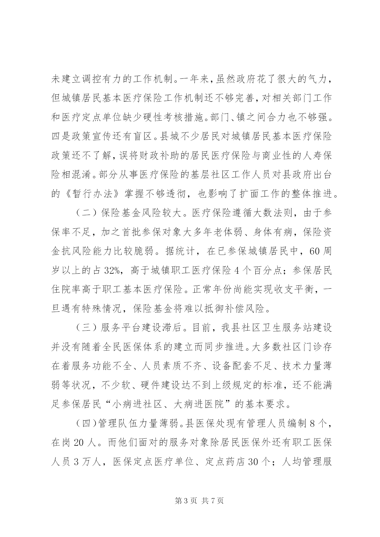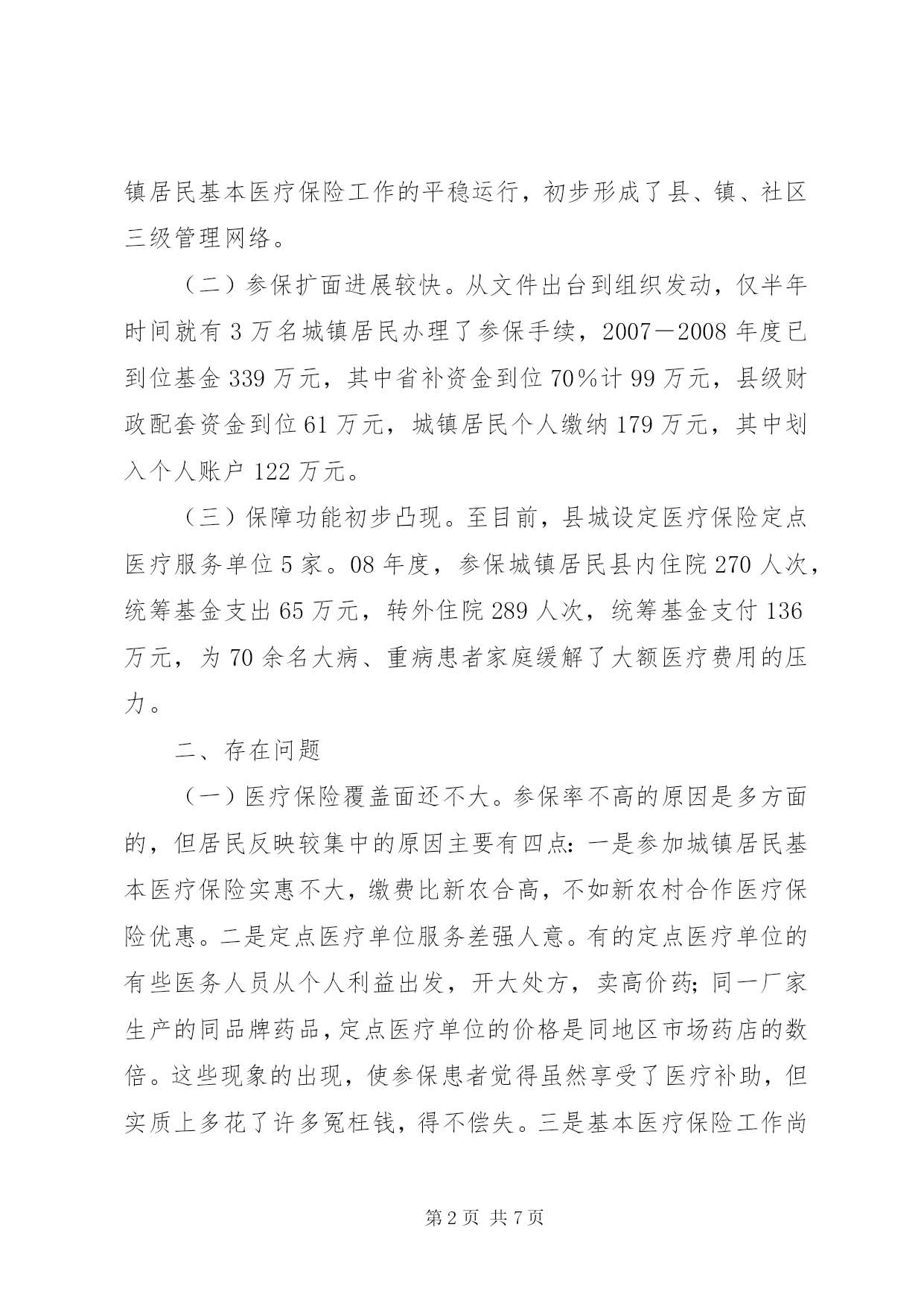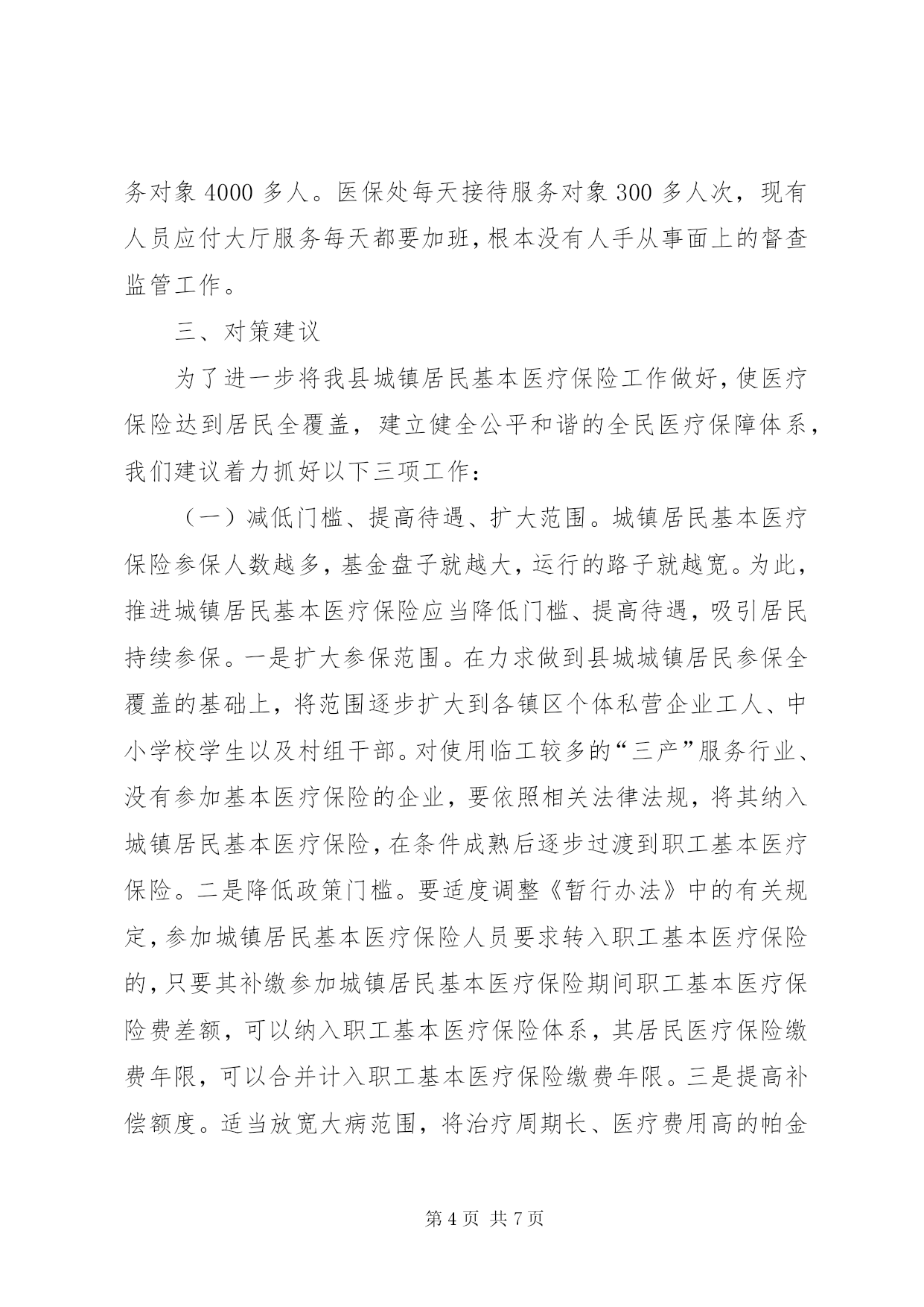 第PAGE\*Arabic\*MERGEFORMAT7页共NUMPAGES\*MERGEFORMAT7页居民医疗保险调研报告实施城镇居民基本医疗保险,是完善社会保障体系、缓解群众看病难看病贵矛盾的重要举措,是改善人民群众基本生活、构建和谐社会的重要内容,也是一项惠及千家万户的德政工程、民心工程。为了进一步推动我县城镇居民基本医疗保险工作登台阶、上水平,结合省医疗保险“千千万万行动”,深入社区走访身患重病的参保居民,深入病区到患者床前,走进社区到居民家中,在送去党和政府关怀的同时,还认真宣传、解释医保政策,认真答疑解惑,让他们切实体会到医疗保险给他们带来的“实惠”,消除他们思想上的顾虑,同时对城镇居民医疗保险工作工作进行了专题调研。有关情况如下:一、工作成效自2007年8月份以来,我县城镇居民基本医疗保险工作启动实施,在县委、县政府的高度重视和强势推动下,在相关部门的支持和配合下,县劳保局、医保处扎实有效地开展了这项工作,无论是进展速度、实施效果,还是建章立制、规范运作等工作都在全市名列前茅,多次受到省医疗保险中心的表彰。(一)城保框架基本建立。2007年5月14日,我县出台《XX县区城镇居民医疗保险暂行办法》、《XX县区城镇居民医疗保险实施细则(试行)》,对城镇居民基本医疗保险工作的筹资、诊疗、补偿、基金管理等作了具体明确规定,从制度上保障了城镇居民基本医疗保险工作的平稳运行,初步形成了县、镇、社区三级管理网络。(二)参保扩面进展较快。从文件出台到组织发动,仅半年时间就有3万名城镇居民办理了参保手续,2007-2008年度已到位基金339万元,其中省补资金到位70%计99万元,县级财政配套资金到位61万元,城镇居民个人缴纳179万元,其中划入个人账户122万元。(三)保障功能初步凸现。至目前,县城设定医疗保险定点医疗服务单位5家。08年度,参保城镇居民县内住院270人次,统筹基金支出65万元,转外住院289人次,统筹基金支付136万元,为70余名大病、重病患者家庭缓解了大额医疗费用的压力。二、存在问题(一)医疗保险覆盖面还不大。参保率不高的原因是多方面的,但居民反映较集中的原因主要有四点:一是参加城镇居民基本医疗保险实惠不大,缴费比新农合高,不如新农村合作医疗保险优惠。二是定点医疗单位服务差强人意。有的定点医疗单位的有些医务人员从个人利益出发,开大处方,卖高价药;同一厂家生产的同品牌药品,定点医疗单位的价格是同地区市场药店的数倍。这些现象的出现,使参保患者觉得虽然享受了医疗补助,但实质上多花了许多冤枉钱,得不偿失。三是基本医疗保险工作尚未建立调控有力的工作机制。一年来,虽然政府花了很大的气力,但城镇居民基本医疗保险工作机制还不够完善,对相关部门工作和医疗定点单位缺少硬性考核措施。部门、镇之间合力也不够强。四是政策宣传还有盲区。县城不少居民对城镇居民基本医疗保险政策还不了解,误将财政补助的居民医疗保险与商业性的人寿保险相混淆。部分从事医疗保险的基层社区工作人员对县政府出台的《暂行办法》掌握不够透彻,也影响了扩面工作的整体推进。(二)保险基金风险较大。医疗保险遵循大数法则,由于参保率不足,加之首批参保对象大多年老体弱、身体有病,保险资金抗风险能力比较脆弱。据统计,在已参保城镇居民中,60周岁以上的占32%,高于城镇职工医疗保险4个百分点;参保居民住院率高于职工基本医疗保险。正常年份尚能实现收支平衡,一旦遇有特殊情况,保险基金将难以抵御补偿风险。(三)服务平台建设滞后。目前,我县社区卫生服务站建设并没有随着全民医保体系的建立而同步推进。大多数社区门诊存在着服务功能不全、人员素质不齐、设备配套不足、技术力量薄弱等状况,不少软、硬件建设达不到上级规定的标准,还不能满足参保居民“小病进社区、大病进医院”的基本要求。(四)管理队伍力量薄弱。县医保处现有管理人员编制8个,在岗20人。而他们面对的服务对象除居民医保外还有职工医保人员3万人,医保定点医疗单位、定点药店30个;人均管理服务对象4000多人。医保处每天接待服务对象300多人次,现有人员应付大厅服务每天都要加班,根本没有人手从事面上的督查监管工作。三、对策建议为了进一步将我县城镇居民基本医疗保险工作做好,使医疗保险达到居民全覆盖,建立健全公平和谐的全民医疗保障体系,我们建议着力抓好以下三项工作:(一)减低门槛、提高待遇、扩大范围。城镇居民基本医疗保险参保人数越多,基金盘子就越大,运行的路子就越宽。为此,推进城镇居民基本医疗保险应当降低门槛、提高待遇,吸引居民持续参保。一是扩大参保范围。在力求做到县城城镇居民参保全覆盖的基础上,将范围逐步扩大到各镇区个体私营企业工人、中小学校学生以及村组干部。对使用临工较多的“三产”服务行业、没有参加基本医疗保险的企业,要依照相