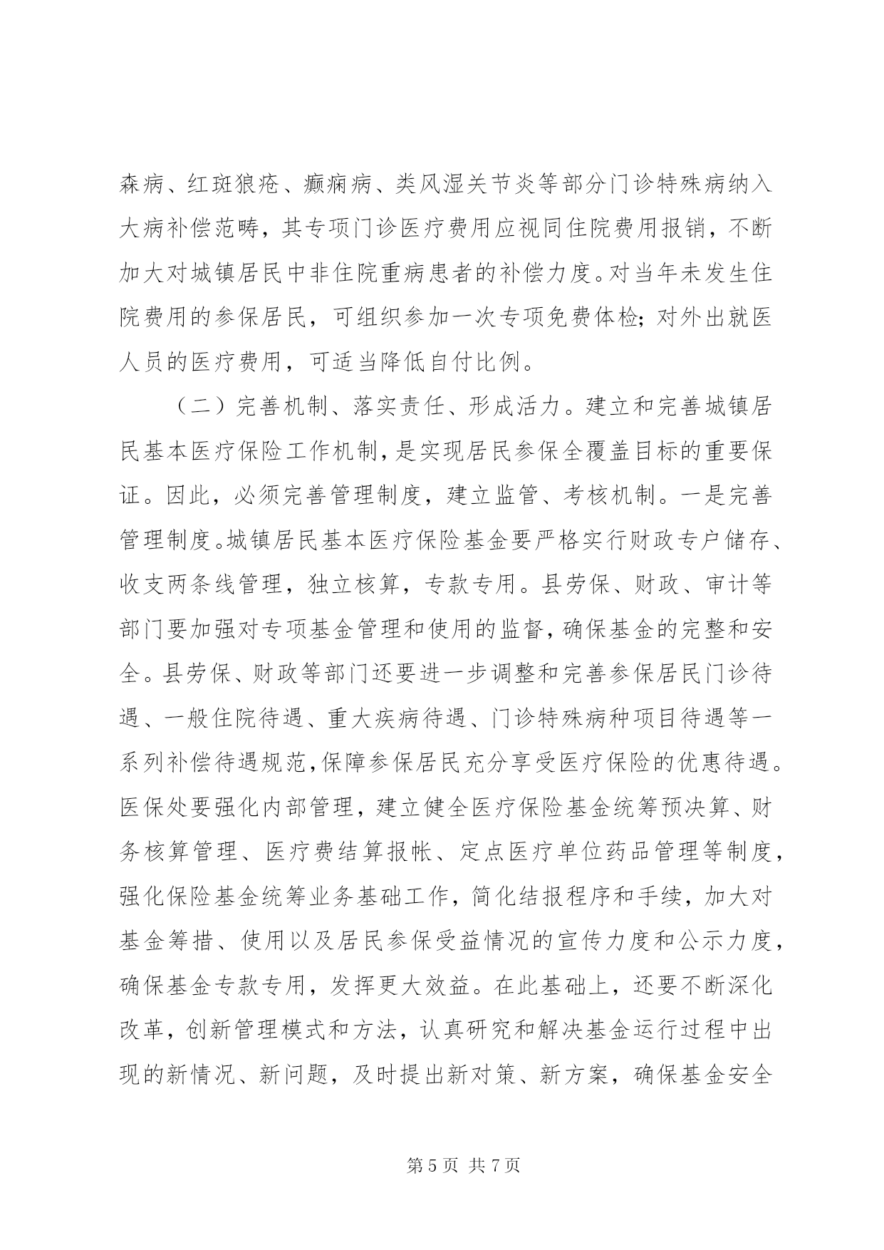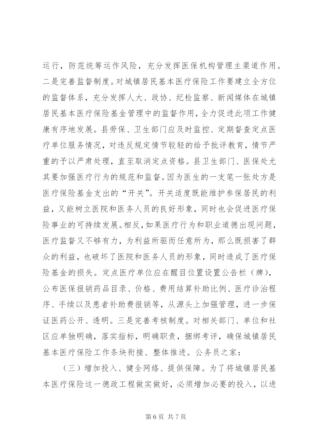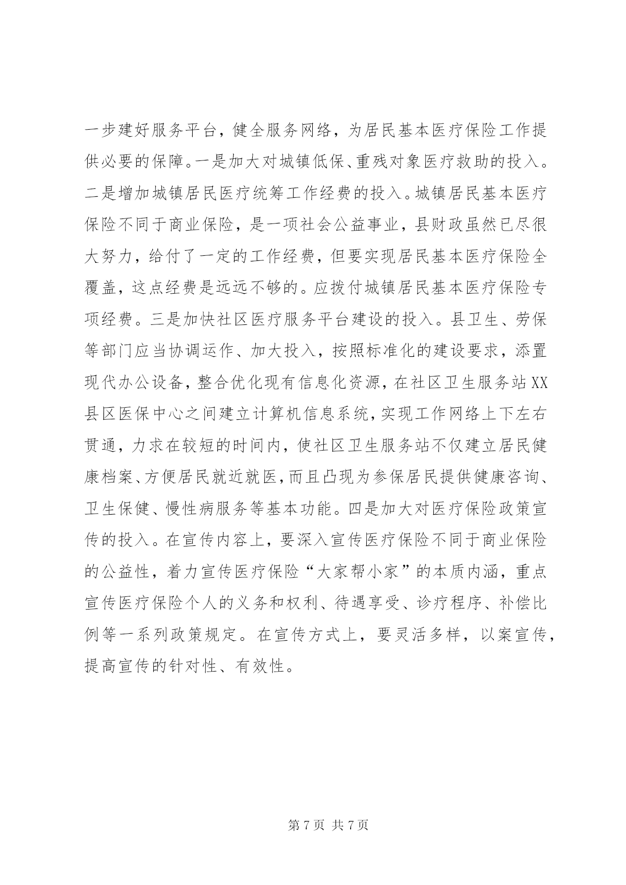 第PAGE\*Arabic\*MERGEFORMAT7页共NUMPAGES\*MERGEFORMAT7页居民医疗保险调研报告实施城镇居民基本医疗保险,是完善社会保障体系、缓解群众看病难看病贵矛盾的重要举措,是改善人民群众基本生活、构建和谐社会的重要内容,也是一项惠及千家万户的德政工程、民心工程。为了进一步推动我县城镇居民基本医疗保险工作登台阶、上水平,结合省医疗保险“千千万万行动”,深入社区走访身患重病的参保居民,深入病区到患者床前,走进社区到居民家中,在送去党和政府关怀的同时,还认真宣传、解释医保政策,认真答疑解惑,让他们切实体会到医疗保险给他们带来的“实惠”,消除他们思想上的顾虑,同时对城镇居民医疗保险工作工作进行了专题调研。有关情况如下:一、工作成效自2007年8月份以来,我县城镇居民基本医疗保险工作启动实施,在县委、县政府的高度重视和强势推动下,在相关部门的支持和配合下,县劳保局、医保处扎实有效地开展了这项工作,无论是进展速度、实施效果,还是建章立制、规范运作等工作都在全市名列前茅,多次受到省医疗保险中心的表彰。(一)城保框架基本建立。2007年5月14日,我县出台《XX县区城镇居民医疗保险暂行办法》、《XX县区城镇居民医疗保险实施细则(试行)》,对城镇居民基本医疗保险工作的筹资、诊疗、补偿、基金管理等作了具体明确规定,从制度上保障了城镇居民基本医疗保险工作的平稳运行,初步形成了县、镇、社区三级管理网络。(二)参保扩面进展较快。从文件出台到组织发动,仅半年时间就有3万名城镇居民办理了参保手续,2007-2008年度已到位基金339万元,其中省补资金到位70%计99万元,县级财政配套资金到位61万元,城镇居民个人缴纳179万元,其中划入个人账户122万元。(三)保障功能初步凸现。至目前,县城设定医疗保险定点医疗服务单位5家。08年度,参保城镇居民县内住院270人次,统筹基金支出65万元,转外住院289人次,统筹基金支付136万元,为70余名大病、重病患者家庭缓解了大额医疗费用的压力。二、存在问题(一)医疗保险覆盖面还不大。参保率不高的原因是多方面的,但居民反映较集中的原因主要有四点:一是参加城镇居民基本医疗保险实惠不大,缴费比新农合高,不如新农村合作医疗保险优惠。二是定点医疗单位服务差强人意。有的定点医疗单位的有些医务人员从个人利益出发,开大处方,卖高价药;同一厂家生产的同品牌药品,定点医疗单位的价格是同地区市场药店的数倍。这些现象的出现,使参保患者觉得虽然享受了医疗补助,但实质上多花了许多冤枉钱,得不偿失。三是基本医疗保险工作尚未建立调控有力的工作机制。一年来,虽然政府花了很大的气力,但城镇居民基本医疗保险工作机制还不够完善,对相关部门工作和医疗定点单位缺少硬性考核措施。部门、镇之间合力也不够强。四是政策宣传还有盲区。县城不少居民对城镇居民基本医疗保险政策还不了解,误将财政补助的居民医疗保险与商业性的人寿保险相混淆。部分从事医疗保险的基层社区工作人员对县政府出台的《暂行办法》掌握不够透彻,也影响了扩面工作的整体推进。(二)保险基金风险较大。医疗保险遵循大数法则,由于参保率不足,加之首批参保对象大多年老体弱、身体有病,保险资金抗风险能力比较脆弱。据统计,在已参保城镇居民中,60周岁以上的占32%,高于城镇职工医疗保险4个百分点;参保居民住院率高于职工基本医疗保险。正常年份尚能实现收支平衡,一旦遇有特殊情况,保险基金将难以抵御补偿风险。(三)服务平台建设滞后。目前,我县社区卫生服务站建设并没有随着全民医保体系的建立而同步推进。大多数社区门诊存在着服务功能不全、人员素质不齐、设备配套不足、技术力量薄弱等状况,不少软、硬件建设达不到上级规定的标准,还不能满足参保居民“小病进社区、大病进医院”的基本要求。(四)管理队伍力量薄弱。县医保处现有管理人员编制8个,在岗20人。而他们面对的服务对象除居民医保外还有职工医保人员3万人,医保定点医疗单位、定点药店30个;人均管理服务对象4000多人。医保处每天接待服务对象300多人次,现有人员应付大厅服务每天都要加班,根本没有人手从事面上的督查监管工作。三、对策建议为了进一步将我县城镇居民基本医疗保险工作做好,使医疗保险达到居民全覆盖,建立健全公平和谐的全民医疗保障体系,我们建议着力抓好以下三项工作:(一)减低门槛、提高待遇、扩大范围。城镇居民基本医疗保险参保人数越多,基金盘子就越大,运行的路子就越宽。为此,推进城镇居民基本医疗保险应当降低门槛、提高待遇,吸引居民持续参保。一是扩大参保范围。在力求做到县城城镇居民参保全覆盖的基础上,将范围逐步扩大到各镇区个体私营企业工人、中小学校学生以及村组干部。对使用临工较多的“三产”服务行业、没有参加基本医疗保险的企业,要依照相