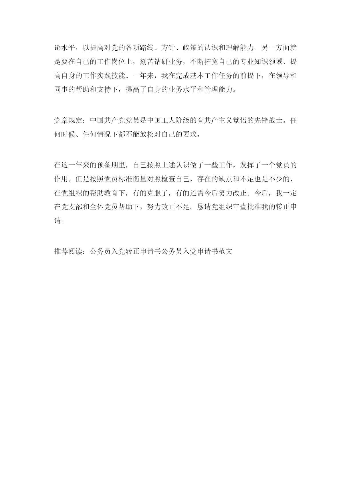 基层公务员入党转正申请书下面是由免费范文网整理的基层公务员入党转正申请书,欢迎阅读。我是2014年2月2日被批准为预备党员的,到2015年2月1日预备期满。现在我郑重向党组织提交转正申请。自从被批准成为预备党员以来,在党组织的严格要求和支部党员的热情帮助下,并经过自己的不懈努力,在政治思想方面有了较大的转变和提高。特别是通过参加组织生活和各种党内活动,学到了党的光荣传统和作风,加深了对党的宗旨的认识,增强了党性,进一步认识到做一个合格的共产党员的要求,不仅要解决组织上入党的问题,更重要的还是解决思想上入党的问题。一年来,收获很大,现向组织汇报如下:入党后,经过一年来党的教育,我认识到“远大理想”“奋斗终身的精神”一定要与自己的现实生活、实际工作紧密结合起来才能体现其实际意义,尤其在和平时期“远大理想”“奋斗终身的精神”更多地体现在本职工作中勇于承担任务,不畏艰难、尽职尽则,在困难关头和关键时刻不退缩,踏踏实实地努力工作是为共产主义事业奋斗终身的最好实践。一年来,我在实际工作中勤恳敬业,勇挑重担,克服了许多困难,承担了大量外出工作任务,圆满完成了各项工作,在实际工作中得到了锻炼、考验和提高。作为一名共产党员必须自觉地同党中央保持一致,政治上要敏感。为此,我积极参加党课学习和党支部组织的有关活动,认真学习、领会党的精神、方针、政策。我作为一名公务员和预备党员,认真学习了老一辈共产党员和新时代模范党员的先进事迹,并以他们为榜样,自觉按照单位对当前工作的统一部署,坚守工作岗位,尽职尽责做好本职工作。工作之余主动关心同志,注意在广大群众中做好预防宣传和思想工作,争做维护大局的模范,争做遵纪守法的模范。作为服务工作人员,提高为人民服务本领,一方面是要不断提高自身的政治理论水平,以提高对党的各项路线、方针、政策的认识和理解能力。另一方面就是要在自己的工作岗位上,刻苦钻研业务,不断拓宽自己的专业知识领域、提高自身的工作实践技能。一年来,我在完成基本工作任务的前提下,在领导和同事的帮助和支持下,提高了自身的业务水平和管理能力。党章规定:中国共产党党员是中国工人阶级的有共产主义觉悟的先锋战士。任何时候、任何情况下都不能放松对自己的要求。在这一年来的预备期里,自己按照上述认识做了一些工作,发挥了一个党员的作用。但是按照党员标准衡量对照检查自己,存在的缺点和不足也是不少的,在党组织的帮助教育下,有的克服了,有的还需今后努力改正。今后,我一定在党支部和全体党员帮助下,努力改正不足。恳请党组织审查批准我的转正申请。推荐阅读:公务员入党转正申请书公务员入党申请书范文
