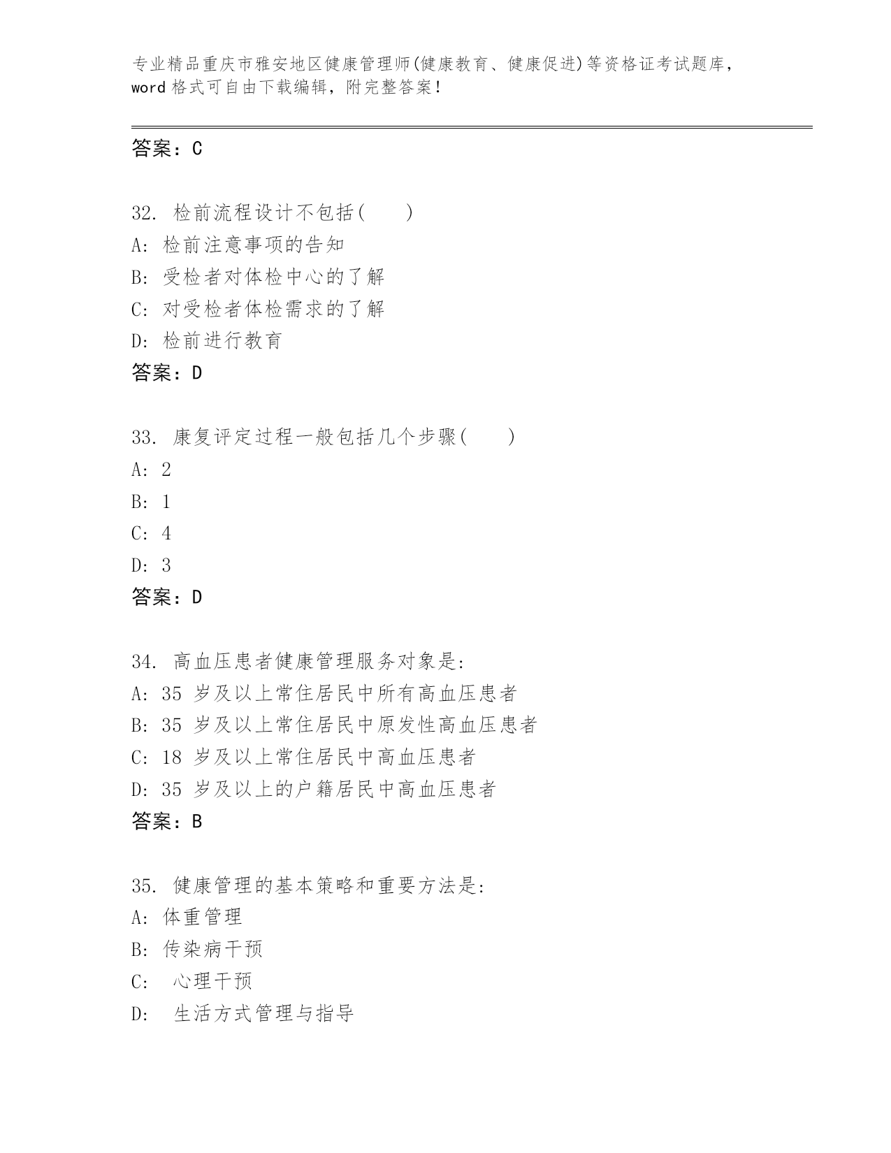 重庆市雅安地区健康管理师(健康教育、健康促进)等资格证考试王牌题库及答案【考点梳理】.docx