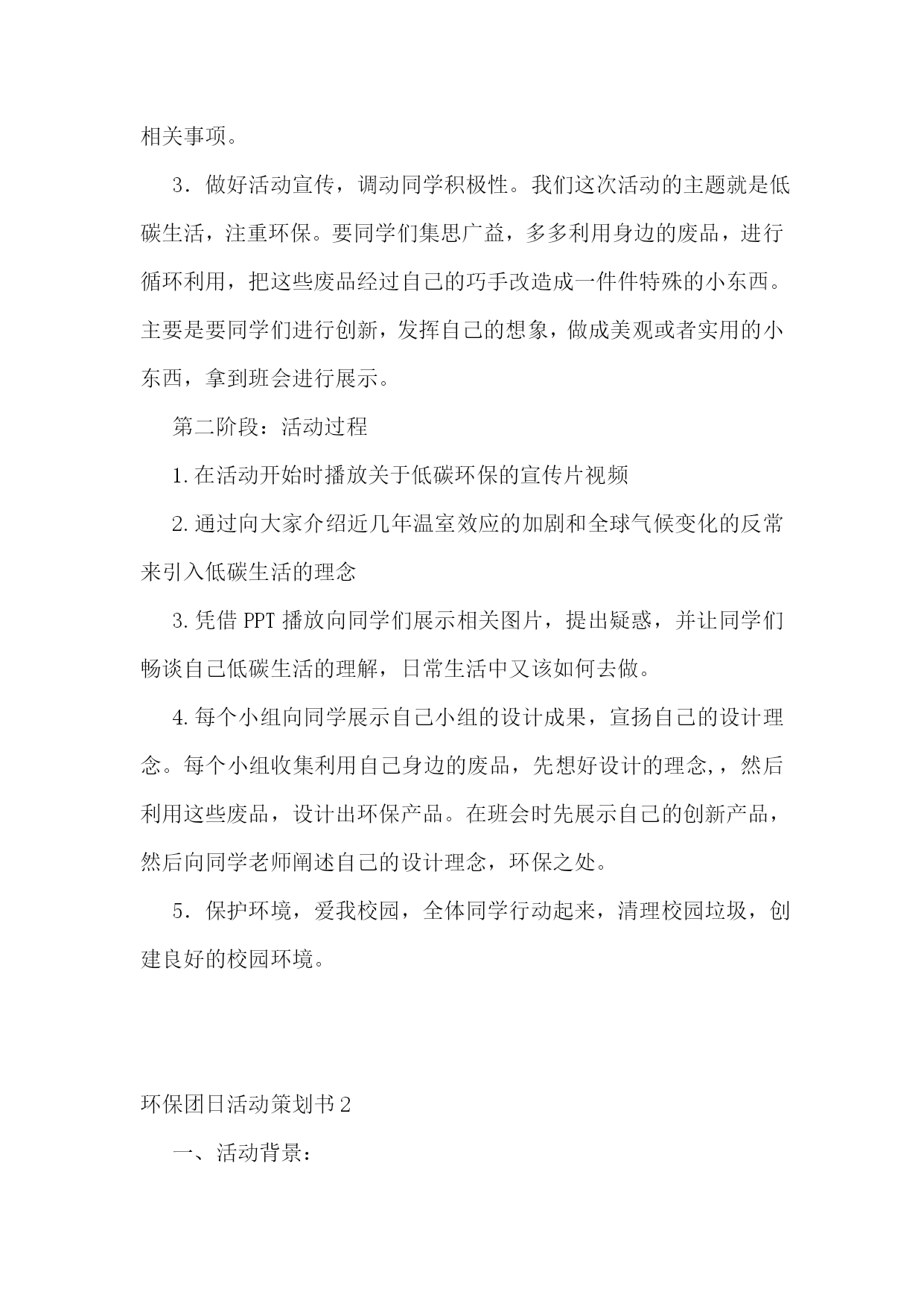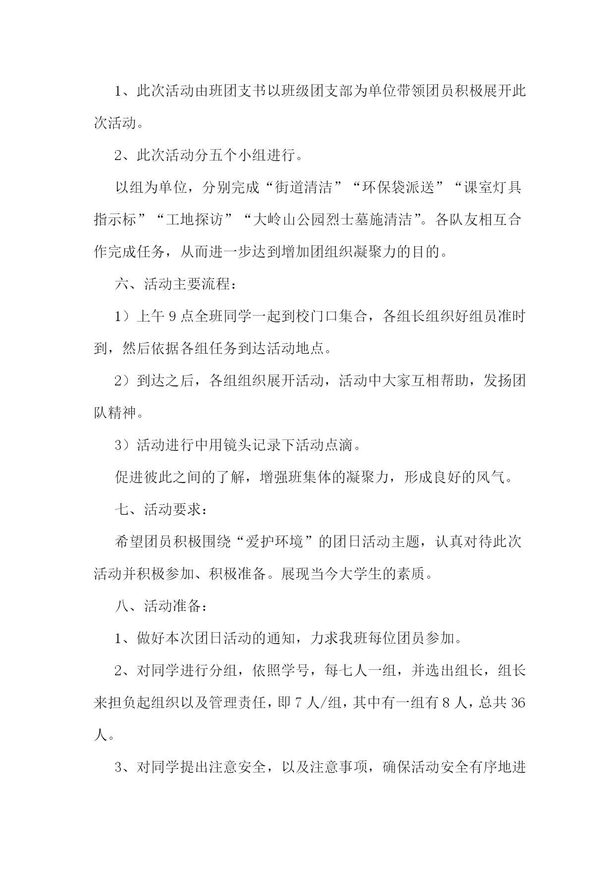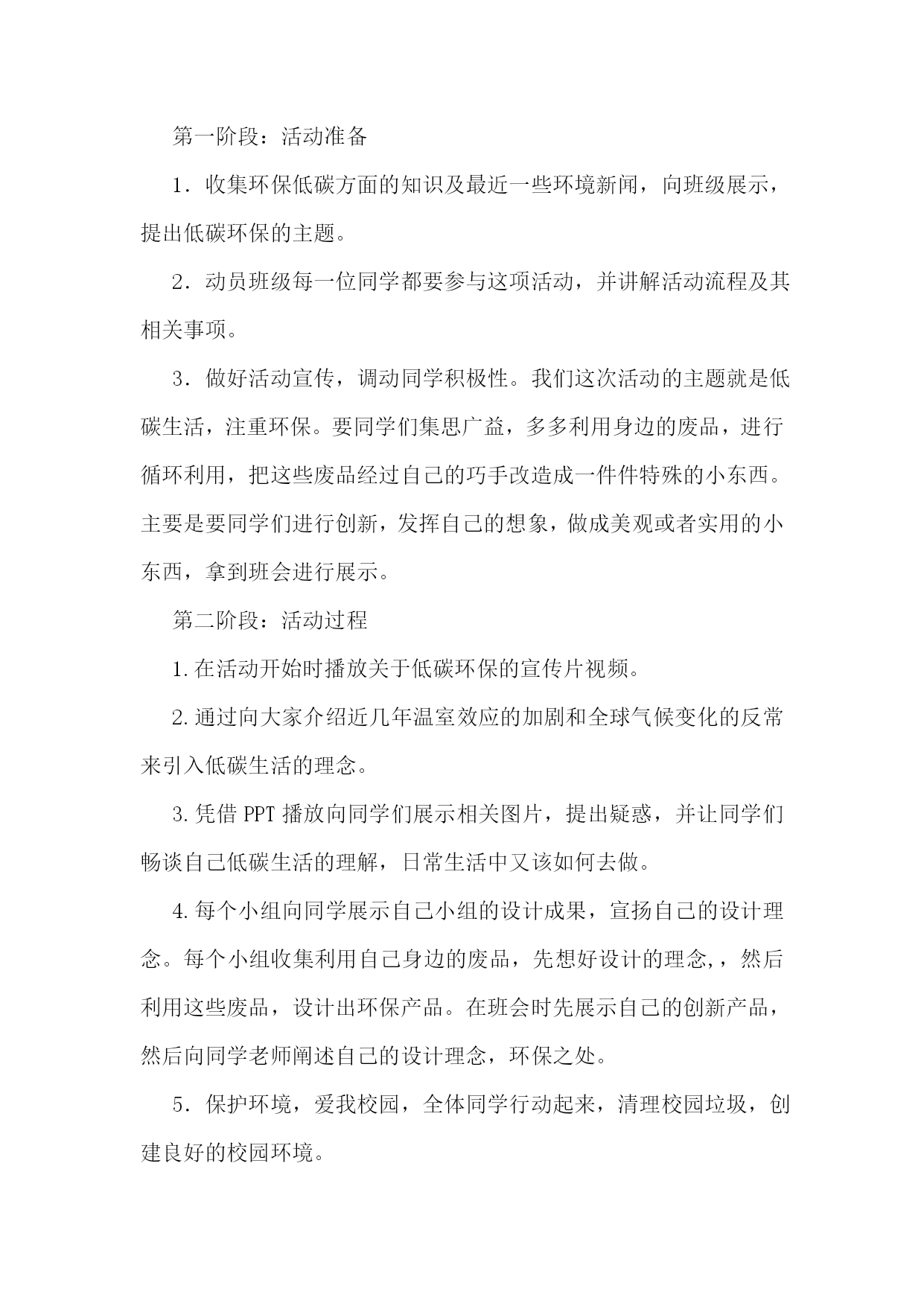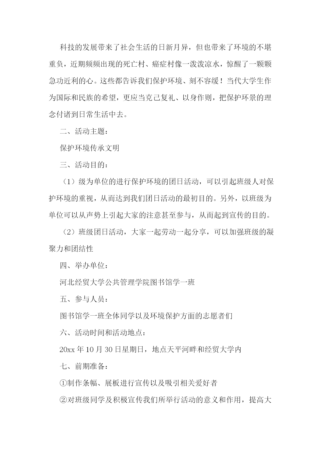 环保团日活动策划书环保团日活动策划书1低碳环保中队活动策划书前言低碳生活(low-carbonlife)减少二氧化碳的排放,就是低能量、低消耗、低开支的生活。“节能减排”,不仅是当今社会的流行语,更是关系到人类未来的战略选择。提升“节能减排”意识,对自己的生活方式或者消费习惯进行简单易行的改变,一起减少全球温室气体(主要是减少二氧化碳)排放,意义十分重大。“低碳生活”节能环保,有利于减缓全球气候变暖和环境恶化的速度,势在必行。减少二氧化碳排放,选择“低碳生活”,是每位公民应尽的责任。活动主题:“低碳与环保”活动时间:20xx年12月2日活动对象:三(2)班活动目的:让同学们懂得什么是“低碳”,什么是“低碳生活”,最重要的是实现“生活的低碳”活动流程:第一阶段:活动准备1.收集环保低碳方面的知识及最近一些环境新闻,向班级展示,提出低碳环保的主题。2.动员班级每一位同学都要参与这项活动,并讲解活动流程及其相关事项。3.做好活动宣传,调动同学积极性。我们这次活动的主题就是低碳生活,注重环保。要同学们集思广益,多多利用身边的废品,进行循环利用,把这些废品经过自己的巧手改造成一件件特殊的小东西。主要是要同学们进行创新,发挥自己的想象,做成美观或者实用的小东西,拿到班会进行展示。第二阶段:活动过程1.在活动开始时播放关于低碳环保的宣传片视频2.通过向大家介绍近几年温室效应的加剧和全球气候变化的反常来引入低碳生活的理念3.凭借PPT播放向同学们展示相关图片,提出疑惑,并让同学们畅谈自己低碳生活的理解,日常生活中又该如何去做。4.每个小组向同学展示自己小组的设计成果,宣扬自己的设计理念。每个小组收集利用自己身边的废品,先想好设计的理念,,然后利用这些废品,设计出环保产品。在班会时先展示自己的创新产品,然后向同学老师阐述自己的设计理念,环保之处。5.保护环境,爱我校园,全体同学行动起来,清理校园垃圾,创建良好的校园环境。环保团日活动策划书2一、活动背景:科技的发展带来了社会生活的日新月异,但也带来了环境的不堪重负,近期频频出现的死亡村、癌症村像一泼泼凉水,惊醒了一颗颗急功近利的心。这些都告诉我们保护环境、刻不容缓!当代大学生作为国际和民族的希望,更应当克己复礼、以身作则,把保护环景的理念付诸到日常生活中去。二、活动主题:保护环境传承文明三、活动目的:(1)级为单位的进行保护环境的团日活动,可以引起班级人对保护环境的重视,从而达到我们团日活动的最初目的。另外,以班级为单位可以从声势上引起大家的注意甚至参与,从而起到宣传的目的。(2)班级团日活动,大家一起劳动一起分享,可以加强班级的凝聚力和团结性四、举办单位:河北经贸大学公共管理学院图书馆学一班五、参与人员:图书馆学一班全体同学以及环境保护方面的志愿者们六、活动时间和活动地点:20xx年10月30日星期日,地点天平河畔和经贸大学内七、前期准备:①制作条幅、展板进行宣传以及吸引相关爱好者②对班级同学及积极宣传我们所举行活动的意义和作用,提高大家参与的积极性③活动期间会穿插一些趣味活动,放松身心,所以需要提前进行准备,如烧烤、放风筝等④对活动物品进行采购,如手套、大型塑料袋、水等⑤对活动期间的安全要进行着重强调八、活动流程8:00一部分人准时集合出发去河边,(元旦晚会策划书)一部分人留在校内宣传9:00~12;00收集护城河畔左右的垃圾、并向周围小贩小商们提议尽量不要向客人们提供塑料袋等12;00~14:00进行集合和集体午餐及游戏14:00~16;00继续进行清理垃圾活动九、活动经费:宣传费:条幅、统一的帽子工作费:大型塑料袋、水活动费:烧烤的费用、风筝十、注意事项:1、活动期间要注意安全,毕竟我们的活动是在水边举行2、采购食物的时候,注意食物的质量,保证食品安全3、注意活动的质量和活动的效果及宣传作用十一、活动的后期延续:做好后期的报告和宣传工作,使得保护环境的理念得以在全校推广和传播,是大家的环保意识得以提高。环保团日活动策划书3一、前言低碳生活(low-carbonlife)减少二氧化碳的排放,就是低能量、低消耗、低开支的生活。“节能减排”,不仅是当今社会的流行语,更是关系到人类未来的战略选择。提升“节能减排”意识,对自己的生活方式或者消费习惯进行简单易行的改变,一起减少全球温室气体(主要是减少二氧化碳)排放,意义十分重大。“低碳生活”节能环保,有利于减缓全球气候变暖和环境恶化的速度,势在必行。减少二氧化碳排放,选择“低碳生活”,是每位公民应尽的责任。二、活动主题:“低碳与环保。”三、活动时间20xx年12月2日四、活动对象:三(2)班五、活动目的:让同学