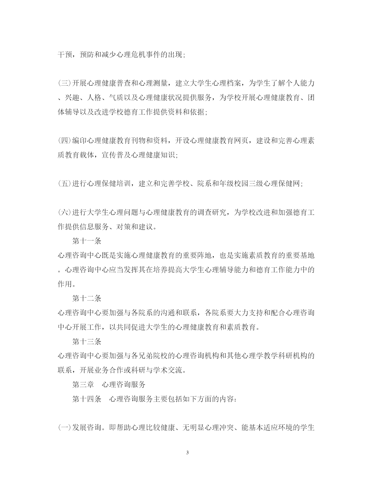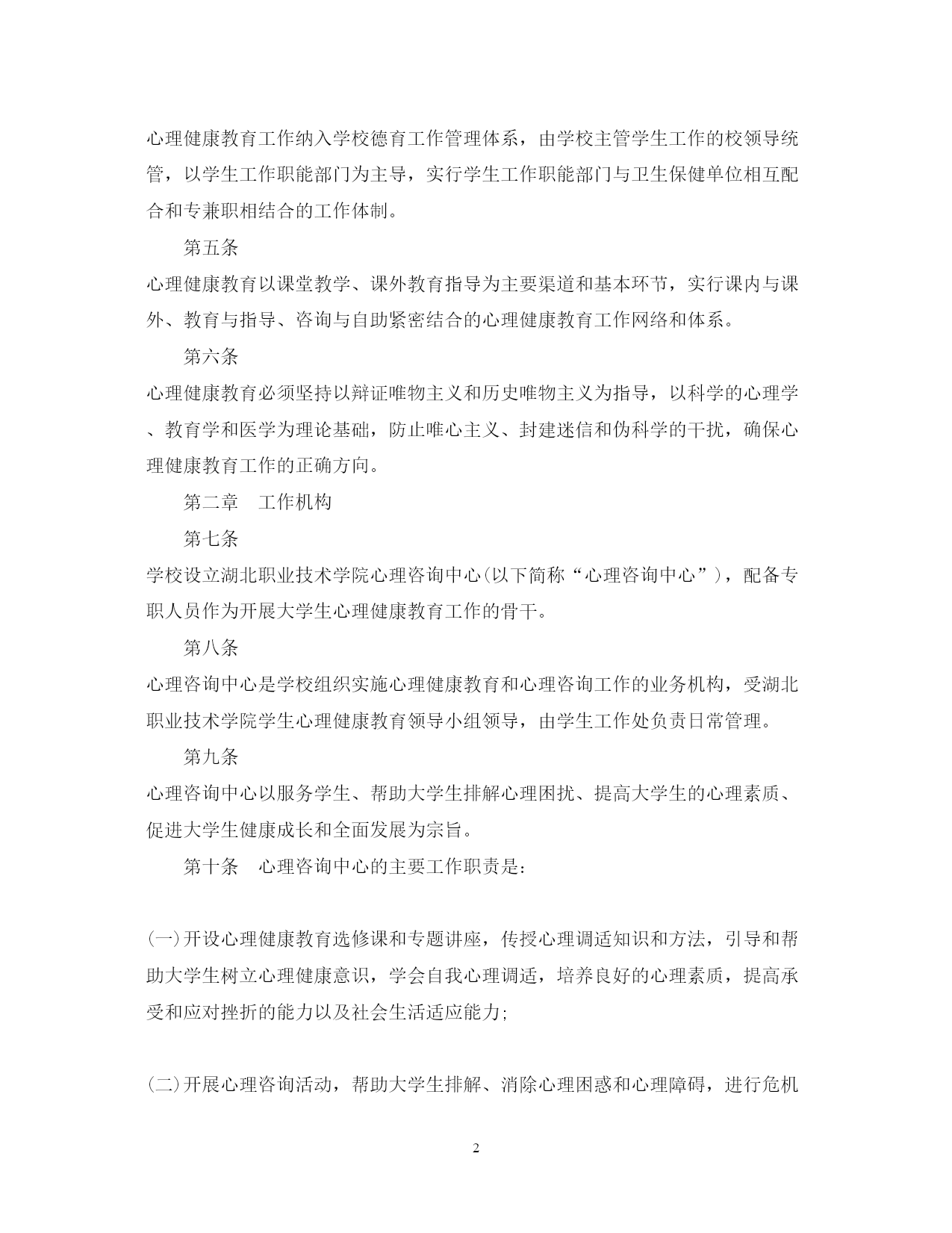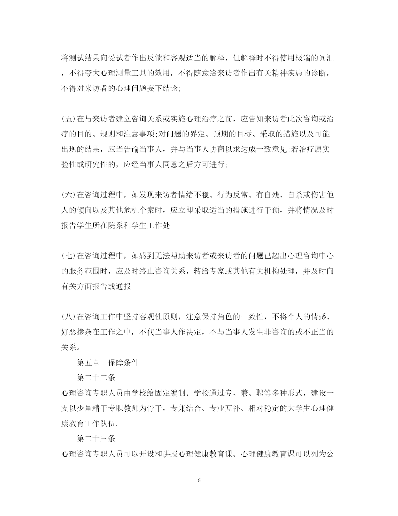 此资料由网络收集而来,如有侵权请告知上传者立即删除。资料共分享,我们负责传递知识。PAGEPAGE7心理健康教育和咨询的暂行办法第一章总则第一条为加强大学生心理健康教育,改进学校德育工作,全面推进素质教育,促进学校心理咨询工作的规范化、专业化和科学化,根据教育部办公厅教社政厅[2019]2号和湖北省教育厅鄂教思政[2019]1号文件,结合我校实际制定本规定。第二条大学生心理健康教育是学校德育工作的重要组成部分,是实施素质教育的重要措施,是促进大学生全面发展、提高人才培养质量的重要途径和手段,各级领导、各个院系、学生工作职能部门和广大教师都应重视并支持该项工作。第三条心理健康教育工作的主要任务是:认真贯彻教育部关于加强高校大学生心理健康教育工作的有关文件精神,建立健全学校心理教育机构;加强教师队伍培训,提高师资的基础理论知识和专业技能;建立心理健康大学生心理咨询中心,设立健康档案;通过举办心理健康知识讲座、团体训练、学习辅导、个别咨询等方式,为学生提供心理健康指导与服务;根据大学生各个阶段遇到的适应、交往、成才、情感、择业等方面的实际问题和困扰,组织编写大学生了解自己、科学认识自己,帮助大学生进行心理调适;在心理辅导咨询中,如发现有严重心理障碍和心理疾病的学生,要及时将他们转介到专业卫生机构治疗。要加强校医院卫生人员防治心理疾病的专业培训,提高他们预防和处置心理疾病的能力。对患有严重心理疾病经专业机构治疗过后返校继续学习的学生,要特别加强心理跟踪服务的工作,派专人与他们保持联系,及时发现和解决有关情况和问题。在充分发挥心理健康教育师资队伍作用的同时,要热情关心心理健康师资队伍的培养和提高,解决有关工作场地、经费投入等问题,为开展工作创造有利条件。第四条心理健康教育工作纳入学校德育工作管理体系,由学校主管学生工作的校领导统管,以学生工作职能部门为主导,实行学生工作职能部门与卫生保健单位相互配合和专兼职相结合的工作体制。第五条心理健康教育以课堂教学、课外教育指导为主要渠道和基本环节,实行课内与课外、教育与指导、咨询与自助紧密结合的心理健康教育工作网络和体系。第六条心理健康教育必须坚持以辩证唯物主义和历史唯物主义为指导,以科学的心理学、教育学和医学为理论基础,防止唯心主义、封建迷信和伪科学的干扰,确保心理健康教育工作的正确方向。第二章工作机构第七条学校设立湖北职业技术学院心理咨询中心(以下简称“心理咨询中心”),配备专职人员作为开展大学生心理健康教育工作的骨干。第八条心理咨询中心是学校组织实施心理健康教育和心理咨询工作的业务机构,受湖北职业技术学院学生心理健康教育领导小组领导,由学生工作处负责日常管理。第九条心理咨询中心以服务学生、帮助大学生排解心理困扰、提高大学生的心理素质、促进大学生健康成长和全面发展为宗旨。第十条心理咨询中心的主要工作职责是:(一)开设心理健康教育选修课和专题讲座,传授心理调适知识和方法,引导和帮助大学生树立心理健康意识,学会自我心理调适,培养良好的心理素质,提高承受和应对挫折的能力以及社会生活适应能力;(二)开展心理咨询活动,帮助大学生排解、消除心理困惑和心理障碍,进行危机干预,预防和减少心理危机事件的出现;(三)开展心理健康普查和心理测量,建立大学生心理档案,为学生了解个人能力、兴趣、人格、气质以及心理健康状况提供服务,为学校开展心理健康教育、团体辅导以及改进学校德育工作提供资料和依据;(四)编印心理健康教育刊物和资料,开设心理健康教育网页,建设和完善心理素质教育载体,宣传普及心理健康知识;(五)进行心理保健培训,建立和完善学校、院系和年级校园三级心理保健网;(六)进行大学生心理问题与心理健康教育的调查研究,为学校改进和加强德育工作提供信息服务、对策和建议。第十一条心理咨询中心既是实施心理健康教育的重要阵地,也是实施素质教育的重要基地。心理咨询中心应当发挥其在培养提高大学生心理辅导能力和德育工作能力中的作用。第十二条心理咨询中心要加强与各院系的沟通和联系,各院系要大力支持和配合心理咨询中心开展工作,以共同促进大学生的心理健康教育和素质教育。第十三条心理咨询中心要加强与各兄弟院校的心理咨询机构和其他心理学教学科研机构的联系,开展业务合作或科研与学术交流。第三章心理咨询服务第十四条心理咨询服务主要包括如下方面的内容:(一)发展咨询。即帮助心理比较健康、无明显心理冲突、能基本适应环境的学生更好地认识自我和开发潜能,提高学习和生活质量,以获得更完善的发展;(二)适应咨询。即帮助心理比较健康、但在学习生活中存在各种烦恼和心理矛盾的学生解除困扰,减轻压力,改善和提高适应能力;(三)障碍咨询。即帮助有心理障碍或心理疾病的学生克服障碍,缓解症状,恢复