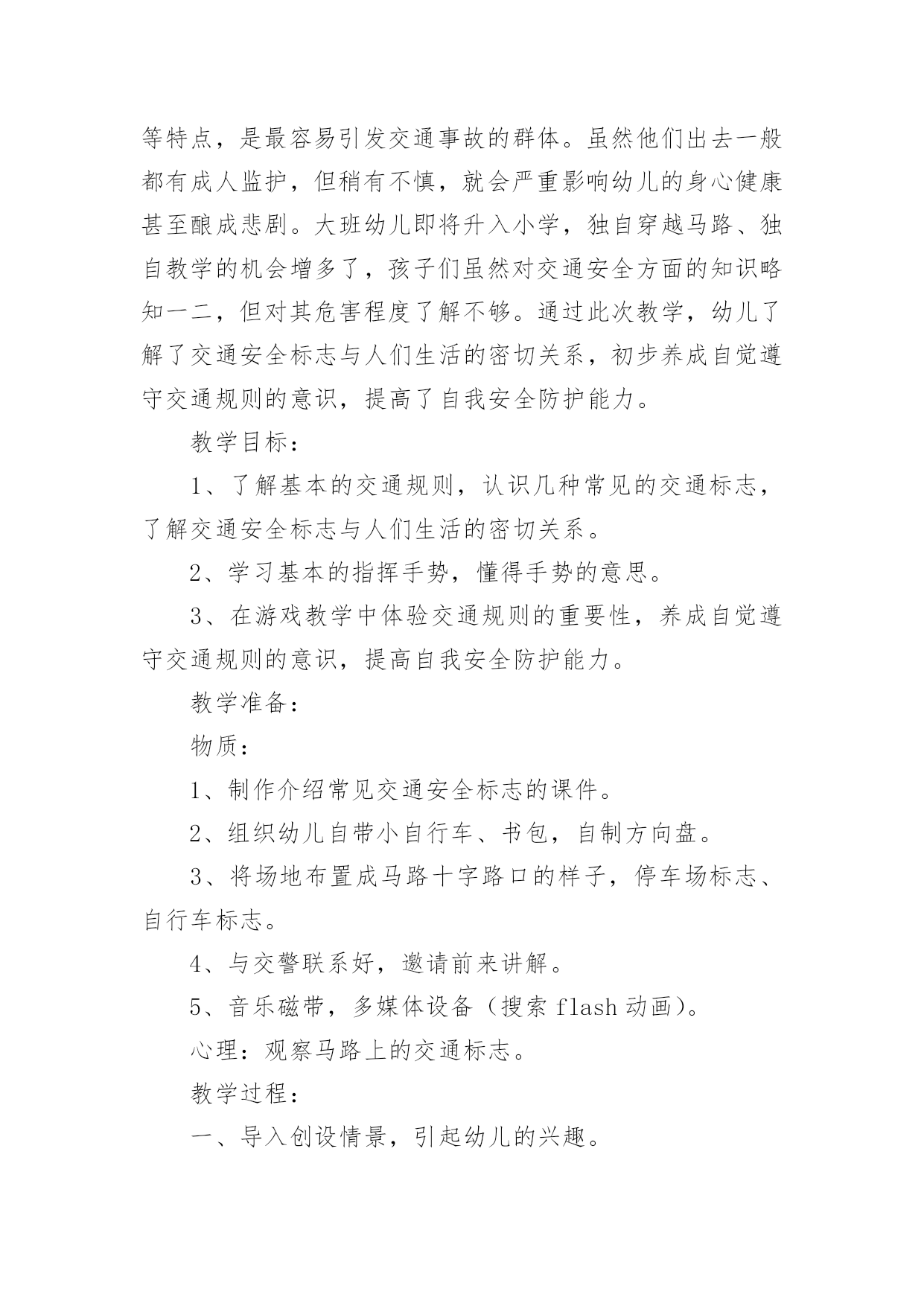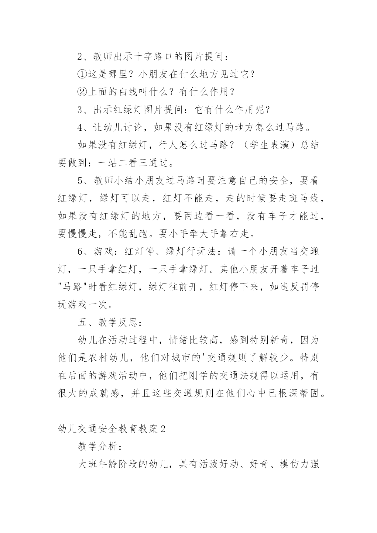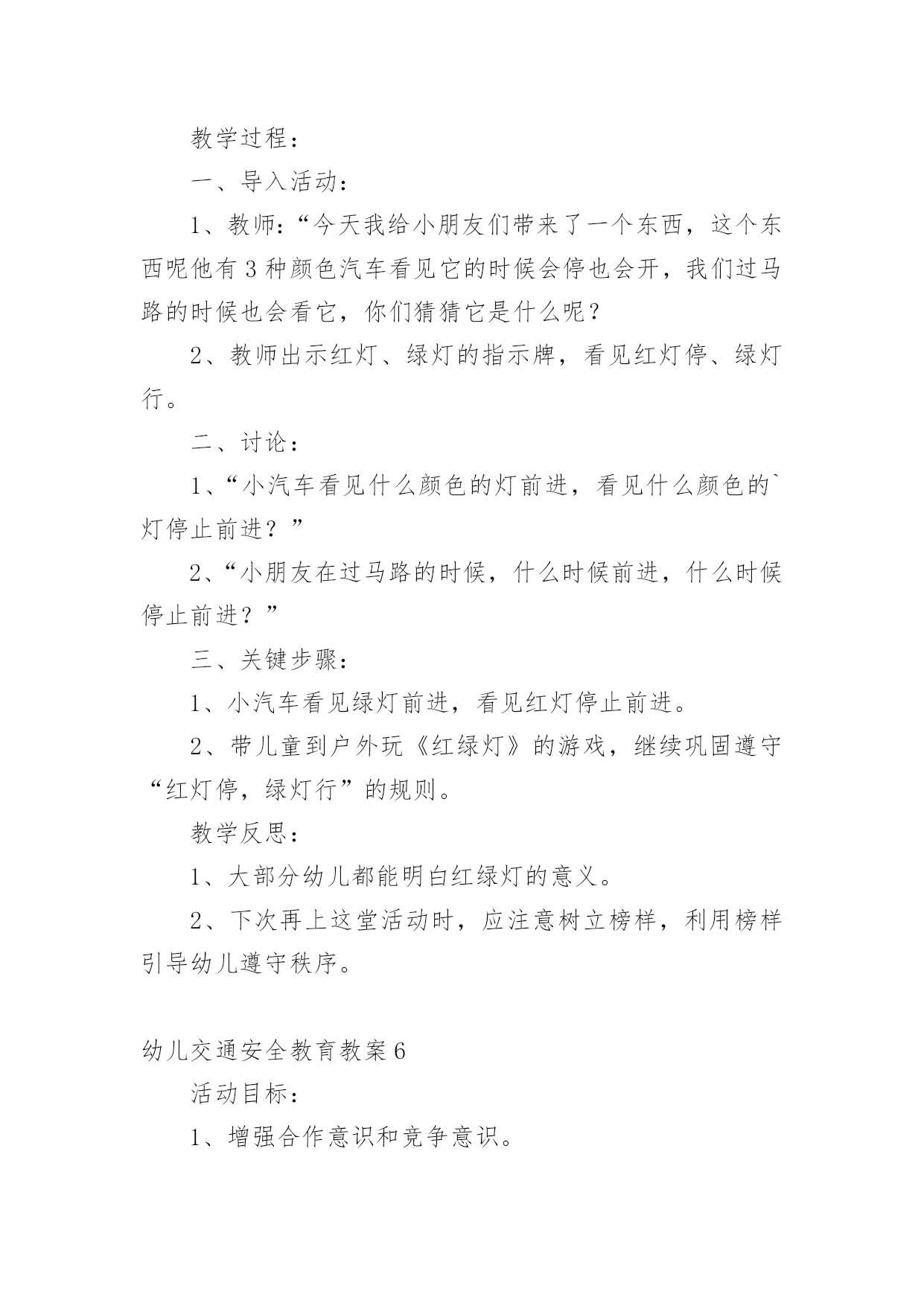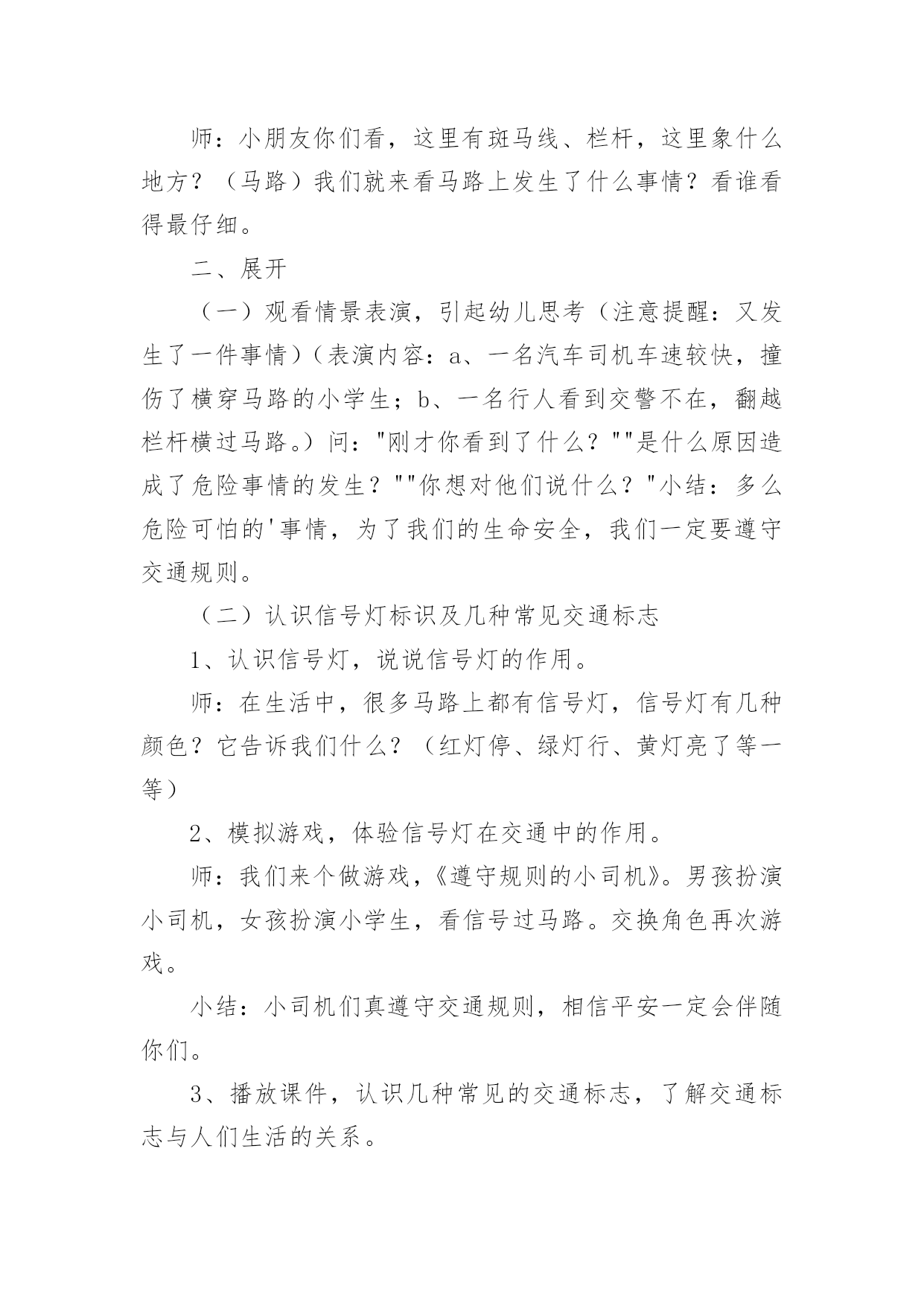 幼儿交通安全教育教案在教学工作者开展教学活动前,就难以避免地要准备教案,教案是教学活动的总的组织纲领和行动方案。来参考自己需要的教案吧!以下是小编精心整理的幼儿交通安全教育教案,仅供参考,欢迎大家阅读。幼儿交通安全教育教案1一、活动目标:1、了解一些基本的交通安全知识,知道红灯停、绿灯行的道理。2、知道过马路时要注意自己的安全。3、不走斑马线会肇成事故的危险性。二、活动重点:形象地感知交通常识——过马路要小心走斑马线,红灯停,绿灯行。三、活动难点:日常生活中,较自觉地遵守交通规则。四、活动准备:红绿灯图片、画有十字路口(有斑马线)的图片活动过程:1、出示发生车祸图片,请幼儿观看。幼儿讨论,为什么会发生交通事故呢?(幼儿回答,主要原因是不遵守交通规则)引出主题。2、教师出示十字路口的图片提问:①这是哪里?小朋友在什么地方见过它?②上面的白线叫什么?有什么作用?3、出示红绿灯图片提问:它有什么作用呢?4、让幼儿讨论,如果没有红绿灯的地方怎么过马路。如果没有红绿灯,行人怎么过马路?(学生表演)总结要做到:一站二看三通过。5、教师小结小朋友过马路时要注意自己的安全,要看红绿灯,绿灯可以走,红灯不能走,走的时候要走斑马线,如果没有红绿灯的地方,要两边看一看,没有车子才能过,要慢慢走,不能乱跑。要小手牵大手靠右走。6、游戏:红灯停、绿灯行玩法:请一个小朋友当交通灯,一只手拿红灯,一只手拿绿灯。其他小朋友开着车子过"马路"时看红绿灯,绿灯往前开,红灯停下来,如违反罚停玩游戏一次。五、教学反思:幼儿在活动过程中,情绪比较高,感到特别新奇,因为他们是农村幼儿,他们对城市的'交通规则了解较少。特别在后面的游戏活动中,他们把刚学的交通法规得以运用,有很大的成就感,并且这些交通规则在他们心中已根深蒂固。幼儿交通安全教育教案2教学分析:大班年龄阶段的幼儿,具有活泼好动、好奇、模仿力强等特点,是最容易引发交通事故的群体。虽然他们出去一般都有成人监护,但稍有不慎,就会严重影响幼儿的身心健康甚至酿成悲剧。大班幼儿即将升入小学,独自穿越马路、独自教学的机会增多了,孩子们虽然对交通安全方面的知识略知一二,但对其危害程度了解不够。通过此次教学,幼儿了解了交通安全标志与人们生活的密切关系,初步养成自觉遵守交通规则的意识,提高了自我安全防护能力。教学目标:1、了解基本的交通规则,认识几种常见的交通标志,了解交通安全标志与人们生活的密切关系。2、学习基本的指挥手势,懂得手势的意思。3、在游戏教学中体验交通规则的重要性,养成自觉遵守交通规则的意识,提高自我安全防护能力。教学准备:物质:1、制作介绍常见交通安全标志的课件。2、组织幼儿自带小自行车、书包,自制方向盘。3、将场地布置成马路十字路口的样子,停车场标志、自行车标志。4、与交警联系好,邀请前来讲解。5、音乐磁带,多媒体设备(搜索flash动画)。心理:观察马路上的交通标志。教学过程:一、导入创设情景,引起幼儿的兴趣。师:小朋友你们看,这里有斑马线、栏杆,这里象什么地方?(马路)我们就来看马路上发生了什么事情?看谁看得最仔细。二、展开(一)观看情景表演,引起幼儿思考(注意提醒:又发生了一件事情)(表演内容:a、一名汽车司机车速较快,撞伤了横穿马路的小学生;b、一名行人看到交警不在,翻越栏杆横过马路。)问:"刚才你看到了什么?""是什么原因造成了危险事情的发生?""你想对他们说什么?"小结:多么危险可怕的'事情,为了我们的生命安全,我们一定要遵守交通规则。(二)认识信号灯标识及几种常见交通标志1、认识信号灯,说说信号灯的作用。师:在生活中,很多马路上都有信号灯,信号灯有几种颜色?它告诉我们什么?(红灯停、绿灯行、黄灯亮了等一等)2、模拟游戏,体验信号灯在交通中的作用。师:我们来个做游戏,《遵守规则的小司机》。男孩扮演小司机,女孩扮演小学生,看信号过马路。交换角色再次游戏。小结:小司机们真遵守交通规则,相信平安一定会伴随你们。3、播放课件,认识几种常见的交通标志,了解交通标志与人们生活的关系。师:在车辆穿梭的马路上,除了信号灯这个交通标志外,还有很多交通标志。今天刘老师就带来了几种,你们想看吗?根据不同标志,提问不同问题。问:这是什么标志?看到这个标志,我们要怎么做?归纳:⑴指示标志:在蓝底色上画着不同的白色图案,是指示车辆和行人通行的,它们有一个共同的名字叫:指示标志,就告诉人们可以做的事情。⑵禁止标志:在红色圆圈里画着不同画面或符号,有一条明显的红斜线,是禁止车辆和行人通行的,它们共同的名字叫:禁止标志。禁止标志就告诉人们不能做的事情。⑶警示标志:在黄色三角形里画着不同的画面,用来提示人们对某些不安全因素要高度注意,这叫警示标志,警示标志就告诉人们此处危险要注意,要远离。幼儿交通安全教育教案3一、活动目标1.情感目