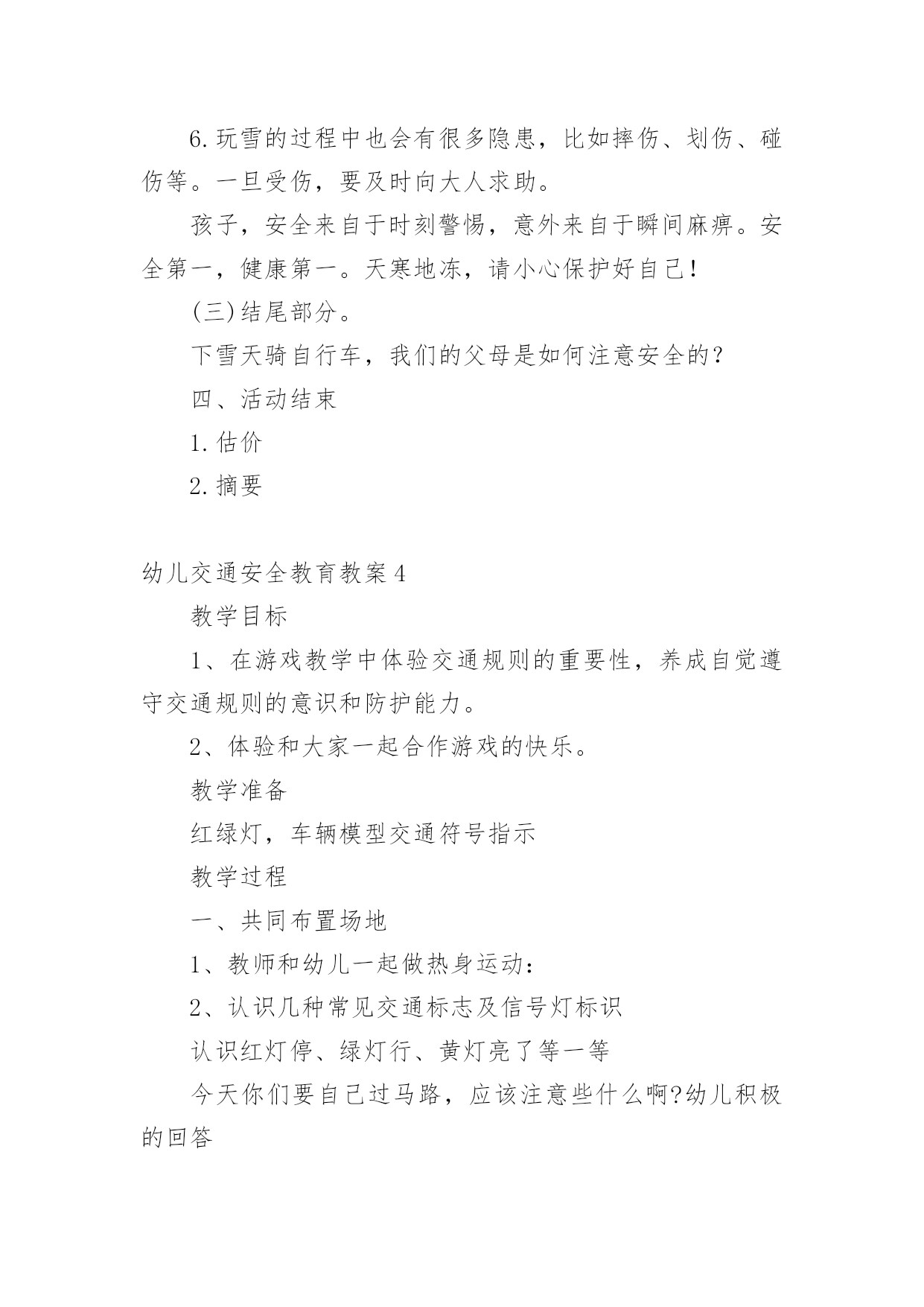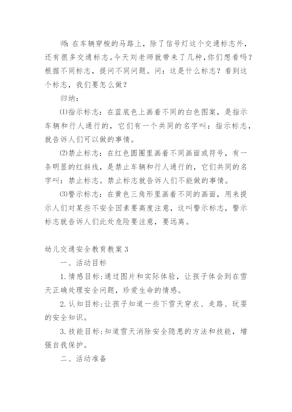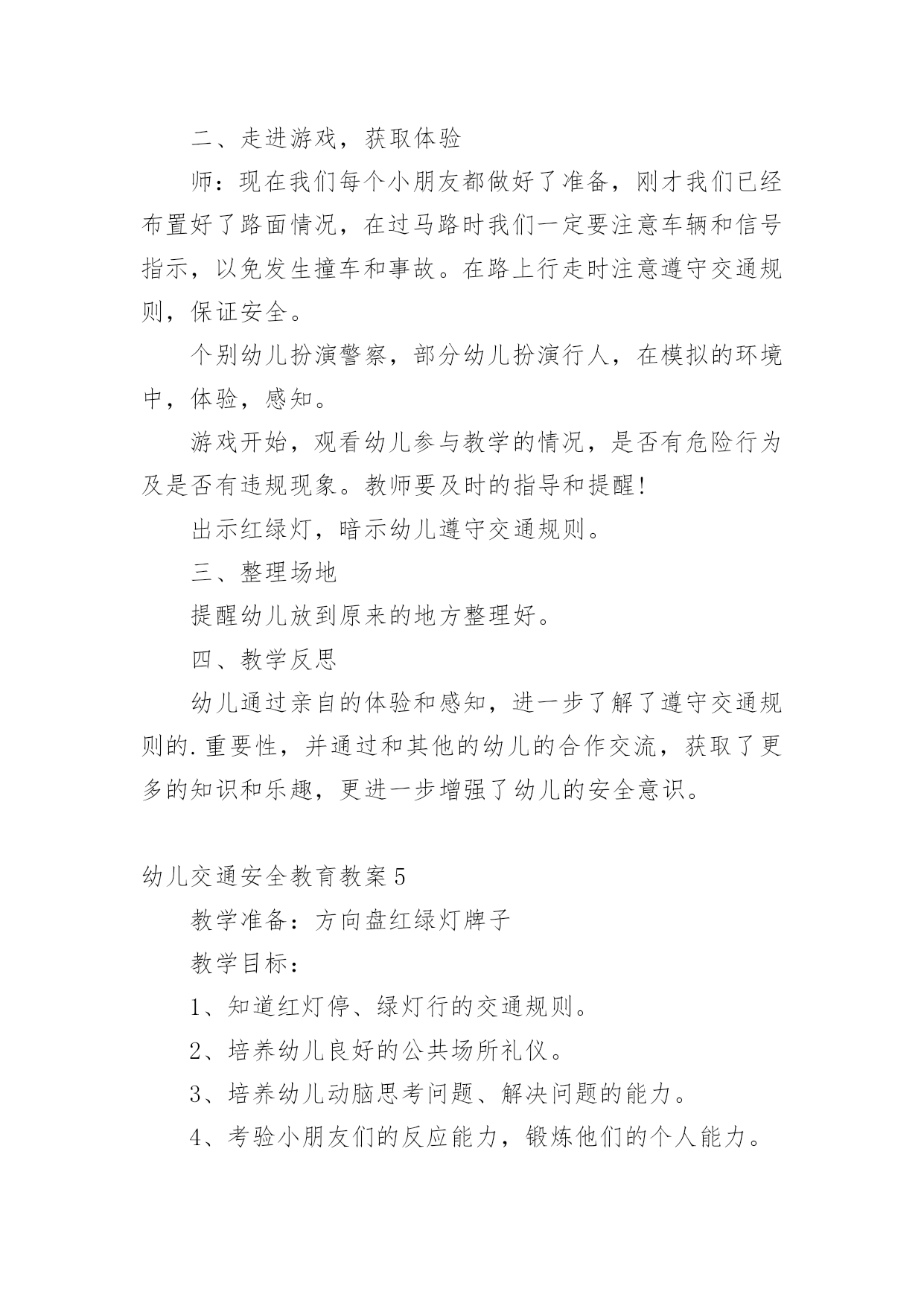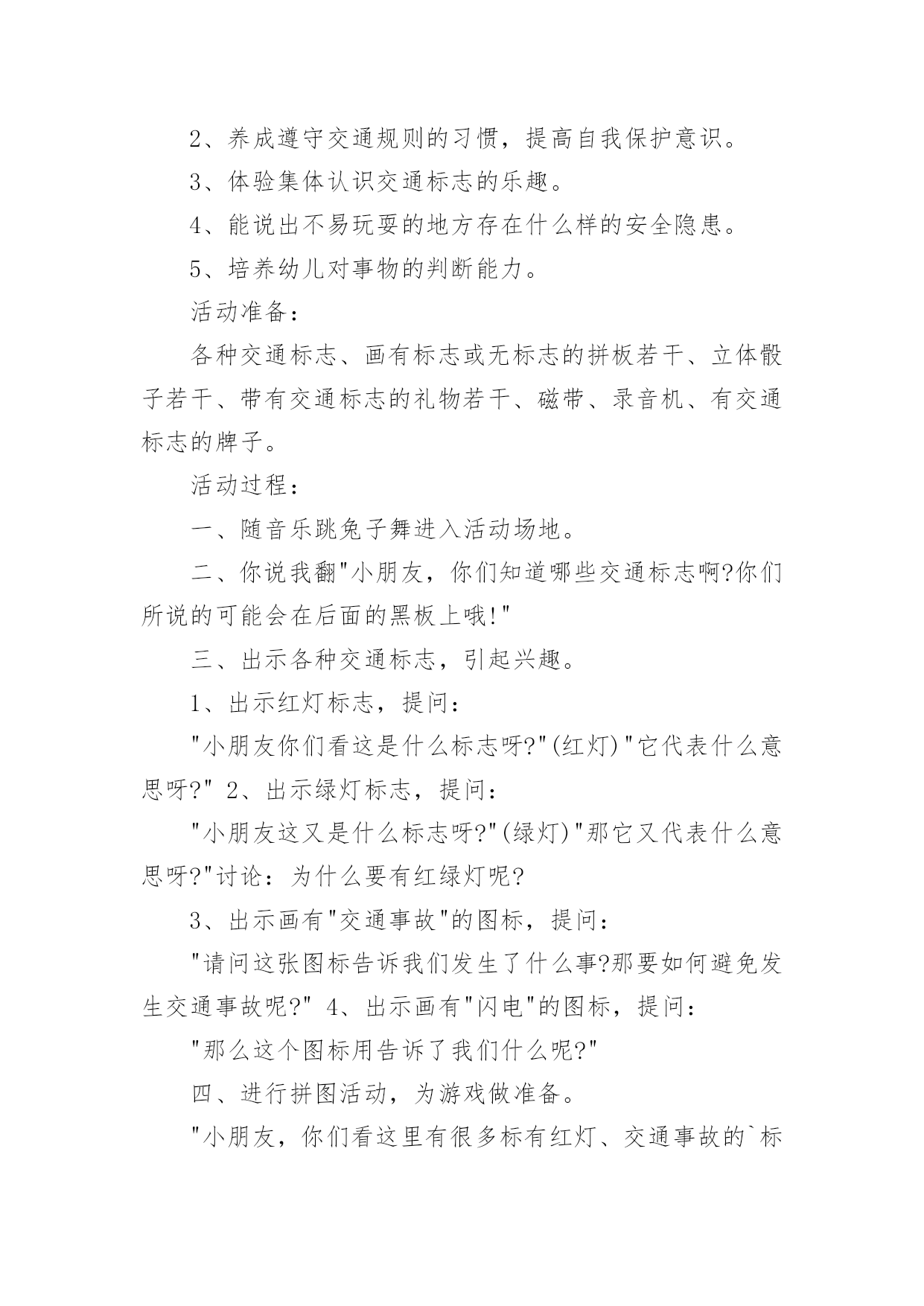 幼儿交通安全教育教案在教学工作者开展教学活动前,就难以避免地要准备教案,教案是教学活动的总的组织纲领和行动方案。来参考自己需要的教案吧!以下是小编精心整理的幼儿交通安全教育教案,仅供参考,欢迎大家阅读。幼儿交通安全教育教案1一、活动目标:1、了解一些基本的交通安全知识,知道红灯停、绿灯行的道理。2、知道过马路时要注意自己的安全。3、不走斑马线会肇成事故的危险性。二、活动重点:形象地感知交通常识——过马路要小心走斑马线,红灯停,绿灯行。三、活动难点:日常生活中,较自觉地遵守交通规则。四、活动准备:红绿灯图片、画有十字路口(有斑马线)的图片活动过程:1、出示发生车祸图片,请幼儿观看。幼儿讨论,为什么会发生交通事故呢?(幼儿回答,主要原因是不遵守交通规则)引出主题。2、教师出示十字路口的图片提问:①这是哪里?小朋友在什么地方见过它?②上面的白线叫什么?有什么作用?3、出示红绿灯图片提问:它有什么作用呢?4、让幼儿讨论,如果没有红绿灯的地方怎么过马路。如果没有红绿灯,行人怎么过马路?(学生表演)总结要做到:一站二看三通过。5、教师小结小朋友过马路时要注意自己的安全,要看红绿灯,绿灯可以走,红灯不能走,走的时候要走斑马线,如果没有红绿灯的地方,要两边看一看,没有车子才能过,要慢慢走,不能乱跑。要小手牵大手靠右走。6、游戏:红灯停、绿灯行玩法:请一个小朋友当交通灯,一只手拿红灯,一只手拿绿灯。其他小朋友开着车子过"马路"时看红绿灯,绿灯往前开,红灯停下来,如违反罚停玩游戏一次。五、教学反思:幼儿在活动过程中,情绪比较高,感到特别新奇,因为他们是农村幼儿,他们对城市的'交通规则了解较少。特别在后面的游戏活动中,他们把刚学的交通法规得以运用,有很大的成就感,并且这些交通规则在他们心中已根深蒂固。幼儿交通安全教育教案2教学分析:大班年龄阶段的幼儿,具有活泼好动、好奇、模仿力强等特点,是最容易引发交通事故的群体。虽然他们出去一般都有成人监护,但稍有不慎,就会严重影响幼儿的身心健康甚至酿成悲剧。大班幼儿即将升入小学,独自穿越马路、独自教学的机会增多了,孩子们虽然对交通安全方面的知识略知一二,但对其危害程度了解不够。通过此次教学,幼儿了解了交通安全标志与人们生活的密切关系,初步养成自觉遵守交通规则的意识,提高了自我安全防护能力。教学目标:1、了解基本的交通规则,认识几种常见的交通标志,了解交通安全标志与人们生活的密切关系。2、学习基本的指挥手势,懂得手势的意思。3、在游戏教学中体验交通规则的重要性,养成自觉遵守交通规则的意识,提高自我安全防护能力。教学准备:物质:1、制作介绍常见交通安全标志的课件。2、组织幼儿自带小自行车、书包,自制方向盘。3、将场地布置成马路十字路口的样子,停车场标志、自行车标志。4、与交警联系好,邀请前来讲解。5、音乐磁带,多媒体设备(搜索flash动画)。心理:观察马路上的交通标志。教学过程:一、导入创设情景,引起幼儿的兴趣。师:小朋友你们看,这里有斑马线、栏杆,这里象什么地方?(马路)我们就来看马路上发生了什么事情?看谁看得最仔细。二、展开(一)观看情景表演,引起幼儿思考(注意提醒:又发生了一件事情)(表演内容:a、一名汽车司机车速较快,撞伤了横穿马路的小学生;b、一名行人看到交警不在,翻越栏杆横过马路。)问:"刚才你看到了什么?""是什么原因造成了危险事情的发生?""你想对他们说什么?"小结:多么危险可怕的'事情,为了我们的生命安全,我们一定要遵守交通规则。(二)认识信号灯标识及几种常见交通标志1、认识信号灯,说说信号灯的作用。师:在生活中,很多马路上都有信号灯,信号灯有几种颜色?它告诉我们什么?(红灯停、绿灯行、黄灯亮了等一等)2、模拟游戏,体验信号灯在交通中的作用。师:我们来个做游戏,《遵守规则的小司机》。男孩扮演小司机,女孩扮演小学生,看信号过马路。交换角色再次游戏。小结:小司机们真遵守交通规则,相信平安一定会伴随你们。3、播放课件,认识几种常见的交通标志,了解交通标志与人们生活的关系。师:在车辆穿梭的马路上,除了信号灯这个交通标志外,还有很多交通标志。今天刘老师就带来了几种,你们想看吗?根据不同标志,提问不同问题。问:这是什么标志?看到这个标志,我们要怎么做?归纳:⑴指示标志:在蓝底色上画着不同的白色图案,是指示车辆和行人通行的,它们有一个共同的名字叫:指示标志,就告诉人们可以做的事情。⑵禁止标志:在红色圆圈里画着不同画面或符号,有一条明显的红斜线,是禁止车辆和行人通行的,它们共同的名字叫:禁止标志。禁止标志就告诉人们不能做的事情。⑶警示标志:在黄色三角形里画着不同的画面,用来提示人们对某些不安全因素要高度注意,这叫警示标志,警示标志就告诉人们此处危险要注意,要远离。幼儿交通安全教育教案3一、活动目标1.情感目