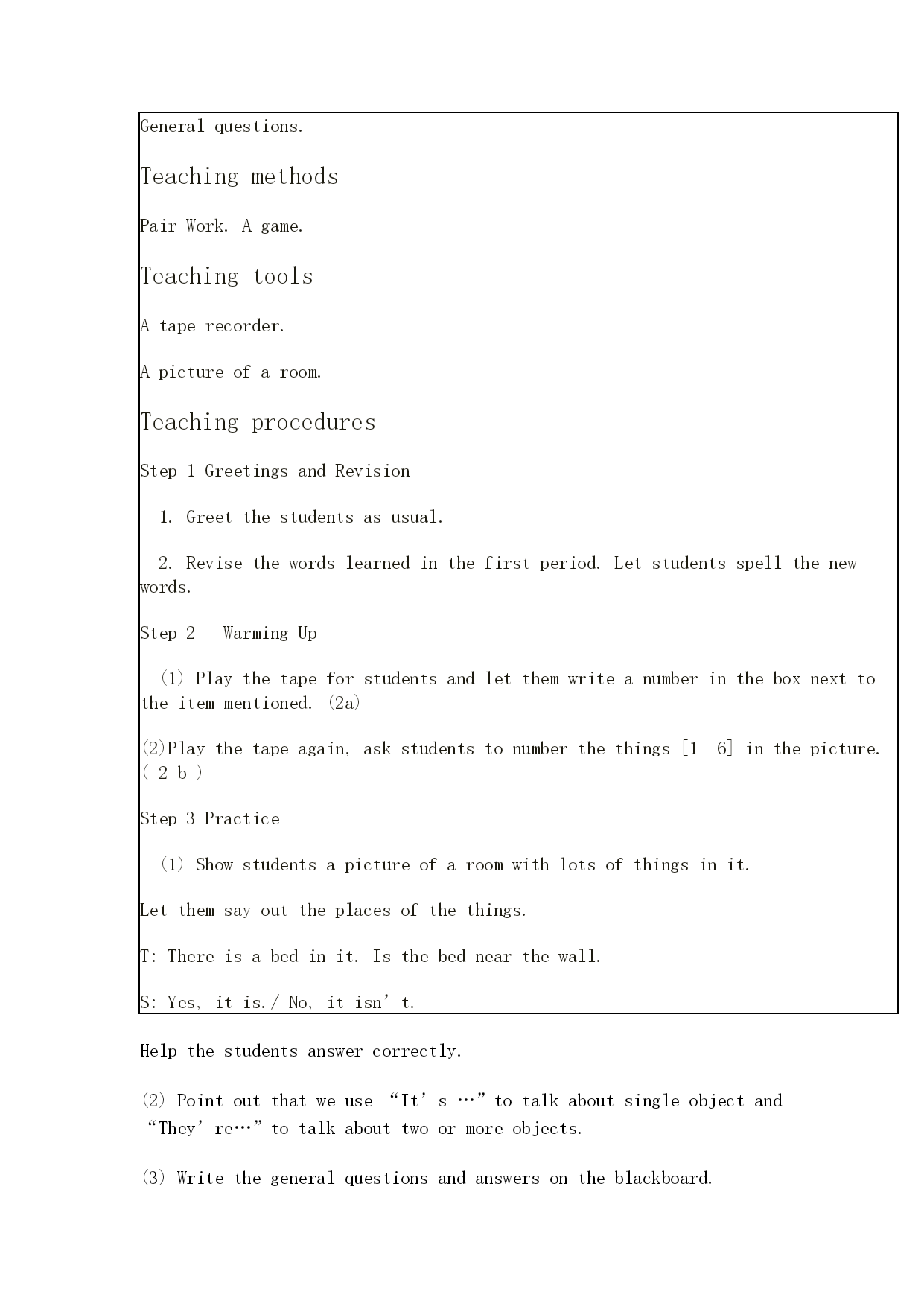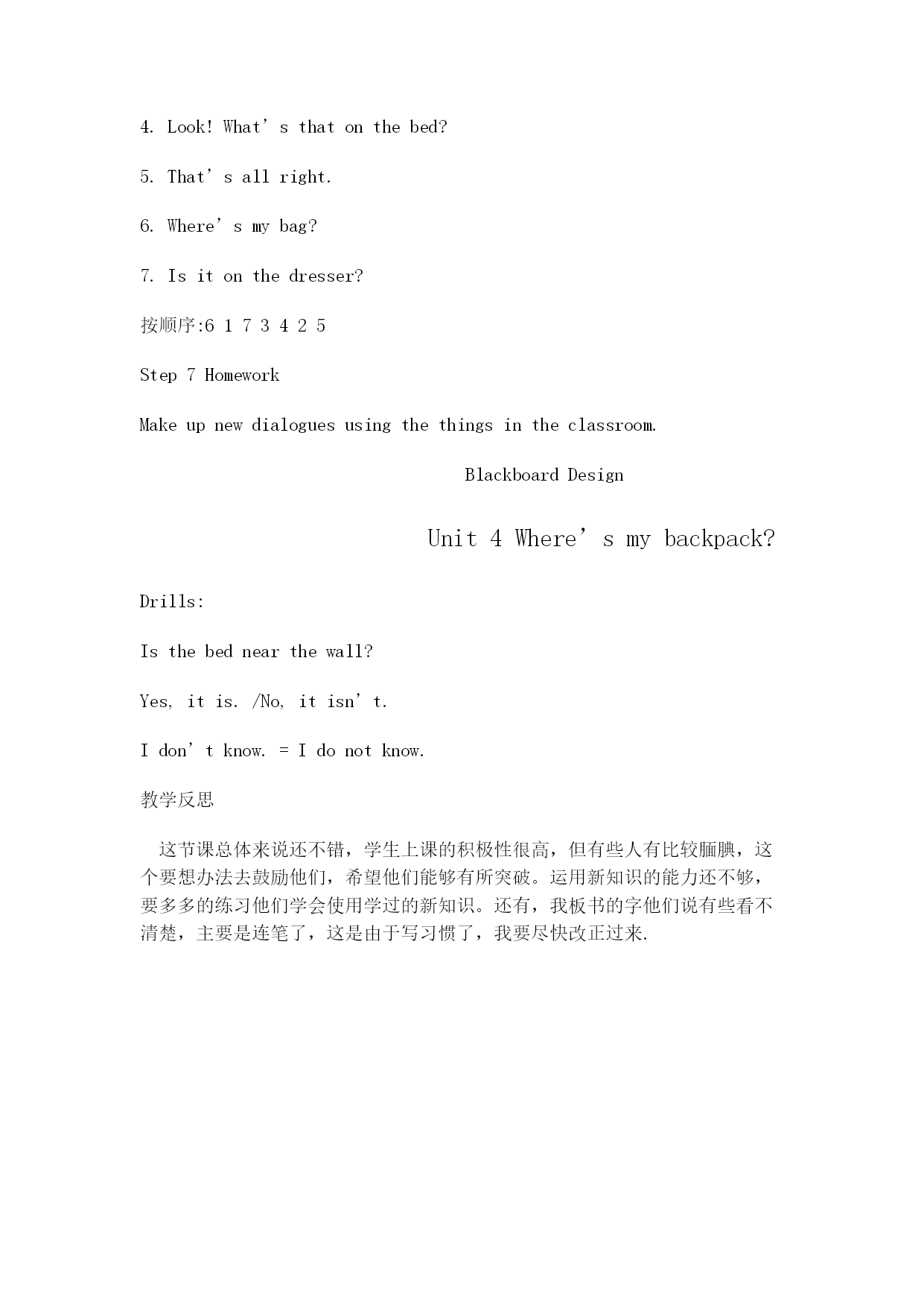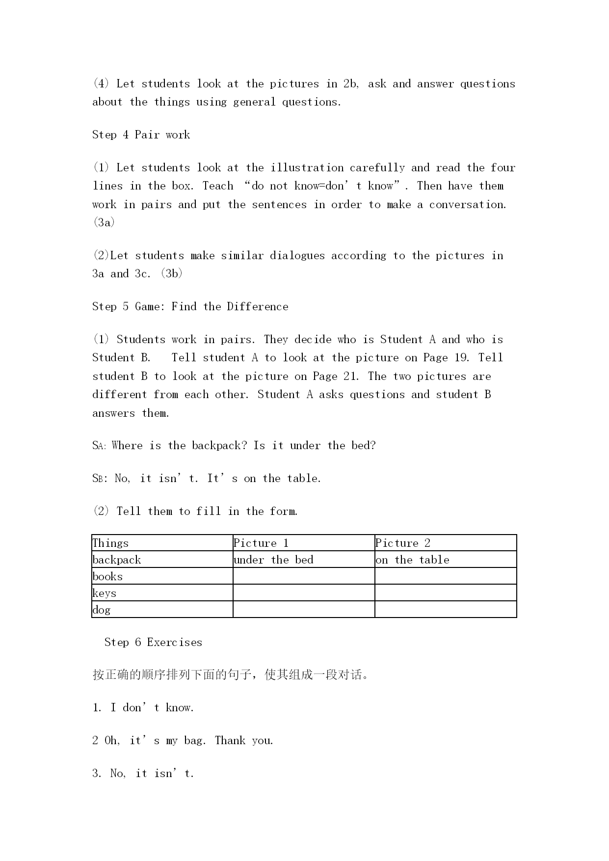 教学设计课题:Where’smybackpack?科目:English教学对象:7年级上册课时:TheSecondPeriod(SectionA2a-4)提供者:毕涛单位:珠湖中心学校Teachingaims1.LanguagegoalsTargetlanguage:__Isthebaseballonthesofa?__No,itisn’t.It’sunderthechair.__Where’sthebaseball?__It’sinthebackpack.__Where’reyourbooks?__They’reonthechair.2.AbilitygoalsLearntotalkaboutwherethingsareusinggeneralquestionsandwherequestions.3.MoralgoalsDon’tputthingseverywhereinyourclass.Keepitclean.TeachingimportantpointsTargetlanguage.Askandanswerwherethingsare.TeachingdifficultpointsWherequestions.Generalquestions.TeachingmethodsPairWork.Agame.TeachingtoolsAtaperecorder.Apictureofaroom.TeachingproceduresStep1GreetingsandRevision1.Greetthestudentsasusual.2.Revisethewordslearnedinthefirstperiod.Letstudentsspellthenewwords.Step2WarmingUp(1)Playthetapeforstudentsandletthemwriteanumberintheboxnexttotheitemmentioned.(2a)(2)Playthetapeagain,askstudentstonumberthethings[1__6]inthepicture.(2b)Step3Practice(1)Showstudentsapictureofaroomwithlotsofthingsinit.Letthemsayouttheplacesofthethings.T:Thereisabedinit.Isthebednearthewall.S:Yes,itis./No,itisn’t.Helpthestudentsanswercorrectly.(2)Pointoutthatweuse“It’s…”totalkaboutsingleobjectand“They’re…”totalkabouttwoormoreobjects.(3)Writethegeneralquestionsandanswersontheblackboard.(4)Letstudentslookatthepicturesin2b,askandanswerquestionsaboutthethingsusinggeneralquestions.Step4Pairwork(1)Letstudentslookattheillustrationcarefullyandreadthefourlinesinthebox.Teach“donotknow=don’tknow”.Thenhavethemworkinpairsandputthesentencesinordertomakeaconversation.(3a)(2)Letstudentsmakesimilardialoguesaccordingtothepicturesin3aand3c.(3b)Step5Game:FindtheDifference(1)Studentsworkinpairs.TheydecidewhoisStudentAandwhoisStudentB.TellstudentAtolookatthepictureonPage19.TellstudentBtolookatthepictureonPage21.Thetwopicturesaredifferentfromeachother.StudentAasksquestionsandstudentBanswersthem.SA:Whereisthebackpack?Isitunderthebed?SB:No,itisn’t.It’sonthetable.(2)Tellthemtofillintheform.ThingsPicture1