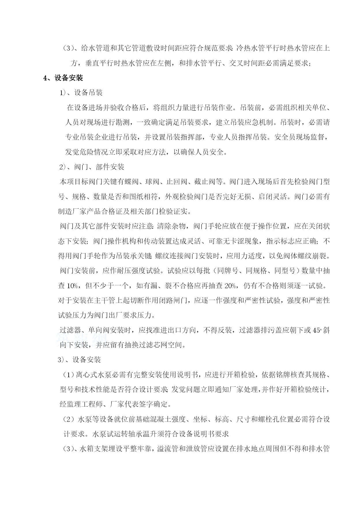 **上海总部机电安装施工组织方案编号:同意人:**建筑工程目录TOC\o"1-3"\h\z\u附件三、施工总平面图、进度计划表…………………………………………32第一章工程目标和组织布署第一节施工组织设计编制说明及编制依据本着对业主认真负责一贯作风,在对本工程机电安装工作做出认真研究基础上,本企业为机电安装工程单独编制了本施工组织设计!1、编制说明首先,我企业诚恳表示:完全接收现场施工管理所提出各项要求,而且确保在业主、设计单位、监理单位和政府质监部门等单位支持和指导下,推行协议承诺,“优质、高速、安全、文明”地建设好本工程,最终令业主满意。我企业经过认真学习和研究了本工程设计图纸,结合我企业本身技术力量和以往施工过类似此工程管理水平,我们确保在土建和钢结构各方运行正常情况下有能力在要求施工工期内优质、高效地顺利完成本工程,使工程能尽早交付业主使用,发挥出本工程经济效益。2、编制依据:《中国建筑法》;招标文件及招标答疑;北京市五合国际北京华特建筑设计顾问有限责任企业施工图纸设计中相关要求及所选标准图集、规范;现行国家标准《建筑安装工程质量检验评定标准》、《建筑安装工程施工及验收规范》;第二节工程概况及目标计划(工期、质量和安全)1、工程概况:工程名称:博泽上海总部项目建设单位:博泽汽车技术企业管理(中国)建设地点:上海市嘉定区安亭镇工业园区建筑规模:建设用地面积40004.4M2建筑总面积36247.8M2设计单位:五合国际.北京华特建筑设计顾问有限责任企业2、工期目标及进度控制工期目标:依据业关键求厂方在厂房封顶之前,跟随土建进度安排做好对应预埋、预制加工工作,并为后期安装工作做好人力、物力及资金和技术准备布署。厂房封顶后,依据现场实际情况,制订科学、合理施工进度计划,必需时制订周计划,以确保关键节点进度来控制整个工程进度。3、质量目标及确保方法质量目标:合格率100%优良品率95%确保达成优良,并达成优质量标准确保方法:ISO9002质量管理和质量确保体系标准管理。4、安全目标及确保方法安全目标:不发生一起死亡事故,杜绝火灾、触电、食物中毒等重大事故;严格实施国家颁布安全法规,建立健全现场管理网络,实施项目经理负责制,配置专职安全员并和职员签署安全生产责任书。第三节施工准备布署1、施工准备工作①组织相关人员认真学习图纸,熟悉图纸,正确计算出多种材料数量及人工数量。对于需要定货周期设备,在施工准备阶段确定其供货商及供货周期,以免影响工程总体进度。②针对本工程特点,做好安装各专业人员技术交底、安全教育等工作。③依据施工总平面部署图,接通现场施工用水管线到使用地点,把现场施工用电线路接通到使用地点。eq\o\ac(○,4)依据施工各阶段具体要求,组织机具设备进场。eq\o\ac(○,5)依据各阶段进度要求,组织劳动力、材料进场。2、施工现场计划依据本工程工作内容,我企业项目部结合现场实际情况,对施工用临时设施作以安排:在建设单位指定区域内搭建临时设施,用以仓储材料、机械加工和现场办公、生活设施区部署。在建设单位指定位置接通水源、电源。准备现场施工用电,照明要求光线充足,施工用电要安全、方便。第四节工程管理组织和机构依据工程特点,工期要求,质量要求,并为按期保质完成本工程,拟建立以下组织机构,负责组织管理及实施本工程。1、组织机构设置项目部施工组织机构图机电安装分部项目部质检组材料组空调组电施组水施组第二章关键分项工程施工方案本项目标关键施工内容包含:给排水安装、消防系统安装、变电所系统安装、动力照明系统安装、弱电系统(BA系统、监控系统、综合布线系统、门禁及安防报警系统)防雷及接地系统安装、空调、通风系统安装、室内外煤气管网安装、电焊机工艺冷却水换热系统安装。第一节给排水系统给排水系统包含给水、排水、屋面虹吸排水系统、热水循环系统、给水加压系统、车间电焊机工艺冷却水循环系统、消防喷淋系统和消火栓管网系统及消防自喷管网系统、空调冷凝水排水系统施工工序:给排水技术、物资准备—→图纸交底—→管道预埋—→洞、孔预留—→管道安装—→管道试验—→器具、设备检验、安装—→器具、设备调试—→系统调试试运行各方认可完工验收合格后交付业主投入使用。1、相关设计及规范要求(1)、进入施工现场全部设备、关键材料及配件全部应有产品合格证或质保书,设备应有铭牌,不合格严禁进场使用;每一批材料全部报现场监理工程师现场拍照认可。(2)、各类吊、支托架、管道、风管法兰等需防腐处理金属件在安装前应严格除锈并刷防锈漆(埋地应刷两度防锈漆),完工前应