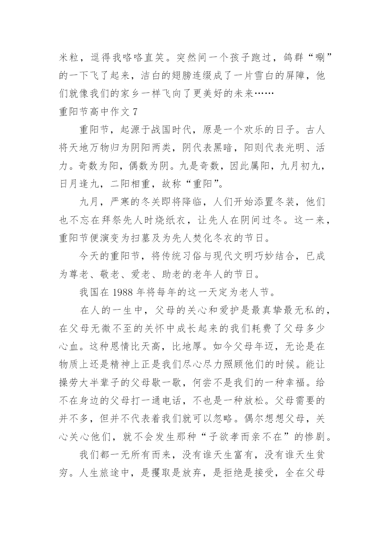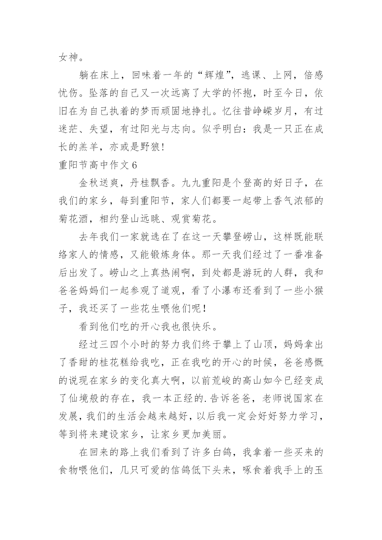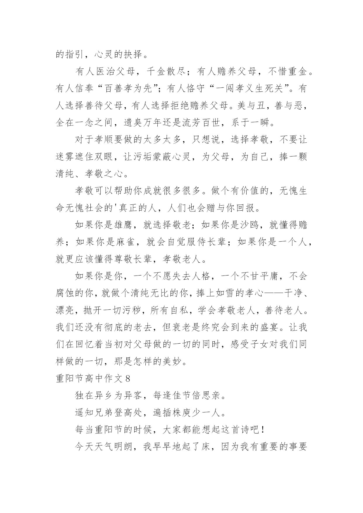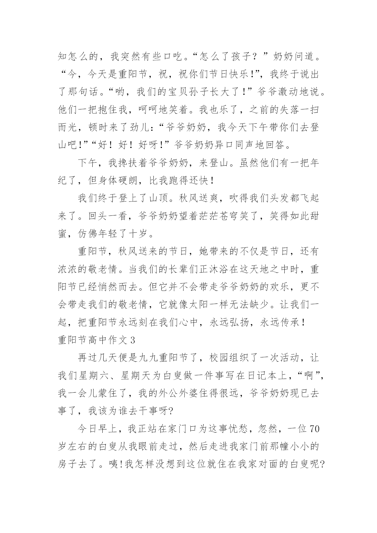 重阳节高中作文重阳节高中作文无论是在学校还是在社会中,说到作文,大家肯定都不陌生吧,作文是通过文字来表达一个主题意义的记叙方法。如何写一篇有思想、有文采的作文呢?以下是小编为大家整理的重阳节高中作文,仅供参考,大家一起来看看吧。重阳节高中作文1农历九月九日是我国的一个传统节日——重阳节。这天早晨,爷爷和外公穿上漂亮的新衣服,戴上爸爸为他们买的礼帽。奶奶和外婆在梳妆台前梳头发,穿上美丽的裙子和新衣,准备出去游玩。爸爸、妈妈和小姨忙着为爷爷、奶奶、外公、外婆做重阳糕和米果糖等各类点心。同学们和大哥哥、大姐姐去干休所、敬老院看望老人们,帮老人们理发、洗衣服、做饭、扫地、擦窗户。重阳节是老人们最高兴的'一天。这天,老人们去公园玩不用买票,坐公交车也不用投币,医院免费为老人看病。小区里的爷爷呀、奶奶呀,不是约着一起去公园玩,或去广场散步,就是到楼下花园里的小亭子里打牌、下棋。社区的广场上呢,老人们有的唱歌,有的跳舞,有的聊天,有的溜狗或放鸟。个个说说笑笑,很开心!翠湖就更不用说了,爷爷奶奶们让公园的道路变成了一条“老人河”,挤的连麻雀都没站脚的地方了。湖上,老人们坐着电动船,象在开聚会一样,看看书,聊聊天,看上去很自在。不论是公园、广场还是小区,爷爷奶奶们都很开心!重阳节高中作文2一千多年前的今天,王维登高远眺,面对茫茫苍穹吟出千古名句:“遥知兄弟登高处,遍插茱萸少一人”。而今,穿越历史的烟云,又是一年重阳节,再念敬老,顾思经典。重阳节,在这金风送爽的季节里,老人们更是笑口常开啦!各个地方开展老人们最喜爱的节目,如:扭秧歌啦、播放古典音乐啦、登高远眺啦……爷爷奶奶们唱歌、跳舞,庆祝自己的节日,九九重阳正赶“九”,家家户户乐开怀。我们是初生的太阳,老人更是一轮永远不落西山的太阳!丹凤迎秋,秋兰飘香,采一朵菊花插在奶奶头上,送一包烟放在爷爷手上。中秋过后又重阳,它代表着永不落的太阳,无疑是最美的。只要在这一天,你做到了,此后,不管多么久,你还会记得重阳,还会想起你的爷爷奶奶。只要真情永久天涯也只不过咫尺比邻。重阳节,我也为爷爷奶奶献出了自己的一份敬老情……预料之外,我原本精心筹备的“惊喜”又泡汤了——礼物太贵了。我十分失落,心里默默想着:怎么办,爷爷奶奶会不高兴的呀!一抬头就看见了家门。爷爷为我开了门。我不敢直视爷爷的'眼睛,胆怯地回到了房间。“没办法了,只能说句祝福语了!”我想着。我迈着颤抖的步子,走到爷爷奶奶跟前,鼓起勇气,说出了那句话:“奶,奶奶……”不知怎么的,我突然有些口吃。“怎么了孩子?”奶奶问道。“今,今天是重阳节,祝,祝你们节日快乐!”,我终于说出了那句话。“哟,我们的宝贝孙子长大了!”爷爷激动地说。他们一把抱住我,呵呵地笑着。我也乐了,之前的失落一扫而光,顿时来了劲儿:“爷爷奶奶,我今天下午带你们去登山吧!”“好!好!好呀!”爷爷奶奶异口同声地回答。下午,我搀扶着爷爷奶奶,来登山。虽然他们有一把年纪了,但身体硬朗,比我跑得还快!我们终于登上了山顶。秋风送爽,吹得我们头发都飞起来了。回头一看,爷爷奶奶望着茫茫苍穹笑了,笑得如此甜蜜,仿佛年轻了十岁。重阳节,秋风送来的节日,她带来的不仅是节日,还有浓浓的敬老情。当我们的长辈们正沐浴在这天地之中时,重阳节已经悄然而去。但它并不会带走爷爷奶奶的欢乐,更不会带走我们的敬老情,它就像太阳一样无法缺少。让我们一起,把重阳节永远刻在我们心中,永远弘扬,永远传承!重阳节高中作文3再过几天便是九九重阳节了,校园组织了一次活动,让我们星期六、星期天为白叟做一件事写在日记本上,“啊”,我一会儿蒙住了,我的外公外婆住得很远,爷爷奶奶现已去事了,我该为谁去干事呀?今日早上,我正站在家门口为这事忧愁,忽然,一位70岁左右的白叟从我眼前走过,然后走进我家门前那幢小小的房子去了。咦!我怎样没想到这位就住在我家对面的白叟呢?难到真如书中所说,现在的白叟正一点点地在被青年人忘记吗?我没有将这个问题延续下去,走到他面前,“爷爷,我能为你清扫房间吗?”一开端,他吃了一惊,但我立刻解说原由,并求他,生怕他不容许,让我完不成作业。通过顷刻深思,他容许了。我回家拿来扫把走进他的屋子,先打量了一下他的屋子,这是一些十分粗陋的'屋子,除了日子必备的用具,再加一台黑白电视机,就没其他什么东西了,墙上有很多的裂缝,房顶的旮旯上还布着几张蜘蛛网。我开端扫地了,先扫床下,我把扫把伸了进去,从里往外一扫,“呀”,尘埃怎样这么多啊?我用手捂住别的嘴巴和鼻子,又扫了起来。扫着,扫着,房间里便尘埃充满了,我用扫把扫了几下,想让尘埃扫出门外去,谁知,这几扫,不光没把尘埃扇出去,反而把我扫在一起的尘埃给扫散了,“哎呀”本是要为老爷爷来清扫房间的,但现在反而弄的越来越糟糕了,“啊”地面上腾起来的尘埃呛得我真实没办法,我捂着嘴巴,眯着眼睛冲出了