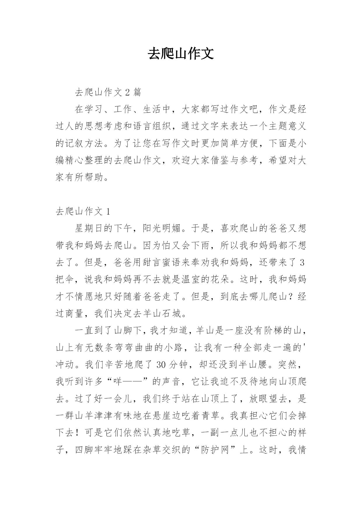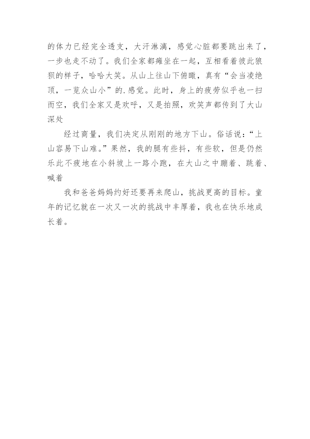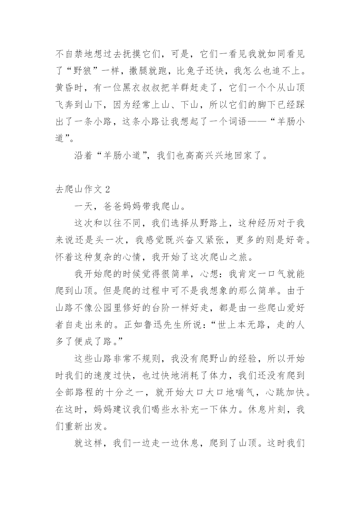 去爬山作文去爬山作文2篇在学习、工作、生活中,大家都写过作文吧,作文是经过人的思想考虑和语言组织,通过文字来表达一个主题意义的记叙方法。为了让您在写作文时更加简单方便,下面是小编精心整理的去爬山作文,欢迎大家借鉴与参考,希望对大家有所帮助。去爬山作文1星期日的下午,阳光明媚。于是,喜欢爬山的爸爸又想带我和妈妈去爬山。因为怕又会下雨,所以我和妈妈都不想去了。但是,爸爸用甜言蜜语来奉劝我和妈妈,还带来了3把伞,说我和妈妈再不去就是温室的花朵。这时,我和妈妈才不情愿地只好随着爸爸走了。但是,到底去哪儿爬山?经过商量,我们决定去羊山石城。一直到了山脚下,我才知道,羊山是一座没有阶梯的山,山上有无数条弯弯曲曲的小路,让我有一种全部走一遍的'冲动。我们辛苦地爬了30分钟,却还没到半山腰。突然,我听到许多“咩——”的声音,它让我迫不及待地向山顶爬去。过了好一会儿,我们终于站在山顶上了,放眼望去,是一群山羊津津有味地在悬崖边吃着青草。我真担心它们会掉下去!可是它们依然认真地吃草,一副一点儿也不担心的样子,四脚牢牢地踩在杂草交织的“防护网”上。这时,我情不自禁地想过去抚摸它们,可是,它们一看见我就如同看见了“野狼”一样,撒腿就跑,比兔子还快,我怎么也追不上。黄昏时,有一位黑衣叔叔把羊群赶走了,它们一个个从山顶飞奔到山下,因为经常上山、下山,所以它们的脚下已经踩出了一条小路,这条小路让我想起了一个词语——“羊肠小道”。沿着“羊肠小道”,我们也高高兴兴地回家了。去爬山作文2一天,爸爸妈妈带我爬山。这次和以往不同,我们选择从野路上,这种经历对于我来说还是头一次,我感觉既兴奋又紧张,更多的则是好奇。怀着这种复杂的心情,我开始了这次爬山之旅。我开始爬的时候觉得很简单,心想:我肯定一口气就能爬到山顶。但是爬的过程中可不是我想象的那么简单。由于山路不像公园里修好的台阶一样好走,都是由一些爬山爱好者自走出来的。正如鲁迅先生所说:“世上本无路,走的人多了便成了路。”这些山路非常不规则,我没有爬野山的经验,所以开始时我们的速度过快,也过快地消耗了体力,我们还没有爬到全部路程的十分之一,就开始大口大口地喘气,心跳加快。在这时,妈妈建议我们喝些水补充一下体力。休息片刻,我们重新出发。就这样,我们一边走一边休息,爬到了山顶。这时我们的体力已经完全透支,大汗淋漓,感觉心脏都要跳出来了,一步也走不动了。我们全家都瘫坐在一起,互相看着彼此狼狈的样子,哈哈大笑。从山上往山下俯瞰,真有“会当凌绝顶,一览众山小”的.感觉。此时,身上的疲劳似乎也一扫而空,我们全家又是欢呼,又是拍照,欢笑声都传到了大山深处经过商量,我们决定从刚刚的地方下山。俗话说:“上山容易下山难。”果然,我的腿有些抖,有些软,但是仍然乐此不疲地在小斜坡上一路小跑,在大山之中蹦着、跳着、喊着我和爸爸妈妈约好还要再来爬山,挑战更高的目标。童年的记忆就在一次又一次的挑战中丰厚着,我也在快乐地成长着。