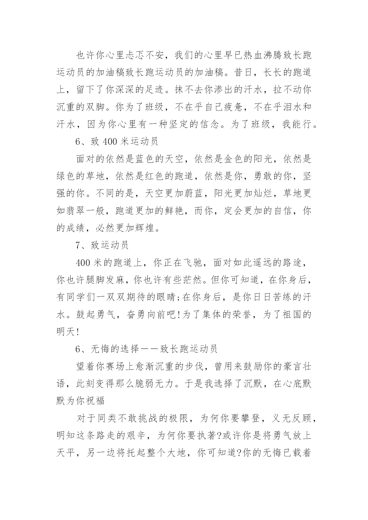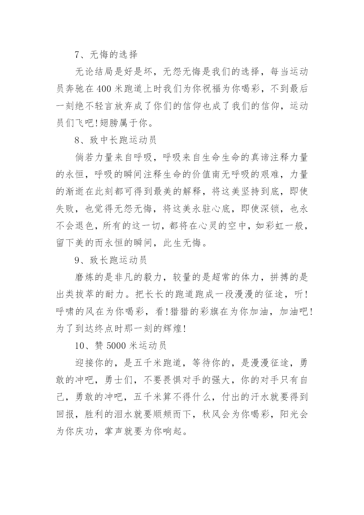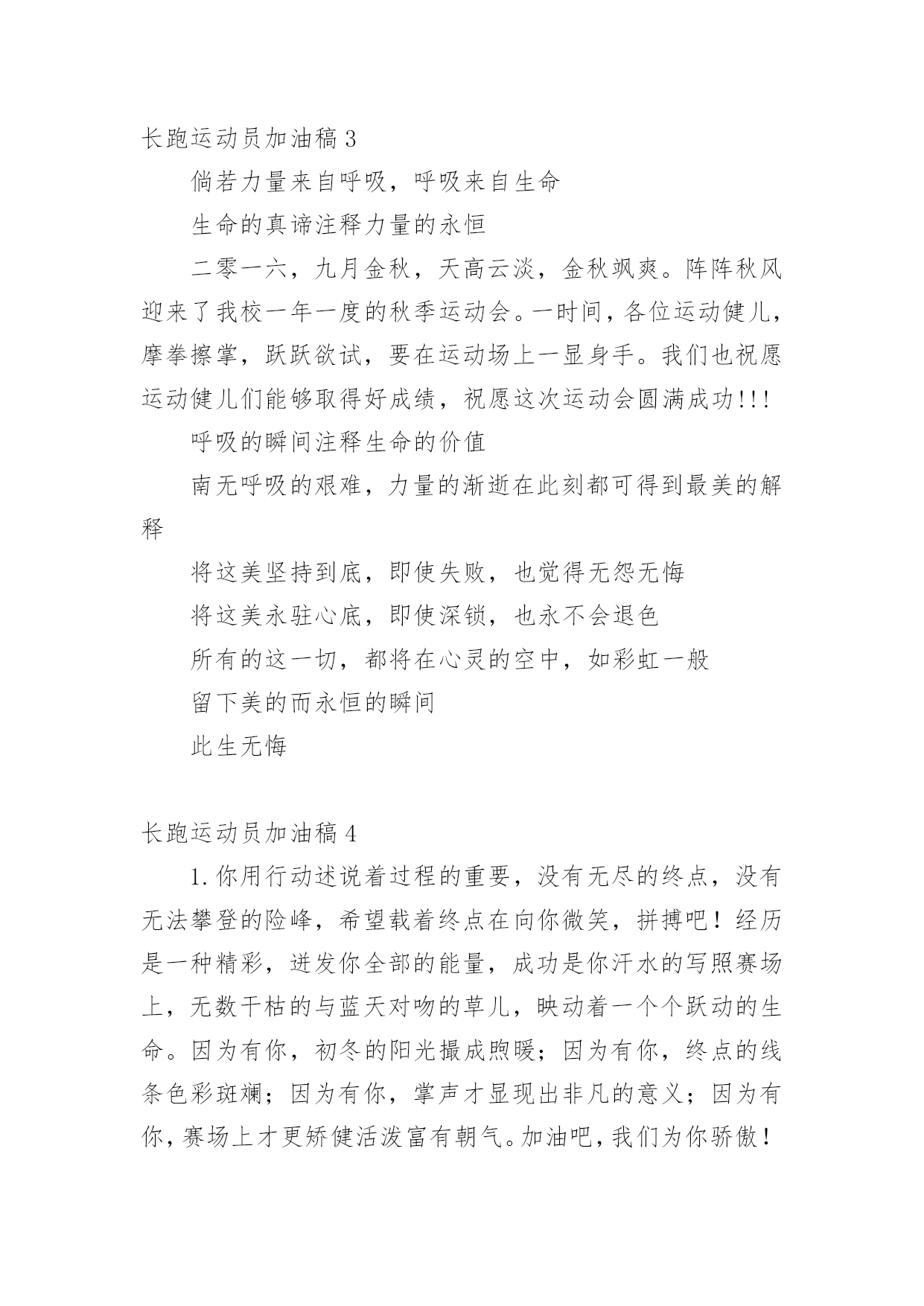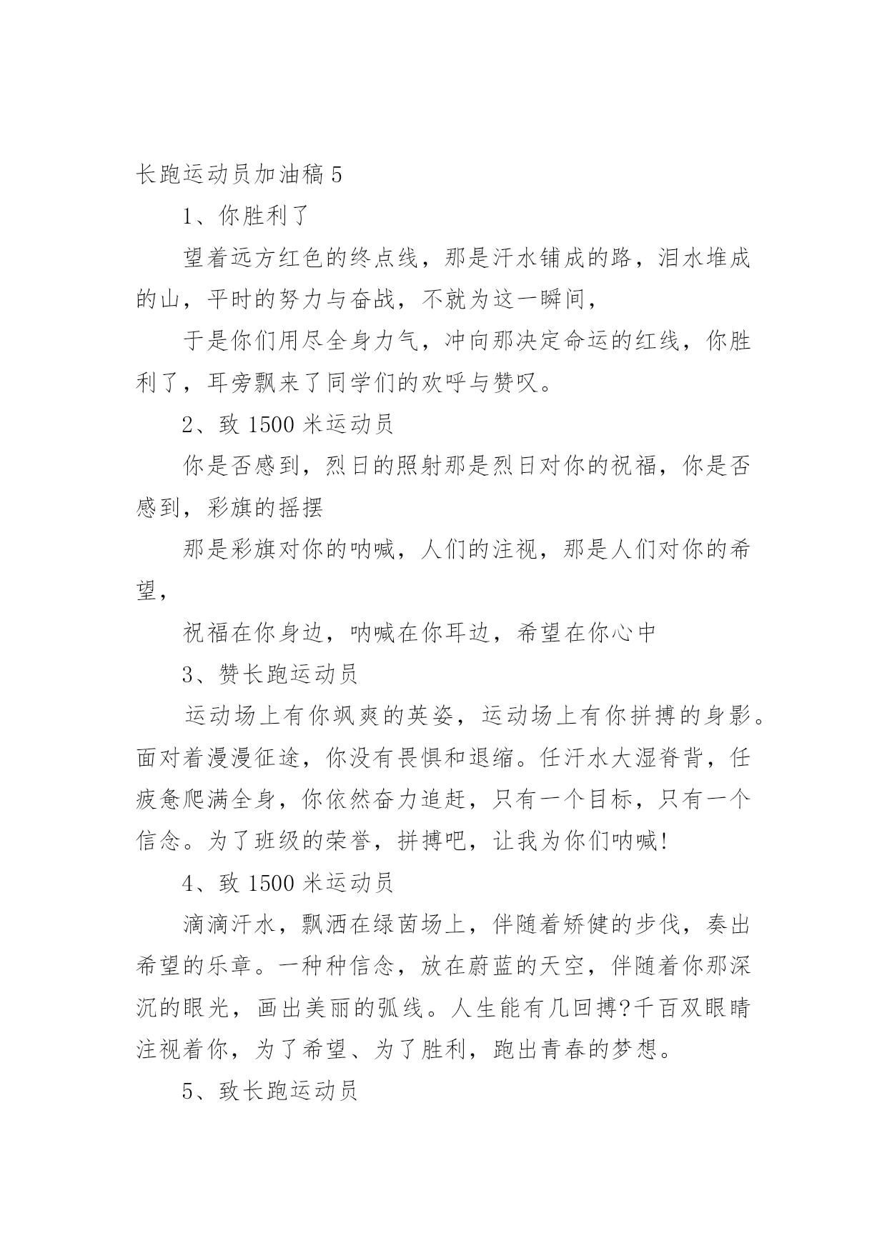 长跑运动员加油稿长跑运动员加油稿(15篇)在当今社会生活中,我们很多时候都不得不用到加油稿,加油稿是鼓励激励对方的文稿。相信写加油稿是一个让许多人都头痛的问题,以下是小编收集整理的长跑运动员加油稿,希望对大家有所帮助。长跑运动员加油稿15000米的漫漫征途,5000米的漫长等待,一次又一次挥动臂膀,一次又一次抬起步伐。我们的加油,你听到了吗?我们的呐喊,你听到了吗?用坚强的心去面对,用顽强的毅力去奔跑。这耐力的战争,坚持下来就是赢家;这毅力的决赛,坚持下来就是强者。实验的运动健儿们,再坚持一下,再忍耐一下,胜利就在眼前!长跑运动员加油稿21、你胜利了望着远方红色的终点线,那是汗水铺成的路,泪水堆成的山,平时的努力与奋战,不就为这一瞬间,于是你们用尽全身力气,冲向那决定命运的红线,你胜利了,耳旁飘来了同学们的欢呼与赞叹。2、致1500米运动员你是否感到,烈日的照射那是烈日对你的祝福,你是否感到,彩旗的摇摆那是彩旗对你的呐喊,人们的注视,那是人们对你的希望,祝福在你身边,呐喊在你耳边,希望在你心中3、赞长跑运动员运动场上有你飒爽的英姿,运动场上有你拼搏的身影。面对着漫漫征途,你没有畏惧和退缩。任汗水大湿脊背,任疲惫爬满全身,你依然奋力追赶,只有一个目标,只有一个信念。为了班级的荣誉,拼搏吧,让我为你们呐喊!4、致1500米运动员滴滴汗水,飘洒在绿茵场上,伴随着矫健的步伐,奏出希望的乐章。一种种信念,放在蔚蓝的天空,伴随着你那深沉的眼光,画出美丽的弧线。人生能有几回搏?千百双眼睛注视着你,为了希望、为了胜利,跑出青春的梦想。5、致长跑运动员我知道这是意志的考验,长长的跑道上,留下长长的坚持致长跑运动员的加油稿广播稿。我知道这是耐力的考验,每一步的前进,充满执著和坚定。我知道你是今天的明星,我衷心为你祝福!为你喝彩!6、致3000米运动员走过荒山野岭高峡低谷,我们在沿途燃起篝火,一站一站的路被抛在身后,我们感到疲惫感到困惑。还有那么长的路伸向远方,远方那片星光藏在哪儿,远方那颗童话树躲在何处,努力吧,奋斗吧!远方有我们的理想,有我们的希望!7、无悔的选择无论结局是好是坏,无怨无悔是我们的选择,每当运动员奔驰在400米跑道上时我们为你祝福为你喝彩,不到最后一刻绝不轻言放弃成了你们的信仰也成了我们的信仰,运动员们飞吧!翅膀属于你。8、致中长跑运动员倘若力量来自呼吸,呼吸来自生命生命的真谛注释力量的永恒,呼吸的瞬间注释生命的价值南无呼吸的艰难,力量的渐逝在此刻都可得到最美的解释,将这美坚持到底,即使失败,也觉得无怨无悔,将这美永驻心底,即使深锁,也永不会退色,所有的这一切,都将在心灵的空中,如彩虹一般,留下美的而永恒的瞬间,此生无悔。9、致长跑运动员磨炼的是非凡的毅力,较量的是超常的体力,拼搏的是出类拔萃的耐力。把长长的跑道跑成一段漫漫的征途,听!呼啸的风在为你喝彩,看!猎猎的彩旗在为你加油,加油吧!为了到达终点时那一刻的辉煌!10、赞5000米运动员迎接你的,是五千米跑道,等待你的,是漫漫征途,勇敢的冲吧,勇士们,不要畏惧对手的强大,你的对手只有自己,勇敢的冲吧,五千米算不得什么,付出的汗水就要得到回报,胜利的泪水就要顺颊而下,秋风会为你喝彩,阳光会为你庆功,掌声就要为你响起。长跑运动员加油稿3倘若力量来自呼吸,呼吸来自生命生命的真谛注释力量的永恒二零一六,九月金秋,天高云淡,金秋飒爽。阵阵秋风迎来了我校一年一度的秋季运动会。一时间,各位运动健儿,摩拳擦掌,跃跃欲试,要在运动场上一显身手。我们也祝愿运动健儿们能够取得好成绩,祝愿这次运动会圆满成功!!!呼吸的瞬间注释生命的价值南无呼吸的艰难,力量的渐逝在此刻都可得到最美的解释将这美坚持到底,即使失败,也觉得无怨无悔将这美永驻心底,即使深锁,也永不会退色所有的这一切,都将在心灵的空中,如彩虹一般留下美的而永恒的瞬间此生无悔长跑运动员加油稿41.你用行动述说着过程的重要,没有无尽的终点,没有无法攀登的险峰,希望载着终点在向你微笑,拼搏吧!经历是一种精彩,迸发你全部的能量,成功是你汗水的写照赛场上,无数干枯的与蓝天对吻的草儿,映动着一个个跃动的生命。因为有你,初冬的阳光撮成煦暖;因为有你,终点的线条色彩斑斓;因为有你,掌声才显现出非凡的意义;因为有你,赛场上才更矫健活泼富有朝气。加油吧,我们为你骄傲!2.也许流星并不少见,但它燃烧的刹那,留给人间最美丽的回忆!也许笑脸并不少见,但胜利的喜悦,总会留给世界精彩的一瞬!是的,那些曾经美妙的东西只有短短的一瞬间,但那却把最辉煌的一刻留给了人间。胜利,是每个人所追求的,胜利的喜悦,是胜利与重新开始的转折,胜利是新的开始!3.你们挺拔的.身姿,屹立在运动场上,你们顶着烈日炎炎的太阳,在跑道上挥洒出你们收获的汗水,在跑道上,你们坚定不移的眼神,和飞一般的