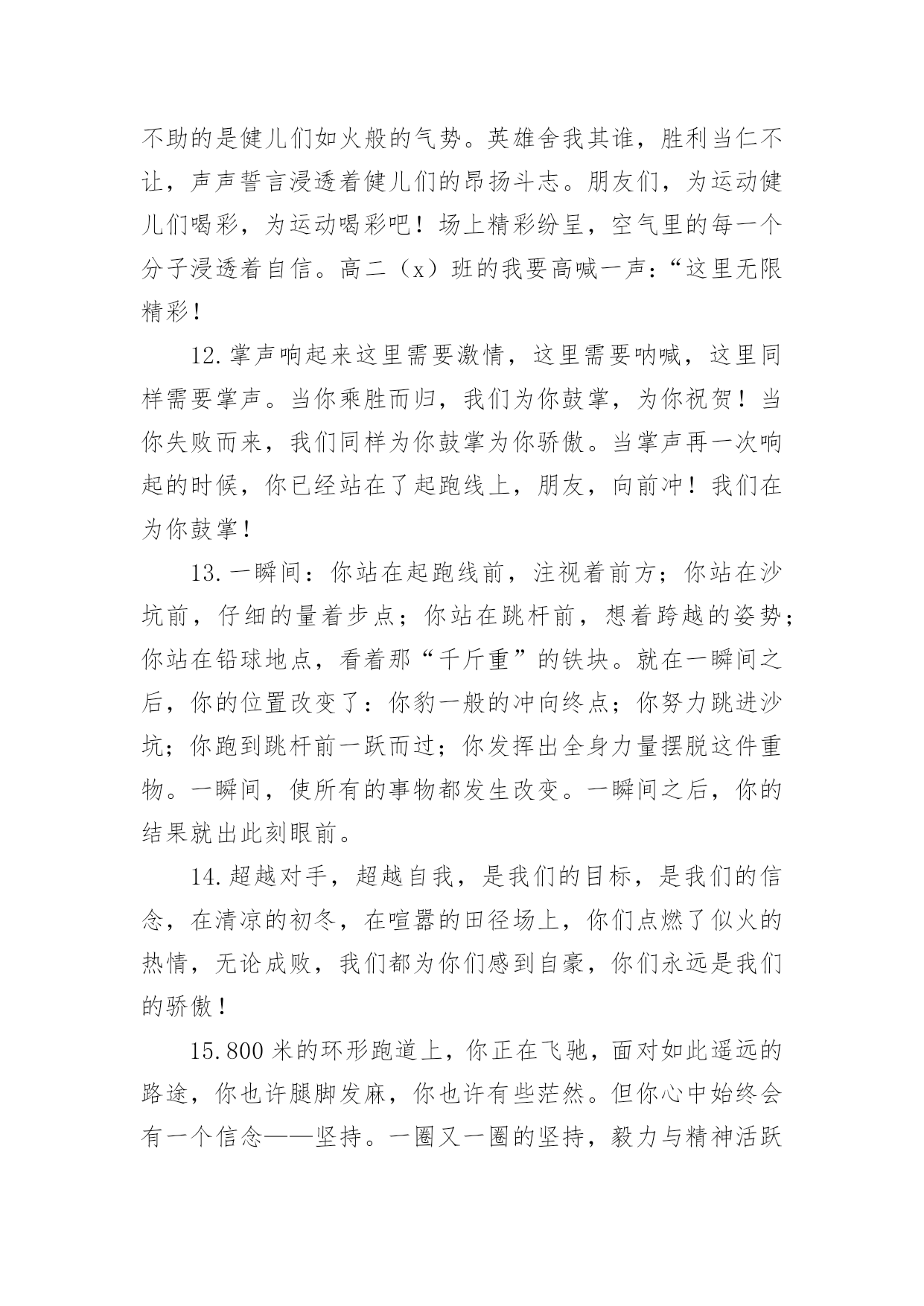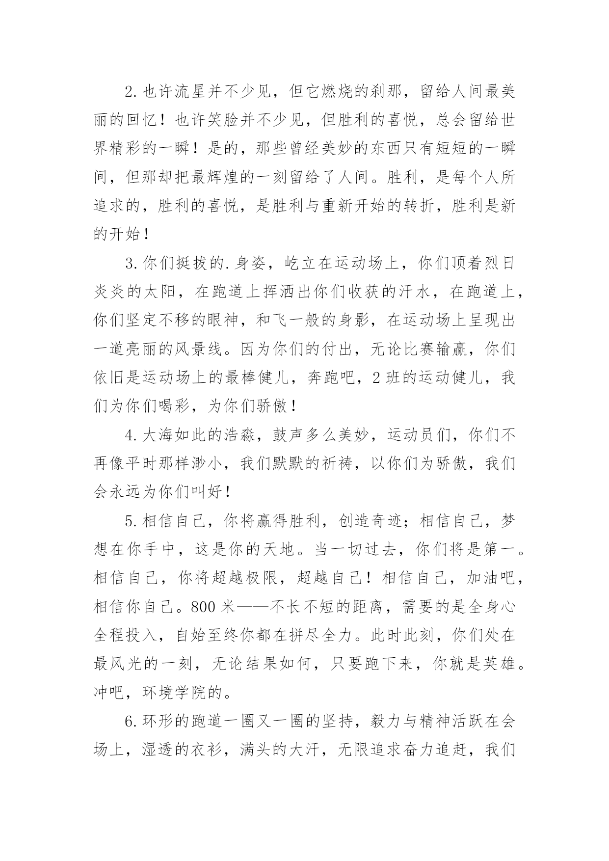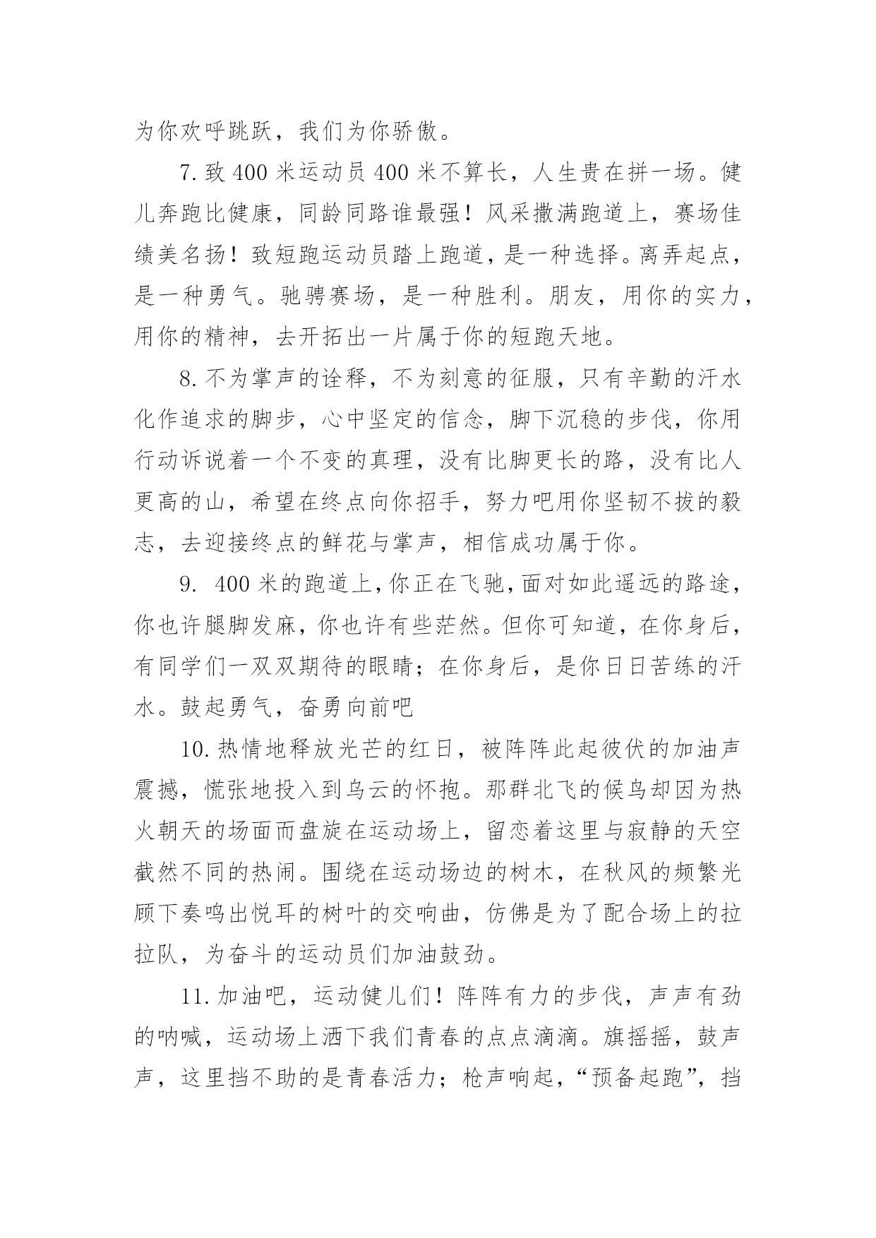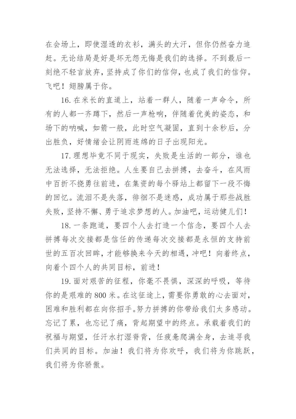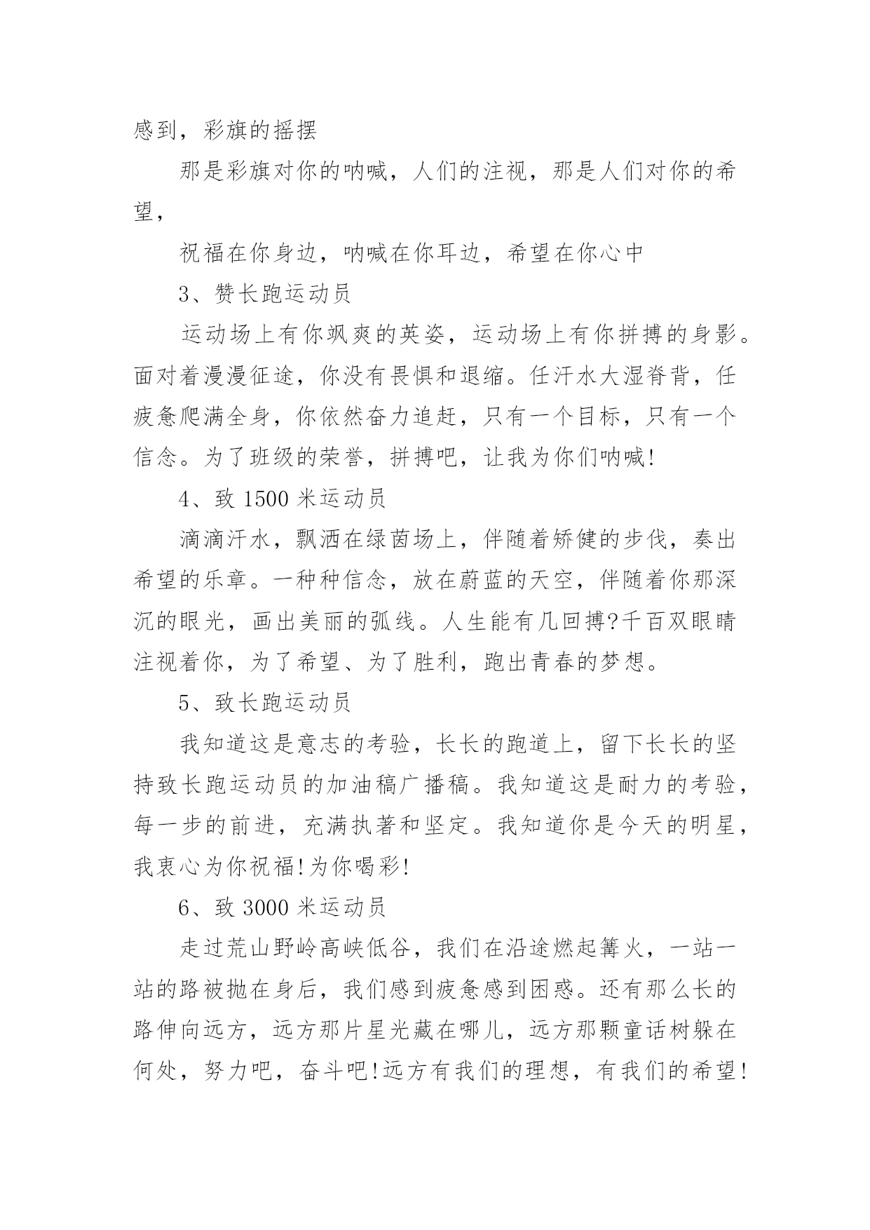 长跑运动员加油稿长跑运动员加油稿(15篇)在当今社会生活中,我们很多时候都不得不用到加油稿,加油稿是鼓励激励对方的文稿。相信写加油稿是一个让许多人都头痛的问题,以下是小编收集整理的长跑运动员加油稿,希望对大家有所帮助。长跑运动员加油稿15000米的漫漫征途,5000米的漫长等待,一次又一次挥动臂膀,一次又一次抬起步伐。我们的加油,你听到了吗?我们的呐喊,你听到了吗?用坚强的心去面对,用顽强的毅力去奔跑。这耐力的战争,坚持下来就是赢家;这毅力的决赛,坚持下来就是强者。实验的运动健儿们,再坚持一下,再忍耐一下,胜利就在眼前!长跑运动员加油稿21、你胜利了望着远方红色的终点线,那是汗水铺成的路,泪水堆成的山,平时的努力与奋战,不就为这一瞬间,于是你们用尽全身力气,冲向那决定命运的红线,你胜利了,耳旁飘来了同学们的欢呼与赞叹。2、致1500米运动员你是否感到,烈日的照射那是烈日对你的祝福,你是否感到,彩旗的摇摆那是彩旗对你的呐喊,人们的注视,那是人们对你的希望,祝福在你身边,呐喊在你耳边,希望在你心中3、赞长跑运动员运动场上有你飒爽的英姿,运动场上有你拼搏的身影。面对着漫漫征途,你没有畏惧和退缩。任汗水大湿脊背,任疲惫爬满全身,你依然奋力追赶,只有一个目标,只有一个信念。为了班级的荣誉,拼搏吧,让我为你们呐喊!4、致1500米运动员滴滴汗水,飘洒在绿茵场上,伴随着矫健的步伐,奏出希望的乐章。一种种信念,放在蔚蓝的天空,伴随着你那深沉的眼光,画出美丽的弧线。人生能有几回搏?千百双眼睛注视着你,为了希望、为了胜利,跑出青春的梦想。5、致长跑运动员我知道这是意志的考验,长长的跑道上,留下长长的坚持致长跑运动员的加油稿广播稿。我知道这是耐力的考验,每一步的前进,充满执著和坚定。我知道你是今天的明星,我衷心为你祝福!为你喝彩!6、致3000米运动员走过荒山野岭高峡低谷,我们在沿途燃起篝火,一站一站的路被抛在身后,我们感到疲惫感到困惑。还有那么长的路伸向远方,远方那片星光藏在哪儿,远方那颗童话树躲在何处,努力吧,奋斗吧!远方有我们的理想,有我们的希望!7、无悔的选择无论结局是好是坏,无怨无悔是我们的选择,每当运动员奔驰在400米跑道上时我们为你祝福为你喝彩,不到最后一刻绝不轻言放弃成了你们的信仰也成了我们的信仰,运动员们飞吧!翅膀属于你。8、致中长跑运动员倘若力量来自呼吸,呼吸来自生命生命的真谛注释力量的永恒,呼吸的瞬间注释生命的价值南无呼吸的艰难,力量的渐逝在此刻都可得到最美的解释,将这美坚持到底,即使失败,也觉得无怨无悔,将这美永驻心底,即使深锁,也永不会退色,所有的这一切,都将在心灵的空中,如彩虹一般,留下美的而永恒的瞬间,此生无悔。9、致长跑运动员磨炼的是非凡的毅力,较量的是超常的体力,拼搏的是出类拔萃的耐力。把长长的跑道跑成一段漫漫的征途,听!呼啸的风在为你喝彩,看!猎猎的彩旗在为你加油,加油吧!为了到达终点时那一刻的辉煌!10、赞5000米运动员迎接你的,是五千米跑道,等待你的,是漫漫征途,勇敢的冲吧,勇士们,不要畏惧对手的强大,你的对手只有自己,勇敢的冲吧,五千米算不得什么,付出的汗水就要得到回报,胜利的泪水就要顺颊而下,秋风会为你喝彩,阳光会为你庆功,掌声就要为你响起。长跑运动员加油稿3倘若力量来自呼吸,呼吸来自生命生命的真谛注释力量的永恒二零一六,九月金秋,天高云淡,金秋飒爽。阵阵秋风迎来了我校一年一度的秋季运动会。一时间,各位运动健儿,摩拳擦掌,跃跃欲试,要在运动场上一显身手。我们也祝愿运动健儿们能够取得好成绩,祝愿这次运动会圆满成功!!!呼吸的瞬间注释生命的价值南无呼吸的艰难,力量的渐逝在此刻都可得到最美的解释将这美坚持到底,即使失败,也觉得无怨无悔将这美永驻心底,即使深锁,也永不会退色所有的这一切,都将在心灵的空中,如彩虹一般留下美的而永恒的瞬间此生无悔长跑运动员加油稿41.你用行动述说着过程的重要,没有无尽的终点,没有无法攀登的险峰,希望载着终点在向你微笑,拼搏吧!经历是一种精彩,迸发你全部的能量,成功是你汗水的写照赛场上,无数干枯的与蓝天对吻的草儿,映动着一个个跃动的生命。因为有你,初冬的阳光撮成煦暖;因为有你,终点的线条色彩斑斓;因为有你,掌声才显现出非凡的意义;因为有你,赛场上才更矫健活泼富有朝气。加油吧,我们为你骄傲!2.也许流星并不少见,但它燃烧的刹那,留给人间最美丽的回忆!也许笑脸并不少见,但胜利的喜悦,总会留给世界精彩的一瞬!是的,那些曾经美妙的东西只有短短的一瞬间,但那却把最辉煌的一刻留给了人间。胜利,是每个人所追求的,胜利的喜悦,是胜利与重新开始的转折,胜利是新的开始!3.你们挺拔的.身姿,屹立在运动场上,你们顶着烈日炎炎的太阳,在跑道上挥洒出你们收获的汗水,在跑道上,你们坚定不移的眼神,和飞一般的