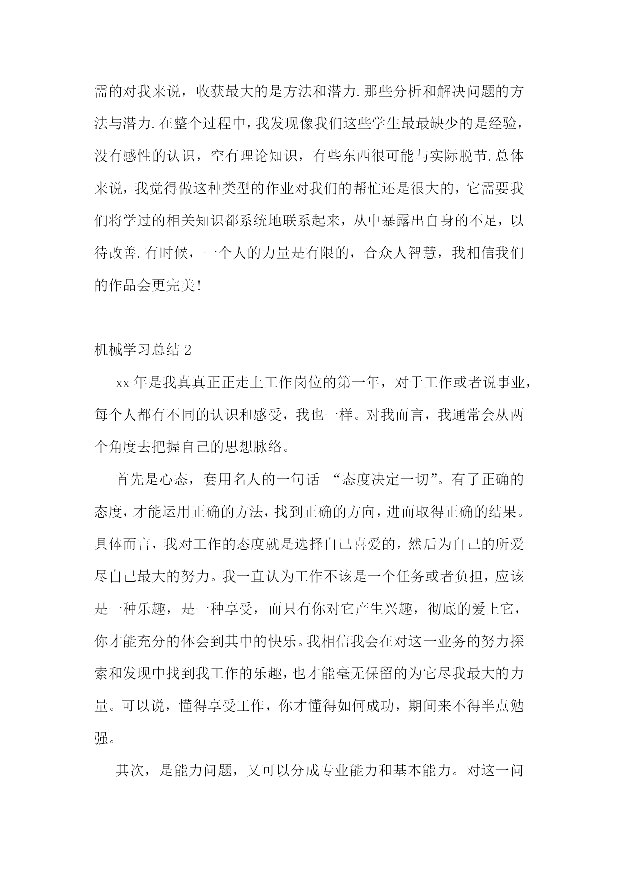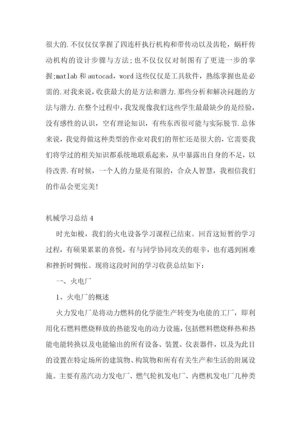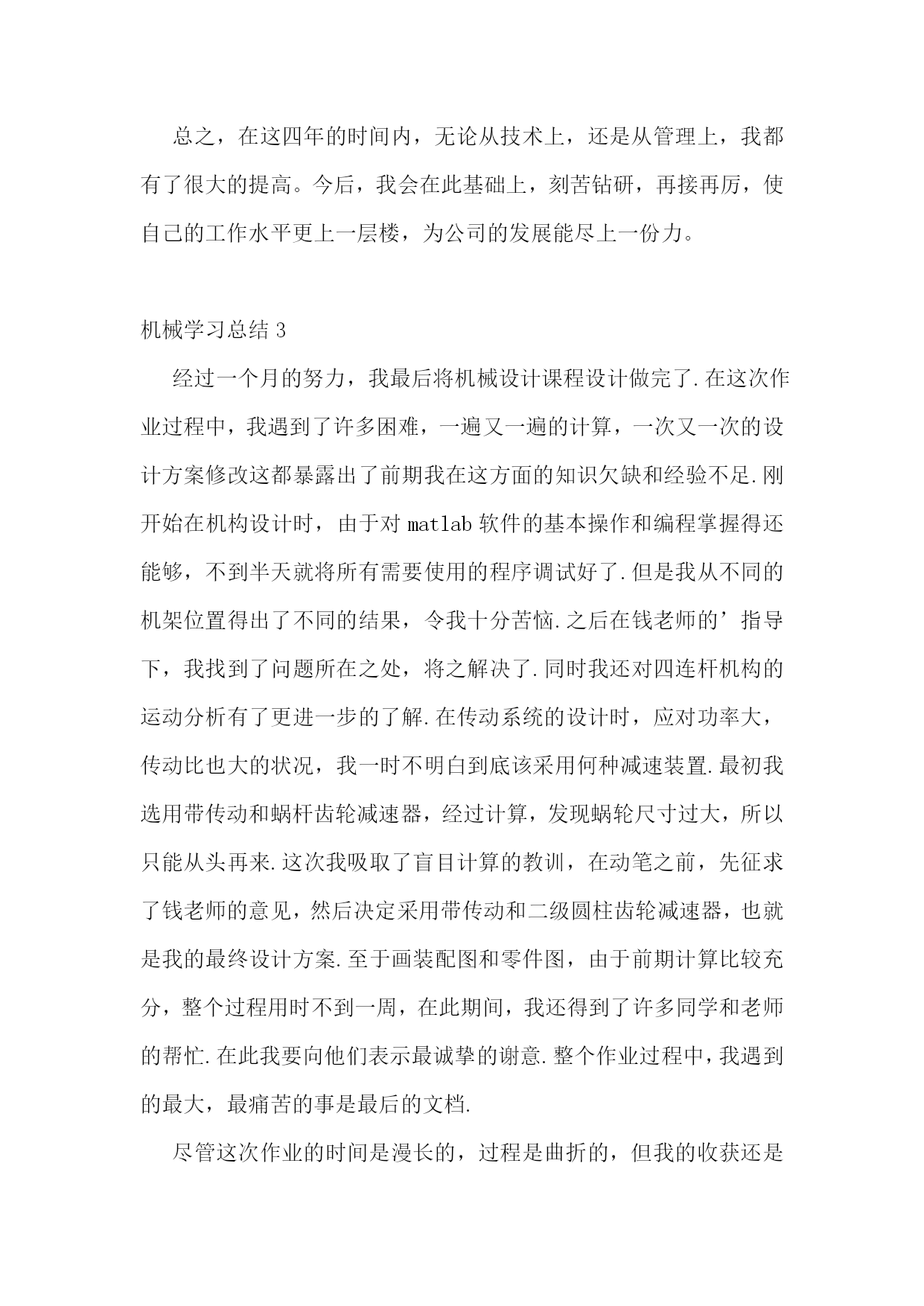 机械学习总结机械学习总结1经过一个月的努力,我最后将机械设计课程设计做完了.在这次作业过程中,我遇到了许多困难,一遍又一遍的计算,一次又一次的设计方案修改这都暴露出了前期我在这方面的知识欠缺和经验不足.刚开始在机构设计时,由于对matlab软件的基本操作和编程掌握得还能够,不到半天就将所有需要使用的程序调试好了.但是我从不同的机架位置得出了不同的结果,令我十分苦恼.之后在钱老师的指导下,我找到了问题所在之处,将之解决了.同时我还对四连杆机构的运动分析有了更进一步的了解.在传动系统的设计时,应对功率大,传动比也大的状况,我一时不明白到底该采用何种减速装置.最初我选用带传动和蜗杆齿轮减速器,经过计算,发现蜗轮尺寸过大,所以只能从头再来.这次我吸取了盲目计算的教训,在动笔之前,先征求了钱老师的意见,然后决定采用带传动和二级圆柱齿轮减速器,也就是我的最终设计方案。至于画装配图和零件图,由于前期计算比较充分,整个过程用时不到一周,在此期间,我还得到了许多同学和老师的帮忙.在此我要向他们表示最诚挚的谢意.整个作业过程中,我遇到的最大,最痛苦的事是最后的文档.尽管这次作业的’时间是漫长的,过程是曲折的,但我的收获还是很大的不仅仅仅掌握了四连杆执行机构和带传动以及齿轮,蜗杆传动机构的设计步骤与方法;也不仅仅仅对制图有了更进一步的掌握;matlab和autocad,word这些仅仅是工具软件,熟练掌握也是必需的对我来说,收获最大的是方法和潜力.那些分析和解决问题的方法与潜力.在整个过程中,我发现像我们这些学生最最缺少的是经验,没有感性的认识,空有理论知识,有些东西很可能与实际脱节.总体来说,我觉得做这种类型的作业对我们的帮忙还是很大的,它需要我们将学过的相关知识都系统地联系起来,从中暴露出自身的不足,以待改善.有时候,一个人的力量是有限的,合众人智慧,我相信我们的作品会更完美!机械学习总结2xx年是我真真正正走上工作岗位的第一年,对于工作或者说事业,每个人都有不同的认识和感受,我也一样。对我而言,我通常会从两个角度去把握自己的思想脉络。首先是心态,套用名人的一句话“态度决定一切”。有了正确的态度,才能运用正确的方法,找到正确的方向,进而取得正确的结果。具体而言,我对工作的态度就是选择自己喜爱的,然后为自己的所爱尽自己最大的努力。我一直认为工作不该是一个任务或者负担,应该是一种乐趣,是一种享受,而只有你对它产生兴趣,彻底的爱上它,你才能充分的体会到其中的快乐。我相信我会在对这一业务的努力探索和发现中找到我工作的乐趣,也才能毫无保留的为它尽我最大的力量。可以说,懂得享受工作,你才懂得如何成功,期间来不得半点勉强。其次,是能力问题,又可以分成专业能力和基本能力。对这一问题的认识我可以用一个简单的例子说明:以一只骆驼来讲,专业能力决定了它能够在沙漠的环境里生存,而基本能力,包括适应度,坚忍度,天性的警觉等,决定了它能在沙漠的环境里生存多久。具体到人,专业能力决定了你适合于某种工作,基本能力,包括自信力,协作能力,承担责任的能力,冒险精神以及发展潜力等,将直接决定工作的生命力。一个在事业上成功的人,必是两种能力能够很好地协调发展和运作的人。xx年,我曾以崭新的`精神状态投入到工作当中,努力学习,提高工作能力。积极响应公司加强管理的措施,遵守公司的规章制度。在不到一年的工作时间里虽然取得了一些成绩,但在工作中也存在着很多问题主要表现在一、缺乏创新精神。不能积极主动的发挥自己的能力,而是被动消极的适应工作需要。业务量基本都能完成,但自己不会主动牵着工作走,很被动。因此也失去了一些机会,工作没有上升到一定高度。二工作不很扎实。存在眼高手低,懒于动手的毛病,不能专注于工作学习,很多知识虽了解但却不精,在公司培训时不能积极发言,没有完全放开自己。这是我对一年来工作的总结,说的不多。但我认为用实际行动作出来更有说服力。所以在今后的工作中我将努力奋斗,继续巩固现有成绩,针对自身不足加以改进,争取在以后的工作中更上一层楼!在启源我所学的东西,不仅现在有用,而且将使我终生受益。再感谢启源总之,在这四年的时间内,无论从技术上,还是从管理上,我都有了很大的提高。今后,我会在此基础上,刻苦钻研,再接再厉,使自己的工作水平更上一层楼,为公司的发展能尽上一份力。机械学习总结3经过一个月的努力,我最后将机械设计课程设计做完了.在这次作业过程中,我遇到了许多困难,一遍又一遍的计算,一次又一次的设计方案修改这都暴露出了前期我在这方面的知识欠缺和经验不足.刚开始在机构设计时,由于对matlab软件的基本操作和编程掌握得还能够,不到半天就将所有需要使用的程序调试好了.但是我从不同的机架位置得出了不同的结果,令我十分苦恼.之后在钱老师的’指导下,我找到了问题