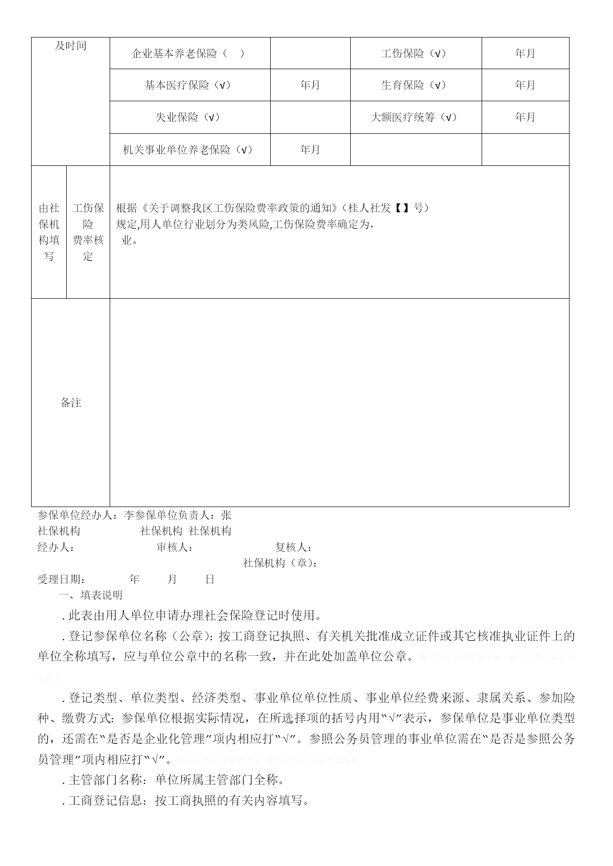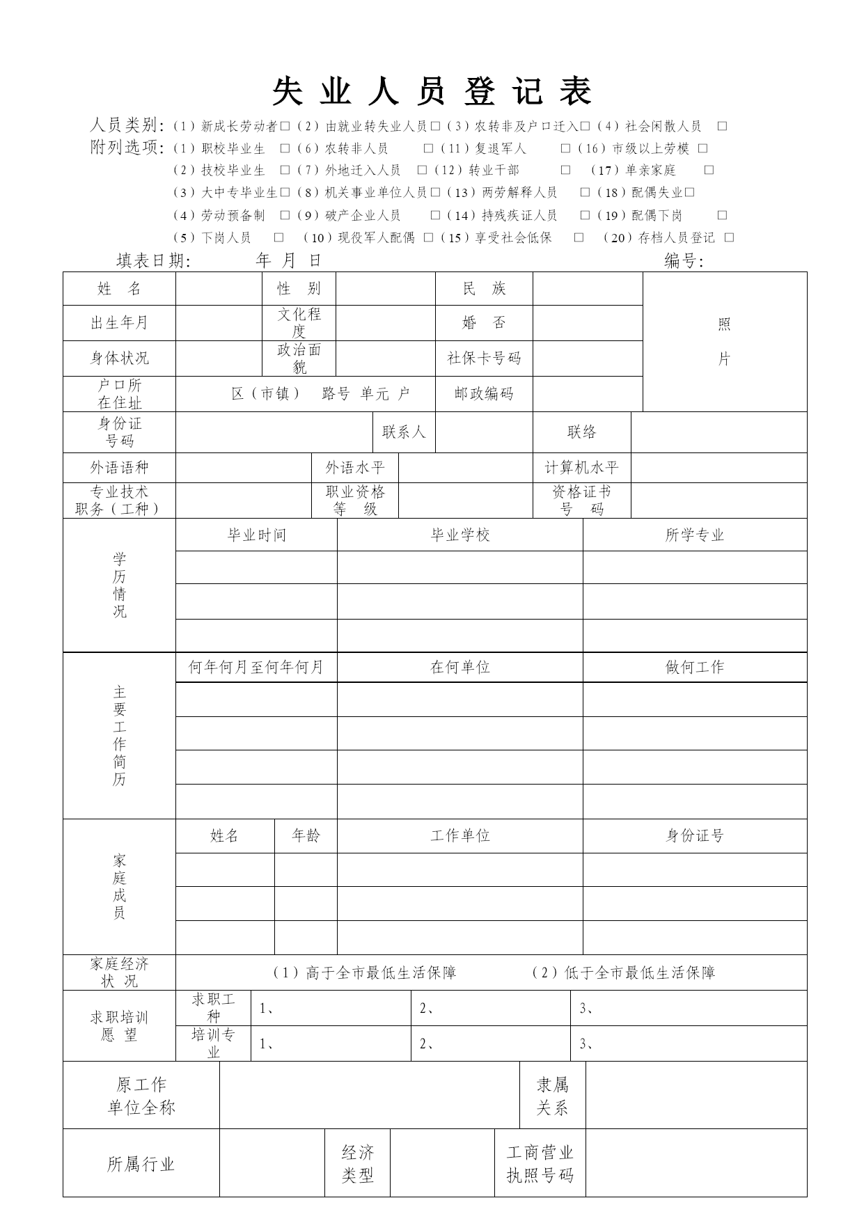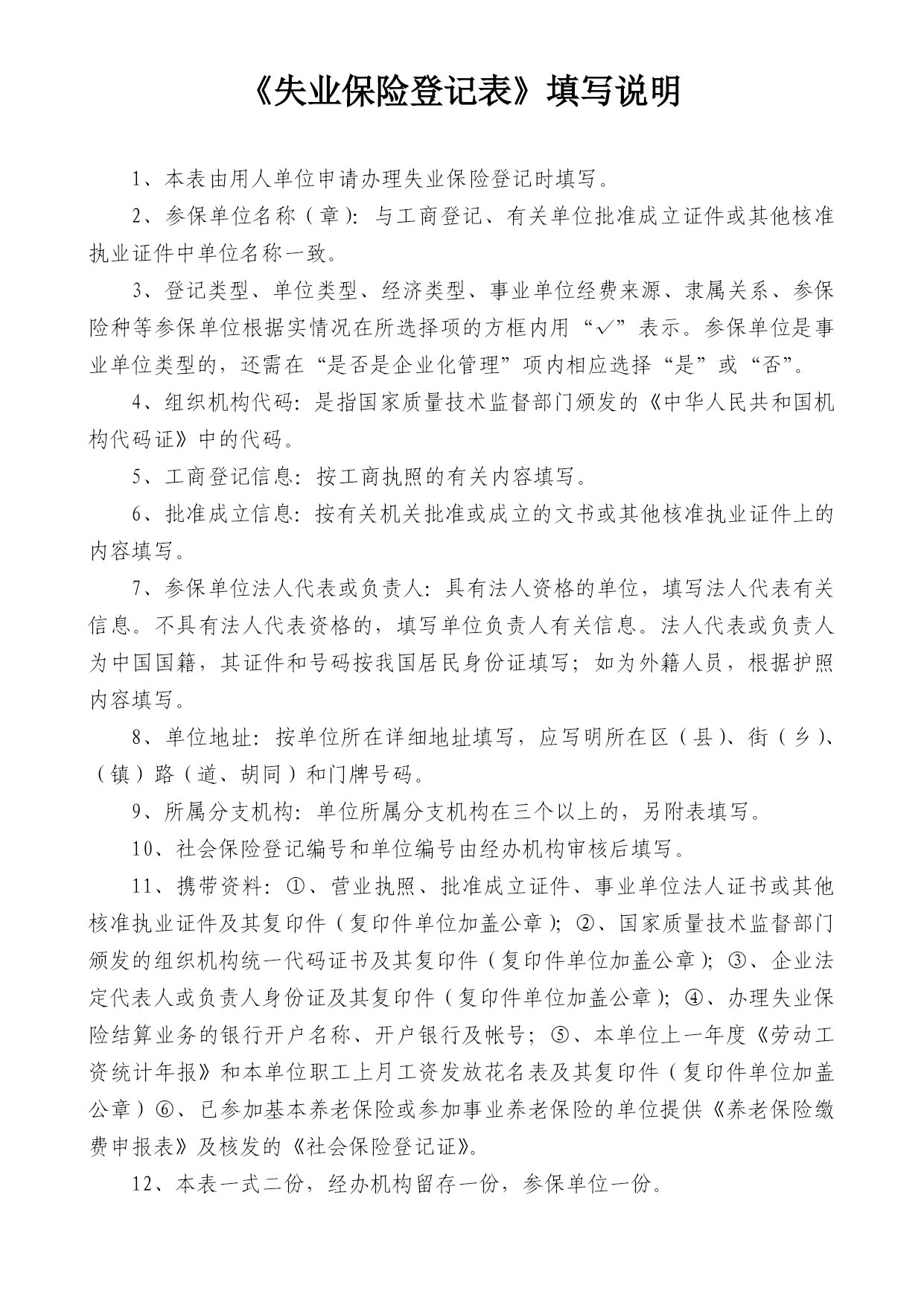 (表一)失业保险登记表1、单位名称:2、组织机构统一代码:3、失业保险经办机构:4、缴费单位专管员姓名:5、登记证编码:6、缴费单位公章:7、申请日期:年月日《失业保险登记表》填写说明1、本表由用人单位申请办理失业保险登记时填写。2、参保单位名称(章):与工商登记、有关单位批准成立证件或其他核准执业证件中单位名称一致。3、登记类型、单位类型、经济类型、事业单位经费来源、隶属关系、参保险种等参保单位根据实情况在所选择项的方框内用“√”表示。参保单位是事业单位类型的,还需在“是否是企业化管理”项内相应选择“是”或“否”。4、组织机构代码:是指国家质量技术监督部门颁发的《中华人民共和国机构代码证》中的代码。5、工商登记信息:按工商执照的有关内容填写。6、批准成立信息:按有关机关批准或成立的文书或其他核准执业证件上的内容填写。7、参保单位法人代表或负责人:具有法人资格的单位,填写法人代表有关信息。不具有法人代表资格的,填写单位负责人有关信息。法人代表或负责人为中国国籍,其证件和号码按我国居民身份证填写;如为外籍人员,根据护照内容填写。8、单位地址:按单位所在详细地址填写,应写明所在区(县)、街(乡)、(镇)路(道、胡同)和门牌号码。9、所属分支机构:单位所属分支机构在三个以上的,另附表填写。10、社会保险登记编号和单位编号由经办机构审核后填写。11、携带资料:①、营业执照、批准成立证件、事业单位法人证书或其他核准执业证件及其复印件(复印件单位加盖公章);②、国家质量技术监督部门颁发的组织机构统一代码证书及其复印件(复印件单位加盖公章);③、企业法定代表人或负责人身份证及其复印件(复印件单位加盖公章);④、办理失业保险结算业务的银行开户名称、开户银行及帐号;⑤、本单位上一年度《劳动工资统计年报》和本单位职工上月工资发放花名表及其复印件(复印件单位加盖公章)⑥、已参加基本养老保险或参加事业养老保险的单位提供《养老保险缴费申报表》及核发的《社会保险登记证》。12、本表一式二份,经办机构留存一份,参保单位一份。失业保险登记表填表日期:年月日参保单位名称(章)电话单位住所(地址)邮编登记类型新参保□统筹范围转入□跨统筹范围转入□单位分立□单位合并□其他□单位类型企业□机关□事业□社团□民办非企业□城镇个体户□其他□组织机构代码企业或个体工商户工商登记信息经济类型国有□集体□外资□私营□其他□发照机关执照号码发照日期有效期限机关事业团体等批准成立信息批准单位批准文号批准日期有效期限事业单位经费来源全额拨款□差额拨款□自收自支□企业化管理是□否□事业单位法人代码主管部门或总机构隶属关系中央□省□计划单列市□市、地区□县□乡镇□部队□其他□参保单位法人代表或负责人姓名联系证件名称证件号码参保单位专管员姓名联系单位地址邮编备注开户银行开户名银行帐号参加险种及时间参加险种参加时间参加险种参加时间失业保险□工伤保险□基本养老保险□生育保险□基本医疗保险□所属分支机构信息名称负责人地址社会保险登记证编号单位编号经办机构科室审核意见承办人:年月日经办机构负责人审核意见经办机构公章科长:年月日失业人员登记表人员类别:(1)新成长劳动者□(2)由就业转失业人员□(3)农转非及户口迁入□(4)社会闲散人员□附列选项:(1)职校毕业生□(6)农转非人员□(11)复退军人□(16)市级以上劳模□(2)技校毕业生□(7)外地迁入人员□(12)转业干部□(17)单亲家庭□(3)大中专毕业生□(8)机关事业单位人员□(13)两劳解释人员□(18)配偶失业□(4)劳动预备制□(9)破产企业人员□(14)持残疾证人员□(19)配偶下岗□(5)下岗人员□(10)现役军人配偶□(15)享受社会低保□(20)存档人员登记□填表日期:年月日编号:姓名性别民族照片出生年月文化程度婚否身体状况政治面貌社保卡号码户口所在住址区(市镇)路号单元户邮政编码身份证号码联系人联络外语语种外语水平计算机水平专业技术职务(工种)职业资格等级资格证书号码学历情况毕业时间毕业学校所学专业主要工作简历何年何月至何年何月在何单位做何工作家庭成员姓名年龄工作单位身份证号家庭经济状况(1)高于全市最低生活保障(2)低于全市最低生活保障求职培训愿望求职工种1、2、3、培训专业1、2、3、原工作单位全称隶属关系所属行业经济类型工商营业执照号码失业原因本单位工作年限个人缴纳失业保险费情况自年月至年月,累计年社会保险征缴机构(签章)享受失业保险金期限及标准从办理失业登记的
