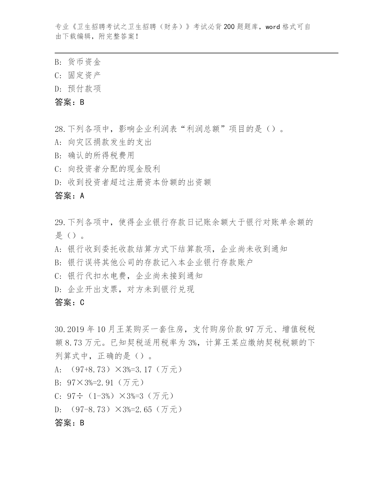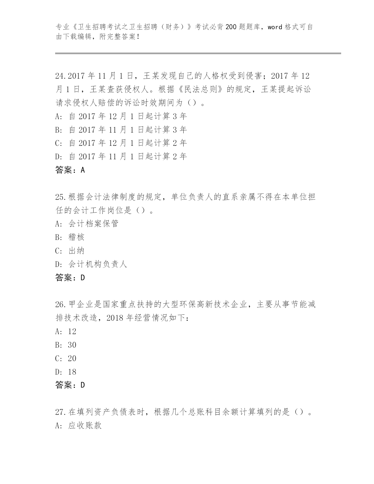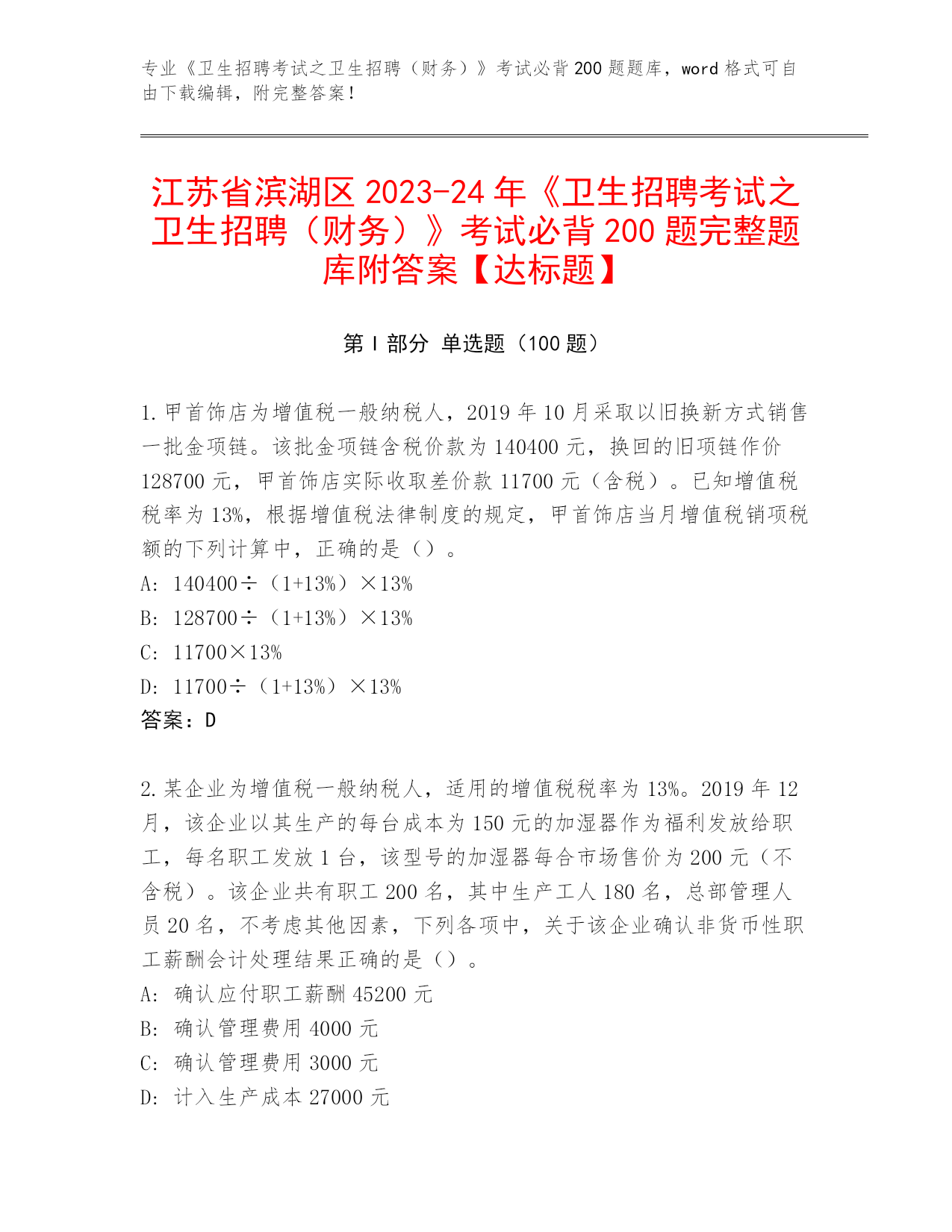 2024江苏省滨湖区《卫生招聘考试之卫生招聘(财务)》资格考试必背200题内部题库附答案(考试直接用)