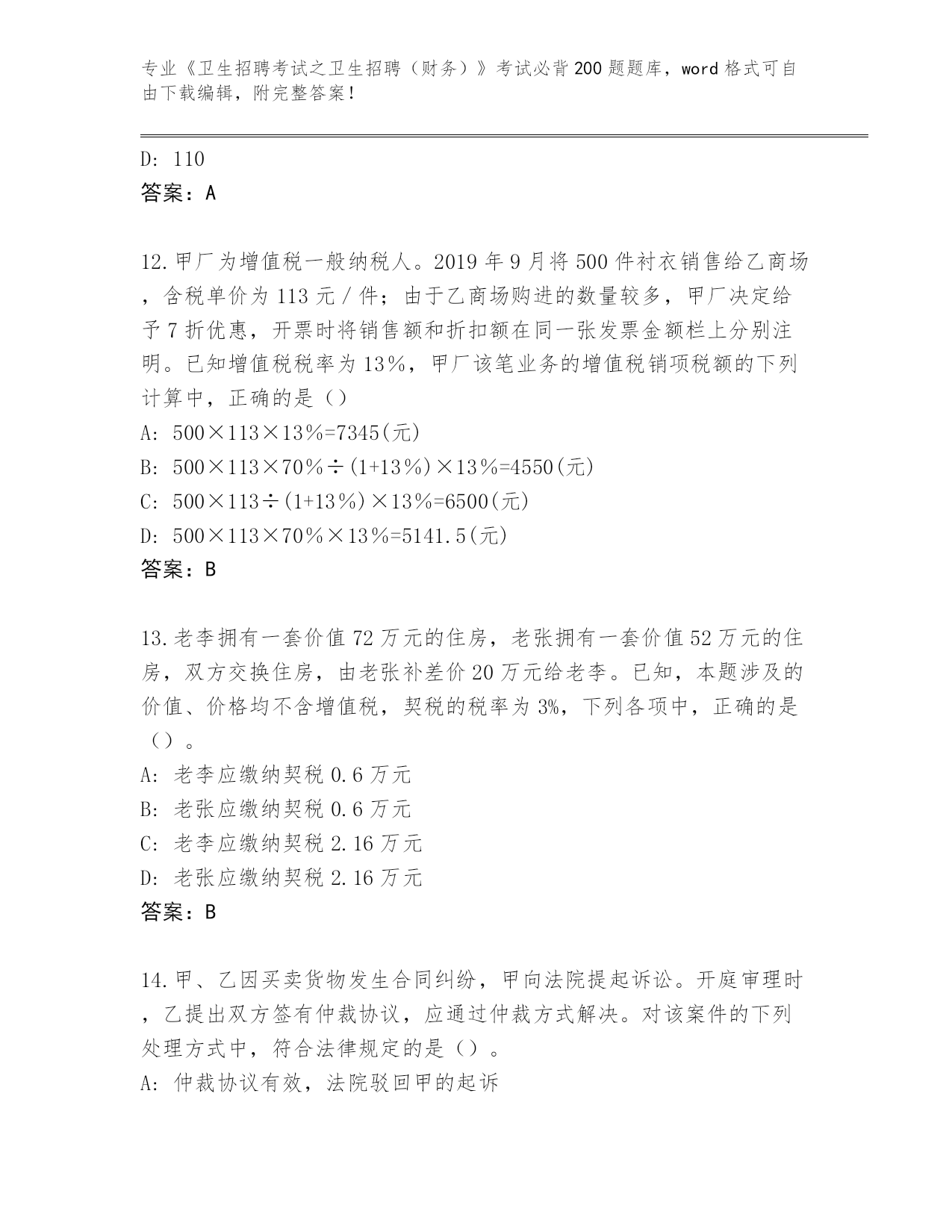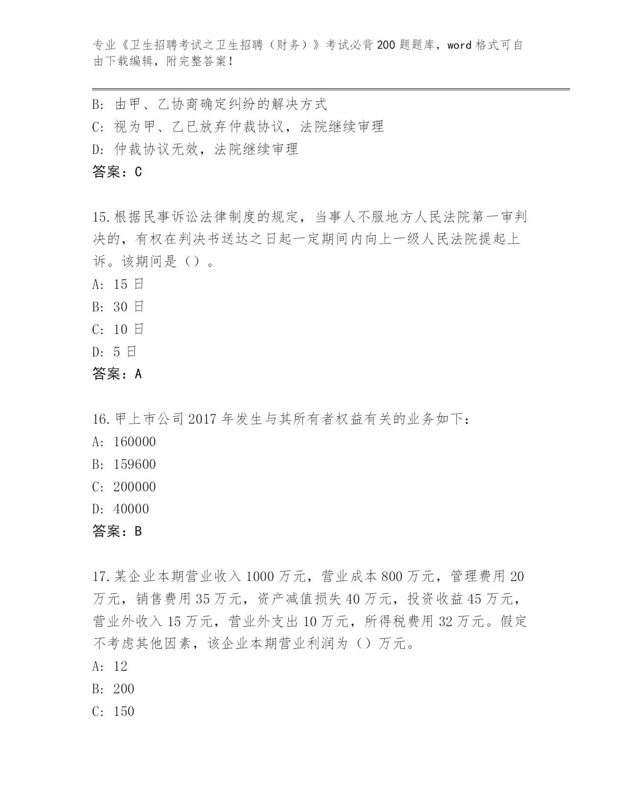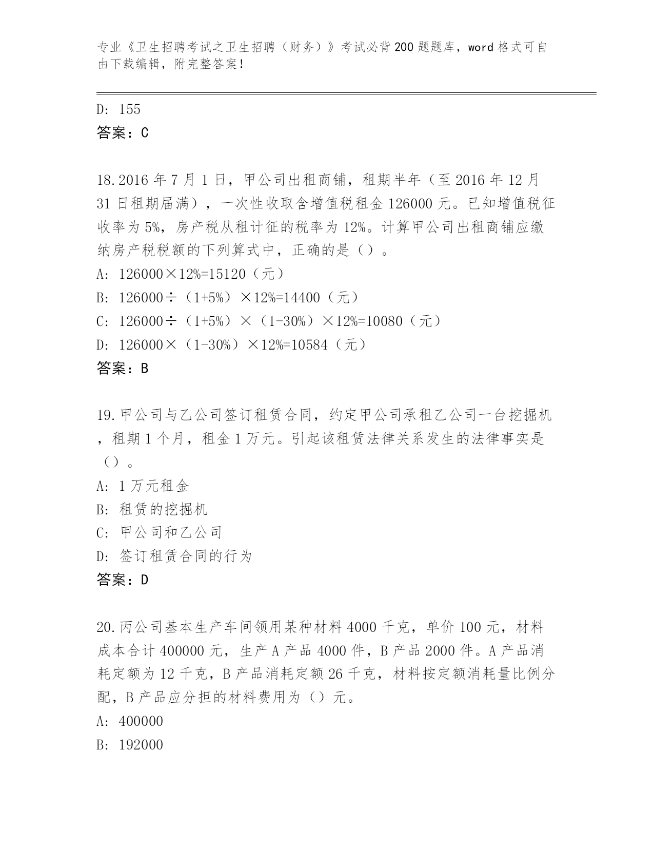 江苏省滨湖区2024年《卫生招聘考试之卫生招聘(财务)》考试必背200题完整题库答案