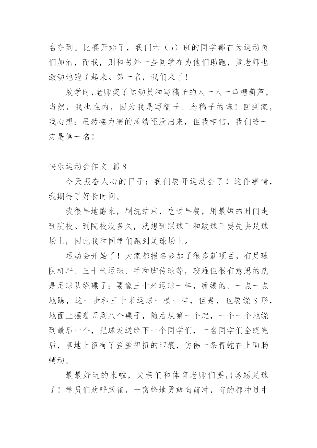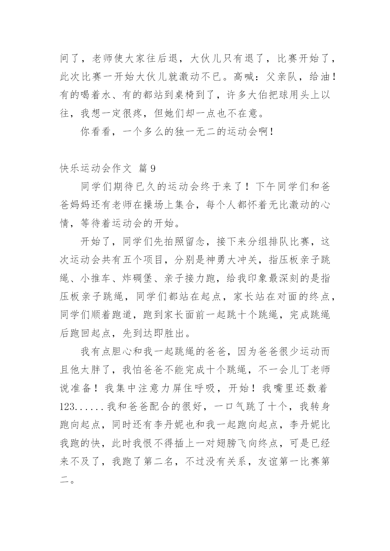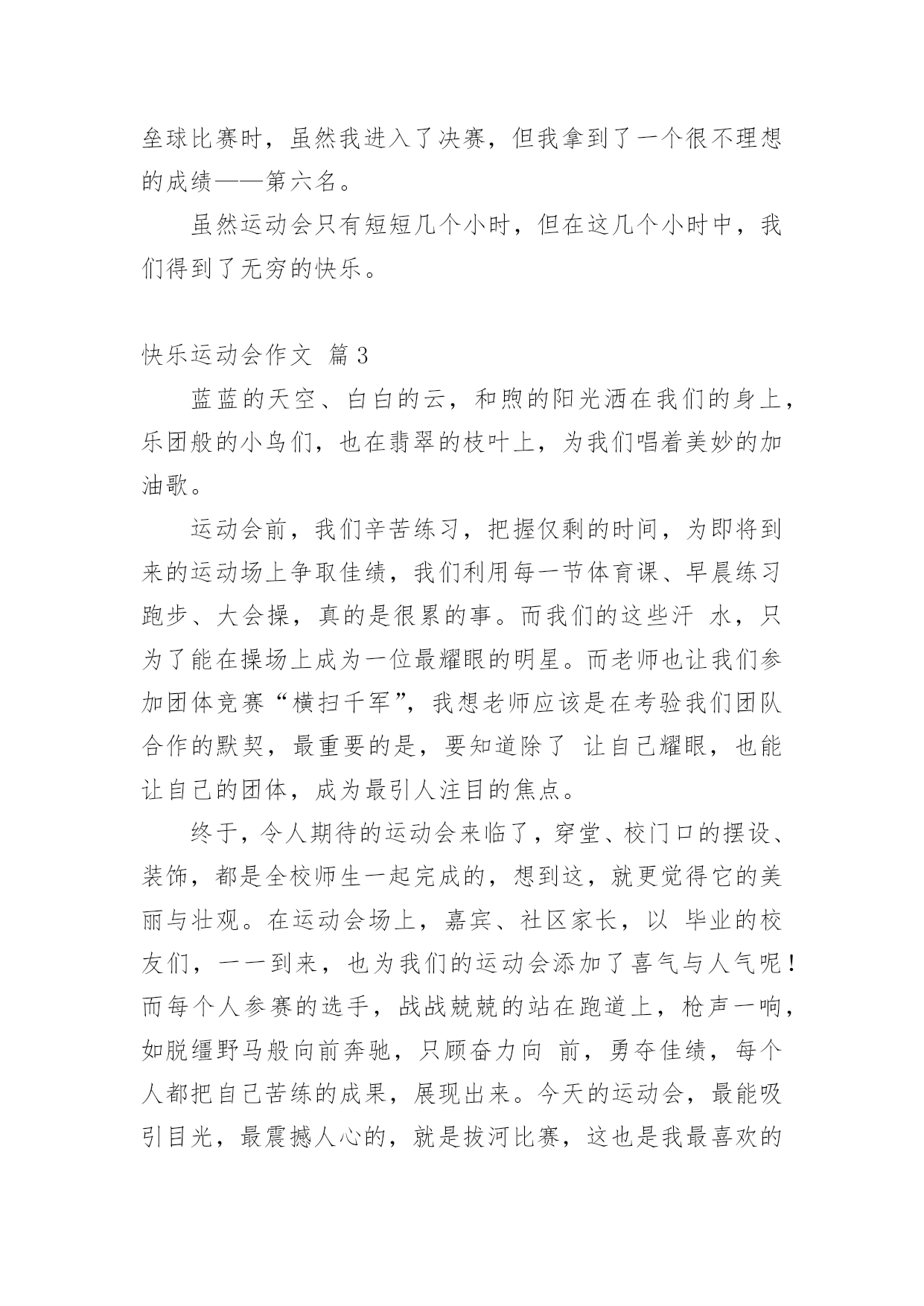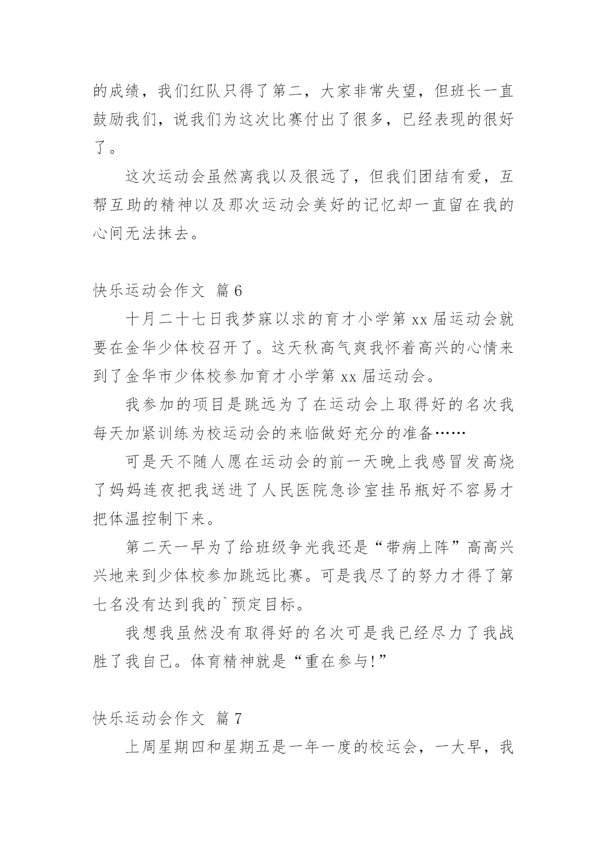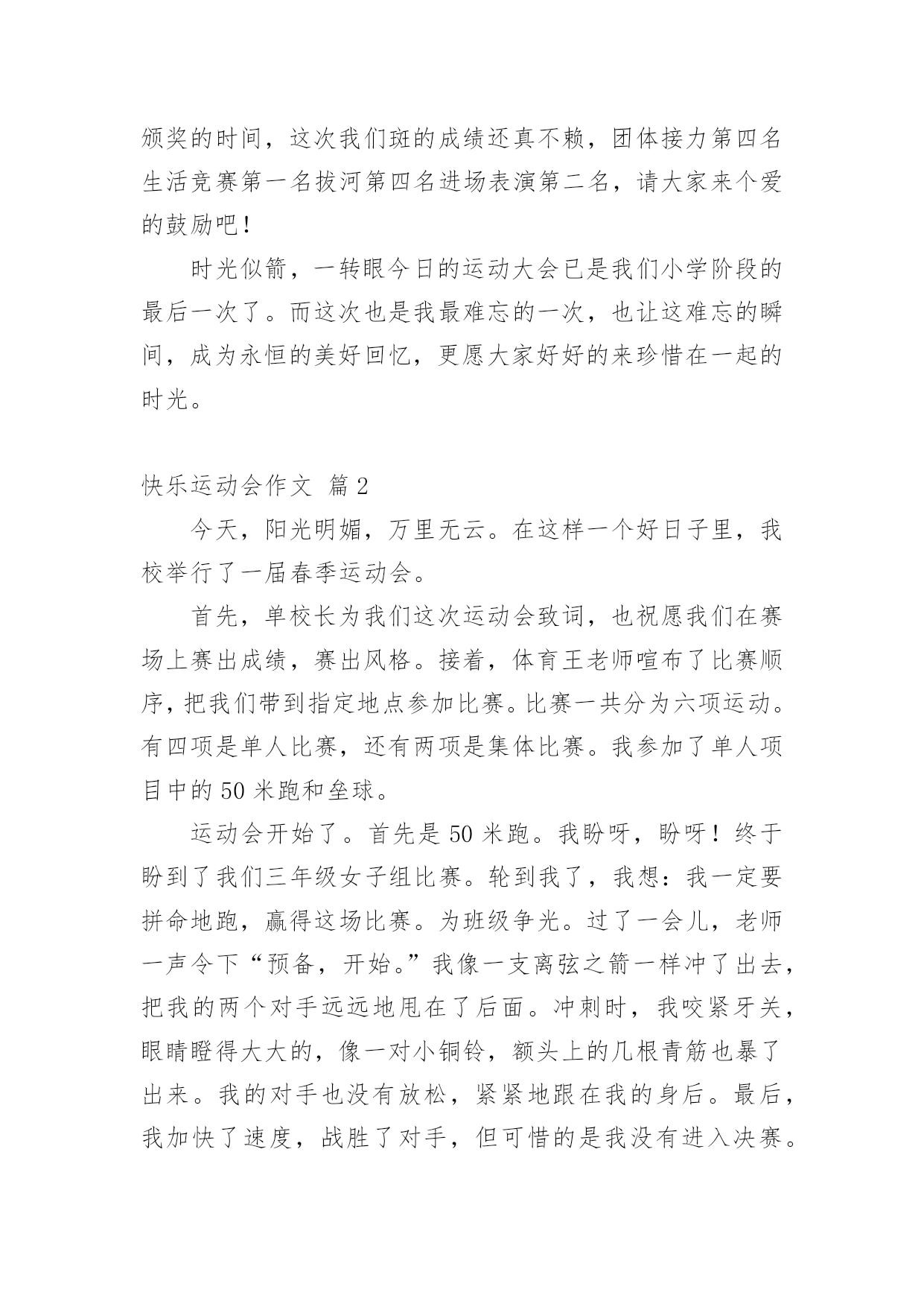 快乐运动会作文快乐运动会作文9篇在学习、工作、生活中,大家对作文都再熟悉不过了吧,通过作文可以把我们那些零零散散的思想,聚集在一块。为了让您在写作文时更加简单方便,下面是小编收集整理的快乐运动会作文9篇,仅供参考,希望能够帮助到大家。快乐运动会作文篇1一大早我兴沖沖的来到了学校,因为今天是我们期盼已久的运动会。听到了广播,大伙手忙脚乱的把桌椅搬到操场,等一切就绪,运动会正式展开,首先学校也邀请了几位武林高手,一边敲鼓一边舞师,也预祝我们大会圆满成功。再来是进场,说到进场,各班使尽浑身解数,各式各样五彩缤纷的造型,更是让人大开眼界而我们全能的六二则是超人的装扮,更难得的是今年我们班还都穿着班服喔接着好戏上场,我们六年级表演的大会操开始啰由于大家的卖力演出,也获得观众不少的掌声。表演后,我们班在休息区也是边唱歌,边欣赏表演,大家的热情也升到了最高点。经过了一个上午的表演,肚子也开始唱空城计了,就在此时,妈妈也正好为我带来我最爱吃的寿司水果和饮料,不但让我填饱肚子,同时也有一股暖流,直入心坎呢到了下午,也就到了紧张的团体接力,一开始大家互不相让,后来班上的同学因跌倒也就被别班追上了,真是有点可惜。最后到了颁奖的时间,这次我们斑的成绩还真不赖,团体接力第四名生活竞赛第一名拔河第四名进场表演第二名,请大家来个爱的鼓励吧!时光似箭,一转眼今日的运动大会已是我们小学阶段的最后一次了。而这次也是我最难忘的一次,也让这难忘的瞬间,成为永恒的美好回忆,更愿大家好好的来珍惜在一起的时光。快乐运动会作文篇2今天,阳光明媚,万里无云。在这样一个好日子里,我校举行了一届春季运动会。首先,单校长为我们这次运动会致词,也祝愿我们在赛场上赛出成绩,赛出风格。接着,体育王老师喧布了比赛顺序,把我们带到指定地点参加比赛。比赛一共分为六项运动。有四项是单人比赛,还有两项是集体比赛。我参加了单人项目中的50米跑和垒球。运动会开始了。首先是50米跑。我盼呀,盼呀!终于盼到了我们三年级女子组比赛。轮到我了,我想:我一定要拼命地跑,赢得这场比赛。为班级争光。过了一会儿,老师一声令下“预备,开始。”我像一支离弦之箭一样冲了出去,把我的两个对手远远地甩在了后面。冲刺时,我咬紧牙关,眼睛瞪得大大的,像一对小铜铃,额头上的几根青筋也暴了出来。我的对手也没有放松,紧紧地跟在我的身后。最后,我加快了速度,战胜了对手,但可惜的是我没有进入决赛。垒球比赛时,虽然我进入了决赛,但我拿到了一个很不理想的成绩——第六名。虽然运动会只有短短几个小时,但在这几个小时中,我们得到了无穷的快乐。快乐运动会作文篇3蓝蓝的天空、白白的云,和煦的阳光洒在我们的身上,乐团般的小鸟们,也在翡翠的枝叶上,为我们唱着美妙的加油歌。运动会前,我们辛苦练习,把握仅剩的时间,为即将到来的运动场上争取佳绩,我们利用每一节体育课、早晨练习跑步、大会操,真的是很累的事。而我们的这些汗水,只为了能在操场上成为一位最耀眼的明星。而老师也让我们参加团体竞赛“横扫千军”,我想老师应该是在考验我们团队合作的默契,最重要的是,要知道除了让自己耀眼,也能让自己的团体,成为最引人注目的焦点。终于,令人期待的运动会来临了,穿堂、校门口的摆设、装饰,都是全校师生一起完成的,想到这,就更觉得它的美丽与壮观。在运动会场上,嘉宾、社区家长,以毕业的校友们,一一到来,也为我们的运动会添加了喜气与人气呢!而每个人参赛的选手,战战兢兢的站在跑道上,枪声一响,如脱缰野马般向前奔驰,只顾奋力向前,勇夺佳绩,每个人都把自己苦练的成果,展现出来。今天的运动会,最能吸引目光,最震撼人心的,就是拔河比赛,这也是我最喜欢的运动,就像蚂蚁一样,一只一只同心协力,考验着我们如何团结合作,赢得胜利。在校园的某一区,和往年不太一样,为了学生的安全,学校特别规划了摊贩区,可以放松一下紧张的心情。哇!数不清的摊贩,使我眼花撩乱,此时我,肚子也早已唱着空城计了,到底是要去这一家还是那一家?怎么比写数学还要难啊!操场上传来阵阵加油声,而这头却是商贩的叫卖声,此起彼落,真是有趣极了!我喜欢运动会,竞赛项目上,恒心、合作是最重要的获胜要诀,而拔河则是讲求同舟共济的精神,同心协力,而非自私自利。我想今天不管输赢如何,最重要的是我们要有“胜不骄,败不馁”的气度,才算是一位真正的运动家。快乐运动会作文篇4今天天气晴朗,操场上杨树、榕树吐出嫩绿的叶子,小花园里的花儿开出了可爱的花朵。我们学校的春季运动会拉开了帷幕。同学们昂首挺胸地进入了各自比赛场地,希望能在这次比赛中大显身手,赛出好成绩。短跑比赛开始了,随着一声枪响,选手们像离弦的箭一般冲出去,他们你追我赶,就像一条飞舞的龙。转眼间,已分出了胜负。长跑就更引人注目了,运动员像豹子一般,驰骋在赛场上。我们班的吴浩诚、吕佳凌、刘轩尔、林利百加、高婷婷