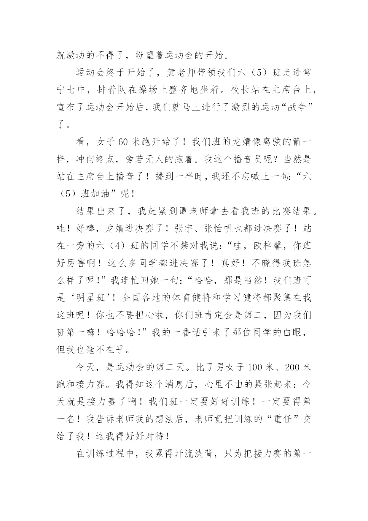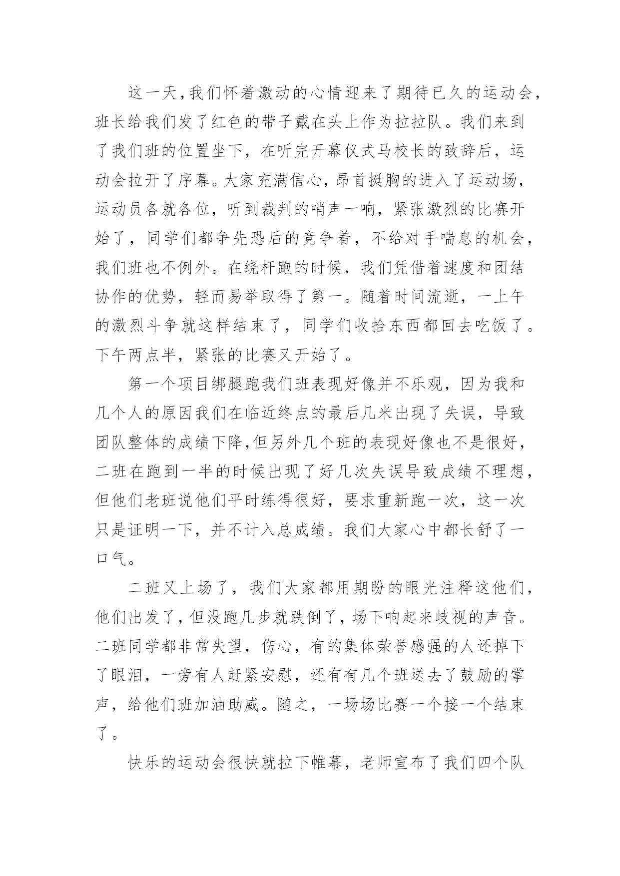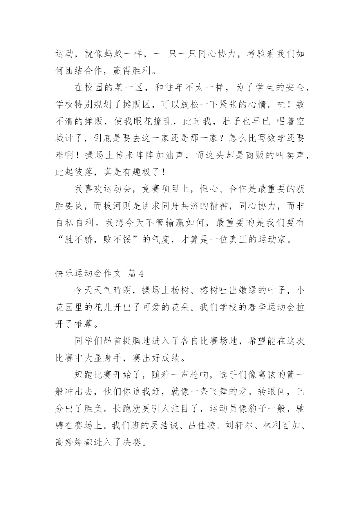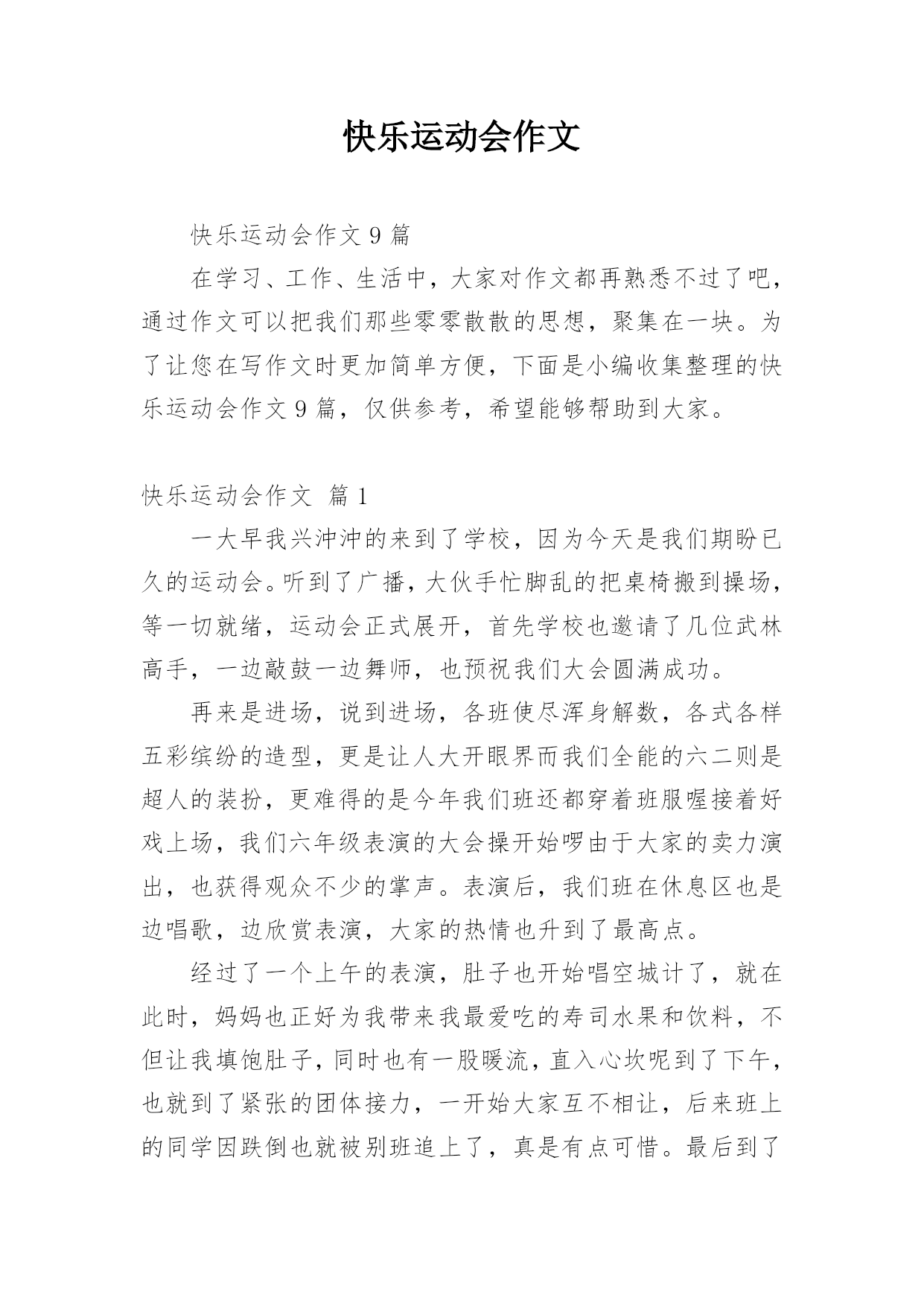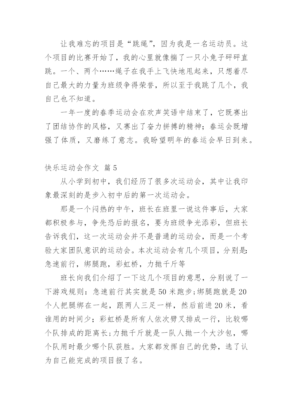 快乐运动会作文快乐运动会作文9篇在学习、工作、生活中,大家对作文都再熟悉不过了吧,通过作文可以把我们那些零零散散的思想,聚集在一块。为了让您在写作文时更加简单方便,下面是小编收集整理的快乐运动会作文9篇,仅供参考,希望能够帮助到大家。快乐运动会作文篇1一大早我兴沖沖的来到了学校,因为今天是我们期盼已久的运动会。听到了广播,大伙手忙脚乱的把桌椅搬到操场,等一切就绪,运动会正式展开,首先学校也邀请了几位武林高手,一边敲鼓一边舞师,也预祝我们大会圆满成功。再来是进场,说到进场,各班使尽浑身解数,各式各样五彩缤纷的造型,更是让人大开眼界而我们全能的六二则是超人的装扮,更难得的是今年我们班还都穿着班服喔接着好戏上场,我们六年级表演的大会操开始啰由于大家的卖力演出,也获得观众不少的掌声。表演后,我们班在休息区也是边唱歌,边欣赏表演,大家的热情也升到了最高点。经过了一个上午的表演,肚子也开始唱空城计了,就在此时,妈妈也正好为我带来我最爱吃的寿司水果和饮料,不但让我填饱肚子,同时也有一股暖流,直入心坎呢到了下午,也就到了紧张的团体接力,一开始大家互不相让,后来班上的同学因跌倒也就被别班追上了,真是有点可惜。最后到了颁奖的时间,这次我们斑的成绩还真不赖,团体接力第四名生活竞赛第一名拔河第四名进场表演第二名,请大家来个爱的鼓励吧!时光似箭,一转眼今日的运动大会已是我们小学阶段的最后一次了。而这次也是我最难忘的一次,也让这难忘的瞬间,成为永恒的美好回忆,更愿大家好好的来珍惜在一起的时光。快乐运动会作文篇2今天,阳光明媚,万里无云。在这样一个好日子里,我校举行了一届春季运动会。首先,单校长为我们这次运动会致词,也祝愿我们在赛场上赛出成绩,赛出风格。接着,体育王老师喧布了比赛顺序,把我们带到指定地点参加比赛。比赛一共分为六项运动。有四项是单人比赛,还有两项是集体比赛。我参加了单人项目中的50米跑和垒球。运动会开始了。首先是50米跑。我盼呀,盼呀!终于盼到了我们三年级女子组比赛。轮到我了,我想:我一定要拼命地跑,赢得这场比赛。为班级争光。过了一会儿,老师一声令下“预备,开始。”我像一支离弦之箭一样冲了出去,把我的两个对手远远地甩在了后面。冲刺时,我咬紧牙关,眼睛瞪得大大的,像一对小铜铃,额头上的几根青筋也暴了出来。我的对手也没有放松,紧紧地跟在我的身后。最后,我加快了速度,战胜了对手,但可惜的是我没有进入决赛。垒球比赛时,虽然我进入了决赛,但我拿到了一个很不理想的成绩——第六名。虽然运动会只有短短几个小时,但在这几个小时中,我们得到了无穷的快乐。快乐运动会作文篇3蓝蓝的天空、白白的云,和煦的阳光洒在我们的身上,乐团般的小鸟们,也在翡翠的枝叶上,为我们唱着美妙的加油歌。运动会前,我们辛苦练习,把握仅剩的时间,为即将到来的运动场上争取佳绩,我们利用每一节体育课、早晨练习跑步、大会操,真的是很累的事。而我们的这些汗水,只为了能在操场上成为一位最耀眼的明星。而老师也让我们参加团体竞赛“横扫千军”,我想老师应该是在考验我们团队合作的默契,最重要的是,要知道除了让自己耀眼,也能让自己的团体,成为最引人注目的焦点。终于,令人期待的运动会来临了,穿堂、校门口的摆设、装饰,都是全校师生一起完成的,想到这,就更觉得它的美丽与壮观。在运动会场上,嘉宾、社区家长,以毕业的校友们,一一到来,也为我们的运动会添加了喜气与人气呢!而每个人参赛的选手,战战兢兢的站在跑道上,枪声一响,如脱缰野马般向前奔驰,只顾奋力向前,勇夺佳绩,每个人都把自己苦练的成果,展现出来。今天的运动会,最能吸引目光,最震撼人心的,就是拔河比赛,这也是我最喜欢的运动,就像蚂蚁一样,一只一只同心协力,考验着我们如何团结合作,赢得胜利。在校园的某一区,和往年不太一样,为了学生的安全,学校特别规划了摊贩区,可以放松一下紧张的心情。哇!数不清的摊贩,使我眼花撩乱,此时我,肚子也早已唱着空城计了,到底是要去这一家还是那一家?怎么比写数学还要难啊!操场上传来阵阵加油声,而这头却是商贩的叫卖声,此起彼落,真是有趣极了!我喜欢运动会,竞赛项目上,恒心、合作是最重要的获胜要诀,而拔河则是讲求同舟共济的精神,同心协力,而非自私自利。我想今天不管输赢如何,最重要的是我们要有“胜不骄,败不馁”的气度,才算是一位真正的运动家。快乐运动会作文篇4今天天气晴朗,操场上杨树、榕树吐出嫩绿的叶子,小花园里的花儿开出了可爱的花朵。我们学校的春季运动会拉开了帷幕。同学们昂首挺胸地进入了各自比赛场地,希望能在这次比赛中大显身手,赛出好成绩。短跑比赛开始了,随着一声枪响,选手们像离弦的箭一般冲出去,他们你追我赶,就像一条飞舞的龙。转眼间,已分出了胜负。长跑就更引人注目了,运动员像豹子一般,驰骋在赛场上。我们班的吴浩诚、吕佳凌、刘轩尔、林利百加、高婷婷