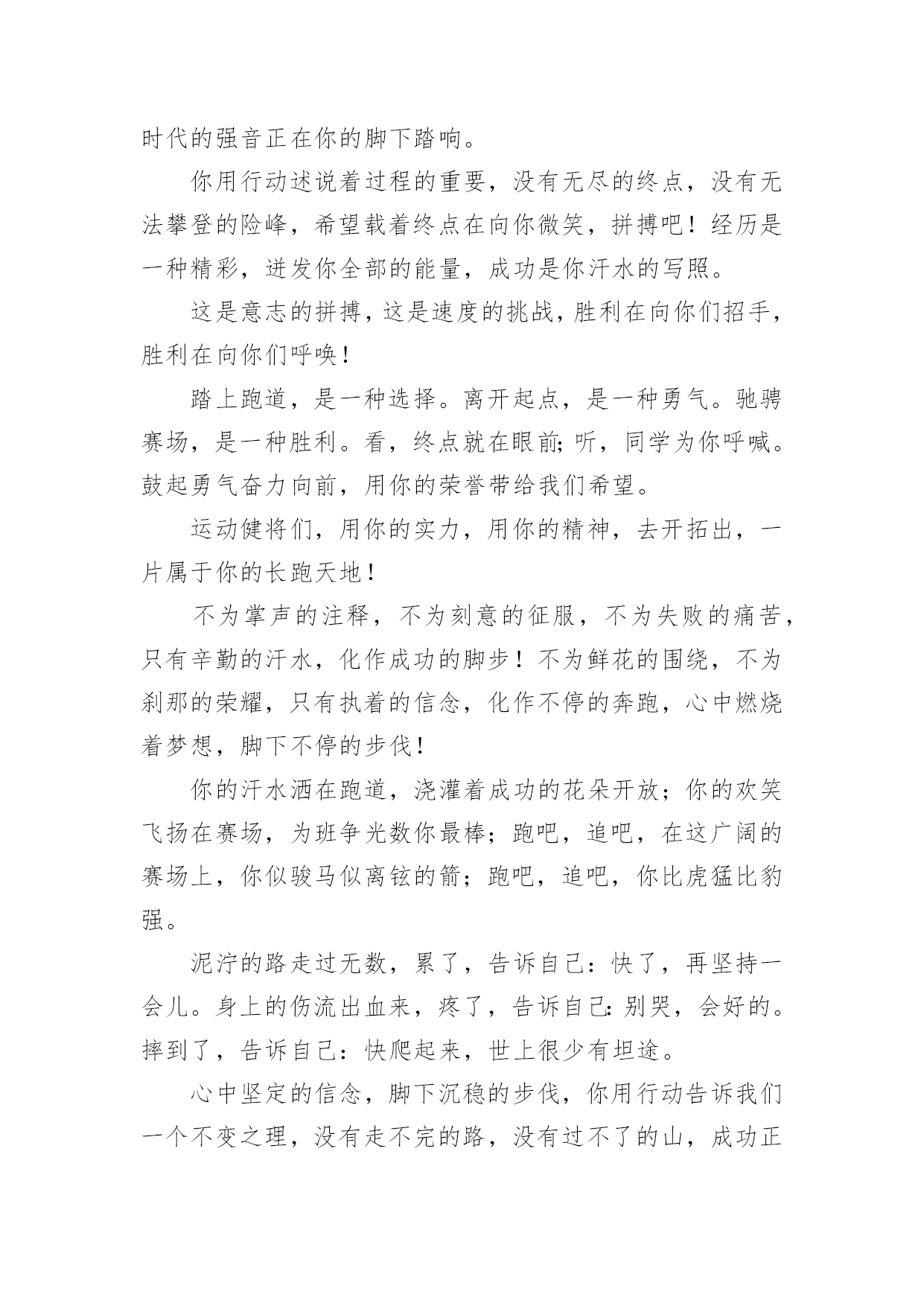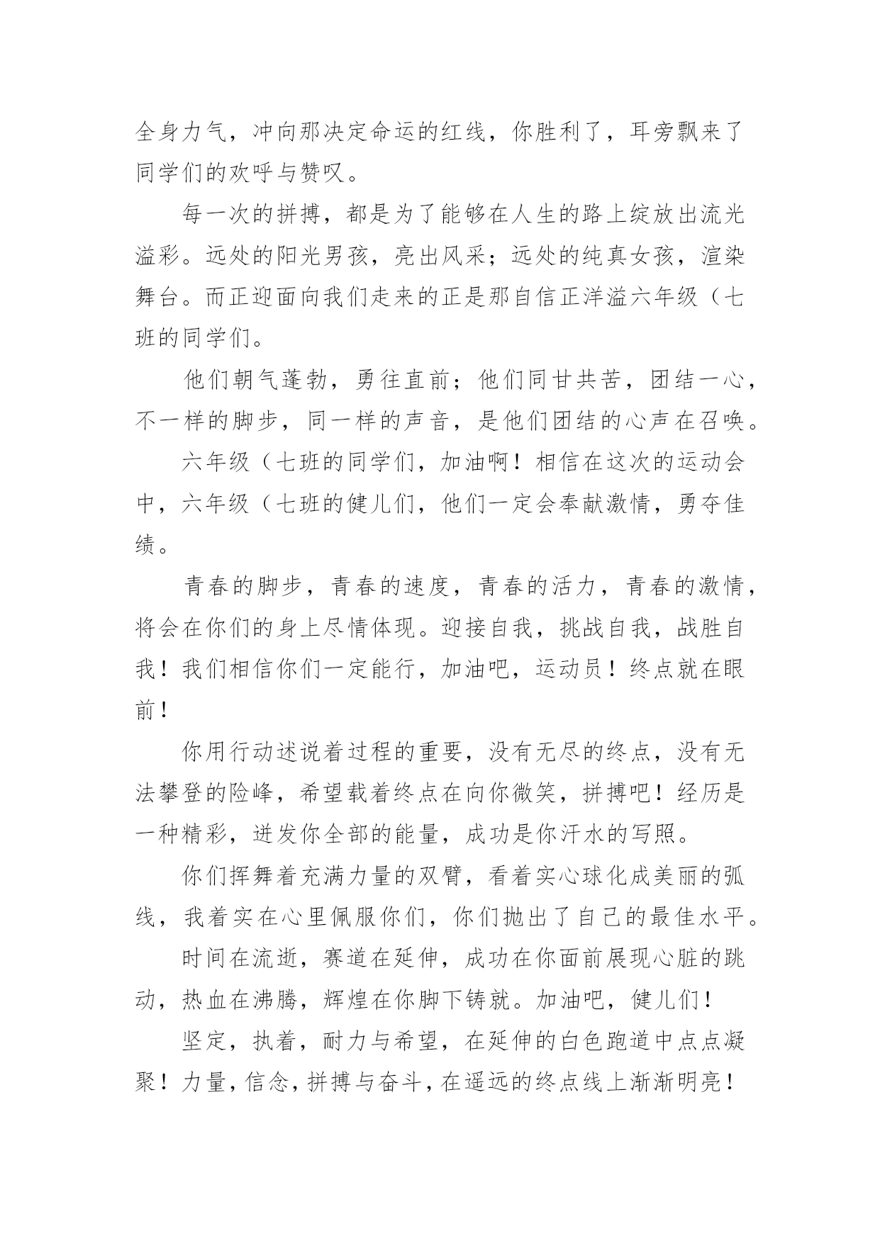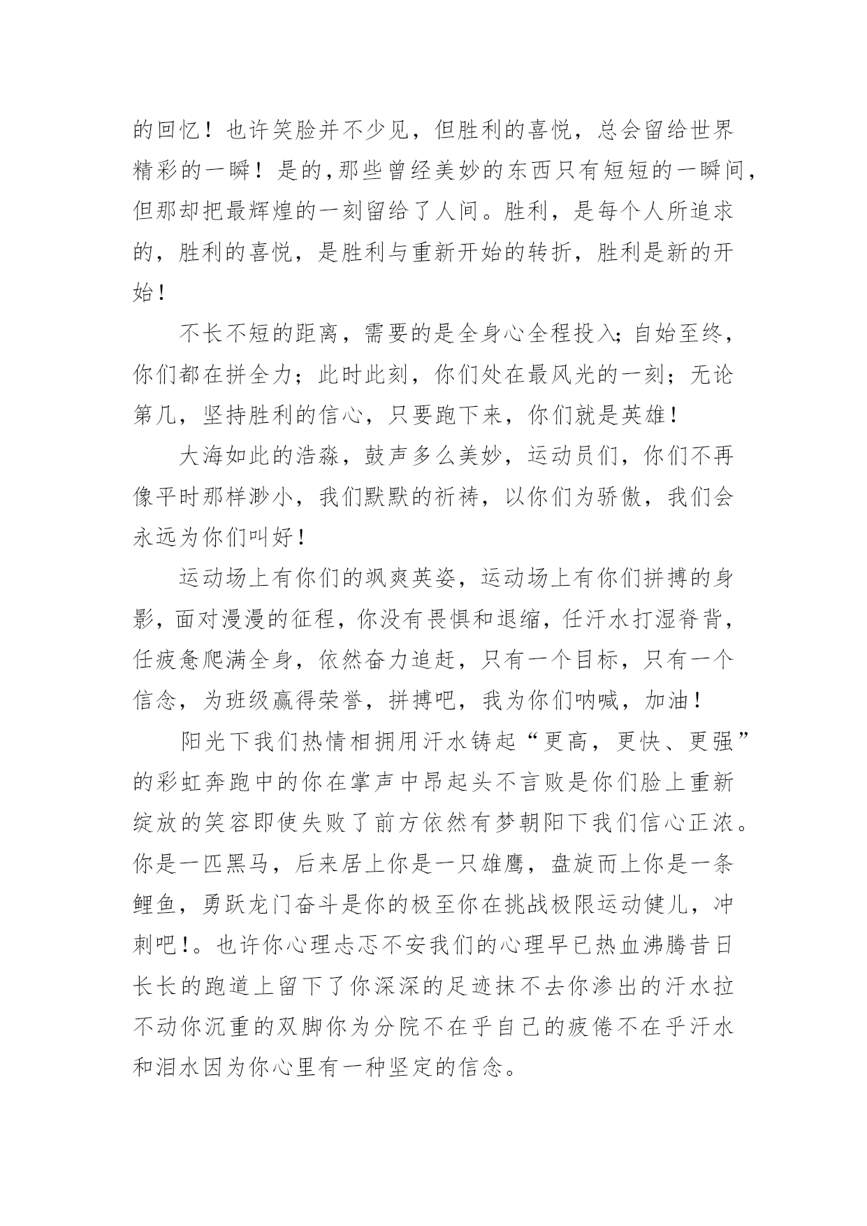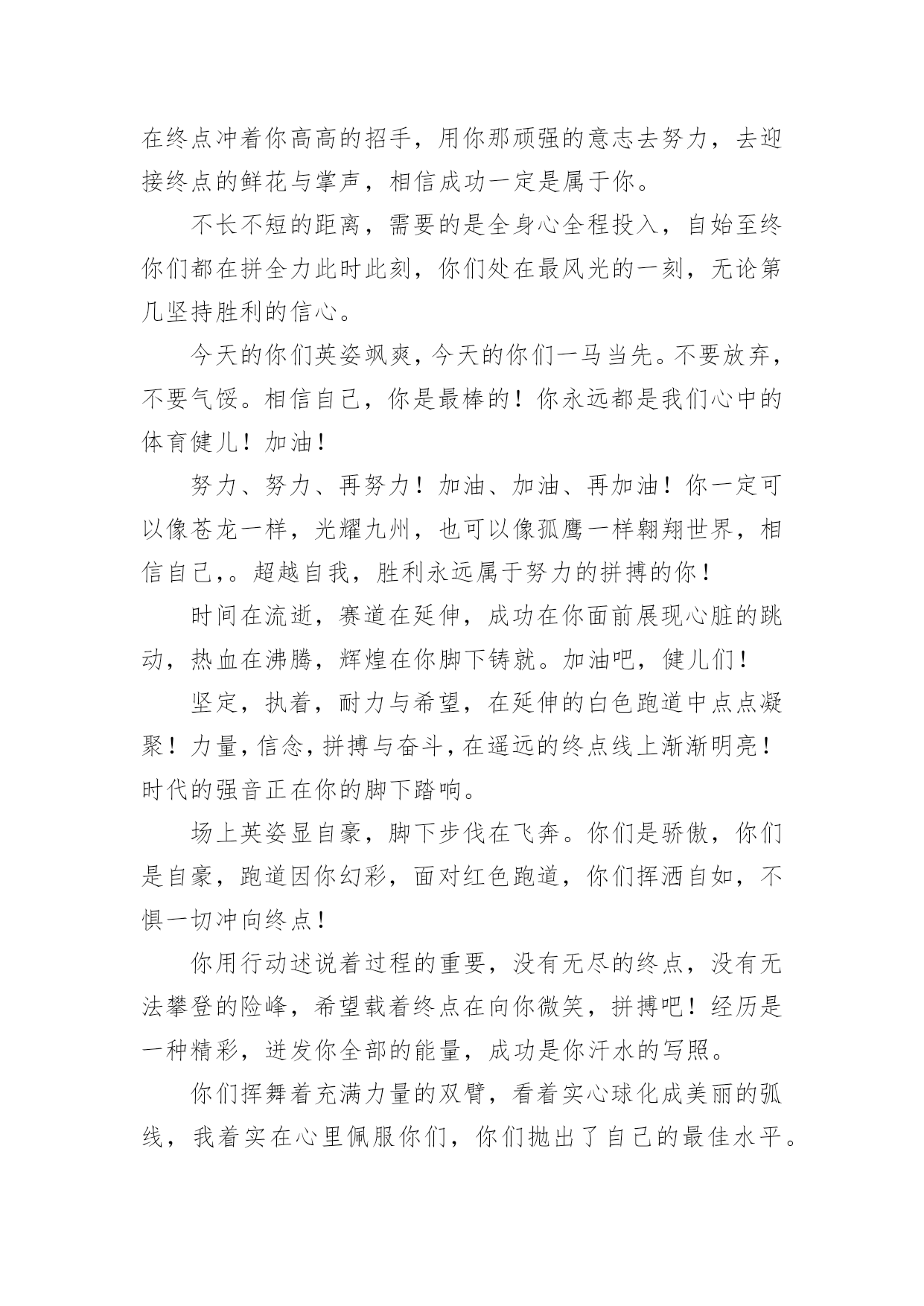 运动会加油稿运动会加油稿在快速变化和不断变革的今天,需要使用加油稿的情况越来越多,加油稿可以增添对方必胜的勇气和信心。那要怎么写好加油稿呢?下面是小编精心整理的运动会加油稿,欢迎大家分享。运动会加油稿1运动场上有你们的飒爽英姿,运动场上有你们拼搏的身影,面对漫漫的`征程,你没有畏惧和退缩,任汗水打湿脊背,任疲惫爬满全身,依然分离追赶,只有一个目标,只有一个信念,为班级赢得荣誉,拼搏吧,我为你们呐喊,加油!运动会加油稿2有些运动员,就只是来充充数的,就像我,在这些比赛当中,一般不太会进入决赛;而有些运动员,则是那些有实力的运动员,总是可以得名次。总而言之,我们应该养成平时爱锻炼身体的好习惯:早上锻炼身体是为了健身,中午锻炼身体是为了消化,晚上锻炼身体是为了放松心情。让我们都变成爱运动、健康的好孩子吧!心中坚定的信念,脚下沉稳的步伐,你用行动告诉我们一个不变之理,没有走不完的路,没有过不了的山,成功正在终点冲着你高高的招手,用你那顽强的意志去努力,去迎接终点的鲜花与掌声,相信成功一定是属于你。在秋高气爽的季节,校园今日特别热闹。一圈圈跑道,米米诉说着自豪。健儿在“年轮”上赛跑,催促学子抓紧一分一秒。只要拼尽全力,理想的目标定会来到。流泪不是失落,徘徊不是迷惑,成功属于那些战胜失败,坚持不懈、勇于追求梦想的人。加油吧,运动健儿们!米不算长,人生贵在拼一场。健儿奔跑比健康,同龄同路谁最强!风采撒满跑道上,赛场佳绩美名扬!我们跃过春天的原野,我们迎过秋天的落叶,我们穿过弯曲的小巷,我们跑过宽阔的大街,每天早起和朝霞,每天傍晚把晚霞采撷,今天我们要飞过银色的跑道,向前!向前!向前!把记录刷出新的一页。不长不短的距离,需要的是全身心全程投入;自始至终,你们都在拼全力;此时此刻,你们处在最风光的一刻;无论第几,坚持胜利的信心,只要跑下来,你们就是英雄!你用行动述说着过程的重要,没有无尽的终点,没有无法攀登的险峰,希望载着终点在向你微笑,拼搏吧!经历是一种精彩,迸发你全部的能量,成功是你汗水的写照。望着远方红色的终点线,那是汗水铺成的路,泪水堆成的山,平时的努力与奋战,不就为这一瞬间,于是你们用尽全身力气,冲向那决定命运的红线,你胜利了,耳旁飘来了同学们的欢呼与赞叹。每一次的拼搏,都是为了能够在人生的路上绽放出流光溢彩。远处的阳光男孩,亮出风采;远处的纯真女孩,渲染舞台。而正迎面向我们走来的正是那自信正洋溢六年级(七班的同学们。他们朝气蓬勃,勇往直前;他们同甘共苦,团结一心,不一样的脚步,同一样的声音,是他们团结的心声在召唤。六年级(七班的同学们,加油啊!相信在这次的运动会中,六年级(七班的健儿们,他们一定会奉献激情,勇夺佳绩。青春的脚步,青春的速度,青春的活力,青春的激情,将会在你们的身上尽情体现。迎接自我,挑战自我,战胜自我!我们相信你们一定能行,加油吧,运动员!终点就在眼前!你用行动述说着过程的重要,没有无尽的终点,没有无法攀登的险峰,希望载着终点在向你微笑,拼搏吧!经历是一种精彩,迸发你全部的能量,成功是你汗水的写照。你们挥舞着充满力量的双臂,看着实心球化成美丽的弧线,我着实在心里佩服你们,你们抛出了自己的最佳水平。时间在流逝,赛道在延伸,成功在你面前展现心脏的跳动,热血在沸腾,辉煌在你脚下铸就。加油吧,健儿们!坚定,执着,耐力与希望,在延伸的白色跑道中点点凝聚!力量,信念,拼搏与奋斗,在遥远的终点线上渐渐明亮!时代的强音正在你的脚下踏响。你用行动述说着过程的重要,没有无尽的终点,没有无法攀登的险峰,希望载着终点在向你微笑,拼搏吧!经历是一种精彩,迸发你全部的能量,成功是你汗水的写照。这是意志的拼搏,这是速度的挑战,胜利在向你们招手,胜利在向你们呼唤!踏上跑道,是一种选择。离开起点,是一种勇气。驰骋赛场,是一种胜利。看,终点就在眼前;听,同学为你呼喊。鼓起勇气奋力向前,用你的荣誉带给我们希望。运动健将们,用你的实力,用你的精神,去开拓出,一片属于你的长跑天地!不为掌声的注释,不为刻意的征服,不为失败的痛苦,只有辛勤的汗水,化作成功的脚步!不为鲜花的围绕,不为刹那的荣耀,只有执着的信念,化作不停的奔跑,心中燃烧着梦想,脚下不停的步伐!你的汗水洒在跑道,浇灌着成功的花朵开放;你的欢笑飞扬在赛场,为班争光数你最棒;跑吧,追吧,在这广阔的赛场上,你似骏马似离铉的箭;跑吧,追吧,你比虎猛比豹强。泥泞的路走过无数,累了,告诉自己:快了,再坚持一会儿。身上的伤流出血来,疼了,告诉自己:别哭,会好的。摔到了,告诉自己:快爬起来,世上很少有坦途。心中坚定的信念,脚下沉稳的步伐,你用行动告诉我们一个不变之理,没有走不完的路,没有过不了的山,成功正在终点冲着你高高的招手,用你那顽强的意志去努力,去迎接终点的鲜花与掌声,相信成功一定是属于你。不长不短的距离