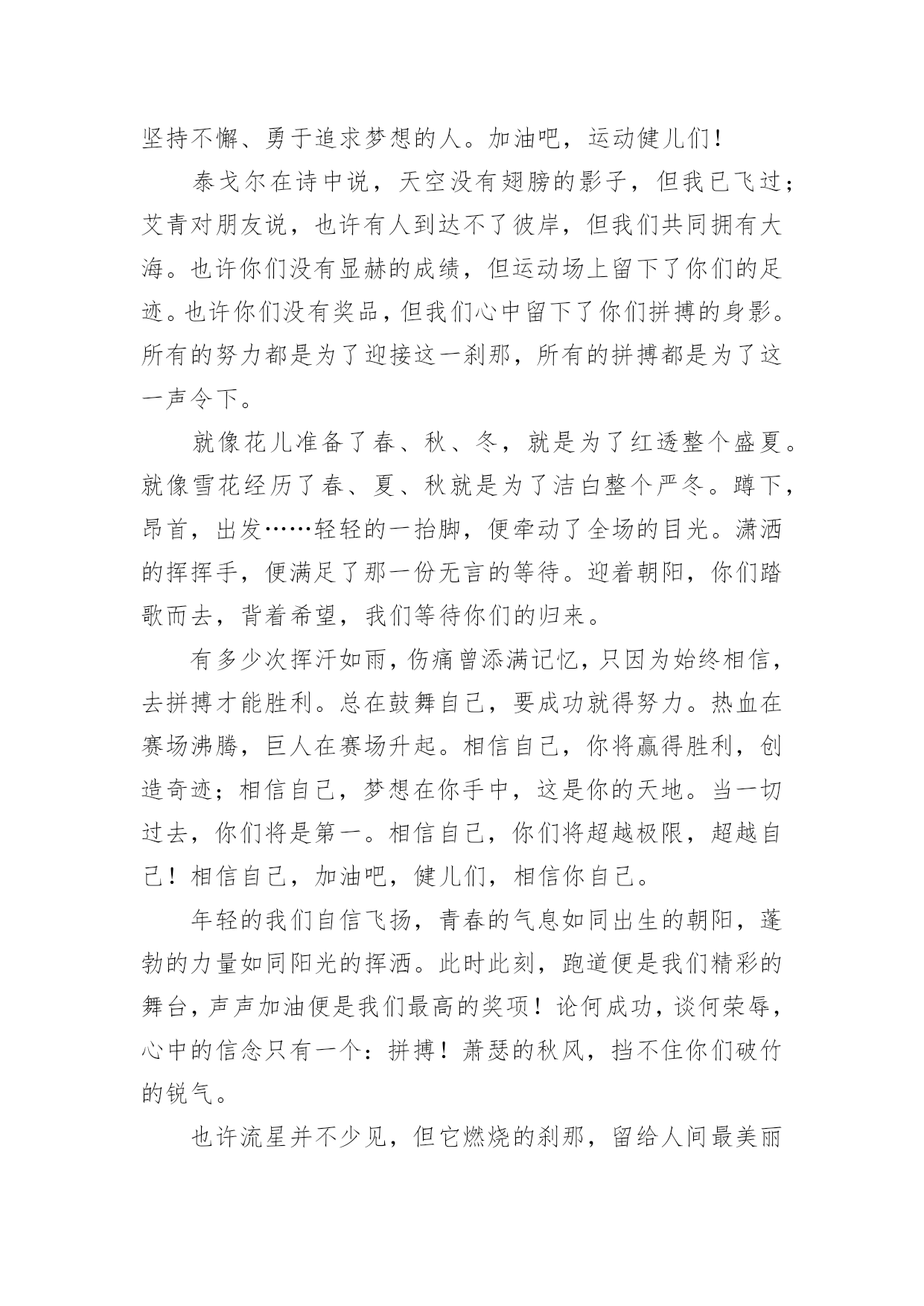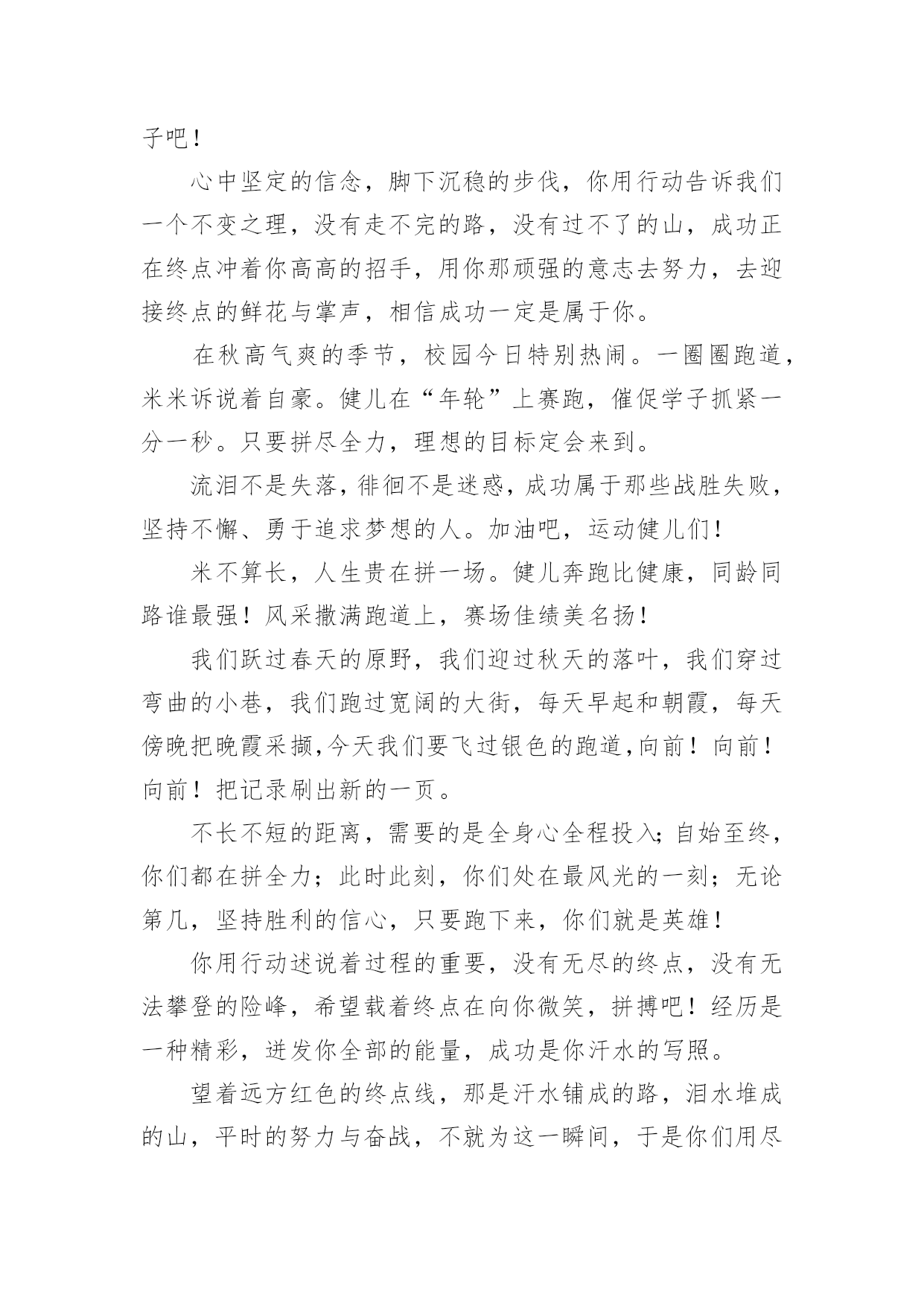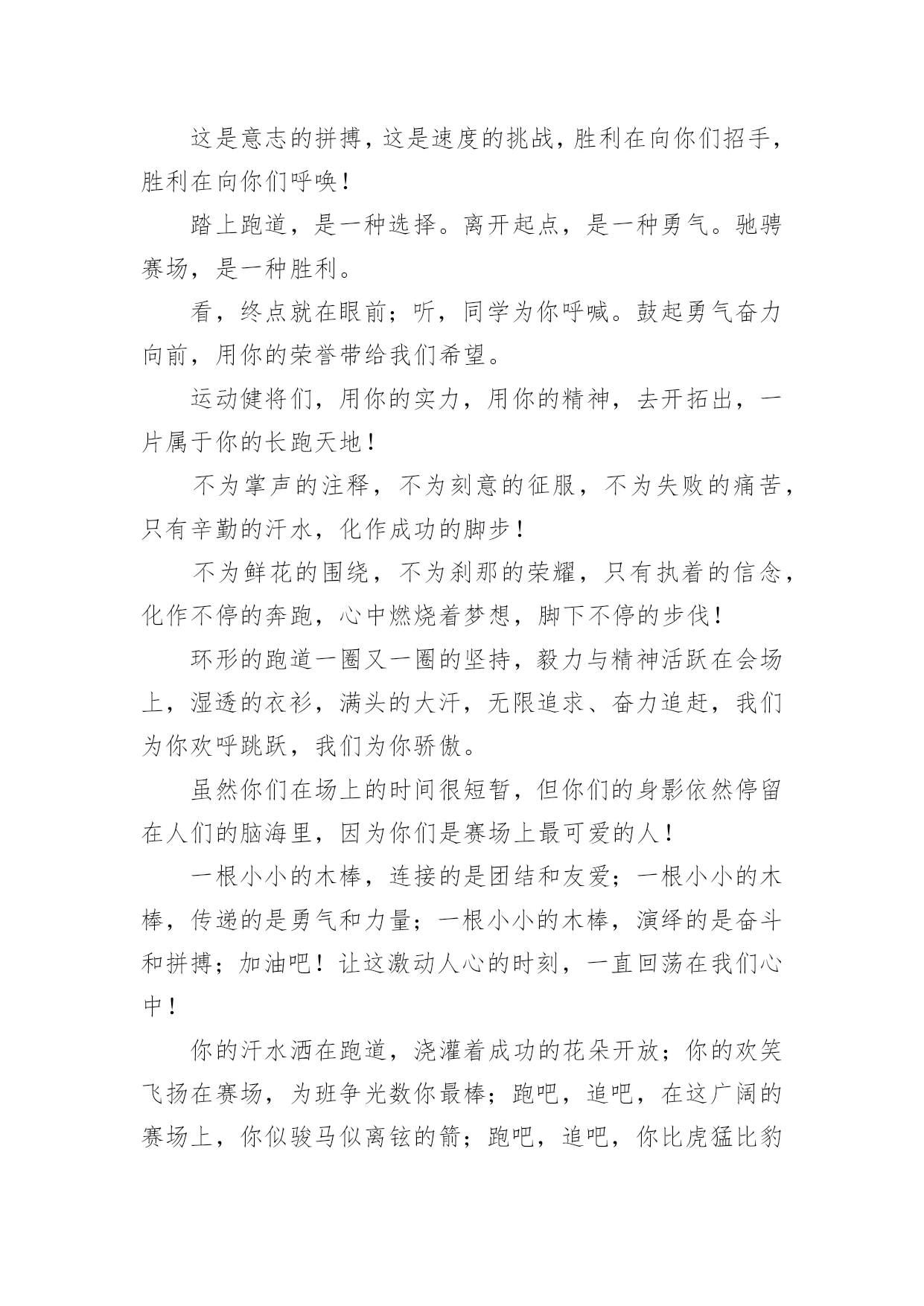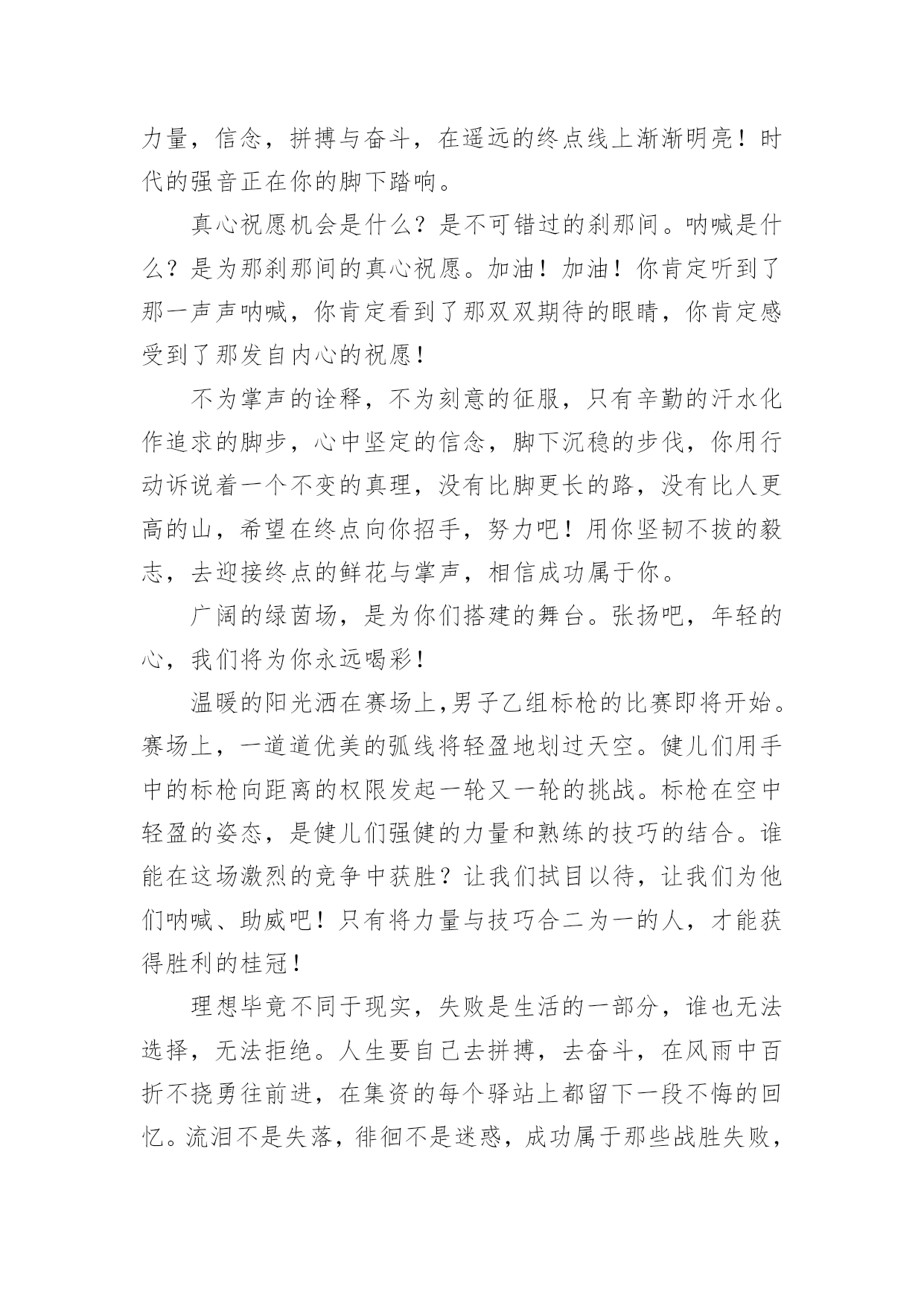 运动会加油稿运动会加油稿在快速变化和不断变革的今天,需要使用加油稿的情况越来越多,加油稿可以增添对方必胜的勇气和信心。那要怎么写好加油稿呢?下面是小编精心整理的运动会加油稿,欢迎大家分享。运动会加油稿1运动场上有你们的飒爽英姿,运动场上有你们拼搏的身影,面对漫漫的`征程,你没有畏惧和退缩,任汗水打湿脊背,任疲惫爬满全身,依然分离追赶,只有一个目标,只有一个信念,为班级赢得荣誉,拼搏吧,我为你们呐喊,加油!运动会加油稿2有些运动员,就只是来充充数的,就像我,在这些比赛当中,一般不太会进入决赛;而有些运动员,则是那些有实力的运动员,总是可以得名次。总而言之,我们应该养成平时爱锻炼身体的好习惯:早上锻炼身体是为了健身,中午锻炼身体是为了消化,晚上锻炼身体是为了放松心情。让我们都变成爱运动、健康的好孩子吧!心中坚定的信念,脚下沉稳的步伐,你用行动告诉我们一个不变之理,没有走不完的路,没有过不了的山,成功正在终点冲着你高高的招手,用你那顽强的意志去努力,去迎接终点的鲜花与掌声,相信成功一定是属于你。在秋高气爽的季节,校园今日特别热闹。一圈圈跑道,米米诉说着自豪。健儿在“年轮”上赛跑,催促学子抓紧一分一秒。只要拼尽全力,理想的目标定会来到。流泪不是失落,徘徊不是迷惑,成功属于那些战胜失败,坚持不懈、勇于追求梦想的人。加油吧,运动健儿们!米不算长,人生贵在拼一场。健儿奔跑比健康,同龄同路谁最强!风采撒满跑道上,赛场佳绩美名扬!我们跃过春天的原野,我们迎过秋天的落叶,我们穿过弯曲的小巷,我们跑过宽阔的大街,每天早起和朝霞,每天傍晚把晚霞采撷,今天我们要飞过银色的跑道,向前!向前!向前!把记录刷出新的一页。不长不短的距离,需要的是全身心全程投入;自始至终,你们都在拼全力;此时此刻,你们处在最风光的一刻;无论第几,坚持胜利的信心,只要跑下来,你们就是英雄!你用行动述说着过程的重要,没有无尽的终点,没有无法攀登的险峰,希望载着终点在向你微笑,拼搏吧!经历是一种精彩,迸发你全部的能量,成功是你汗水的写照。望着远方红色的终点线,那是汗水铺成的路,泪水堆成的山,平时的努力与奋战,不就为这一瞬间,于是你们用尽全身力气,冲向那决定命运的红线,你胜利了,耳旁飘来了同学们的欢呼与赞叹。每一次的拼搏,都是为了能够在人生的路上绽放出流光溢彩。远处的阳光男孩,亮出风采;远处的纯真女孩,渲染舞台。而正迎面向我们走来的正是那自信正洋溢六年级(七班的同学们。他们朝气蓬勃,勇往直前;他们同甘共苦,团结一心,不一样的脚步,同一样的声音,是他们团结的心声在召唤。六年级(七班的同学们,加油啊!相信在这次的运动会中,六年级(七班的健儿们,他们一定会奉献激情,勇夺佳绩。青春的脚步,青春的速度,青春的活力,青春的激情,将会在你们的身上尽情体现。迎接自我,挑战自我,战胜自我!我们相信你们一定能行,加油吧,运动员!终点就在眼前!你用行动述说着过程的重要,没有无尽的终点,没有无法攀登的险峰,希望载着终点在向你微笑,拼搏吧!经历是一种精彩,迸发你全部的能量,成功是你汗水的写照。你们挥舞着充满力量的双臂,看着实心球化成美丽的弧线,我着实在心里佩服你们,你们抛出了自己的最佳水平。时间在流逝,赛道在延伸,成功在你面前展现心脏的跳动,热血在沸腾,辉煌在你脚下铸就。加油吧,健儿们!坚定,执着,耐力与希望,在延伸的白色跑道中点点凝聚!力量,信念,拼搏与奋斗,在遥远的终点线上渐渐明亮!时代的强音正在你的脚下踏响。你用行动述说着过程的重要,没有无尽的终点,没有无法攀登的险峰,希望载着终点在向你微笑,拼搏吧!经历是一种精彩,迸发你全部的能量,成功是你汗水的写照。这是意志的拼搏,这是速度的挑战,胜利在向你们招手,胜利在向你们呼唤!踏上跑道,是一种选择。离开起点,是一种勇气。驰骋赛场,是一种胜利。看,终点就在眼前;听,同学为你呼喊。鼓起勇气奋力向前,用你的荣誉带给我们希望。运动健将们,用你的实力,用你的精神,去开拓出,一片属于你的长跑天地!不为掌声的注释,不为刻意的征服,不为失败的痛苦,只有辛勤的汗水,化作成功的脚步!不为鲜花的围绕,不为刹那的荣耀,只有执着的信念,化作不停的奔跑,心中燃烧着梦想,脚下不停的步伐!你的汗水洒在跑道,浇灌着成功的花朵开放;你的欢笑飞扬在赛场,为班争光数你最棒;跑吧,追吧,在这广阔的赛场上,你似骏马似离铉的箭;跑吧,追吧,你比虎猛比豹强。泥泞的路走过无数,累了,告诉自己:快了,再坚持一会儿。身上的伤流出血来,疼了,告诉自己:别哭,会好的。摔到了,告诉自己:快爬起来,世上很少有坦途。心中坚定的信念,脚下沉稳的步伐,你用行动告诉我们一个不变之理,没有走不完的路,没有过不了的山,成功正在终点冲着你高高的招手,用你那顽强的意志去努力,去迎接终点的鲜花与掌声,相信成功一定是属于你。不长不短的距离