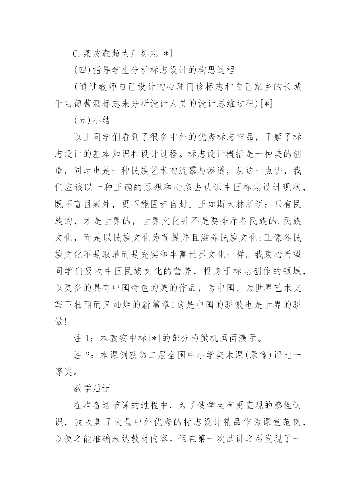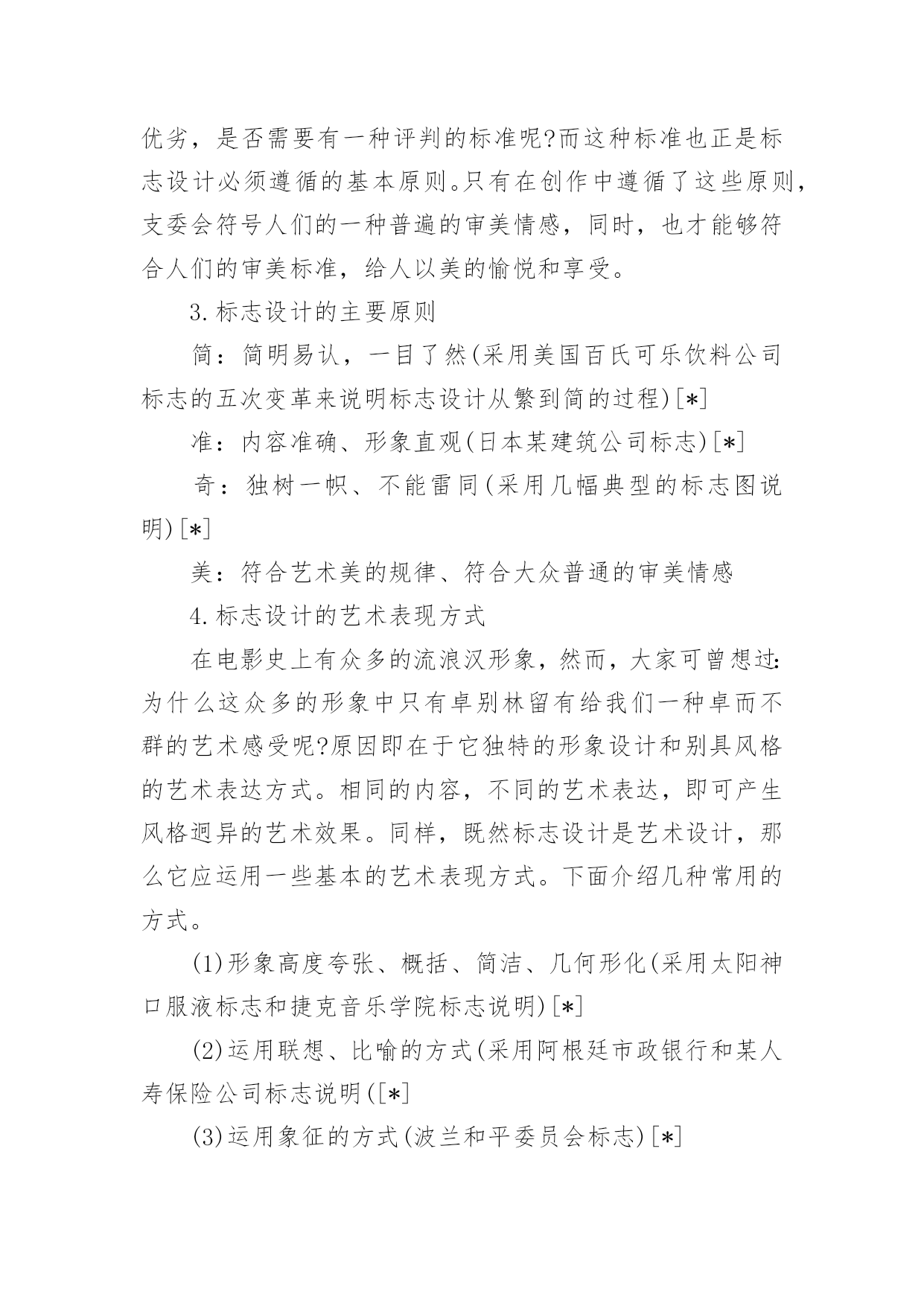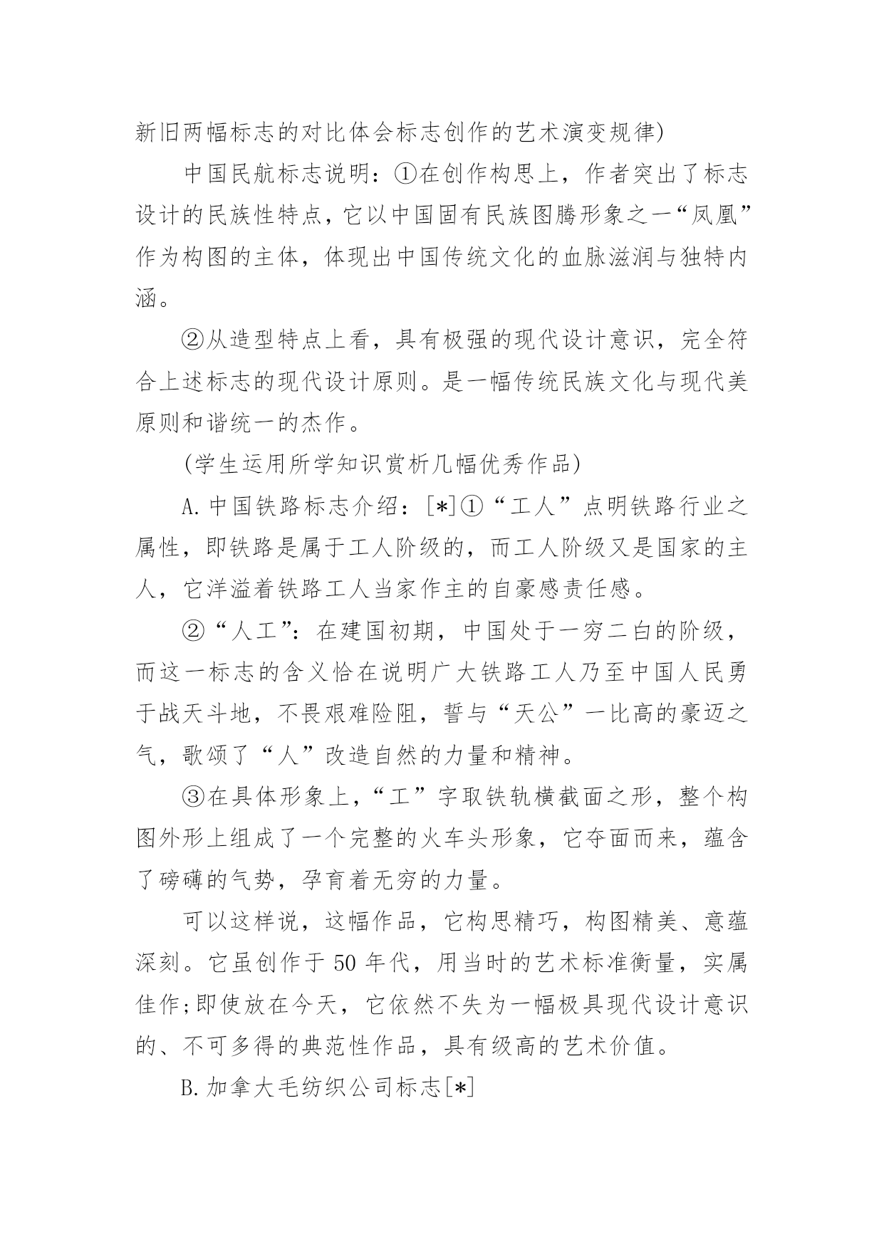 美术教案设计作为一名专为他人授业解惑的人民教师,就有可能用到教案,教案是教学蓝图,可以有效提高教学效率。写教案需要注意哪些格式呢?下面是小编整理的美术教案设计,仅供参考,希望能够帮助到大家。美术教案设计1教学目标:1通过训练使学生掌握概括基本形的方法。2运用学习的方法并添加特征练习画刺猬。3培养学生创造性思维,添加适当的背景。教学重点:折线的节奏教学难点:添加背景教学过程:谈话导入有一种小动物,它长得很奇怪,浑身是刺,胆子却很小,你一靠近它,它就团成一团,人们确很喜欢它,你们知道它是什么吗?对了它就是可爱的小刺猬,这节课我们就来学习画小刺猬(板书课题:画刺猬)。步骤方法1.刺猬的身体可以概括成半圆形。2.它身上的刺可用折线来概括。3.在图画纸上确定位置。4.先画半原形。5.然后画折线,注意折线的节奏。(可做单独的画线训练)6.涂色并添加背静(注意与主体的和谐)。实践操作在学生实践操作的`过程中为学生提供图片资料,巡回指导,因材施教,注意发挥学生的个性,多鼓励多表扬,激发学生的学习积极性。课堂小结谈收获、谈体会、总结经验美术教案设计2[课型]高中美术欣赏[教材分析]《标志设计赏析》是现代商业美术课中的重要内容,是高中美术欣赏课中知识性与应用性相结合、提高审美能力与掌握基本技能相结合的典型课题。其中既有对中国内外优秀标志设计作品的欣赏,又有对标志作品的设计思维和方法的剖析。[教学目的]通过本课的教学,向学生介绍标志设计的基本知识、设计思路和方法,使学生了解标志设计的基本审美原则和掌握标志设计的基本技能、设计思路,从而提高学生的审美能力,树立正确的审美观念。[教学过程](一)导入新课同学们,首先让我们假设这样一种情境,我们到一个陌生的地方旅游,在无法用文字语言交流的情况下,如何尽快找到想去的地方?学生回答……教师明确:其实答案很简单,你自然会去找能够代表这种地方的图形符号,这样的符号就是我们要讲的标志。(二)基本知识1.什么是标志用一种文字或图形来代表另外一种事物的符号。标志的这种作用与文字产生之前的原始社会采用的结绳记事、堆土记事、刻木记事的作用是一致的。教师明确:结绳记事盛行于原始社会,“先民结绳以明事”,结绳不同,所寓之事即有别。这应当说是标志的雏形。2.标志的类别教师提问:现在,我们大家每天可在不同的场合见到一些标志,请仔细回想,你都见到过哪些标志?这些标志各有什么作用?学生回答:……教师归纳:确实如,标志存在于我们社会的每个角落,适用于社会生活各个方面,在现代社会中,标志已不仅仅是一种单纯的视觉符号,它具有独特的美学价值,强大的社会功用,成为一个种文化。(用微机展示一幅图片,介绍生活中常见的几种标志)(1)从用途上分:[*]纪念标志:1979年国际儿童年城市标志:德国基尔城城徽、联合国标志会议标志:奥运会标志商业标志:①代表企业公司形象②代表企业产品品牌(简单介绍标志设计及艺术设计对经济的促进作用)公共图形:贴近生活,服务社会,于人们的日常生活息息相关如:规范人们行为的交通标志和散见于公共场合的服务性标志(2)从造型特点上分:具象型标志(特点:形象自然、生动活泼、有直观趣味感。图例为:德国自然出版社标志[*]抽象型标志(特点:造型严谨、寓意深刻,是把无形的事物转化为有形的可表意的形象。图例为:南斯拉夫进出口贸易公司标志[*]字图型标志(特点:运用广泛、传播速度快。图例为:加拿大铁路标志[*](此处点一句中国铁路路徽的异曲同工之妙)以上同学们认识了标志的类别,但怎样区分标志设计的优劣,是否需要有一种评判的标准呢?而这种标准也正是标志设计必须遵循的基本原则。只有在创作中遵循了这些原则,支委会符号人们的一种普遍的审美情感,同时,也才能够符合人们的审美标准,给人以美的愉悦和享受。3.标志设计的主要原则简:简明易认,一目了然(采用美国百氏可乐饮料公司标志的五次变革来说明标志设计从繁到简的过程)[*]准:内容准确、形象直观(日本某建筑公司标志)[*]奇:独树一帜、不能雷同(采用几幅典型的标志图说明)[*]美:符合艺术美的规律、符合大众普通的审美情感4.标志设计的艺术表现方式在电影史上有众多的流浪汉形象,然而,大家可曾想过:为什么这众多的形象中只有卓别林留有给我们一种卓而不群的艺术感受呢?原因即在于它独特的形象设计和别具风格的艺术表达方式。相同的内容,不同的艺术表达,即可产生风格迥异的艺术效果。同样,既然标志设计是艺术设计,那么它应运用一些基本的艺术表现方式。下面介绍几种常用的方式。(1)形象高度夸张、概括、简洁、几何形化(采用太阳神口服液标志和捷克音乐学院标志说明)[*](2)运用联想、比喻的方式(采用阿根廷市政银行和某人寿保险公司标志说明([*](3)运用象征的方式(波兰和平委员会标志)[*](4)运用民族艺术表现形式(采用德国