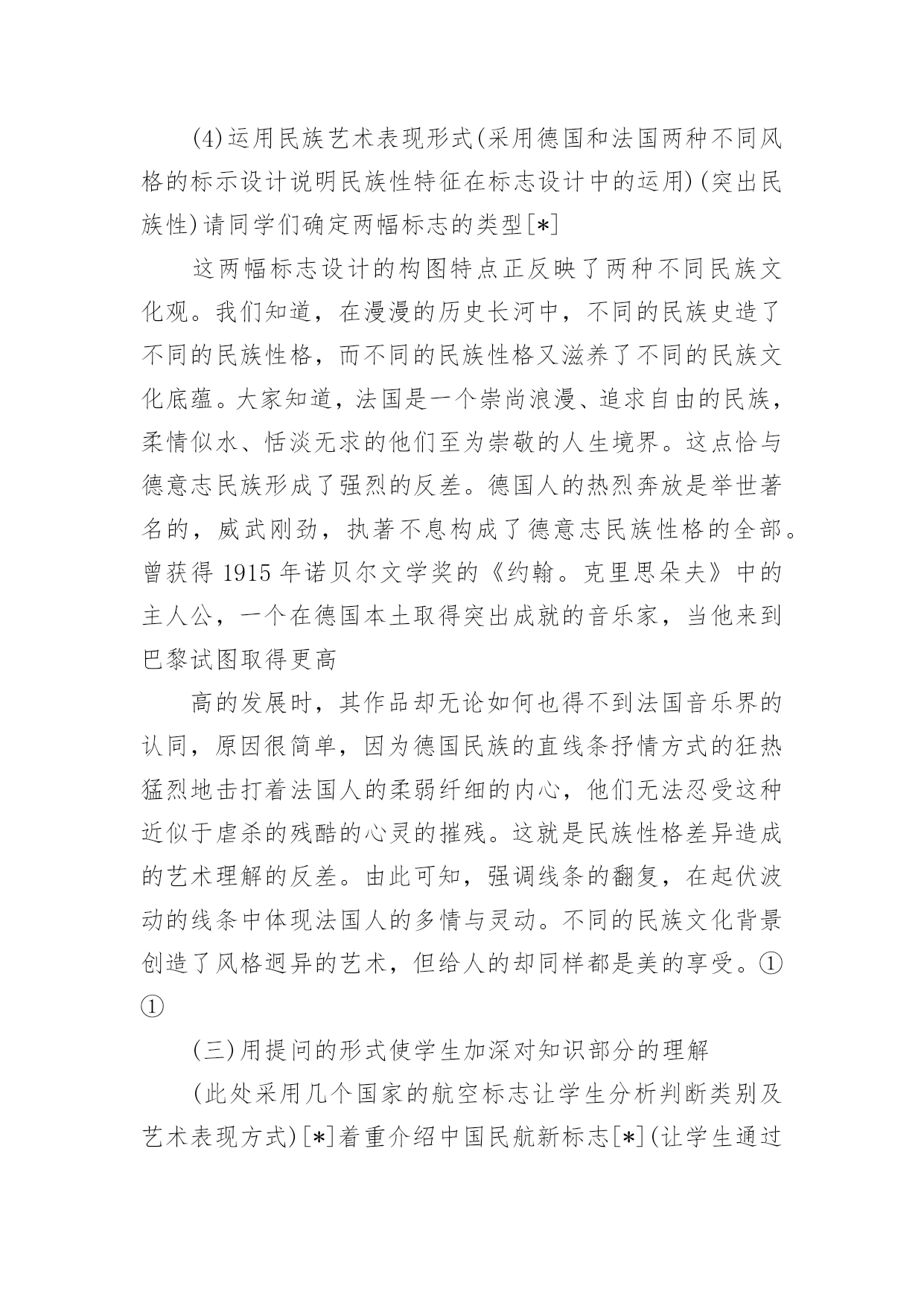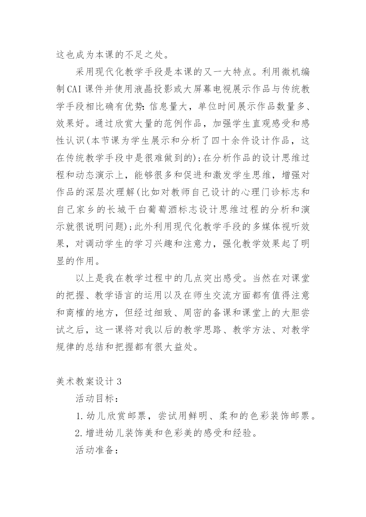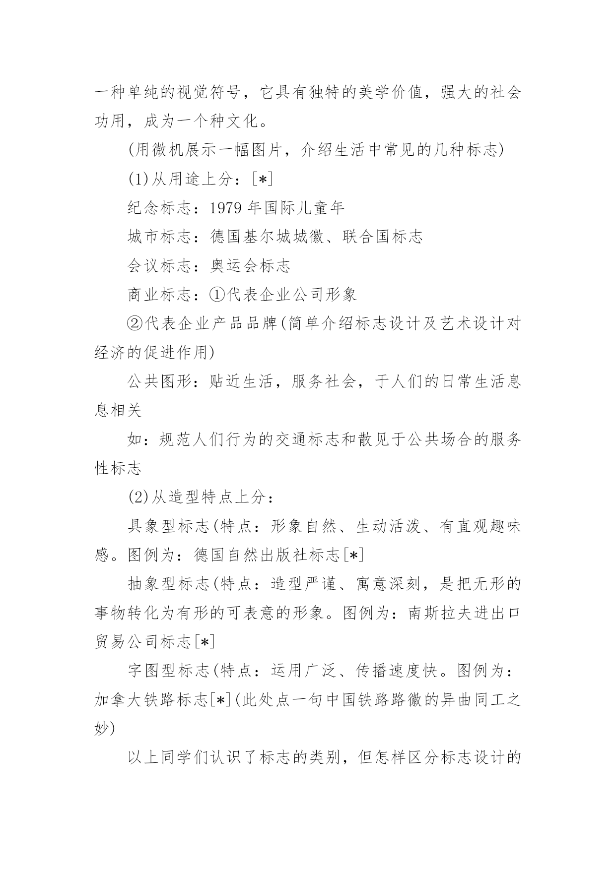 美术教案设计作为一名专为他人授业解惑的人民教师,就有可能用到教案,教案是教学蓝图,可以有效提高教学效率。写教案需要注意哪些格式呢?下面是小编整理的美术教案设计,仅供参考,希望能够帮助到大家。美术教案设计1教学目标:1通过训练使学生掌握概括基本形的方法。2运用学习的方法并添加特征练习画刺猬。3培养学生创造性思维,添加适当的背景。教学重点:折线的节奏教学难点:添加背景教学过程:谈话导入有一种小动物,它长得很奇怪,浑身是刺,胆子却很小,你一靠近它,它就团成一团,人们确很喜欢它,你们知道它是什么吗?对了它就是可爱的小刺猬,这节课我们就来学习画小刺猬(板书课题:画刺猬)。步骤方法1.刺猬的身体可以概括成半圆形。2.它身上的刺可用折线来概括。3.在图画纸上确定位置。4.先画半原形。5.然后画折线,注意折线的节奏。(可做单独的画线训练)6.涂色并添加背静(注意与主体的和谐)。实践操作在学生实践操作的`过程中为学生提供图片资料,巡回指导,因材施教,注意发挥学生的个性,多鼓励多表扬,激发学生的学习积极性。课堂小结谈收获、谈体会、总结经验美术教案设计2[课型]高中美术欣赏[教材分析]《标志设计赏析》是现代商业美术课中的重要内容,是高中美术欣赏课中知识性与应用性相结合、提高审美能力与掌握基本技能相结合的典型课题。其中既有对中国内外优秀标志设计作品的欣赏,又有对标志作品的设计思维和方法的剖析。[教学目的]通过本课的教学,向学生介绍标志设计的基本知识、设计思路和方法,使学生了解标志设计的基本审美原则和掌握标志设计的基本技能、设计思路,从而提高学生的审美能力,树立正确的审美观念。[教学过程](一)导入新课同学们,首先让我们假设这样一种情境,我们到一个陌生的地方旅游,在无法用文字语言交流的情况下,如何尽快找到想去的地方?学生回答……教师明确:其实答案很简单,你自然会去找能够代表这种地方的图形符号,这样的符号就是我们要讲的标志。(二)基本知识1.什么是标志用一种文字或图形来代表另外一种事物的符号。标志的这种作用与文字产生之前的原始社会采用的结绳记事、堆土记事、刻木记事的作用是一致的。教师明确:结绳记事盛行于原始社会,“先民结绳以明事”,结绳不同,所寓之事即有别。这应当说是标志的雏形。2.标志的类别教师提问:现在,我们大家每天可在不同的场合见到一些标志,请仔细回想,你都见到过哪些标志?这些标志各有什么作用?学生回答:……教师归纳:确实如,标志存在于我们社会的每个角落,适用于社会生活各个方面,在现代社会中,标志已不仅仅是一种单纯的视觉符号,它具有独特的美学价值,强大的社会功用,成为一个种文化。(用微机展示一幅图片,介绍生活中常见的几种标志)(1)从用途上分:[*]纪念标志:1979年国际儿童年城市标志:德国基尔城城徽、联合国标志会议标志:奥运会标志商业标志:①代表企业公司形象②代表企业产品品牌(简单介绍标志设计及艺术设计对经济的促进作用)公共图形:贴近生活,服务社会,于人们的日常生活息息相关如:规范人们行为的交通标志和散见于公共场合的服务性标志(2)从造型特点上分:具象型标志(特点:形象自然、生动活泼、有直观趣味感。图例为:德国自然出版社标志[*]抽象型标志(特点:造型严谨、寓意深刻,是把无形的事物转化为有形的可表意的形象。图例为:南斯拉夫进出口贸易公司标志[*]字图型标志(特点:运用广泛、传播速度快。图例为:加拿大铁路标志[*](此处点一句中国铁路路徽的异曲同工之妙)以上同学们认识了标志的类别,但怎样区分标志设计的优劣,是否需要有一种评判的标准呢?而这种标准也正是标志设计必须遵循的基本原则。只有在创作中遵循了这些原则,支委会符号人们的一种普遍的审美情感,同时,也才能够符合人们的审美标准,给人以美的愉悦和享受。3.标志设计的主要原则简:简明易认,一目了然(采用美国百氏可乐饮料公司标志的五次变革来说明标志设计从繁到简的过程)[*]准:内容准确、形象直观(日本某建筑公司标志)[*]奇:独树一帜、不能雷同(采用几幅典型的标志图说明)[*]美:符合艺术美的规律、符合大众普通的审美情感4.标志设计的艺术表现方式在电影史上有众多的流浪汉形象,然而,大家可曾想过:为什么这众多的形象中只有卓别林留有给我们一种卓而不群的艺术感受呢?原因即在于它独特的形象设计和别具风格的艺术表达方式。相同的内容,不同的艺术表达,即可产生风格迥异的艺术效果。同样,既然标志设计是艺术设计,那么它应运用一些基本的艺术表现方式。下面介绍几种常用的方式。(1)形象高度夸张、概括、简洁、几何形化(采用太阳神口服液标志和捷克音乐学院标志说明)[*](2)运用联想、比喻的方式(采用阿根廷市政银行和某人寿保险公司标志说明([*](3)运用象征的方式(波兰和平委员会标志)[*](4)运用民族艺术表现形式(采用德国