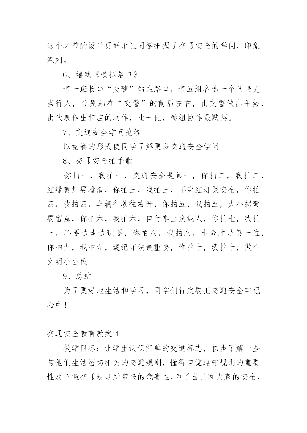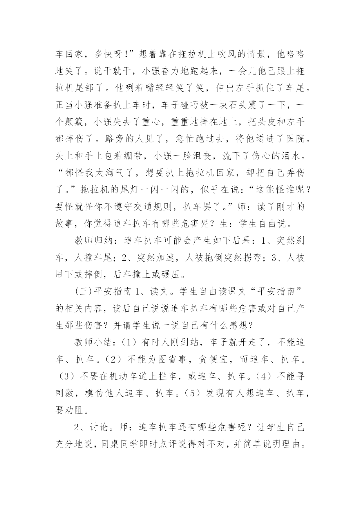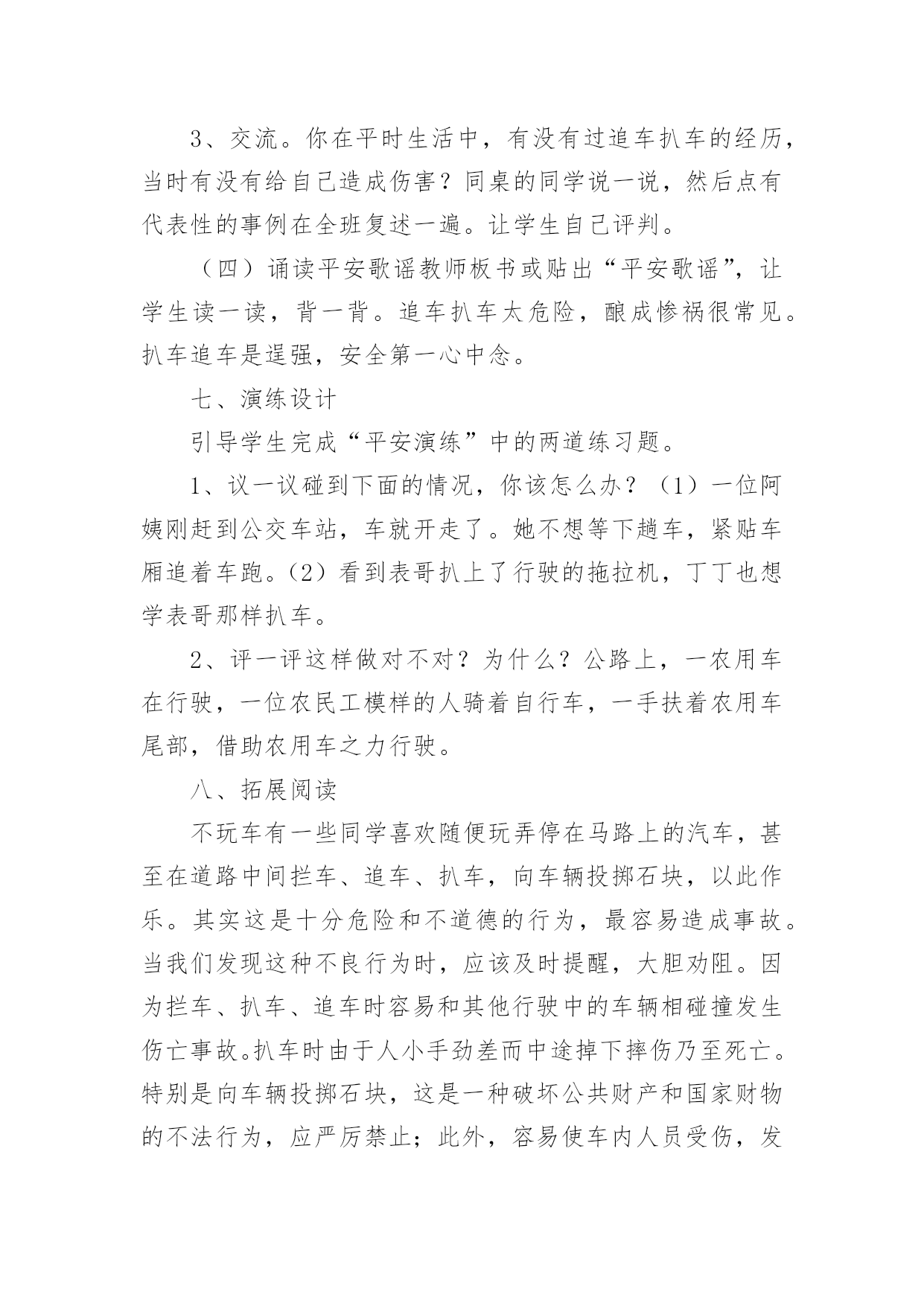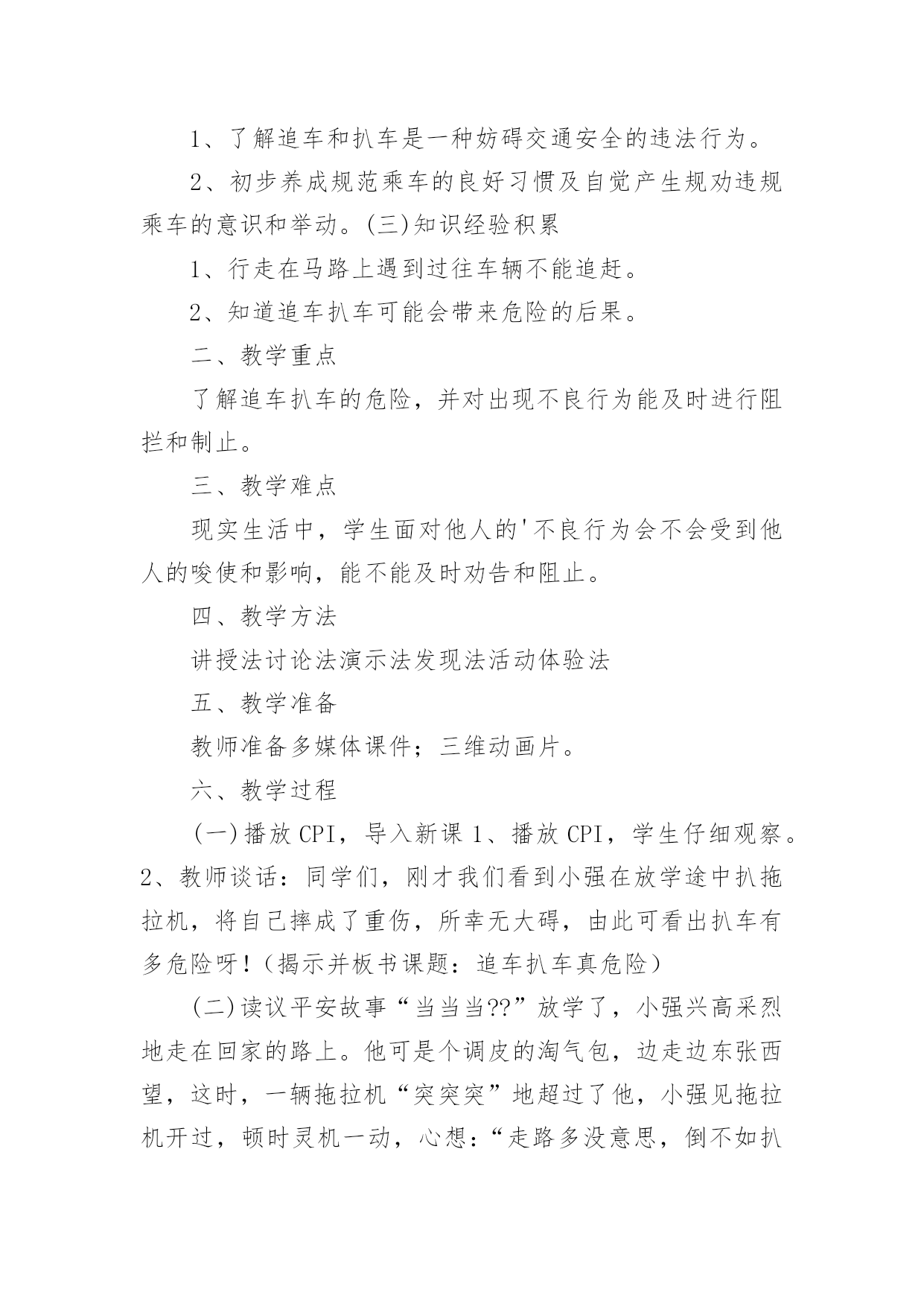 交通安全教育教案交通安全教育教案(荐)作为一名辛苦耕耘的教育工作者,通常需要准备好一份教案,教案是教学蓝图,可以有效提高教学效率。教案应该怎么写呢?以下是小编整理的交通安全教育教案,欢迎大家分享。交通安全教育教案1活动目标:1、通过与交警的沟通互动,帮忙孩子了解交通安全的重要性,熟悉一些重要的交通标志,学会做交通手势。2、通过实践体验活动,学习交警守纪律、吃苦耐劳的优秀品质,培育孩子们的纪律意识和团结拼搏的精神,增加孩子们的交通文明和社会公德意识,熟悉到交警工作的重要性。预备工作:1、邀请交警阿姨到公园参与活动。2、多媒体课件。3、儿童交警服装。活动流程:一、集体活动。1、教师们侃侃而谈,邀请交警阿姨出场,吸引孩子的兴趣。2、交警阿姨通过让孩子看多媒体和提问的方式,帮忙孩子理解红绿灯的作用。3、了解常见的交通标志和信号。4、让孩子熟悉并学会简洁的交通手势。5、启发孩子探究道路上的交通规章。问:自行车应当在什么道路上行使?自行车应当怎么过公路?自行车应当遵守哪些交通规章?孩子们只是特别认真地观看,他们说的'是对的。教师也想问,在我们的生活中,自行车应当在什么道路上跑?自行车应当怎么过公路?自行车应当遵守哪些交通规章?行人呢?二、区域活动:带孩子去安排好的嬉戏现场,请交警阿姨指导,学做小交警,做交通指挥。三、实践活动:和教师、交警一起组织孩子们穿上交警服去西环路进展岗位实习,参加交通指挥,真正做一个小交警。交通安全教育教案2一、教学目标(一)情感态度培养1、在马路上行走时要有规范意识。2、从小养成良好的乘车习惯。(二)行为技能训练1、了解追车和扒车是一种妨碍交通安全的违法行为。2、初步养成规范乘车的良好习惯及自觉产生规劝违规乘车的意识和举动。(三)知识经验积累1、行走在马路上遇到过往车辆不能追赶。2、知道追车扒车可能会带来危险的后果。二、教学重点了解追车扒车的危险,并对出现不良行为能及时进行阻拦和制止。三、教学难点现实生活中,学生面对他人的'不良行为会不会受到他人的唆使和影响,能不能及时劝告和阻止。四、教学方法讲授法讨论法演示法发现法活动体验法五、教学准备教师准备多媒体课件;三维动画片。六、教学过程(一)播放CPI,导入新课1、播放CPI,学生仔细观察。2、教师谈话:同学们,刚才我们看到小强在放学途中扒拖拉机,将自己摔成了重伤,所幸无大碍,由此可看出扒车有多危险呀!(揭示并板书课题:追车扒车真危险)(二)读议平安故事“当当当??”放学了,小强兴高采烈地走在回家的路上。他可是个调皮的淘气包,边走边东张西望,这时,一辆拖拉机“突突突”地超过了他,小强见拖拉机开过,顿时灵机一动,心想:“走路多没意思,倒不如扒车回家,多快呀!”想着靠在拖拉机上吹风的情景,他咯咯地笑了。说干就干,小强奋力地跑起来,一会儿他已跟上拖拉机尾部了。他咧着嘴轻轻笑了笑,伸出左手抓住了车尾。正当小强准备扒上车时,车子碰巧被一块石头震了一下,一个颠簸,小强失去了重心,重重地摔在地上,把头皮和左手都摔伤了。路旁的人见了,急忙跑过去,将他送进了医院。头上和手上包着绷带,小强一脸沮丧,流下了伤心的泪水。“都怪我太淘气了,想要扒上拖拉机回家,却把自己弄伤了。”拖拉机的尾灯一闪一闪的,似乎在说:“这能怪谁呢?要怪就怪你不遵守交通规则,扒车罢了。”师:读了刚才的故事,你觉得追车扒车有哪些危害呢?生:学生自由说。教师归纳:追车扒车可能会产生如下后果:1、突然刹车,人撞车尾;2、突然加速,人被拖倒突然拐弯;3、人被甩下或摔倒,后车撞上或碾压。(三)平安指南1、读文。学生自由读课文“平安指南”的相关内容,读后自己说说追车扒车有哪些危害或对自己产生那些伤害?并请学生说一说自己有什么感想?教师小结:(1)有时人刚到站,车子就开走了,不能追车、扒车。(2)不能为图省事,贪便宜,而追车、扒车。(3)不要在机动车道上拦车,或追车、扒车。(4)不能寻刺激,模仿他人追车、扒车。(5)发现有人想追车、扒车,要劝阻。2、讨论。师:追车扒车还有哪些危害呢?让学生自己充分地说,同桌同学即时点评说得对不对,并简单说明理由。3、交流。你在平时生活中,有没有过追车扒车的经历,当时有没有给自己造成伤害?同桌的同学说一说,然后点有代表性的事例在全班复述一遍。让学生自己评判。(四)诵读平安歌谣教师板书或贴出“平安歌谣”,让学生读一读,背一背。追车扒车太危险,酿成惨祸很常见。扒车追车是逞强,安全第一心中念。七、演练设计引导学生完成“平安演练”中的两道练习题。1、议一议碰到下面的情况,你该怎么办?(1)一位阿姨刚赶到公交车站,车就开走了。她不想等下趟车,紧贴车厢追着车跑。(2)看到表哥扒上了行驶的拖拉机,丁丁也想学表哥那样扒车。2、评一评这样做对不对?为什么?公路上,一农用车在行驶,一位农民工模样的人骑着自行车,一手扶