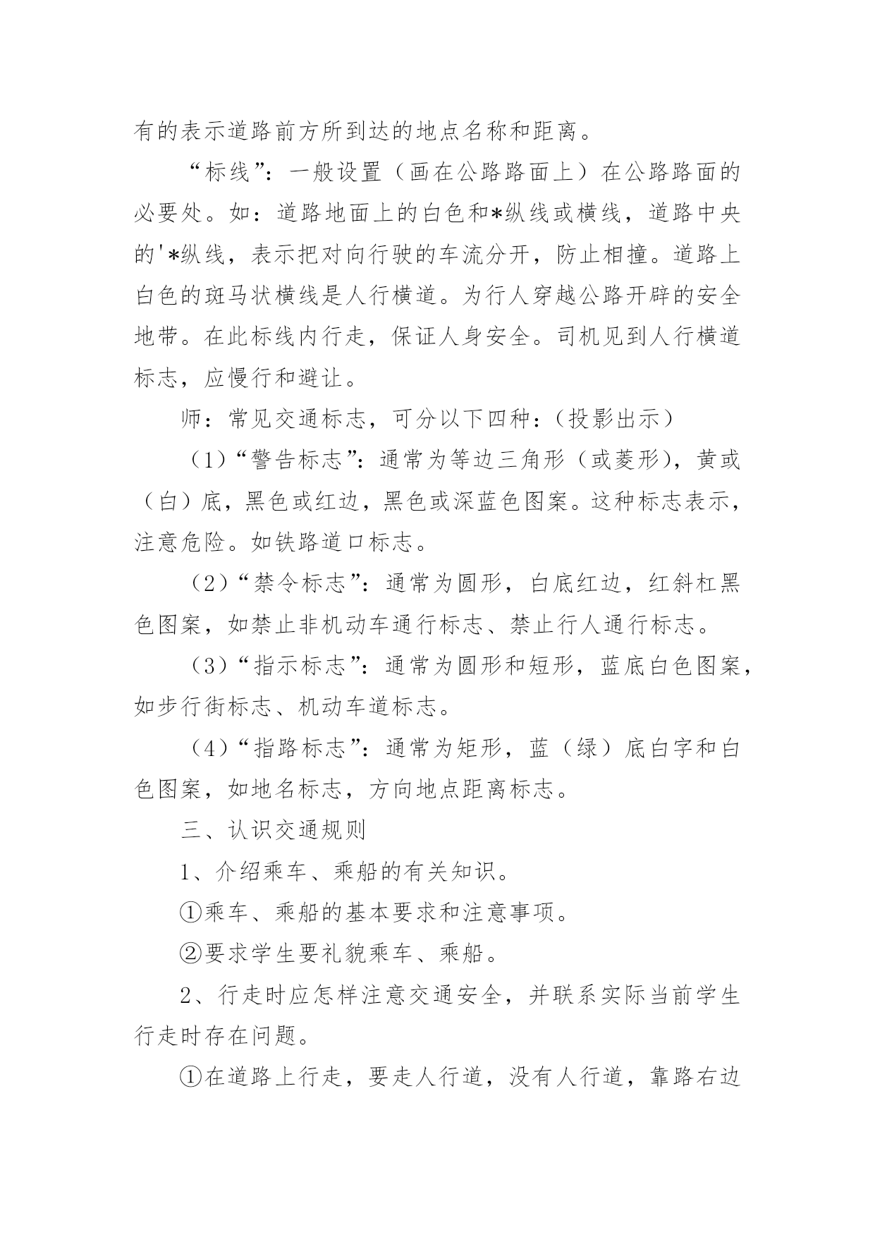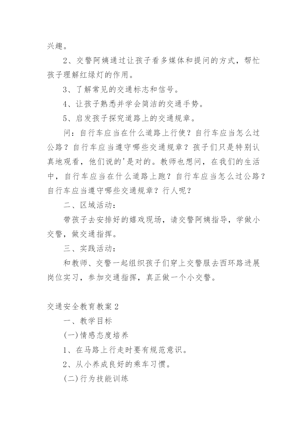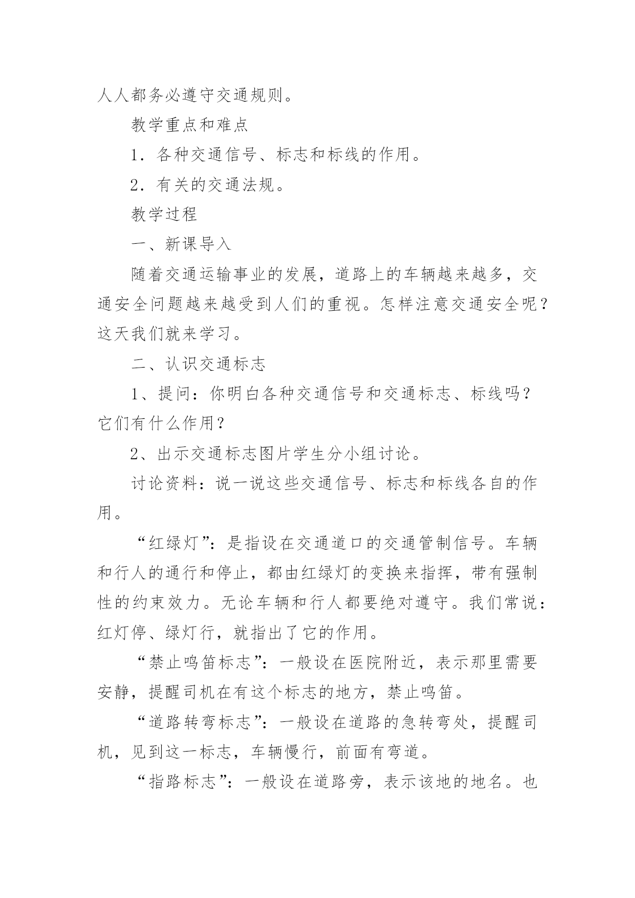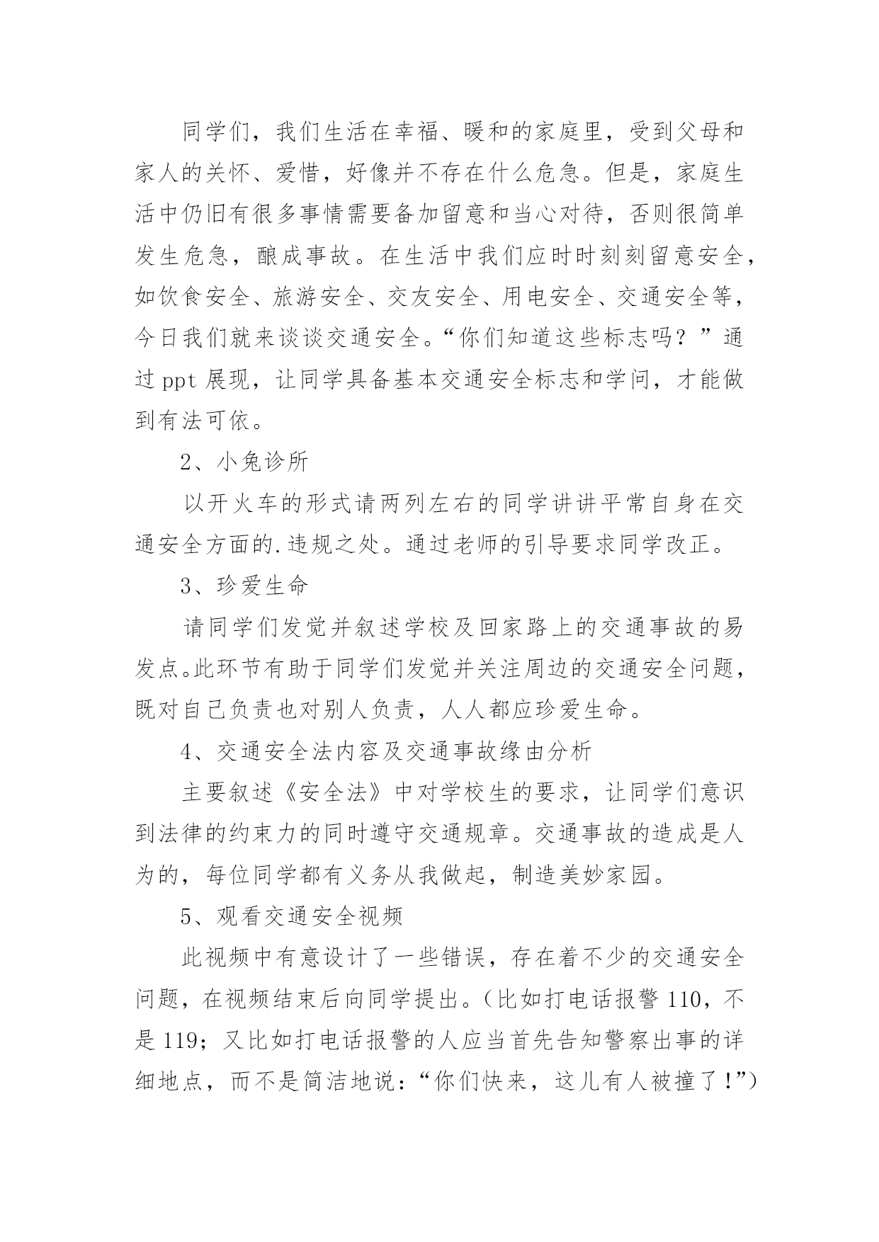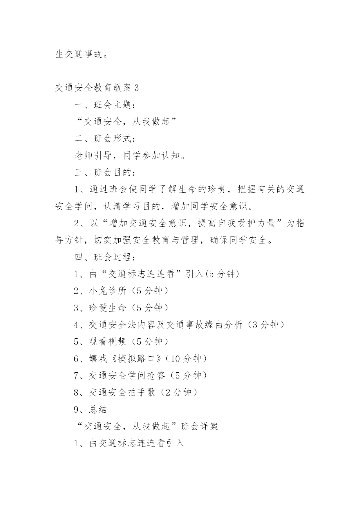 交通安全教育教案交通安全教育教案(荐)作为一名辛苦耕耘的教育工作者,通常需要准备好一份教案,教案是教学蓝图,可以有效提高教学效率。教案应该怎么写呢?以下是小编整理的交通安全教育教案,欢迎大家分享。交通安全教育教案1活动目标:1、通过与交警的沟通互动,帮忙孩子了解交通安全的重要性,熟悉一些重要的交通标志,学会做交通手势。2、通过实践体验活动,学习交警守纪律、吃苦耐劳的优秀品质,培育孩子们的纪律意识和团结拼搏的精神,增加孩子们的交通文明和社会公德意识,熟悉到交警工作的重要性。预备工作:1、邀请交警阿姨到公园参与活动。2、多媒体课件。3、儿童交警服装。活动流程:一、集体活动。1、教师们侃侃而谈,邀请交警阿姨出场,吸引孩子的兴趣。2、交警阿姨通过让孩子看多媒体和提问的方式,帮忙孩子理解红绿灯的作用。3、了解常见的交通标志和信号。4、让孩子熟悉并学会简洁的交通手势。5、启发孩子探究道路上的交通规章。问:自行车应当在什么道路上行使?自行车应当怎么过公路?自行车应当遵守哪些交通规章?孩子们只是特别认真地观看,他们说的'是对的。教师也想问,在我们的生活中,自行车应当在什么道路上跑?自行车应当怎么过公路?自行车应当遵守哪些交通规章?行人呢?二、区域活动:带孩子去安排好的嬉戏现场,请交警阿姨指导,学做小交警,做交通指挥。三、实践活动:和教师、交警一起组织孩子们穿上交警服去西环路进展岗位实习,参加交通指挥,真正做一个小交警。交通安全教育教案2一、教学目标(一)情感态度培养1、在马路上行走时要有规范意识。2、从小养成良好的乘车习惯。(二)行为技能训练1、了解追车和扒车是一种妨碍交通安全的违法行为。2、初步养成规范乘车的良好习惯及自觉产生规劝违规乘车的意识和举动。(三)知识经验积累1、行走在马路上遇到过往车辆不能追赶。2、知道追车扒车可能会带来危险的后果。二、教学重点了解追车扒车的危险,并对出现不良行为能及时进行阻拦和制止。三、教学难点现实生活中,学生面对他人的'不良行为会不会受到他人的唆使和影响,能不能及时劝告和阻止。四、教学方法讲授法讨论法演示法发现法活动体验法五、教学准备教师准备多媒体课件;三维动画片。六、教学过程(一)播放CPI,导入新课1、播放CPI,学生仔细观察。2、教师谈话:同学们,刚才我们看到小强在放学途中扒拖拉机,将自己摔成了重伤,所幸无大碍,由此可看出扒车有多危险呀!(揭示并板书课题:追车扒车真危险)(二)读议平安故事“当当当??”放学了,小强兴高采烈地走在回家的路上。他可是个调皮的淘气包,边走边东张西望,这时,一辆拖拉机“突突突”地超过了他,小强见拖拉机开过,顿时灵机一动,心想:“走路多没意思,倒不如扒车回家,多快呀!”想着靠在拖拉机上吹风的情景,他咯咯地笑了。说干就干,小强奋力地跑起来,一会儿他已跟上拖拉机尾部了。他咧着嘴轻轻笑了笑,伸出左手抓住了车尾。正当小强准备扒上车时,车子碰巧被一块石头震了一下,一个颠簸,小强失去了重心,重重地摔在地上,把头皮和左手都摔伤了。路旁的人见了,急忙跑过去,将他送进了医院。头上和手上包着绷带,小强一脸沮丧,流下了伤心的泪水。“都怪我太淘气了,想要扒上拖拉机回家,却把自己弄伤了。”拖拉机的尾灯一闪一闪的,似乎在说:“这能怪谁呢?要怪就怪你不遵守交通规则,扒车罢了。”师:读了刚才的故事,你觉得追车扒车有哪些危害呢?生:学生自由说。教师归纳:追车扒车可能会产生如下后果:1、突然刹车,人撞车尾;2、突然加速,人被拖倒突然拐弯;3、人被甩下或摔倒,后车撞上或碾压。(三)平安指南1、读文。学生自由读课文“平安指南”的相关内容,读后自己说说追车扒车有哪些危害或对自己产生那些伤害?并请学生说一说自己有什么感想?教师小结:(1)有时人刚到站,车子就开走了,不能追车、扒车。(2)不能为图省事,贪便宜,而追车、扒车。(3)不要在机动车道上拦车,或追车、扒车。(4)不能寻刺激,模仿他人追车、扒车。(5)发现有人想追车、扒车,要劝阻。2、讨论。师:追车扒车还有哪些危害呢?让学生自己充分地说,同桌同学即时点评说得对不对,并简单说明理由。3、交流。你在平时生活中,有没有过追车扒车的经历,当时有没有给自己造成伤害?同桌的同学说一说,然后点有代表性的事例在全班复述一遍。让学生自己评判。(四)诵读平安歌谣教师板书或贴出“平安歌谣”,让学生读一读,背一背。追车扒车太危险,酿成惨祸很常见。扒车追车是逞强,安全第一心中念。七、演练设计引导学生完成“平安演练”中的两道练习题。1、议一议碰到下面的情况,你该怎么办?(1)一位阿姨刚赶到公交车站,车就开走了。她不想等下趟车,紧贴车厢追着车跑。(2)看到表哥扒上了行驶的拖拉机,丁丁也想学表哥那样扒车。2、评一评这样做对不对?为什么?公路上,一农用车在行驶,一位农民工模样的人骑着自行车,一手扶