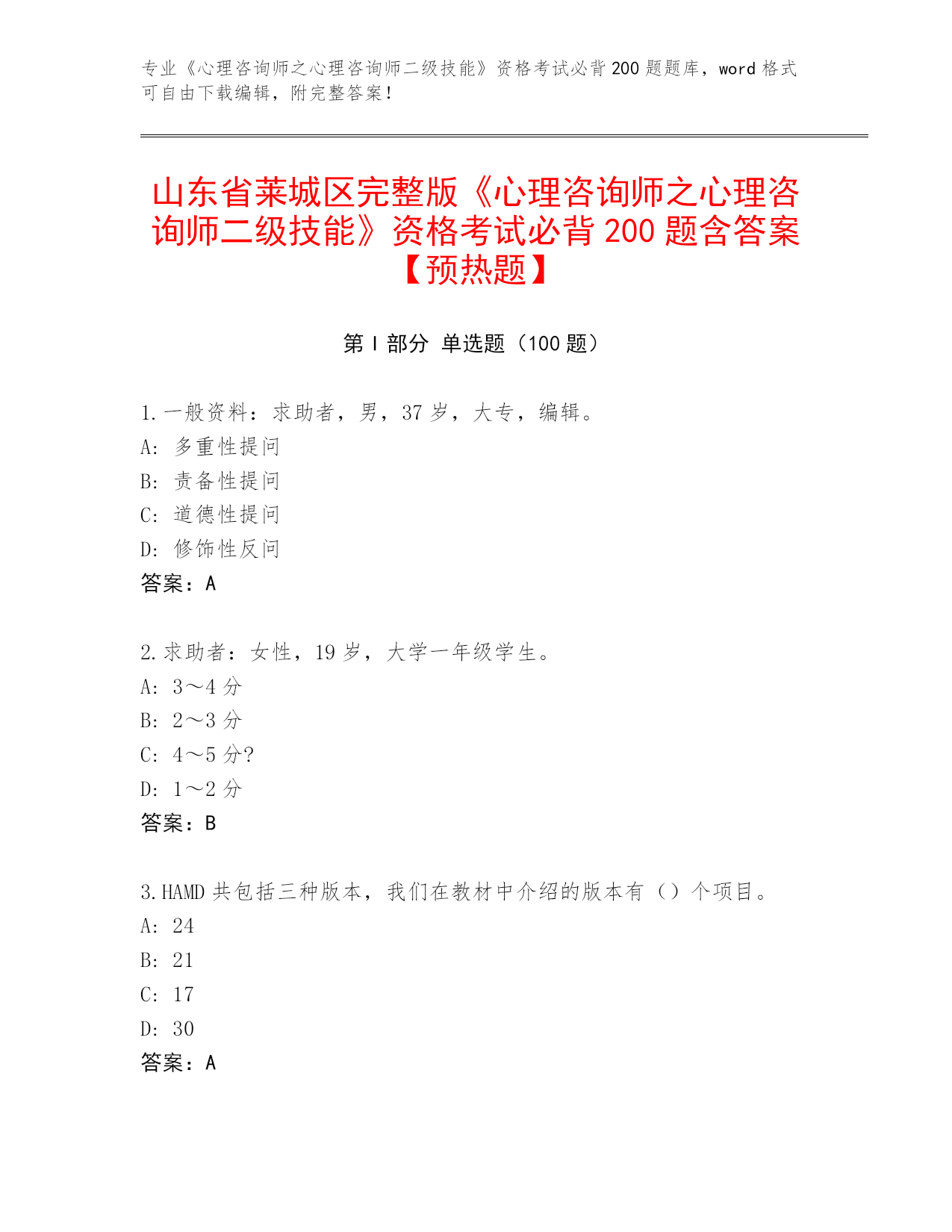 山东省莱城区完整版《心理咨询师之心理咨询师二级技能》资格考试必背200题含答案【预热题】