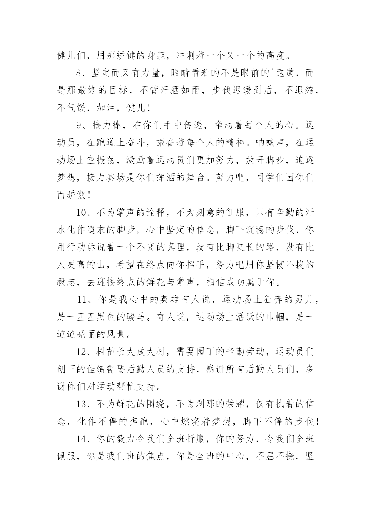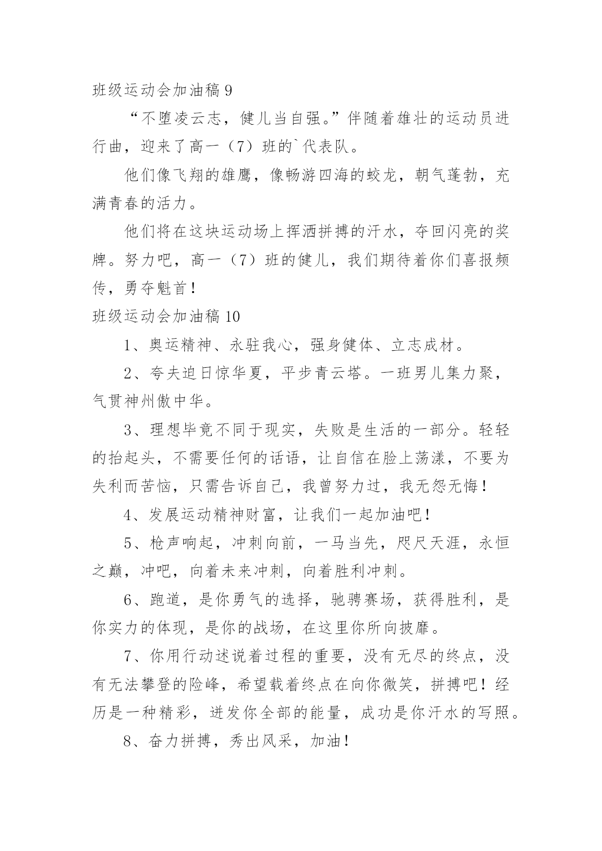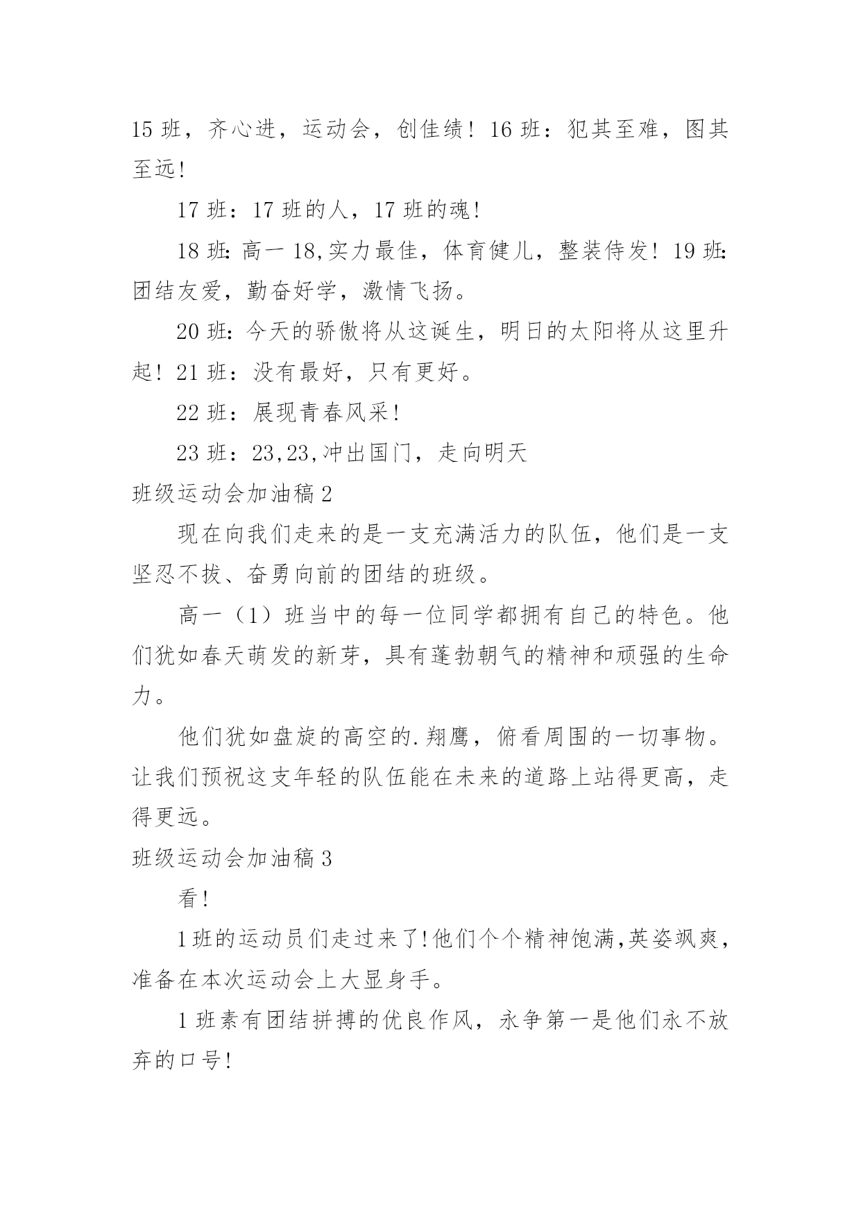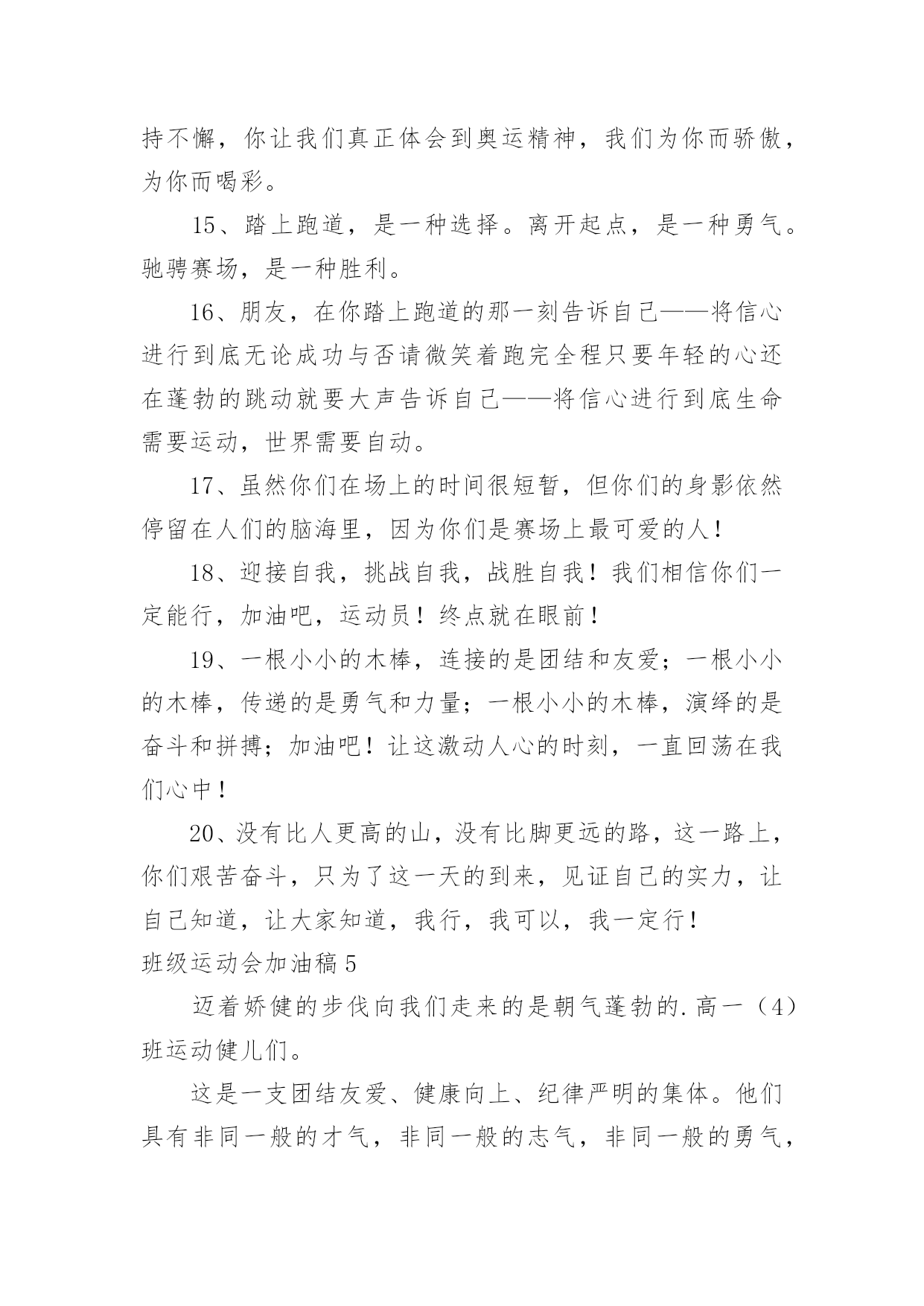班级运动会加油稿班级运动会加油稿在当今社会生活中,用到加油稿的地方越来越多,加油稿是用于给别人加油鼓气,提升别人气势的文稿。那么你有了解过加油稿吗?下面是小编为大家收集的班级运动会加油稿,仅供参考,希望能够帮助到大家。班级运动会加油稿11班:飞跃梦想、超越刘翔2班:团结进步,永争第一。3班:挥动激情、放飞梦想4班:超越自我,挑战极限!5班:超越自我,秀出风采!6班:6班、6班,永争前三!7班:团结拼搏,超越自我。8班:人要搏出一片蓝天!9班:非比寻常,九班最强!10班:友谊第一,比赛第二!11班:11,11,永争第一!12班:和衷共济,风雨同舟;拼搏进取,铸就辉煌。13班:努力奋进,永争第一14班:挥洒着青春的'活力,放飞希望和梦想!15班:15班,齐心进,运动会,创佳绩!16班:犯其至难,图其至远!17班:17班的人,17班的魂!18班:高一18,实力最佳,体育健儿,整装侍发!19班:团结友爱,勤奋好学,激情飞扬。20班:今天的骄傲将从这诞生,明日的太阳将从这里升起!21班:没有最好,只有更好。22班:展现青春风采!23班:23,23,冲出国门,走向明天班级运动会加油稿2现在向我们走来的是一支充满活力的队伍,他们是一支坚忍不拔、奋勇向前的团结的班级。高一(1)班当中的每一位同学都拥有自己的特色。他们犹如春天萌发的新芽,具有蓬勃朝气的精神和顽强的生命力。他们犹如盘旋的高空的.翔鹰,俯看周围的一切事物。让我们预祝这支年轻的队伍能在未来的道路上站得更高,走得更远。班级运动会加油稿3看!1班的运动员们走过来了!他们个个精神饱满,英姿飒爽,准备在本次运动会上大显身手。1班素有团结拼搏的优良作风,永争第一是他们永不放弃的口号!你看!他们的步伐多么的豪迈整齐!你听!他们的声音多么的嘹亮铿锵有力!他们愿将更高、更快更强的.体育精神实现于运动场上的每一刻,愿将永攀高峰的意志带给每个人!来吧!祝愿他们在本次运动会中实现自我,胜不骄、败不馁;让我们为他们每一次拼搏加油,让我们为他们的每一次努力喝采!班级运动会加油稿41、青春的脚步,青春的速度,青春的活力,青春的激情,将会在你们的身上尽情体现。迎接自我,挑战自我,战胜自我!我们相信你们一定能行,加油吧,运动员!终点就在眼前!2、青春是领奖台上灿烂的笑容,青春是失败后,站起再努力的勇气,青春是明天更大的成功相信自己做的最好相信自己做的最好,无所谓成功与失败,只在乎那过程的挥汗如雨,每一次都是新的起点,每一次都是努力的体验。3、坚定,执着,耐力与期望,在延伸的白色跑道中点点凝聚!力量,信念,拼搏与奋斗,在遥远的终点线上渐渐明亮!4、体育场上的运动员们,我们是雄心勃勃的一代我们是勇争第一的一代。人生能有几回搏,此时不搏待何时。5、全员实动,开张大吉,销售创意,呼唤奇迹。6、这是意志的拼搏,这是速度的挑战,胜利在向你们招手,胜利在向你们呼唤!7、在阳光的照耀下,跳高的比赛场地格外辉煌,运动健儿们,用那矫键的身躯,冲刺着一个又一个的高度。8、坚定而又有力量,眼睛看着的不是眼前的'跑道,而是那最终的目标,不管汗洒如雨,步伐迟缓到后,不退缩,不气馁,加油,健儿!9、接力棒,在你们手中传递,牵动着每个人的心。运动员,在跑道上奋斗,振奋着每个人的精神。呐喊声,在运动场上空振荡,激励着运动员们更加努力,放开脚步,追逐梦想,接力赛场是你们挥洒的舞台。努力吧,同学们因你们而骄傲!10、不为掌声的诠释,不为刻意的征服,只有辛勤的汗水化作追求的脚步,心中坚定的信念,脚下沉稳的步伐,你用行动诉说着一个不变的真理,没有比脚更长的路,没有比人更高的山,希望在终点向你招手,努力吧用你坚韧不拔的毅志,去迎接终点的鲜花与掌声,相信成功属于你。11、你是我心中的英雄有人说,运动场上狂奔的男儿,是一匹匹黑色的骏马。有人说,运动场上活跃的巾帼,是一道道亮丽的风景。12、树苗长大成大树,需要园丁的辛勤劳动,运动员们创下的佳绩需要后勤人员的支持,感谢所有后勤人员们,多谢你们对运动帮忙支持。13、不为鲜花的围绕,不为刹那的荣耀,仅有执着的信念,化作不停的奔跑,心中燃烧着梦想,脚下不停的步伐!14、你的毅力令我们全班折服,你的努力,令我们全班佩服,你是我们班的焦点,你是全班的中心,不屈不挠,坚持不懈,你让我们真正体会到奥运精神,我们为你而骄傲,为你而喝彩。15、踏上跑道,是一种选择。离开起点,是一种勇气。驰骋赛场,是一种胜利。16、朋友,在你踏上跑道的那一刻告诉自己——将信心进行到底无论成功与否请微笑着跑完全程只要年轻的心还在蓬勃的跳动就要大声告诉自己——将信心进行到底生命需要运动,世界需要自动。17、虽然你们在场上的时间很短暂,但你们的身影依然停留在人们的脑海里,因为你们是赛场上最可爱的人!18、迎接自我,挑战自我,战胜自我!我们相信你们一定能