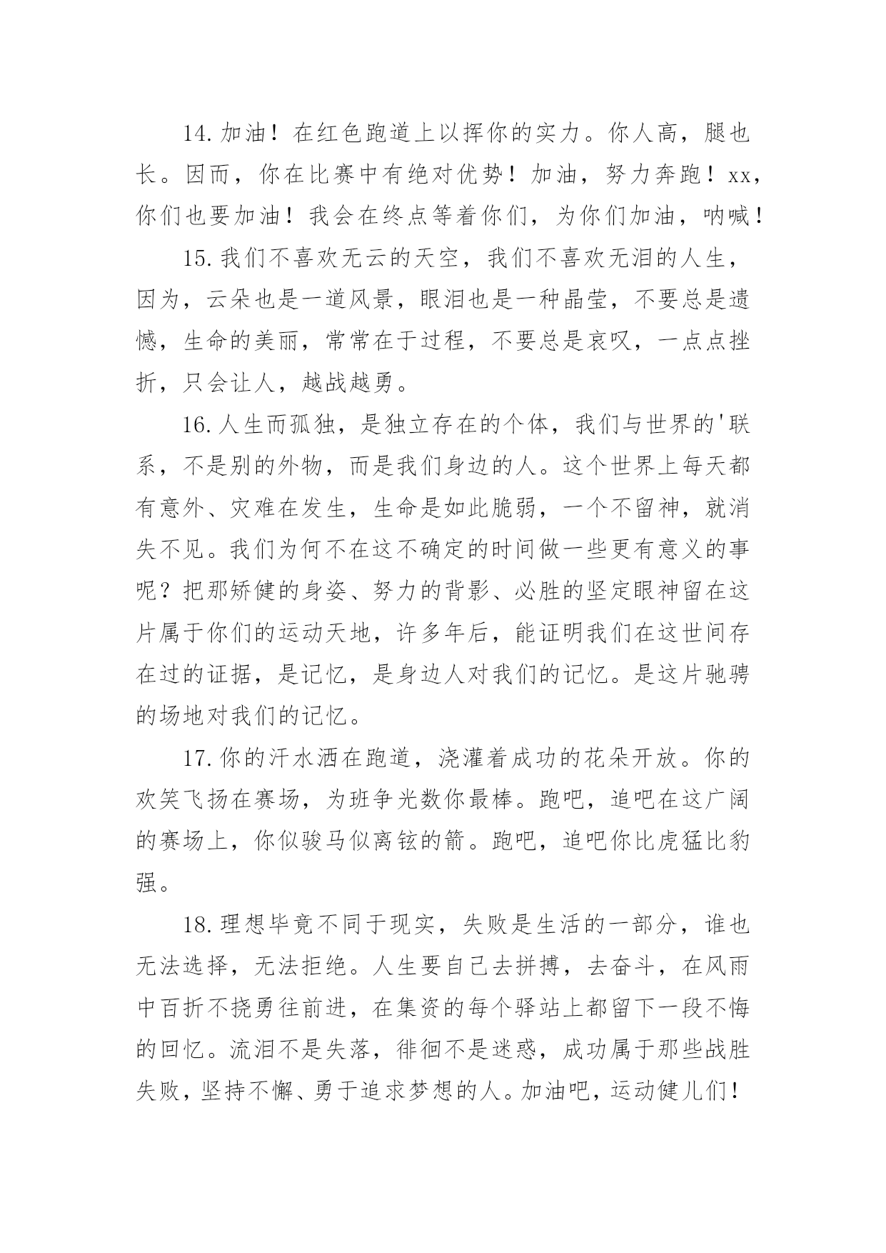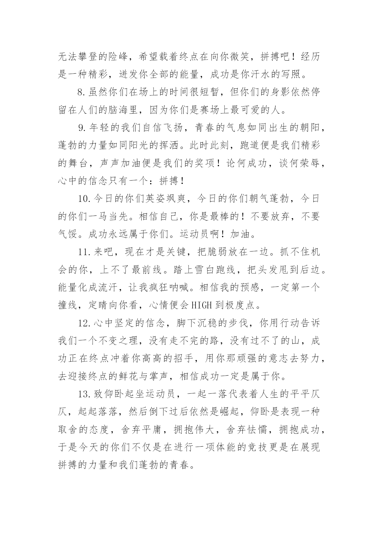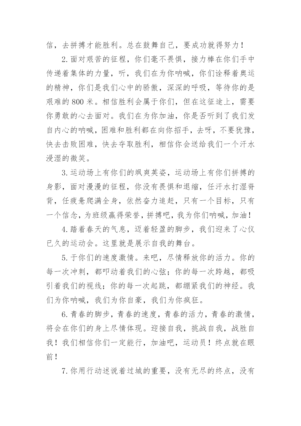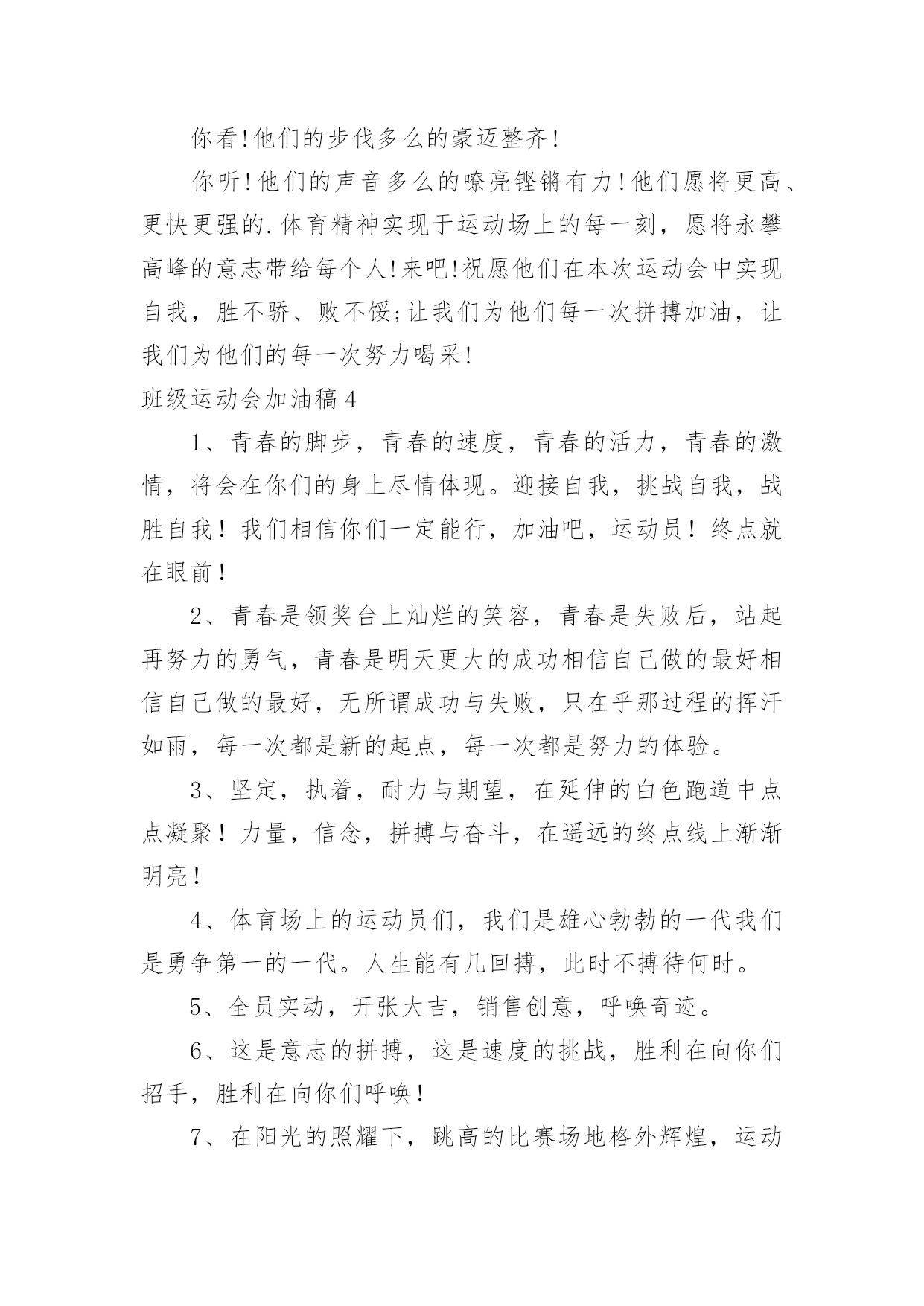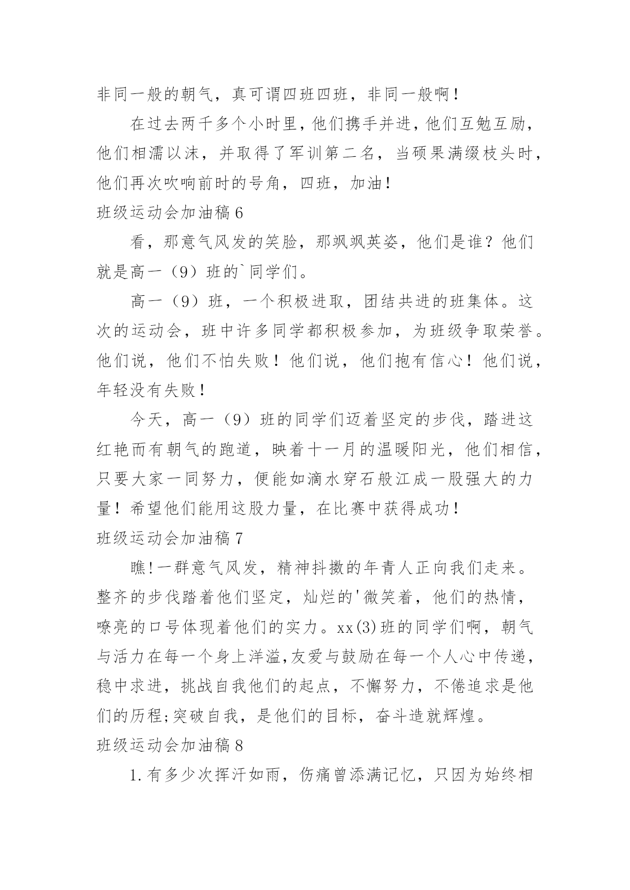 班级运动会加油稿班级运动会加油稿在当今社会生活中,用到加油稿的地方越来越多,加油稿是用于给别人加油鼓气,提升别人气势的文稿。那么你有了解过加油稿吗?下面是小编为大家收集的班级运动会加油稿,仅供参考,希望能够帮助到大家。班级运动会加油稿11班:飞跃梦想、超越刘翔2班:团结进步,永争第一。3班:挥动激情、放飞梦想4班:超越自我,挑战极限!5班:超越自我,秀出风采!6班:6班、6班,永争前三!7班:团结拼搏,超越自我。8班:人要搏出一片蓝天!9班:非比寻常,九班最强!10班:友谊第一,比赛第二!11班:11,11,永争第一!12班:和衷共济,风雨同舟;拼搏进取,铸就辉煌。13班:努力奋进,永争第一14班:挥洒着青春的'活力,放飞希望和梦想!15班:15班,齐心进,运动会,创佳绩!16班:犯其至难,图其至远!17班:17班的人,17班的魂!18班:高一18,实力最佳,体育健儿,整装侍发!19班:团结友爱,勤奋好学,激情飞扬。20班:今天的骄傲将从这诞生,明日的太阳将从这里升起!21班:没有最好,只有更好。22班:展现青春风采!23班:23,23,冲出国门,走向明天班级运动会加油稿2现在向我们走来的是一支充满活力的队伍,他们是一支坚忍不拔、奋勇向前的团结的班级。高一(1)班当中的每一位同学都拥有自己的特色。他们犹如春天萌发的新芽,具有蓬勃朝气的精神和顽强的生命力。他们犹如盘旋的高空的.翔鹰,俯看周围的一切事物。让我们预祝这支年轻的队伍能在未来的道路上站得更高,走得更远。班级运动会加油稿3看!1班的运动员们走过来了!他们个个精神饱满,英姿飒爽,准备在本次运动会上大显身手。1班素有团结拼搏的优良作风,永争第一是他们永不放弃的口号!你看!他们的步伐多么的豪迈整齐!你听!他们的声音多么的嘹亮铿锵有力!他们愿将更高、更快更强的.体育精神实现于运动场上的每一刻,愿将永攀高峰的意志带给每个人!来吧!祝愿他们在本次运动会中实现自我,胜不骄、败不馁;让我们为他们每一次拼搏加油,让我们为他们的每一次努力喝采!班级运动会加油稿41、青春的脚步,青春的速度,青春的活力,青春的激情,将会在你们的身上尽情体现。迎接自我,挑战自我,战胜自我!我们相信你们一定能行,加油吧,运动员!终点就在眼前!2、青春是领奖台上灿烂的笑容,青春是失败后,站起再努力的勇气,青春是明天更大的成功相信自己做的最好相信自己做的最好,无所谓成功与失败,只在乎那过程的挥汗如雨,每一次都是新的起点,每一次都是努力的体验。3、坚定,执着,耐力与期望,在延伸的白色跑道中点点凝聚!力量,信念,拼搏与奋斗,在遥远的终点线上渐渐明亮!4、体育场上的运动员们,我们是雄心勃勃的一代我们是勇争第一的一代。人生能有几回搏,此时不搏待何时。5、全员实动,开张大吉,销售创意,呼唤奇迹。6、这是意志的拼搏,这是速度的挑战,胜利在向你们招手,胜利在向你们呼唤!7、在阳光的照耀下,跳高的比赛场地格外辉煌,运动健儿们,用那矫键的身躯,冲刺着一个又一个的高度。8、坚定而又有力量,眼睛看着的不是眼前的'跑道,而是那最终的目标,不管汗洒如雨,步伐迟缓到后,不退缩,不气馁,加油,健儿!9、接力棒,在你们手中传递,牵动着每个人的心。运动员,在跑道上奋斗,振奋着每个人的精神。呐喊声,在运动场上空振荡,激励着运动员们更加努力,放开脚步,追逐梦想,接力赛场是你们挥洒的舞台。努力吧,同学们因你们而骄傲!10、不为掌声的诠释,不为刻意的征服,只有辛勤的汗水化作追求的脚步,心中坚定的信念,脚下沉稳的步伐,你用行动诉说着一个不变的真理,没有比脚更长的路,没有比人更高的山,希望在终点向你招手,努力吧用你坚韧不拔的毅志,去迎接终点的鲜花与掌声,相信成功属于你。11、你是我心中的英雄有人说,运动场上狂奔的男儿,是一匹匹黑色的骏马。有人说,运动场上活跃的巾帼,是一道道亮丽的风景。12、树苗长大成大树,需要园丁的辛勤劳动,运动员们创下的佳绩需要后勤人员的支持,感谢所有后勤人员们,多谢你们对运动帮忙支持。13、不为鲜花的围绕,不为刹那的荣耀,仅有执着的信念,化作不停的奔跑,心中燃烧着梦想,脚下不停的步伐!14、你的毅力令我们全班折服,你的努力,令我们全班佩服,你是我们班的焦点,你是全班的中心,不屈不挠,坚持不懈,你让我们真正体会到奥运精神,我们为你而骄傲,为你而喝彩。15、踏上跑道,是一种选择。离开起点,是一种勇气。驰骋赛场,是一种胜利。16、朋友,在你踏上跑道的那一刻告诉自己——将信心进行到底无论成功与否请微笑着跑完全程只要年轻的心还在蓬勃的跳动就要大声告诉自己——将信心进行到底生命需要运动,世界需要自动。17、虽然你们在场上的时间很短暂,但你们的身影依然停留在人们的脑海里,因为你们是赛场上最可爱的人!18、迎接自我,挑战自我,战胜自我!我们相信你们一定能
