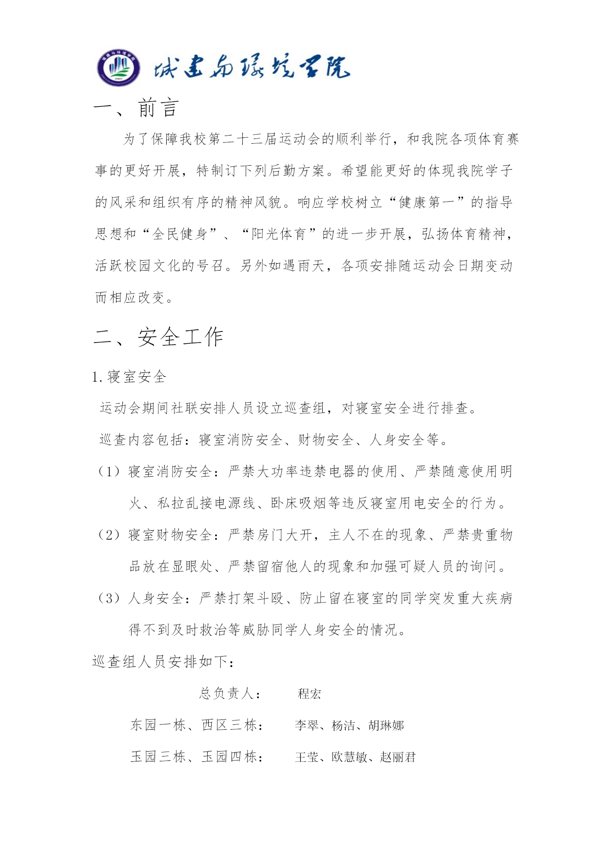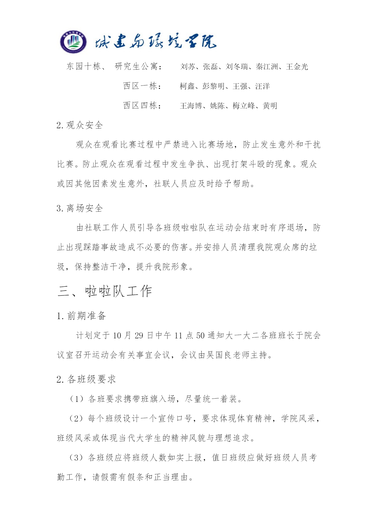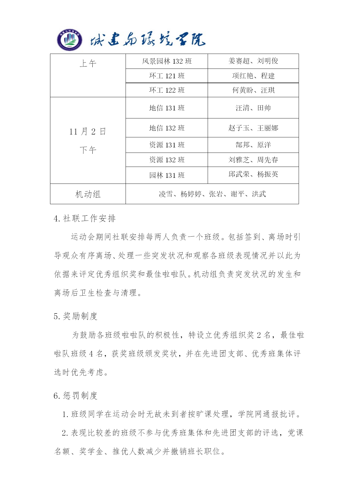 运动会策划书——后勤工作城建与环境学院团总支社联一、前言为了保障我校第二十三届运动会的顺利举行,和我院各项体育赛事的更好开展,特制订下列后勤方案。希望能更好的体现我院学子的风采和组织有序的精神风貌。响应学校树立“健康第一”的指导思想和“全民健身”、“阳光体育”的进一步开展,弘扬体育精神,活跃校园文化的号召。另外如遇雨天,各项安排随运动会日期变动而相应改变。二、安全工作1.寝室安全运动会期间社联安排人员设立巡查组,对寝室安全进行排查。巡查内容包括:寝室消防安全、财物安全、人身安全等。(1)寝室消防安全:严禁大功率违禁电器的使用、严禁随意使用明火、私拉乱接电源线、卧床吸烟等违反寝室用电安全的行为。(2)寝室财物安全:严禁房门大开,主人不在的现象、严禁贵重物品放在显眼处、严禁留宿他人的现象和加强可疑人员的询问。(3)人身安全:严禁打架斗殴、防止留在寝室的同学突发重大疾病得不到及时救治等威胁同学人身安全的情况。巡查组人员安排如下:总负责人:程宏东园一栋、西区三栋:李翠、杨洁、胡琳娜玉园三栋、玉园四栋:王莹、欧慧敏、赵丽君东园十栋、研究生公寓:刘苏、张磊、刘冬瑞、秦江洲、王金光西区一栋:柯鑫、彭黎明、王强、汪洋西区四栋:王海博、姚陈、梅立峰、黄明2.观众安全观众在观看比赛过程中严禁进入比赛场地,防止发生意外和干扰比赛。防止观众在观看过程中发生争执、出现打架斗殴的现象。观众或因其他因素发生意外,社联人员应及时给予帮助。3.离场安全由社联工作人员引导各班级啦啦队在运动会结束时有序退场,防止出现踩踏事故造成不必要的伤害。并安排人员清理我院观众席的垃圾,保持整洁干净,提升我院形象。三、啦啦队工作前期准备计划定于10月29日中午11点50通知大一大二各班班长于院会议室召开运动会有关事宜会议,会议由吴国良老师主持。各班级要求(1)各班要求携带班旗入场,尽量统一着装。(2)每个班级设计一个宣传口号,要求体现体育精神,学院风采,班级风采或体现当代大学生的精神风貌与理想追求。(3)各班级应将班级人数如实上报,值日班级应做好班级人员考勤工作,请假需有假条和正当理由。(4)比赛开始后不得中途离场,禁止出现早退现象。(5)保持看台卫生,不得乱扔垃圾。(6)各班级需提前半个小时到达体育场,并有序进场。啦啦队工作安排时间班级考勤负责人10月31日上午环科131班刘全俊、黄会环科132班耿世尧、乐梅城规121班姜赛超、刘明俊城规122班项红艳、程建园林121班何黄盼、汪琪10月31日下午环科121班汪清、田帅环科122班赵子玉、王丽娜景观121班郜邦、原洋景观122班刘雅芝、周先春11月1日上午地信121班汪清、田帅地信122班赵子玉、王丽娜环工131班郜邦、原洋环工132班刘雅芝、周先春园林122班邱武荣、杨振英11月1日下午资源121班刘全俊、黄会资源122班耿世尧、乐梅城规131班姜赛超、刘明俊城规132班项红艳、程建园林132班何黄盼、汪琪11月2日上午环工卓越班刘全俊、黄会风景园林131班耿世尧、乐梅风景园林132班姜赛超、刘明俊环工121班项红艳、程建环工122班何黄盼、汪琪11月2日下午地信131班汪清、田帅地信132班赵子玉、王丽娜资源131班郜邦、原洋资源132班刘雅芝、周先春园林131班邱武荣、杨振英机动组凌雪、杨婷婷、张岩、谢平、洪武4.社联工作安排运动会期间社联安排每两人负责一个班级。包括签到、离场时引导观众有序离场、处理一些突发状况和观察各班级表现情况并以此为依据来评定优秀组织奖和最佳啦啦队。机动组负责突发状况的发生和离场后卫生检查与清理。5.奖励制度为鼓励各班级啦啦队的积极性,特设立优秀组织奖2名,最佳啦啦队班级4名,获奖班级颁发奖状,并在先进团支部、优秀班集体评选时优先考虑。6.惩罚制度1.班级同学在运动会时无故未到者按旷课处理,学院网通报批评。2.表现比较差的班级不参与优秀班集体和先进团支部的评选,党课名额、奖学金、推优人数减少并撤销班长职位。附录1:城建与环境学院寝室分布表11级(男生:55间,女生:15间。共70间)男生:西园一栋:512513514515516517518519520521522523524525526601602603604605606607608609610611612613614615616617618619620621622623624625626627628629630631632633635637639西园四栋:507508509510女生:东园一栋:112113114115116117119121123125127129西园三栋:33934034112级(男生:56间,
