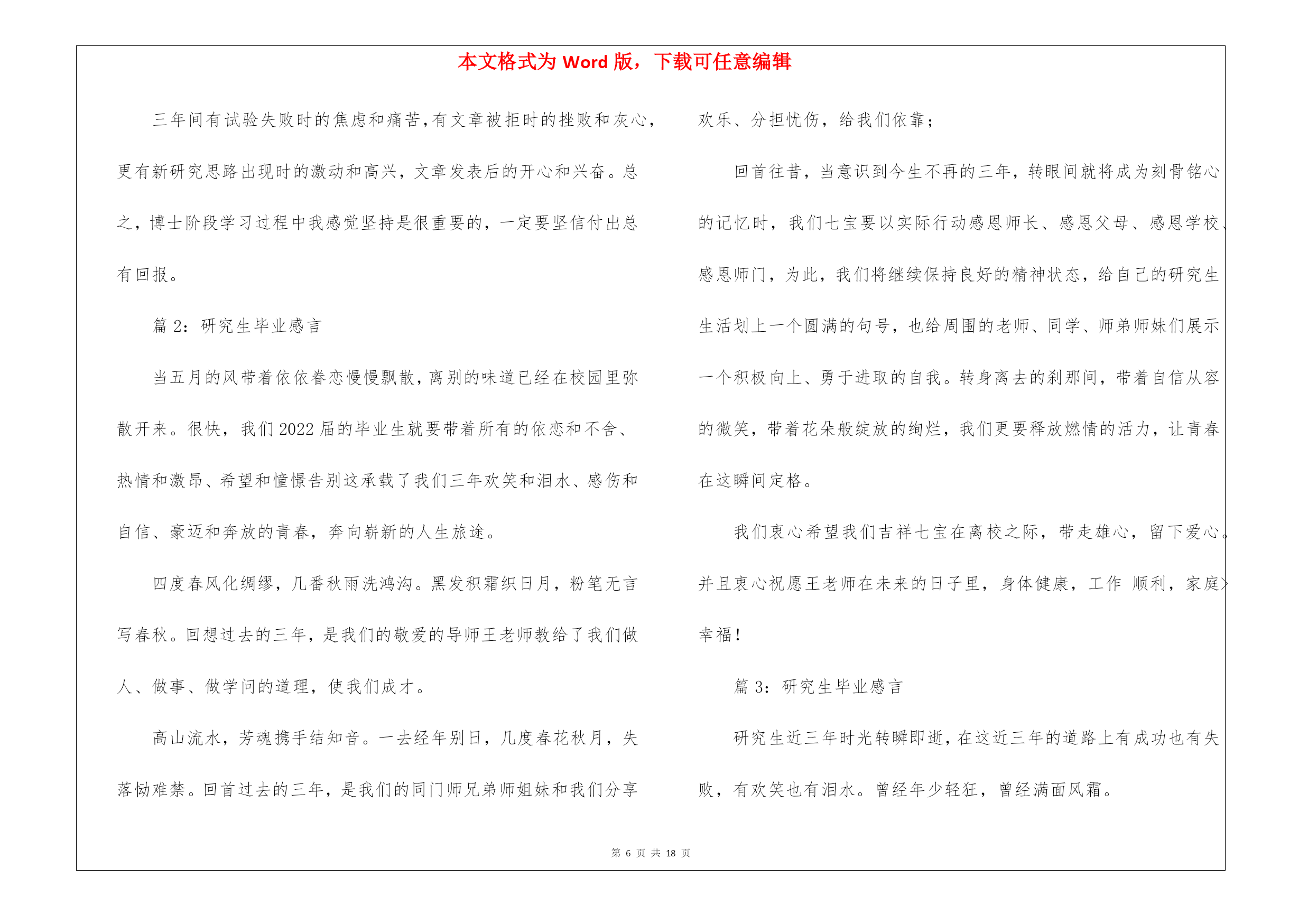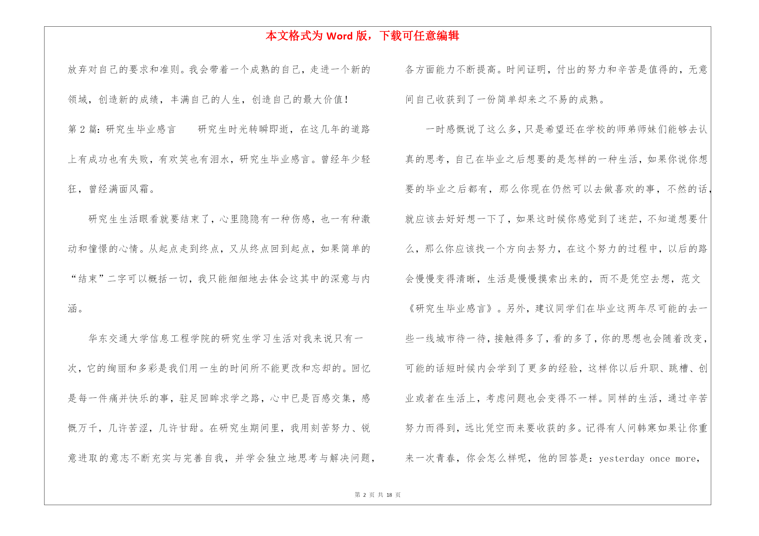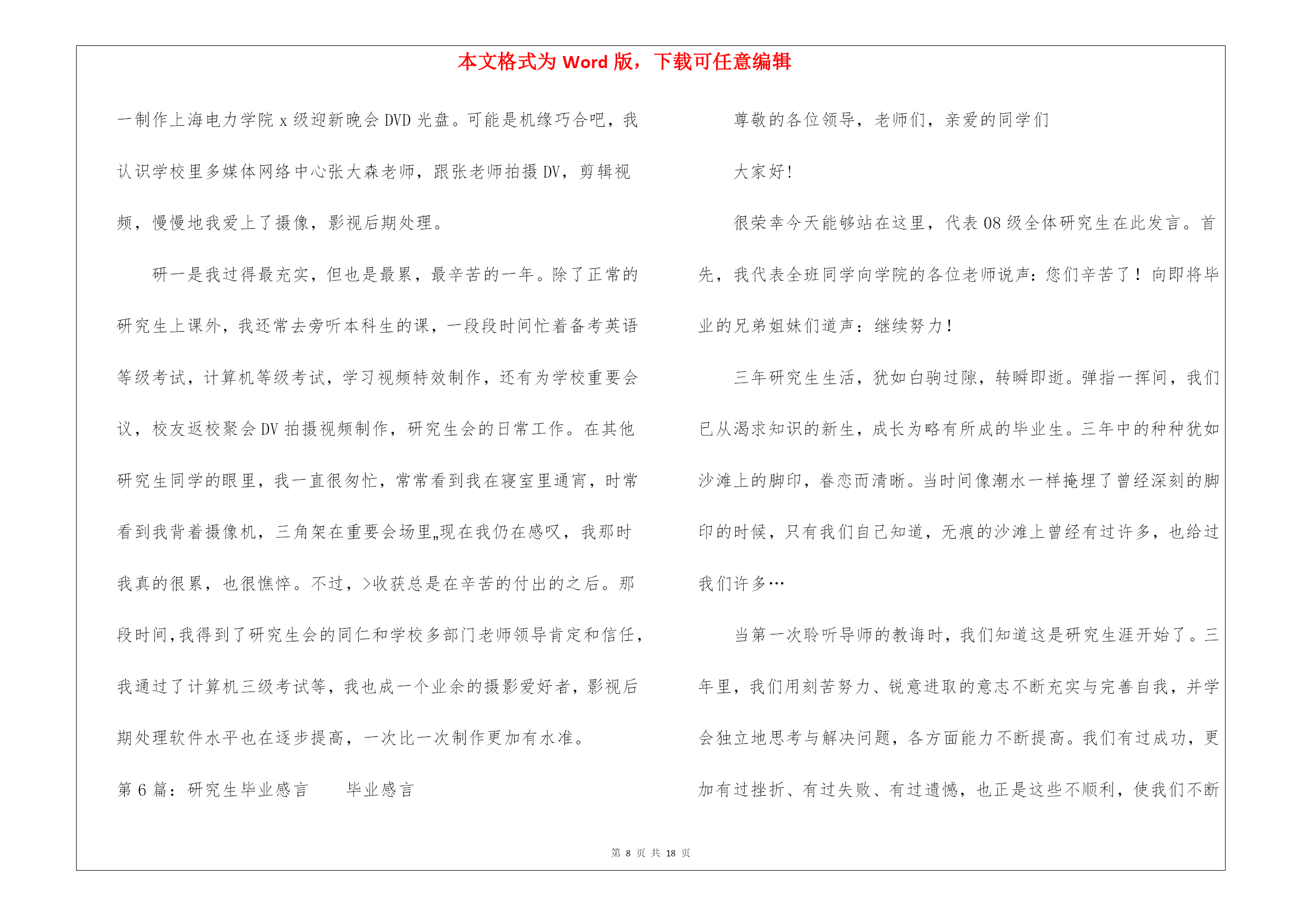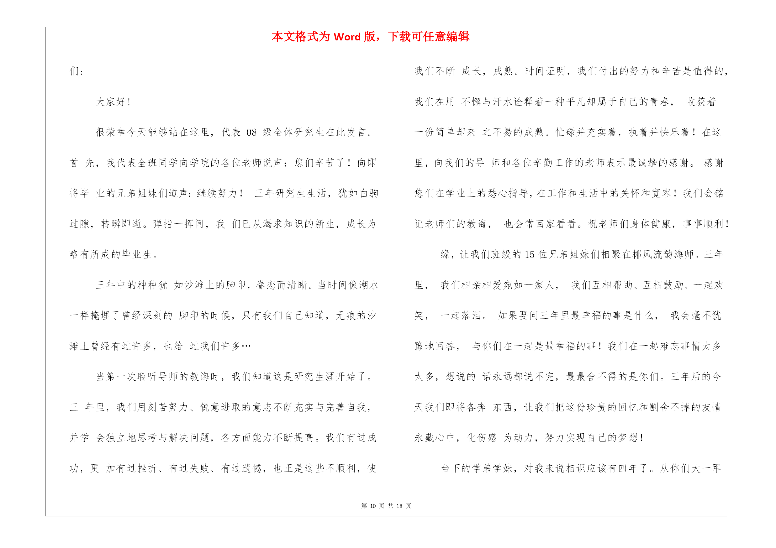 本文格式为Word版,下载可任意编辑第PAGE\*MERGEFORMAT18页共NUMPAGES\*MERGEFORMAT18页研究生毕业感言(共8篇)第1篇:研究生毕业感言研究生毕业感言这一次毕业我等待了很久,我也终于从学生这个身份中脱离了出来,计算一下,自己的学习年龄也差不多十余年了,不管自己是作为一名学生还是一个成年人,我想,在这一次读研的过程中,我找到了最初的自我,也找到了那个最真实的自我。这几年的时光,我利用的很充分,也不辱这数年来的坚守和勇敢!在此面对这一次毕业,我想更加正式、更加郑重的做一次总结,也为这一次毕业留下特别的痕迹。以前总有人问我,你读这么多书到底是为了什么?或许很多人认为是为了一份更好的工作,也有人认为是为了一个更好的自己。而当初的我也像我所说的这些人一样,只是为了一份更好的工作,一个更好的自己。但是当我慢慢的走的越来越远之后,我便发现,我并非是为了追寻一个更好的自己,更不是为了一份能够让我体面的工作。我为的只是去创造自己的价值,然后实现自己的价值,尽量为这个社会留下更多美好的东西,在这个世界上停留着属于我的足迹。同学们心里肯定也会有一些感慨,当我们在学业的这条路上越走越远时,我们就会感受到自己最大的变化就是心态,以前我们总是要求一个结果,一个成绩,但现在的我们仿佛更在乎这个过程,结果当然重要,但过程是可以创造多种结果的一件东西,所以想要做出更多的成绩,我们首先就要重视过程。把成果放轻,把过程加重,我们想要的总会不期而遇,未来也会总光彩夺目。守住初心是一件不容易的事情,但是不浪费时间却是我们实实在在可以做到的事情。所以把初心交给时间,让我们珍惜时间,初心自然也就守住了。毕业从往到今都是一个难受的话题,毕业代表着新的挑战即将到来,一切重归于零。从零开始是任何一个人最害怕的事情,这是一段非常艰难的过程,而这个过程也正好是让我们有多种成就的事情,所以我也不会害怕去迎接这样的一些挑战。我会比以前更加的从容且放松,用一个最好的状态去迎接每一个明天。就算遭遇失败,我也不会放弃对自己的要求和准则。我会带着一个成熟的自己,走进一个新的领域,创造新的成绩,丰满自己的人生,创造自己的最大价值!第2篇:研究生毕业感言研究生时光转瞬即逝,在这几年的道路上有成功也有失败,有欢笑也有泪水,研究生毕业感言。曾经年少轻狂,曾经满面风霜。研究生生活眼看就要结束了,心里隐隐有一种伤感,也一有种激动和憧憬的心情。从起点走到终点,又从终点回到起点,如果简单的“结束”二字可以概括一切,我只能细细地去体会这其中的深意与内涵。华东交通大学信息工程学院的研究生学习生活对我来说只有一次,它的绚丽和多彩是我们用一生的时间所不能更改和忘却的。回忆是每一件痛并快乐的事,驻足回眸求学之路,心中已是百感交集,感慨万千,几许苦涩,几许甘甜。在研究生期间里,我用刻苦努力、锐意进取的意志不断充实与完善自我,并学会独立地思考与解决问题,各方面能力不断提高。时间证明,付出的努力和辛苦是值得的,无意间自己收获到了一份简单却来之不易的成熟。一时感慨说了这么多,只是希望还在学校的师弟师妹们能够去认真的思考,自己在毕业之后想要的是怎样的一种生活,如果你说你想要的毕业之后都有,那么你现在仍然可以去做喜欢的事,不然的话,就应该去好好想一下了,如果这时候你感觉到了迷茫,不知道想要什么,那么你应该找一个方向去努力,在这个努力的过程中,以后的路会慢慢变得清晰,生活是慢慢摸索出来的,而不是凭空去想,范文《研究生毕业感言》。另外,建议同学们在毕业这两年尽可能的去一些一线城市待一待,接触得多了,看的多了,你的思想也会随着改变,可能的话短时候内会学到了更多的经验,这样你以后升职、跳槽、创业或者在生活上,考虑问题也会变得不一样。同样的生活,通过辛苦努力而得到,远比凭空而来要收获的多。记得有人问韩寒如果让你重来一次青春,你会怎么样呢,他的回答是:yesterdayoncemore,再做一遍。很多时候我在想如果是我,我会怎么样,我可不想有那么多的遗憾。不管什么时候,一段默默付出,艰难努力的日子,会变成整个生命中最精彩的日子,再回首的时候,自己都会被感动。最后,引用《十月围城》的一句话,我改了改就是:欲求理想之幸福,不得不经理想之痛苦,这痛苦就叫做生活。第3篇:研究生毕业感言研究生近三年时光转瞬即逝,在这近三年的道路上有成功也有失败,有欢笑也有泪水。曾经年少轻狂,曾经满面风霜。三年的研究生生活眼看就要结束了,心里隐隐有一种伤感,,也一有种激动和憧憬的心情。从起点走到终点,又从终点回到起点,如果简单的“结束”二字可以概括一切,我只能细细地去体会这其中的深意与内涵。上海电力学院的研究生学习生活对我来说只有一次,它的绚丽和多彩是我们用一生的时间所不能更改和忘却的。回忆是每一件痛并快乐的事,