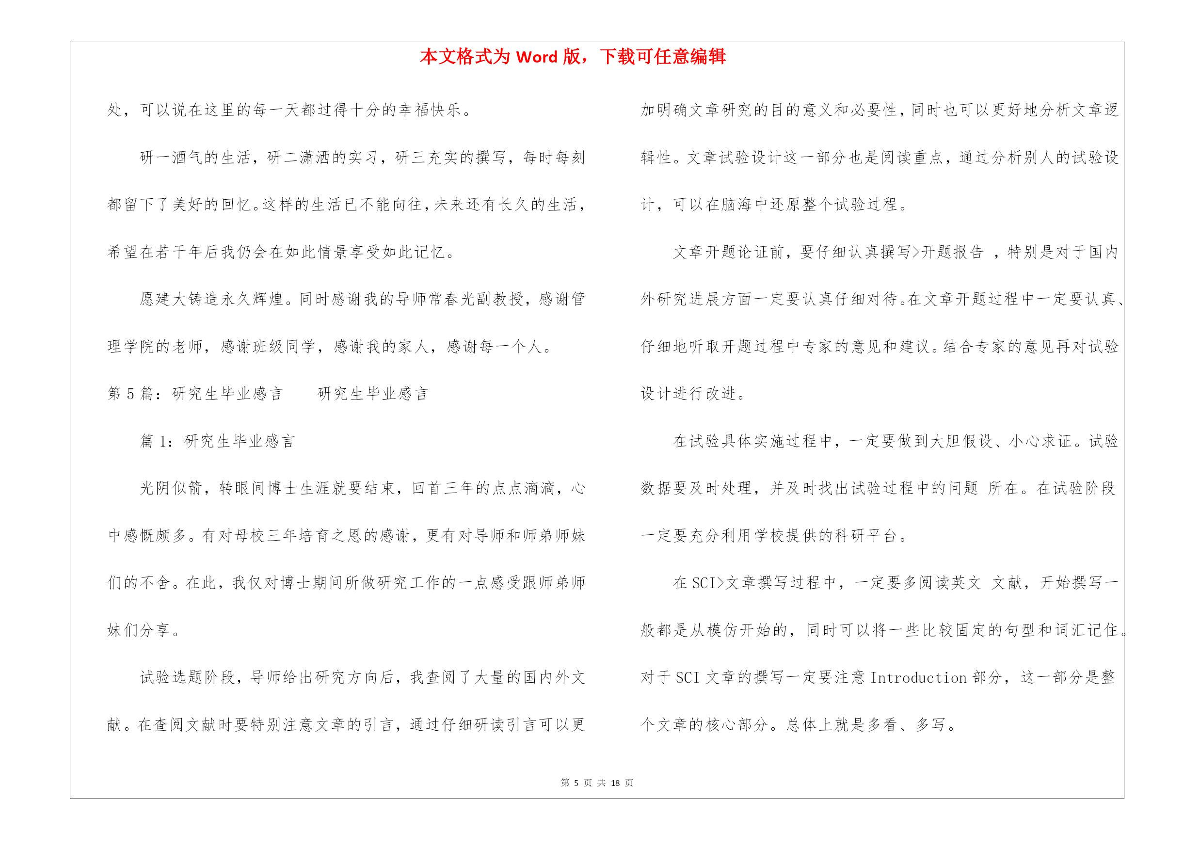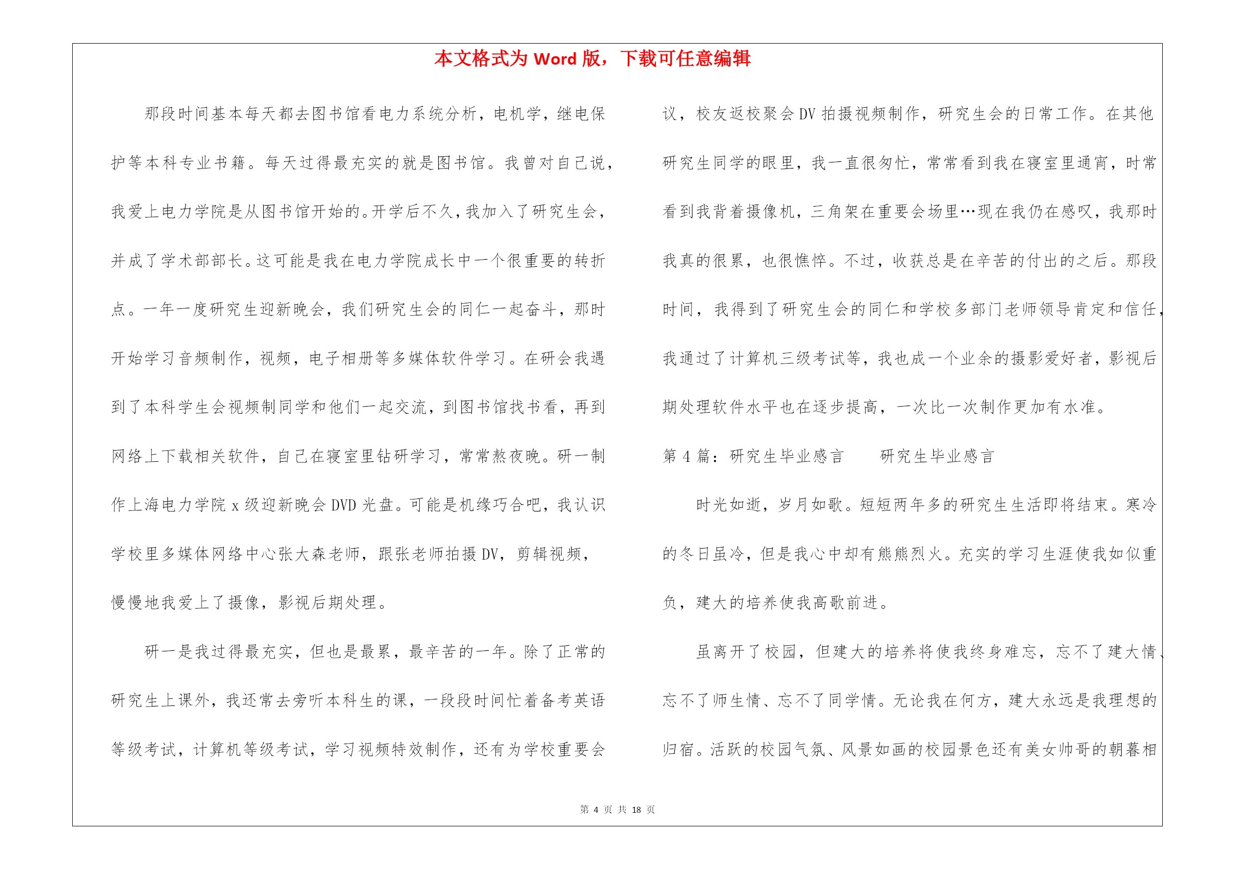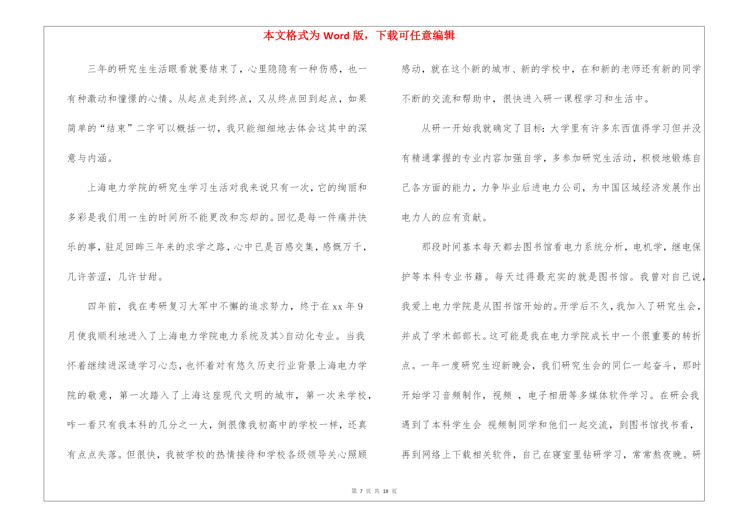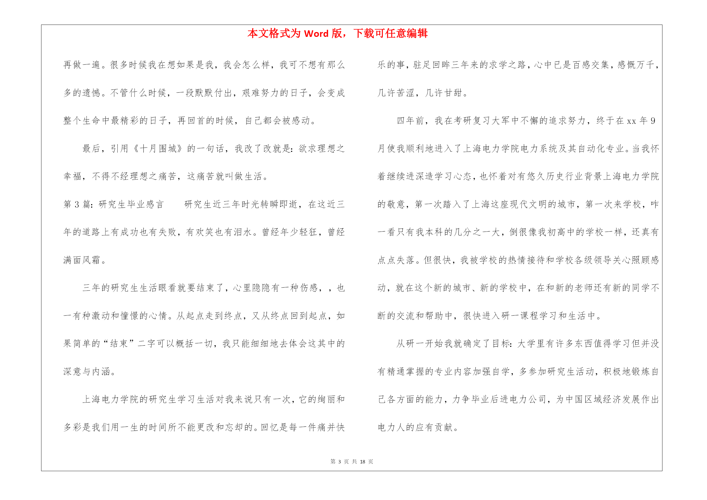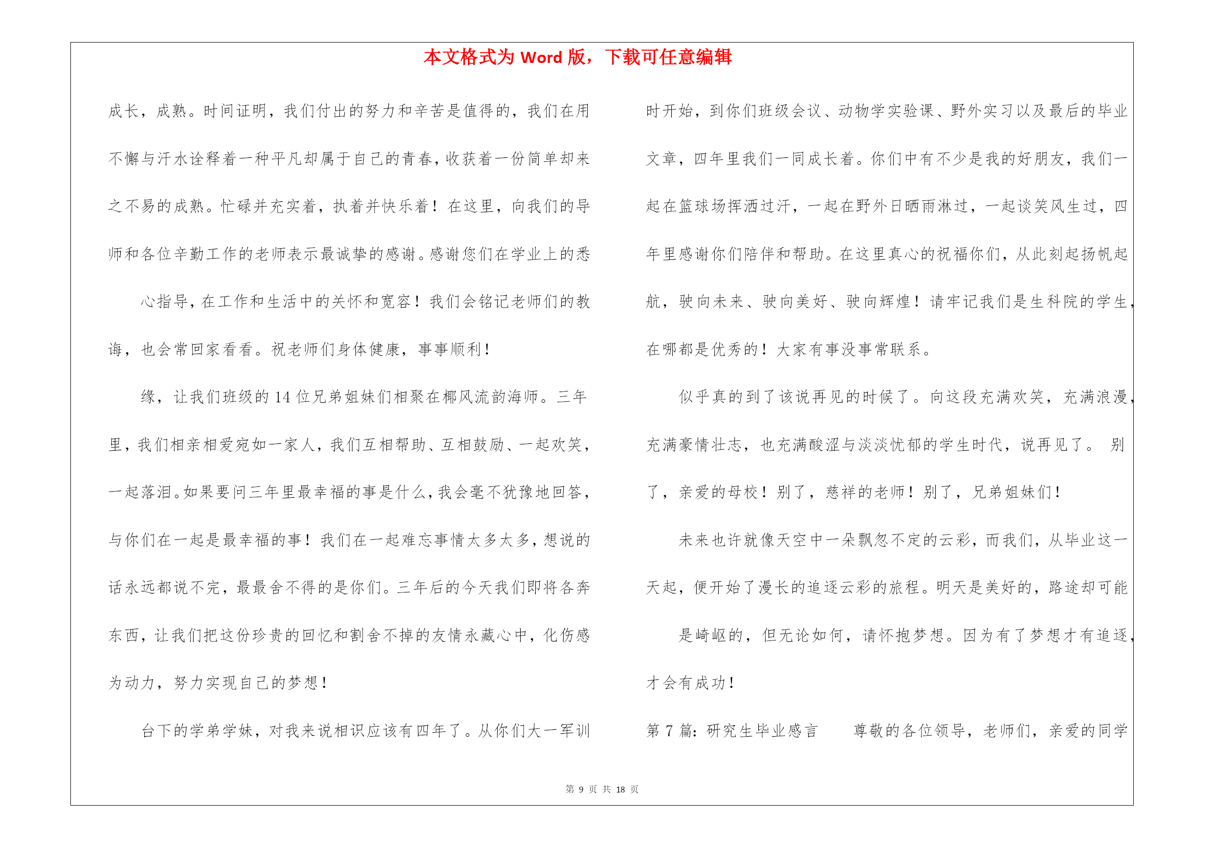 本文格式为Word版,下载可任意编辑第PAGE\*MERGEFORMAT18页共NUMPAGES\*MERGEFORMAT18页研究生毕业感言(共8篇)第1篇:研究生毕业感言研究生毕业感言这一次毕业我等待了很久,我也终于从学生这个身份中脱离了出来,计算一下,自己的学习年龄也差不多十余年了,不管自己是作为一名学生还是一个成年人,我想,在这一次读研的过程中,我找到了最初的自我,也找到了那个最真实的自我。这几年的时光,我利用的很充分,也不辱这数年来的坚守和勇敢!在此面对这一次毕业,我想更加正式、更加郑重的做一次总结,也为这一次毕业留下特别的痕迹。以前总有人问我,你读这么多书到底是为了什么?或许很多人认为是为了一份更好的工作,也有人认为是为了一个更好的自己。而当初的我也像我所说的这些人一样,只是为了一份更好的工作,一个更好的自己。但是当我慢慢的走的越来越远之后,我便发现,我并非是为了追寻一个更好的自己,更不是为了一份能够让我体面的工作。我为的只是去创造自己的价值,然后实现自己的价值,尽量为这个社会留下更多美好的东西,在这个世界上停留着属于我的足迹。同学们心里肯定也会有一些感慨,当我们在学业的这条路上越走越远时,我们就会感受到自己最大的变化就是心态,以前我们总是要求一个结果,一个成绩,但现在的我们仿佛更在乎这个过程,结果当然重要,但过程是可以创造多种结果的一件东西,所以想要做出更多的成绩,我们首先就要重视过程。把成果放轻,把过程加重,我们想要的总会不期而遇,未来也会总光彩夺目。守住初心是一件不容易的事情,但是不浪费时间却是我们实实在在可以做到的事情。所以把初心交给时间,让我们珍惜时间,初心自然也就守住了。毕业从往到今都是一个难受的话题,毕业代表着新的挑战即将到来,一切重归于零。从零开始是任何一个人最害怕的事情,这是一段非常艰难的过程,而这个过程也正好是让我们有多种成就的事情,所以我也不会害怕去迎接这样的一些挑战。我会比以前更加的从容且放松,用一个最好的状态去迎接每一个明天。就算遭遇失败,我也不会放弃对自己的要求和准则。我会带着一个成熟的自己,走进一个新的领域,创造新的成绩,丰满自己的人生,创造自己的最大价值!第2篇:研究生毕业感言研究生时光转瞬即逝,在这几年的道路上有成功也有失败,有欢笑也有泪水,研究生毕业感言。曾经年少轻狂,曾经满面风霜。研究生生活眼看就要结束了,心里隐隐有一种伤感,也一有种激动和憧憬的心情。从起点走到终点,又从终点回到起点,如果简单的“结束”二字可以概括一切,我只能细细地去体会这其中的深意与内涵。华东交通大学信息工程学院的研究生学习生活对我来说只有一次,它的绚丽和多彩是我们用一生的时间所不能更改和忘却的。回忆是每一件痛并快乐的事,驻足回眸求学之路,心中已是百感交集,感慨万千,几许苦涩,几许甘甜。在研究生期间里,我用刻苦努力、锐意进取的意志不断充实与完善自我,并学会独立地思考与解决问题,各方面能力不断提高。时间证明,付出的努力和辛苦是值得的,无意间自己收获到了一份简单却来之不易的成熟。一时感慨说了这么多,只是希望还在学校的师弟师妹们能够去认真的思考,自己在毕业之后想要的是怎样的一种生活,如果你说你想要的毕业之后都有,那么你现在仍然可以去做喜欢的事,不然的话,就应该去好好想一下了,如果这时候你感觉到了迷茫,不知道想要什么,那么你应该找一个方向去努力,在这个努力的过程中,以后的路会慢慢变得清晰,生活是慢慢摸索出来的,而不是凭空去想,范文《研究生毕业感言》。另外,建议同学们在毕业这两年尽可能的去一些一线城市待一待,接触得多了,看的多了,你的思想也会随着改变,可能的话短时候内会学到了更多的经验,这样你以后升职、跳槽、创业或者在生活上,考虑问题也会变得不一样。同样的生活,通过辛苦努力而得到,远比凭空而来要收获的多。记得有人问韩寒如果让你重来一次青春,你会怎么样呢,他的回答是:yesterdayoncemore,再做一遍。很多时候我在想如果是我,我会怎么样,我可不想有那么多的遗憾。不管什么时候,一段默默付出,艰难努力的日子,会变成整个生命中最精彩的日子,再回首的时候,自己都会被感动。最后,引用《十月围城》的一句话,我改了改就是:欲求理想之幸福,不得不经理想之痛苦,这痛苦就叫做生活。第3篇:研究生毕业感言研究生近三年时光转瞬即逝,在这近三年的道路上有成功也有失败,有欢笑也有泪水。曾经年少轻狂,曾经满面风霜。三年的研究生生活眼看就要结束了,心里隐隐有一种伤感,,也一有种激动和憧憬的心情。从起点走到终点,又从终点回到起点,如果简单的“结束”二字可以概括一切,我只能细细地去体会这其中的深意与内涵。上海电力学院的研究生学习生活对我来说只有一次,它的绚丽和多彩是我们用一生的时间所不能更改和忘却的。回忆是每一件痛并快乐的事,