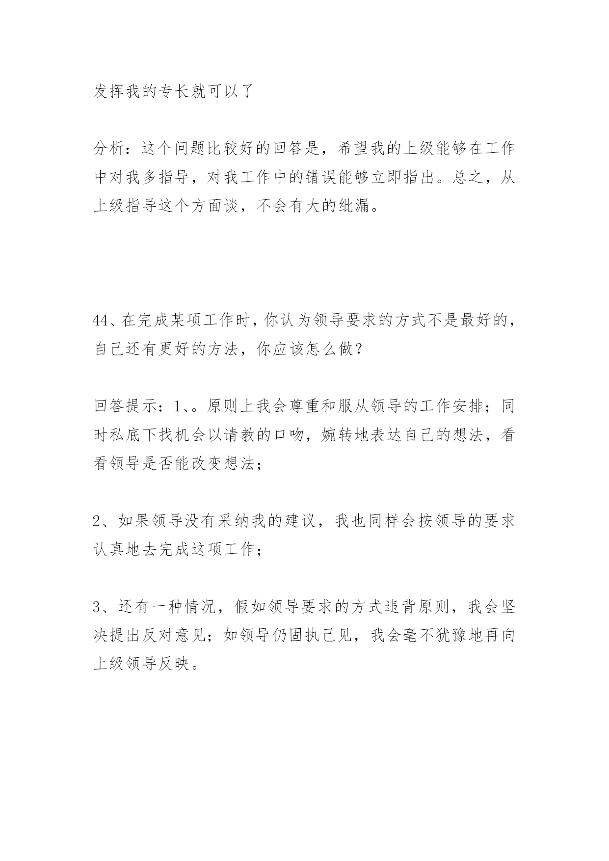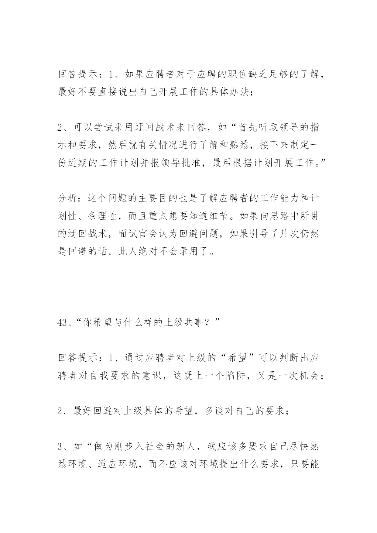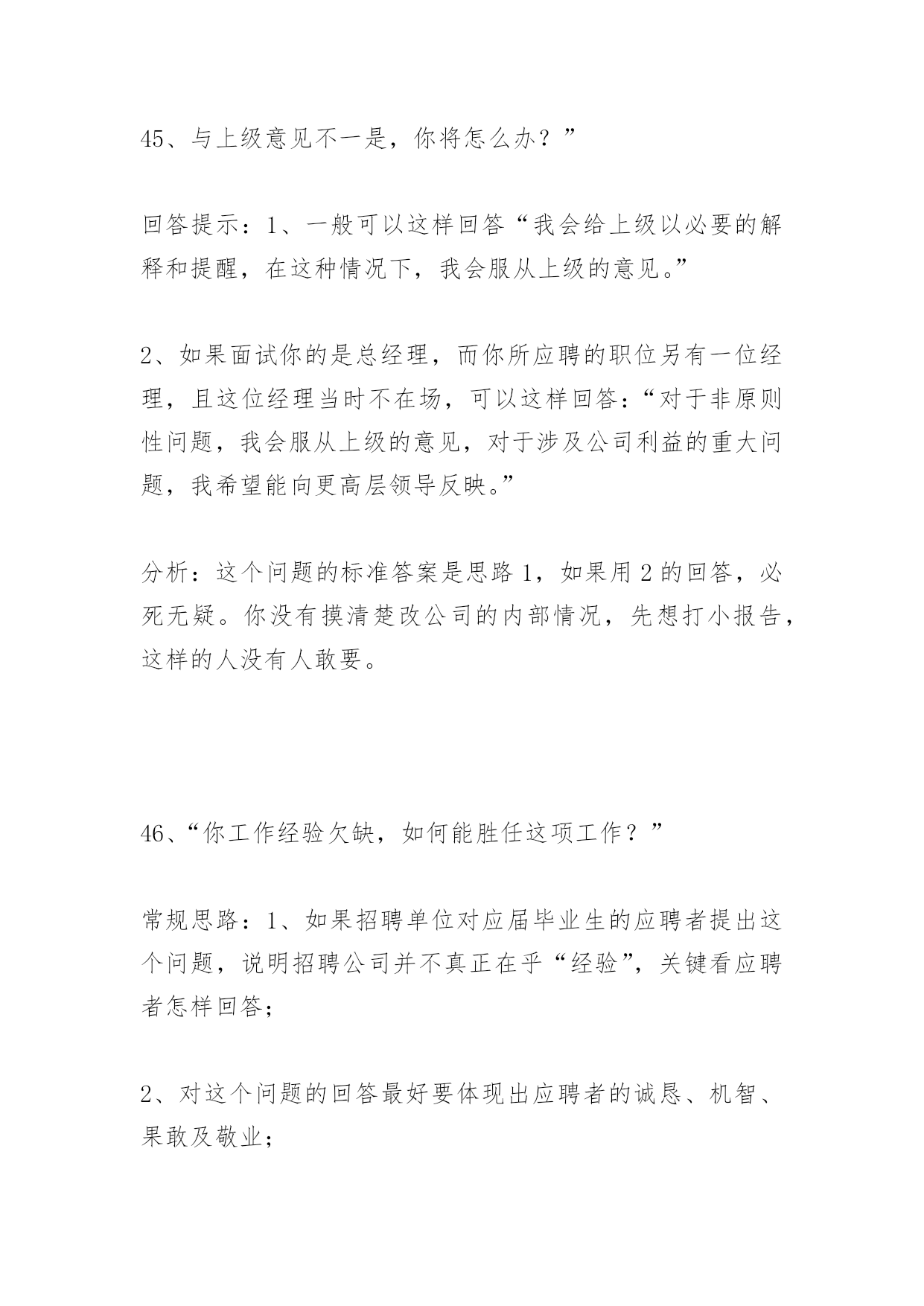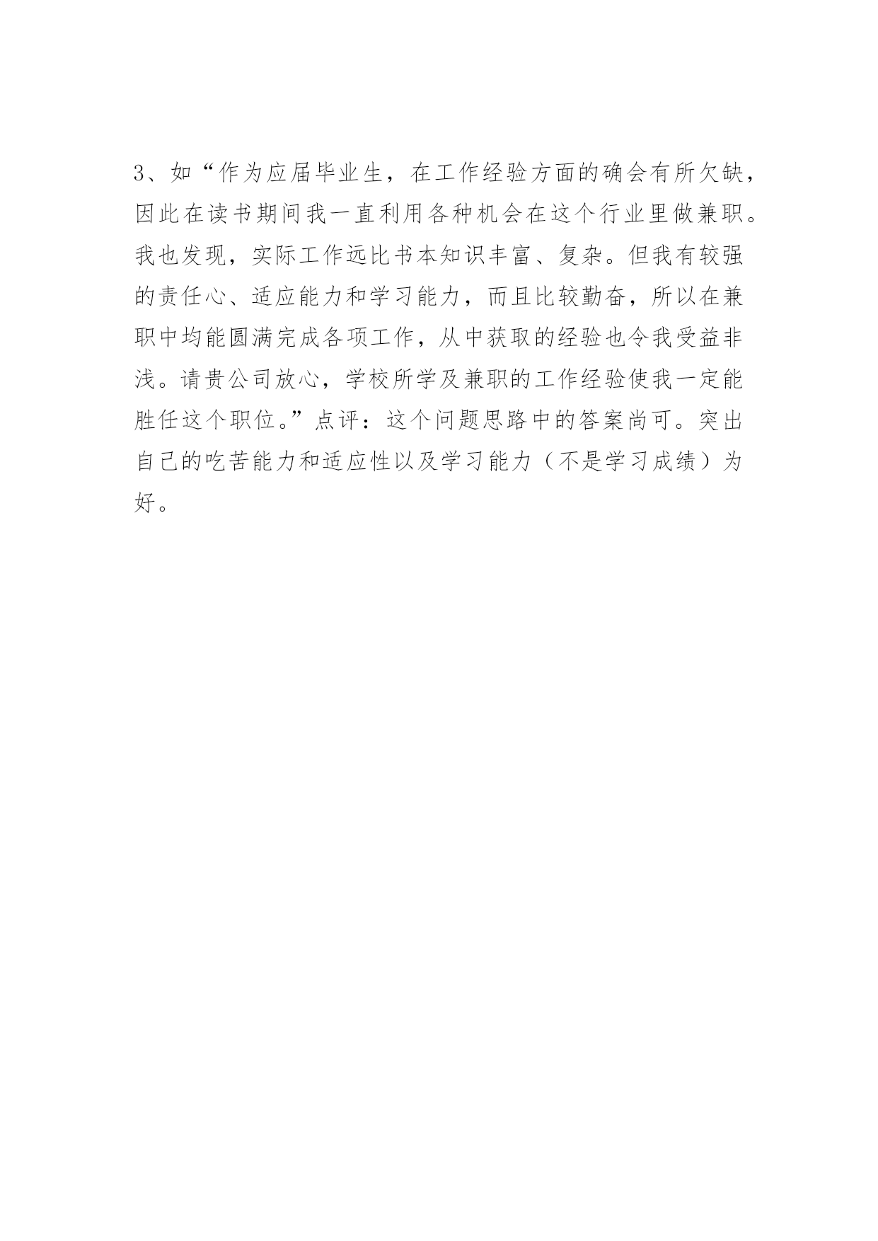 面试70问经典回答二面试70问经典回答(二)41、对这项工作,你有哪些可预见的困难?”回答提示::1、不宜直接说出具体的困难,否则可能令对方怀疑应聘者不行;2、可以尝试迂回战术,说出应聘者对困难所持有的态度——“工作中出现一些困难是正常的,也是难免的,但是只要有坚忍不拔的毅力、良好的合作精神以及事前周密而充分的准备,任何困难都是可以克服。”分析:一般问这个问题,面试者的希望就比较大了,因为已经在谈工作细节。但常规思路中的回答,又被面试官“骗”了。当面试官询问这个问题的时候,有两个目的。第一,看看应聘者是不是在行,说出的困难是不是在这个职位中一般都不可避免的问题。第二,是想看一下应聘者解决困难的手法对不对,及公司能否提供这样的资源。而不是想了解应聘者对困难的态度。42、如果我录用你,你将怎样开展工作?”回答提示:1、如果应聘者对于应聘的职位缺乏足够的了解,最好不要直接说出自己开展工作的具体办法;2、可以尝试采用迂回战术来回答,如“首先听取领导的指示和要求,然后就有关情况进行了解和熟悉,接下来制定一份近期的工作计划并报领导批准,最后根据计划开展工作。”分析:这个问题的主要目的也是了解应聘者的工作能力和计划性、条理性,而且重点想要知道细节。如果向思路中所讲的迂回战术,面试官会认为回避问题,如果引导了几次仍然是回避的话。此人绝对不会录用了。43、“你希望与什么样的上级共事?”回答提示:1、通过应聘者对上级的“希望”可以判断出应聘者对自我要求的意识,这既上一个陷阱,又是一次机会;2、最好回避对上级具体的希望,多谈对自己的要求;3、如“做为刚步入社会的新人,我应该多要求自己尽快熟悉环境、适应环境,而不应该对环境提出什么要求,只要能发挥我的专长就可以了分析:这个问题比较好的回答是,希望我的上级能够在工作中对我多指导,对我工作中的错误能够立即指出。总之,从上级指导这个方面谈,不会有大的纰漏。44、在完成某项工作时,你认为领导要求的方式不是最好的,自己还有更好的方法,你应该怎么做?回答提示:1、。原则上我会尊重和服从领导的工作安排;同时私底下找机会以请教的口吻,婉转地表达自己的想法,看看领导是否能改变想法;2、如果领导没有采纳我的建议,我也同样会按领导的要求认真地去完成这项工作;3、还有一种情况,假如领导要求的方式违背原则,我会坚决提出反对意见;如领导仍固执己见,我会毫不犹豫地再向上级领导反映。45、与上级意见不一是,你将怎么办?”回答提示:1、一般可以这样回答“我会给上级以必要的解释和提醒,在这种情况下,我会服从上级的意见。”2、如果面试你的是总经理,而你所应聘的职位另有一位经理,且这位经理当时不在场,可以这样回答:“对于非原则性问题,我会服从上级的意见,对于涉及公司利益的重大问题,我希望能向更高层领导反映。”分析:这个问题的标准答案是思路1,如果用2的回答,必死无疑。你没有摸清楚改公司的内部情况,先想打小报告,这样的人没有人敢要。46、“你工作经验欠缺,如何能胜任这项工作?”常规思路:1、如果招聘单位对应届毕业生的应聘者提出这个问题,说明招聘公司并不真正在乎“经验”,关键看应聘者怎样回答;2、对这个问题的回答最好要体现出应聘者的诚恳、机智、果敢及敬业;3、如“作为应届毕业生,在工作经验方面的确会有所欠缺,因此在读书期间我一直利用各种机会在这个行业里做兼职。我也发现,实际工作远比书本知识丰富、复杂。但我有较强的责任心、适应能力和学习能力,而且比较勤奋,所以在兼职中均能圆满完成各项工作,从中获取的经验也令我受益非浅。请贵公司放心,学校所学及兼职的工作经验使我一定能胜任这个职位。”点评:这个问题思路中的答案尚可。突出自己的吃苦能力和适应性以及学习能力(不是学习成绩)为好。