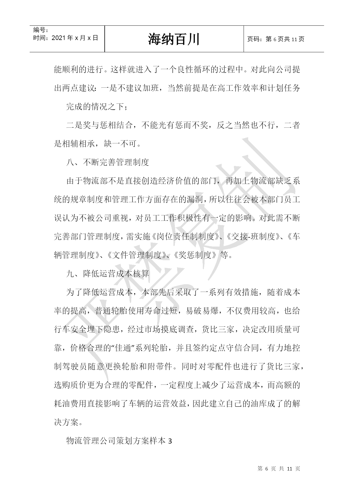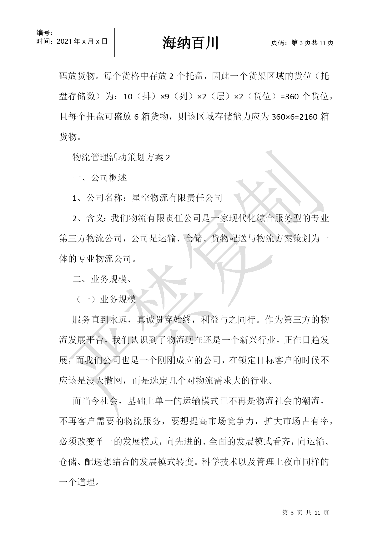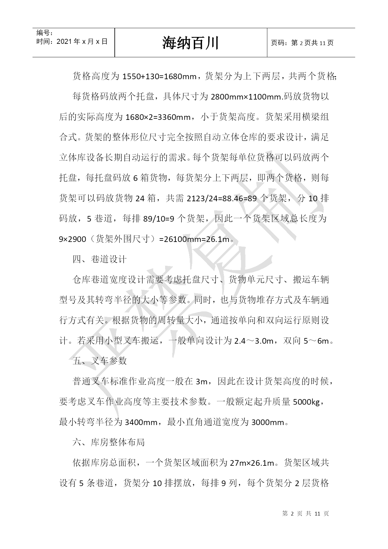 编号:时间:2021年x月x日海纳百川页码:第PAGE11页共NUMPAGES11页第PAGE\*MERGEFORMAT11页共NUMPAGES\*MERGEFORMAT11页物流管理公司策划方案样本物流管理公司策划方案样本做好管理水平提升、抓好人员素质提高,努力降低成本费用,提高效率效益,增强公司竞争实力。努力完成公司的工作任务,以下是豆花问答网为大家精心整理的物流管理公司策划方案样本,欢迎阅读。物流管理公司策划方案样本1一、确定仓库设施的参数仓库的设施,需根据所存储的产品类型来确定,一般有堆垛式设计,立体货架设计,或者堆垛式与立体式结合的设计类型。一般对于附加值较高、仓储要求较高的产品,应使用立体货架设计仓库。同时,还需确定仓储对象的包装参数、所需仓库设施参数,包括托盘参数、货架参数、叉车参数以及仓库面积等。二、仓库规划托盘为单面使用四向进又,托盘载重能力为500kg,托盘尺寸为1400mm×1100mm,托盘厚度为130mm。因货物高度达1.5m,高度较高,为保证堆码及存放安全,每托盘内的货物仅按一层码放,每层可码放6箱货物。三、货架参数货架采用横梁式货架。货架外围尺寸为长2900mm、宽1200mm、高3500mm;内围尺寸为:长2800mm、宽11O0mm、高3400mm。货格高度为1550+130=1680mm,货架分为上下两层,共两个货格;每货格码放两个托盘,具体尺寸为2800mm×1100mm.码放货物以后的实际高度为1680×2=3360mm,小于货架高度。货架采用横梁组合式。货架的整体形位尺寸完全按照自动立体仓库的要求设计,满足立体库设备长期自动运行的需求。每个货架每单位货格可以码放两个托盘,每托盘码放6箱货物,每货架分上下两层,即两个货格,则每货架可以码放货物24箱,共需2123/24=88.46=89个货架,分10排码放,5巷道,每排89/10=9个货架,因此一个货架区域总长度为9×2900(货架外围尺寸)=26100mm=26.1m。四、巷道设计仓库巷道宽度设计需要考虑托盘尺寸、货物单元尺寸、搬运车辆型号及其转弯半径的大小等参数。同时,也与货物堆存方式及车辆通行方式有关。根据货物的周转量大小,通道按单向和双向运行原则设计。若采用小型叉车搬运,一般单向设计为2.4~3.0m,双向5~6m。五、叉车参数普通叉车标准作业高度一般在3m,因此在设计货架高度的时候,要考虑叉车作业高度等主要技术参数。一般额定起升质量5000kg,最小转弯半径为3400mm,最小直角通道宽度为3000mm。六、库房整体布局依据库房总面积,一个货架区域面积为27m×26.1m。货架区域共设有5条巷道,货架分10排摆放,每排9列,每个货架分2层货格码放货物。每个货格中存放2个托盘,因此一个货架区域的货位(托盘存储数)为:10(排)×9(列)×2(层)×2(货位)=360个货位,且每个托盘可盛放6箱货物,则该区域存储能力应为360×6=2160箱货物。物流管理活动策划方案2一、公司概述1、公司名称:星空物流有限责任公司2、含义:我们物流有限责任公司是一家现代化综合服务型的专业第三方物流公司,公司是运输、仓储、货物配送与物流方案策划为一体的专业物流公司。二、业务规模、(一)业务规模服务直到永远,真诚贯穿始终,利益与之同行。作为第三方的物流发展平台,我们认识到了物流现在还是一个新兴行业,正在日趋发展,而我们公司也是一个刚刚成立的公司,在锁定目标客户的时候不应该是漫天撒网,而是选定几个对物流需求大的行业。而当今社会,基础上单一的运输模式已不再是物流社会的潮流,不再客户需要的物流服务,要想提高市场竞争力,扩大市场占有率,必须改变单一的发展模式,向先进的、全面的发展模式看齐,向运输、仓储、配送想结合的发展模式转变。科学技术以及管理上夜市同样的一个道理。(二)我们的服务服务形式:主要业务包含物流的基本业务即运输、仓储、包装及配送。服务优势:综合利用资源,减少资源浪费,取代“各自为战”的现有局面。三、公司选址我们将目标选定在一个有开发潜力市场——中原地区,选择一个有良好的基础设施的城市—新沂,依靠当地优惠的政策,一切从零开始,凭借我们的能力,依靠我们的技术去发展该地区的物流产业,进而联合国内市场,进军国际市场。四、人力资源管理公司成立之初采用树型结构与横向工作相结合,建立完善的部门,依靠项目经理与各个部门通力合作,完成我们的服务。各级管理人员形成一个团队,明确职责,各尽其能。建立有效的激励机制,为员工建立良好的工作环境。我们相信“我为人人”的服务理念,物流的服务从实质依然是为人服务。人不仅是公司以外的客户群,在公司内部我们人尽其才,才能确保物尽其用,本着